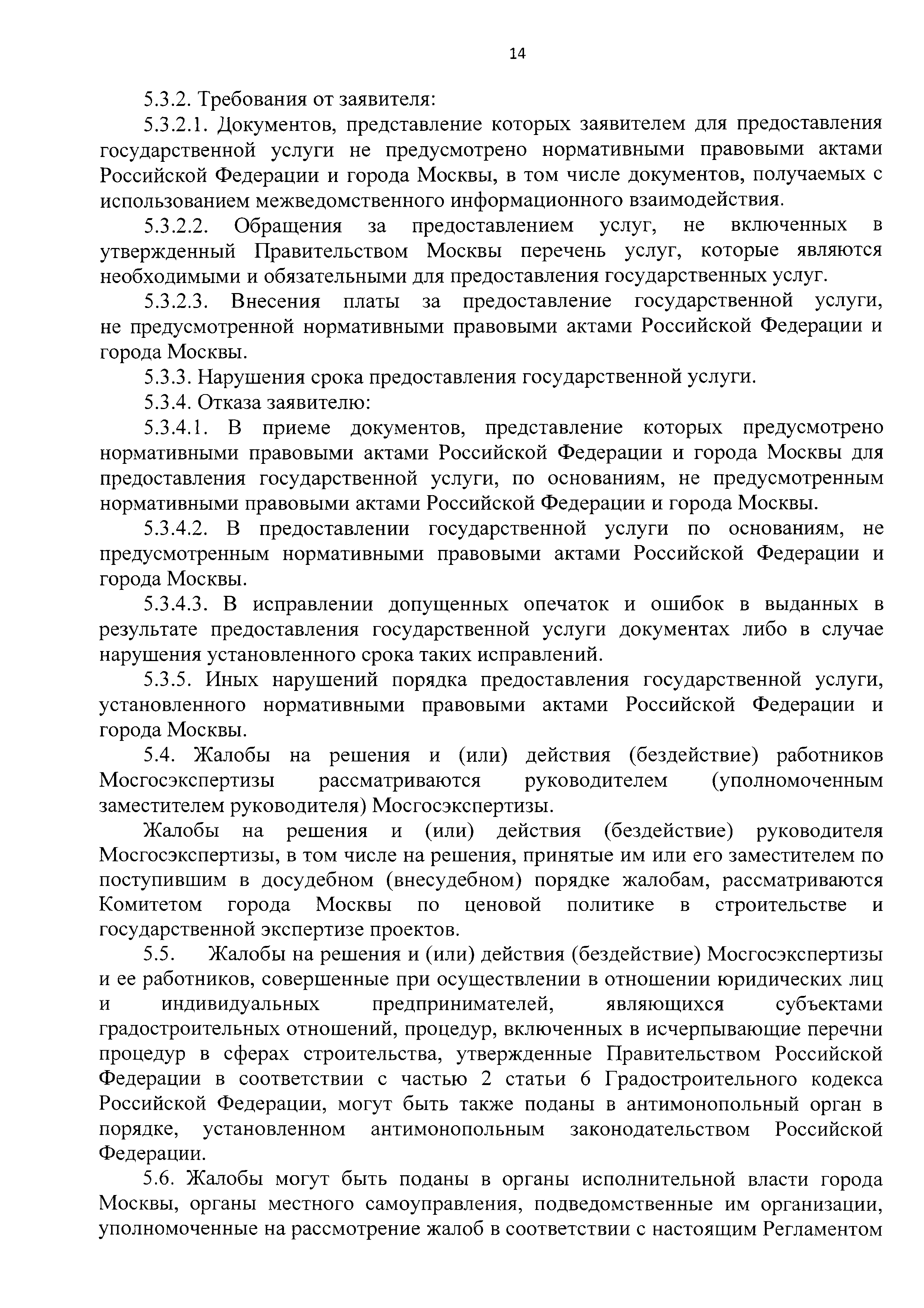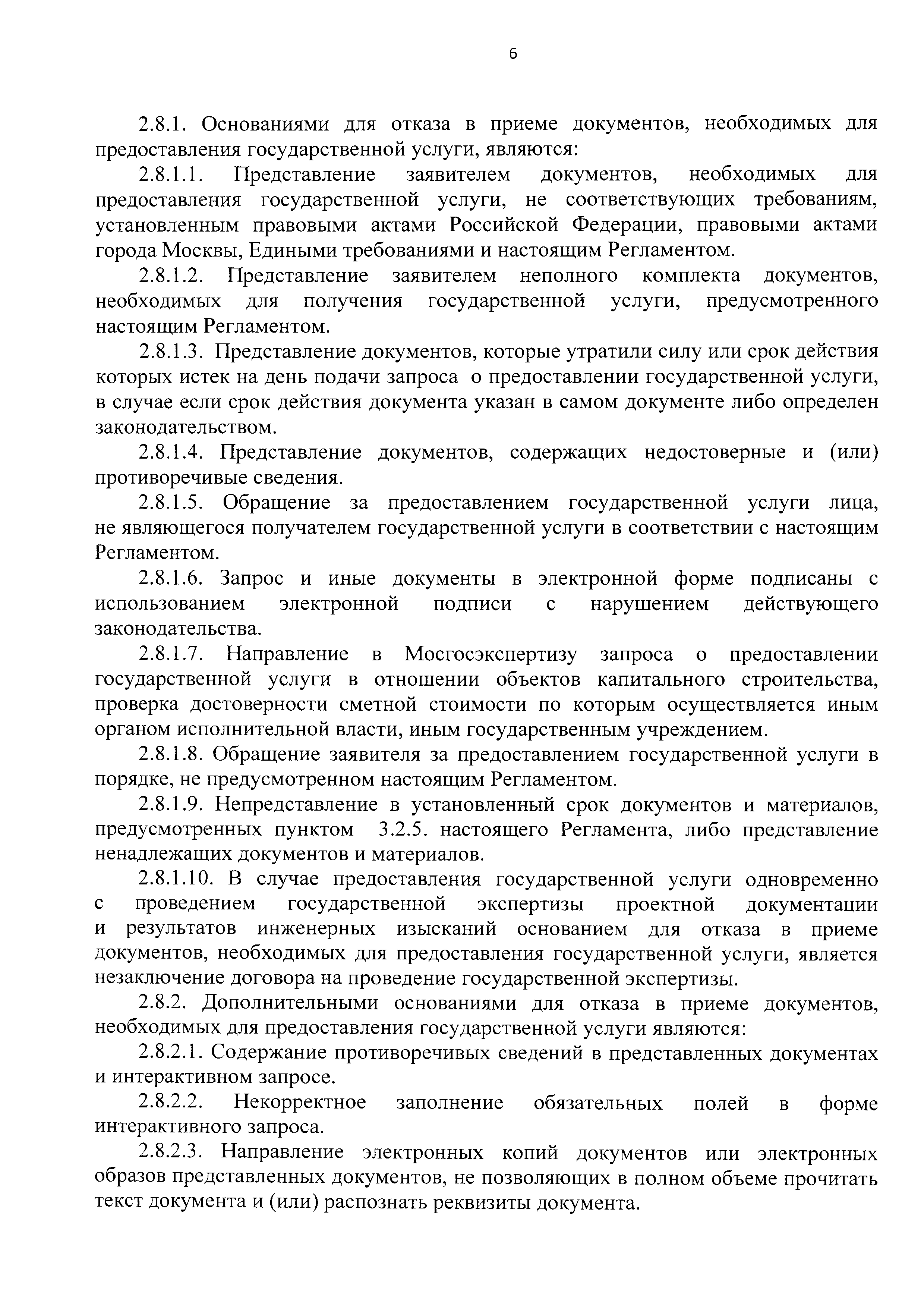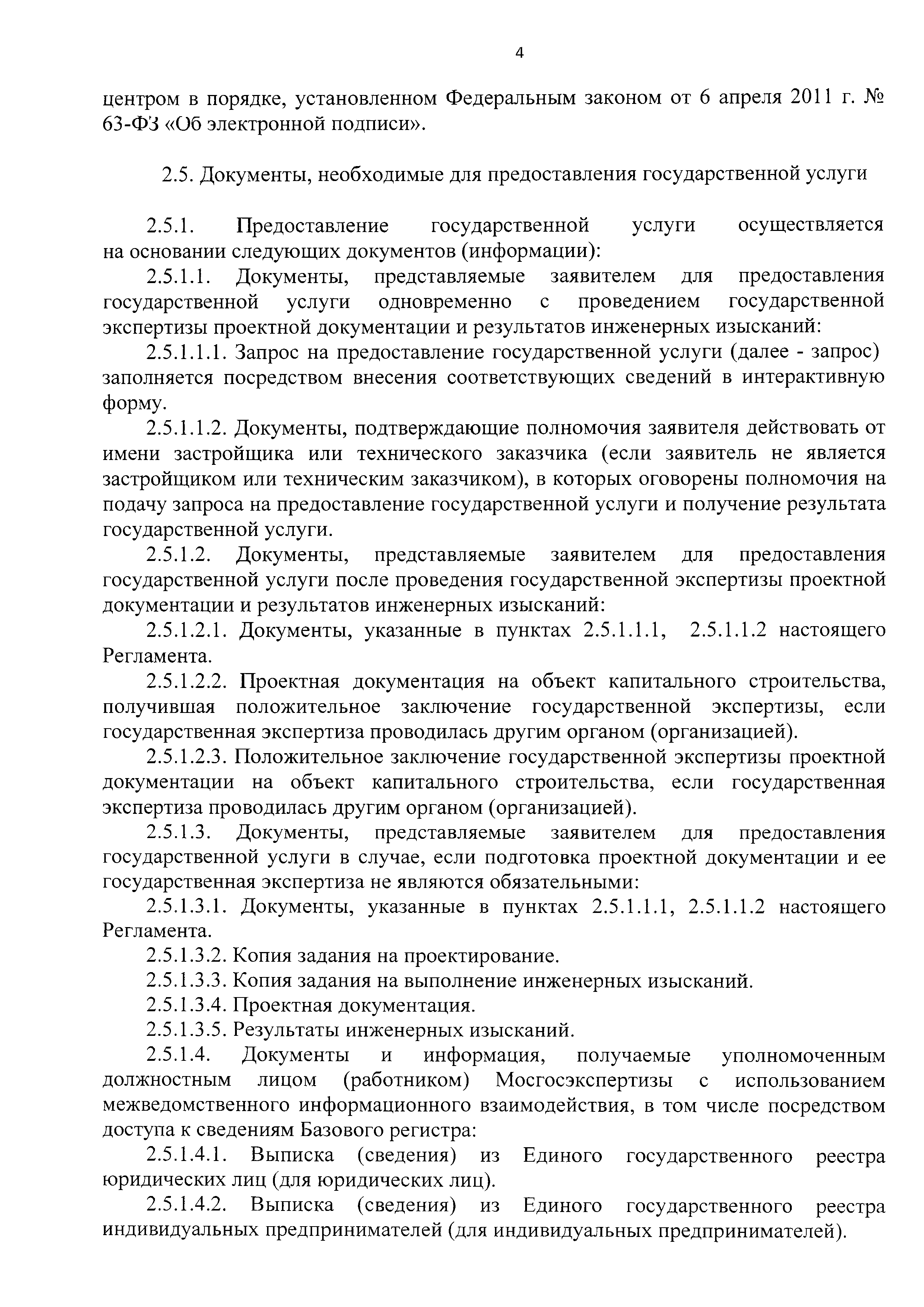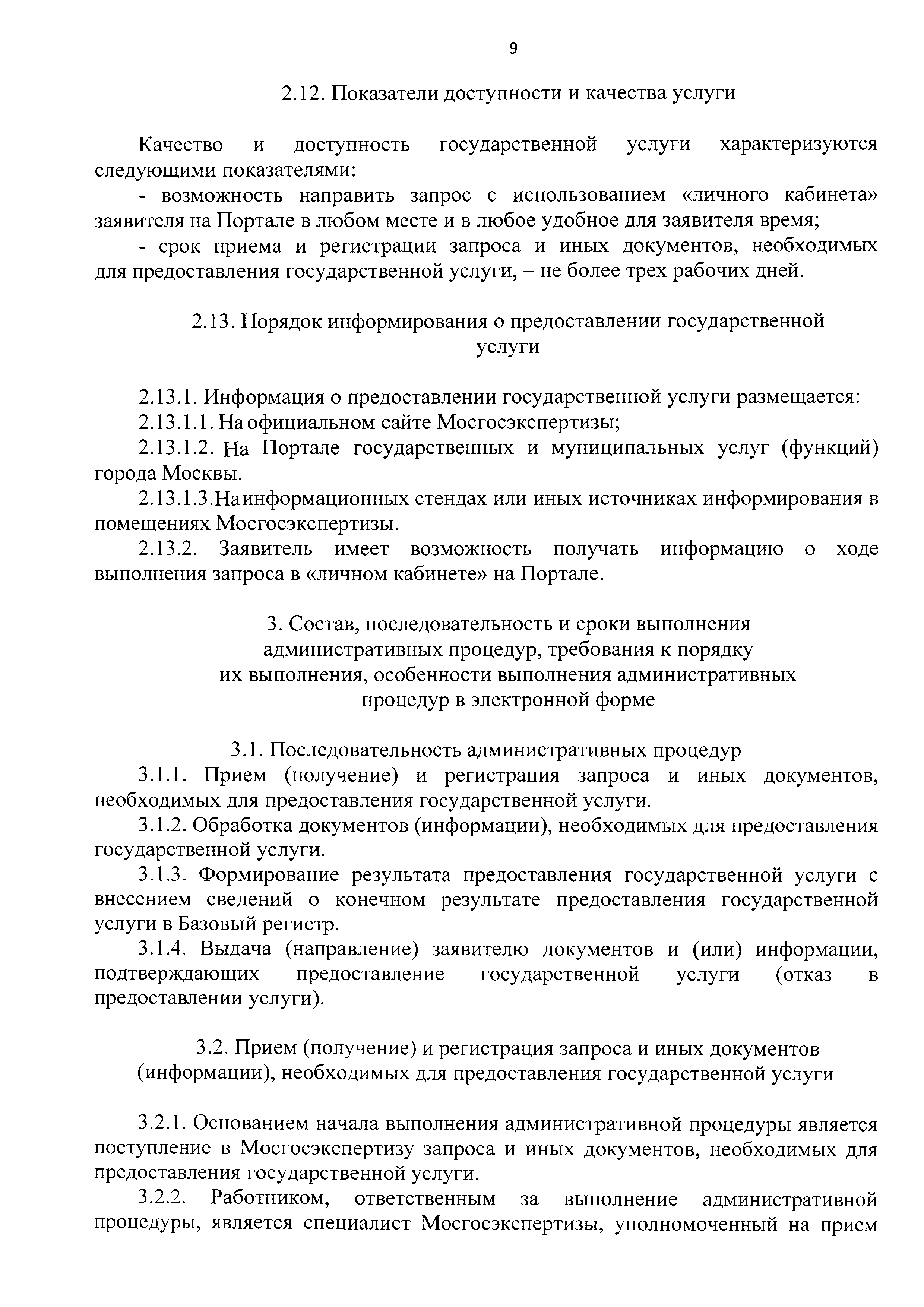 | Оглавление: | 1. Общие положения 2. Стандарт предоставления государственной услуги 3. Состав, последовательность и сроки выполнения административных процедур, требования к порядку их выполнения, особенности выполнения административных процедур в электронной форме 4. Формы контроля за исполнением настоящего Регламента 5. Досудебный (внесудебный) порядок обжалования решений и действий (бездействия) Мосгосэкспертизы и ее работников |