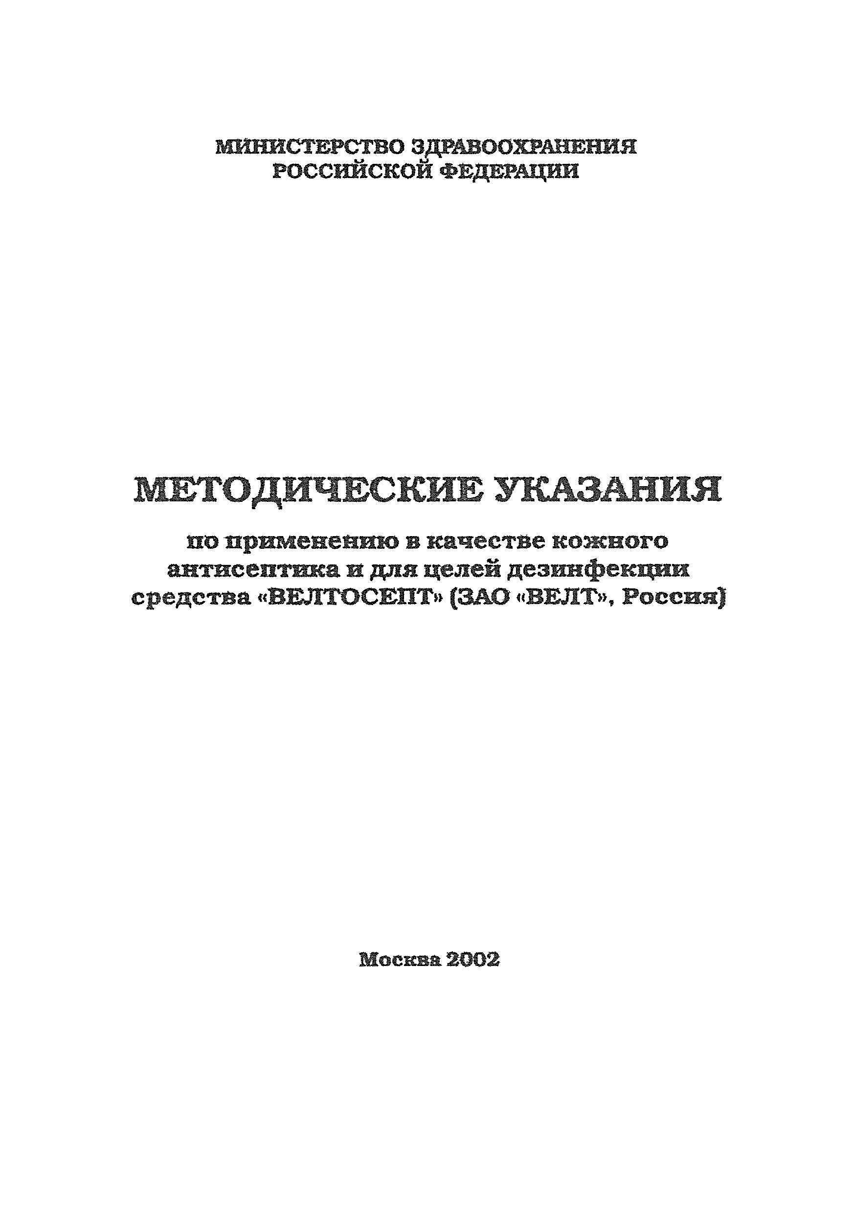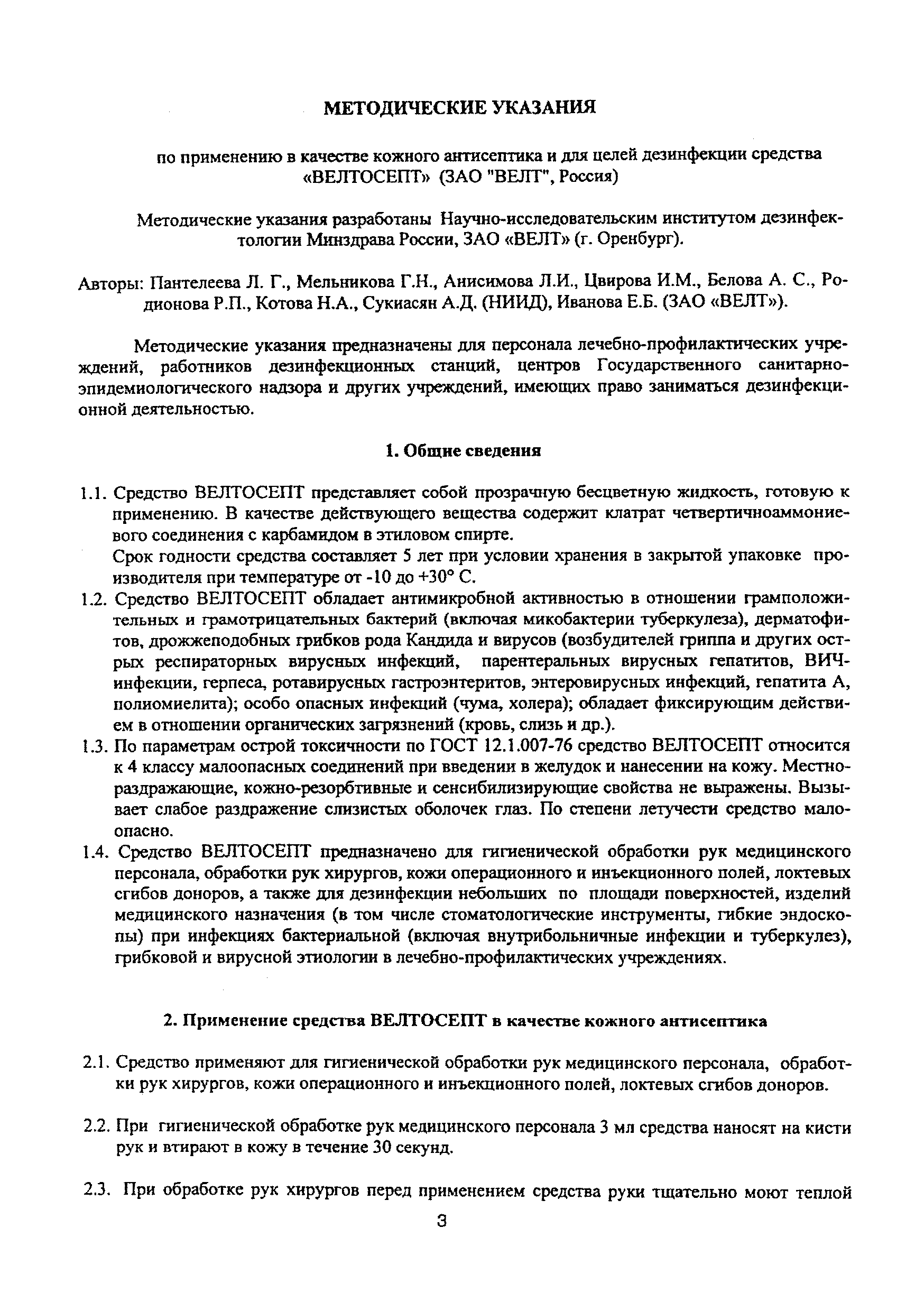 | Название рус.: | Методические указания по применению в качестве кожного антисептика и для целей дезинфекции средства "Велтосепт" (ЗАО "Велт", Россия) |