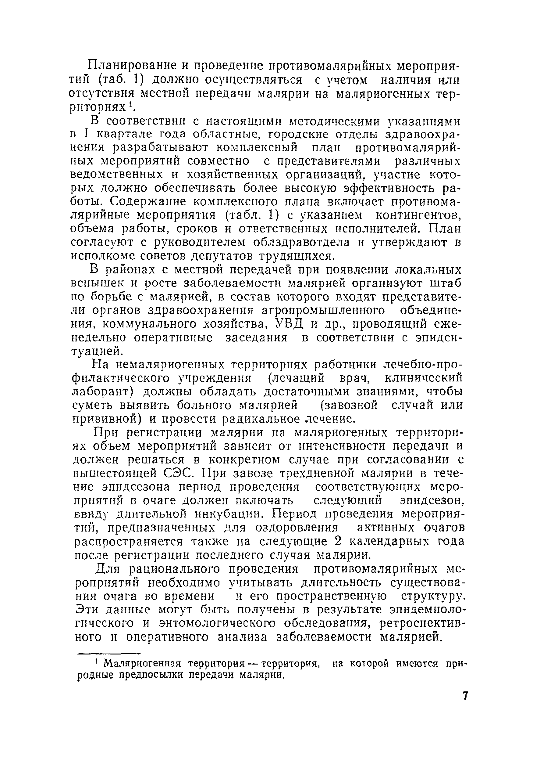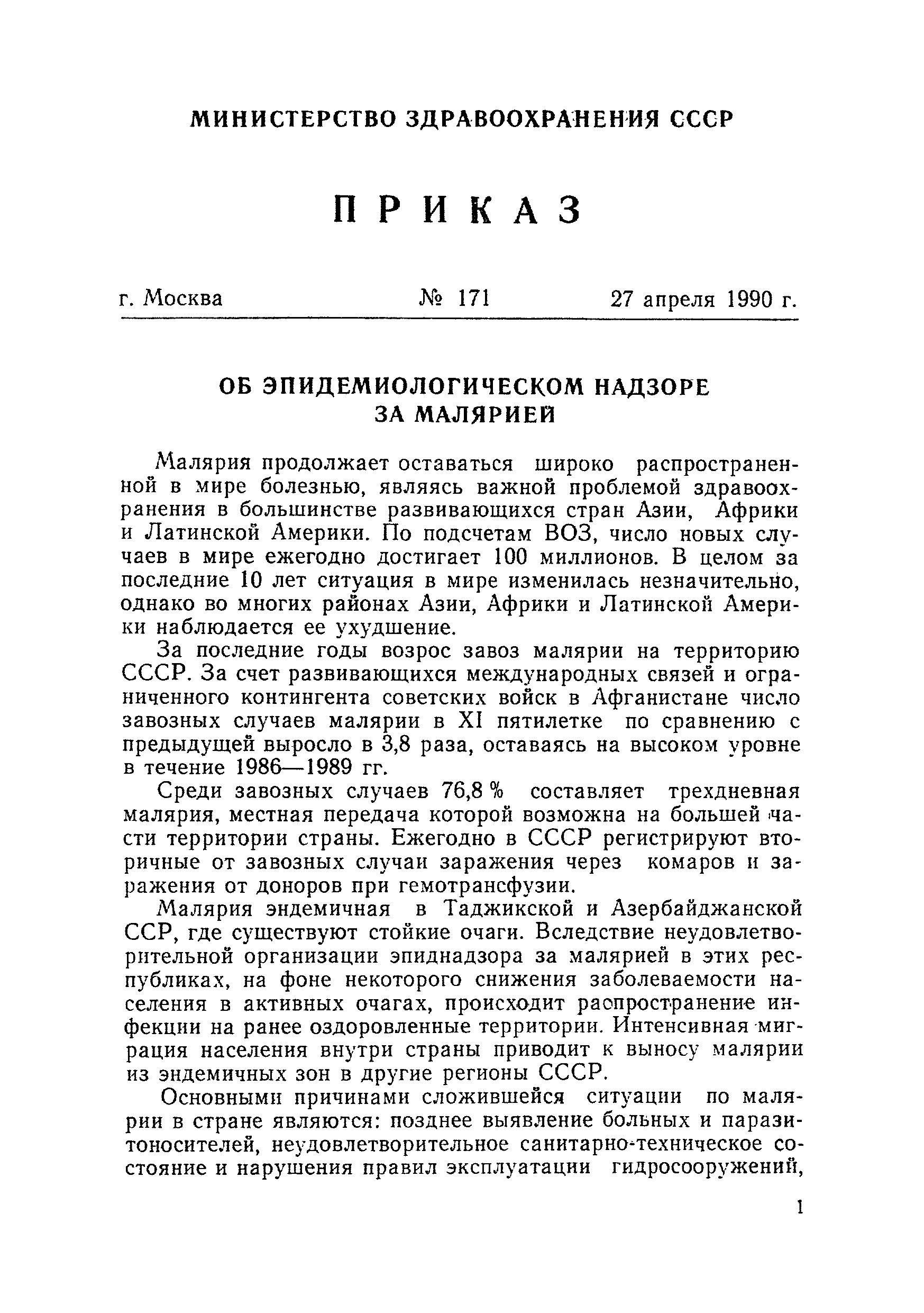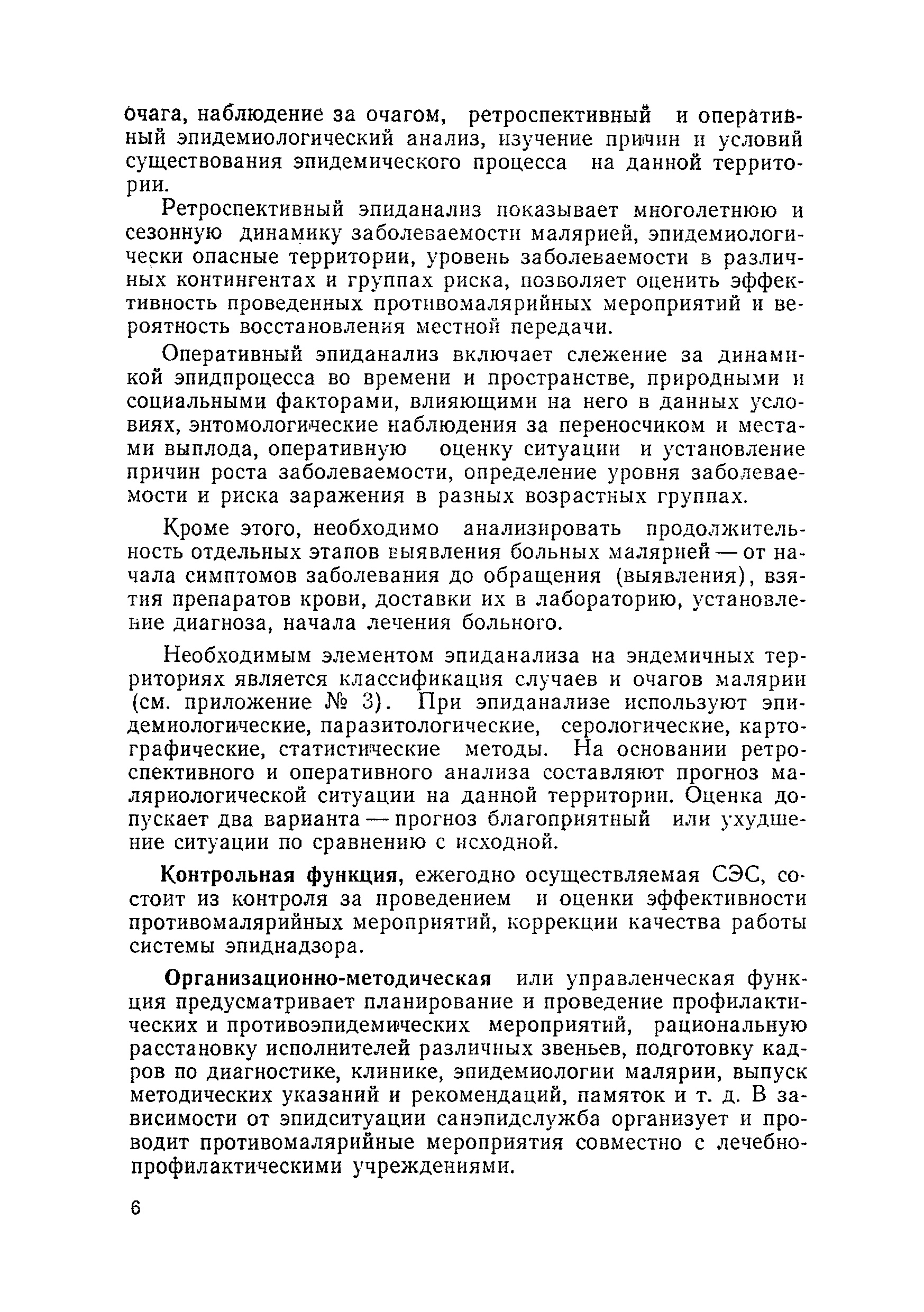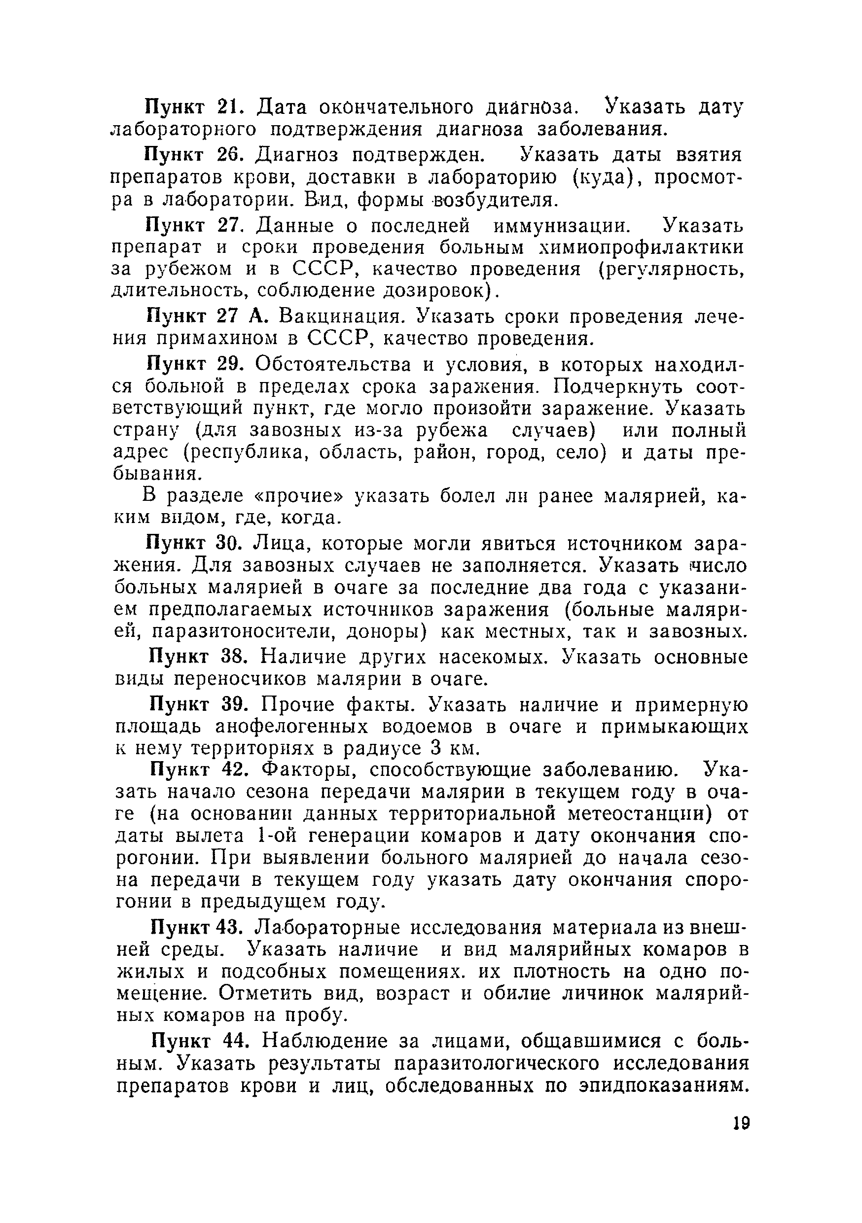 Методические указания по организации эпидемиологического надзора за малярией на территории СССР| Статус: | действует | | Название рус.: | Методические указания по организации эпидемиологического надзора за малярией на территории СССР | | Дата добавления в базу: | 01.02.2017 | | Дата актуализации: | 01.01.2021 | | Область применения: | Эпидемиологический надзор за малярией - это система противоэпидемических и профилактических мероприятий, направленных на поддержание благополучия по малярии, включающая сбор и оценку информации о заболеваемости малярией и маляриогенности территории, проведение необходимых профилактических и противоэпидемических мероприятий, анализ и оценку их эффективности | | Оглавление: | I. Лечебно-профилактические мероприятия 1. Выявление больных малярией и паразитоносителей 2. Лечение больных малярией и паразитоносителей 3. Эпидемиологическое обследование очага малярии 4. Химиопрофилактика (сезонная и межсезонная) 6. Проверка достоверности отсутствия местной передачи малярии II. Противокомариные мероприятия 1. Основные энтомологические наблюдения III. Санитарно-просветительная работа среди населения Приложение 2. Изменение в перечне внеочередных донесений, представляемых Министерству здравоохранению СССР, утвержденном приказом Министра здравоохранения СССР от 4 сентября 1984 г. № 1025-ДСП Приложение 3. Инструкция к заполнению "Карты эпидемиологического обследования очага инфекционного заболевания" (учетная форма 357/у) при выявлении больного малярией или паразитоносителя IV. Выводы из эпидемиологического обследования | | Утверждён: | 27.04.1990 Министерство здравоохранения СССР (USSR Ministry of Health Care 171)