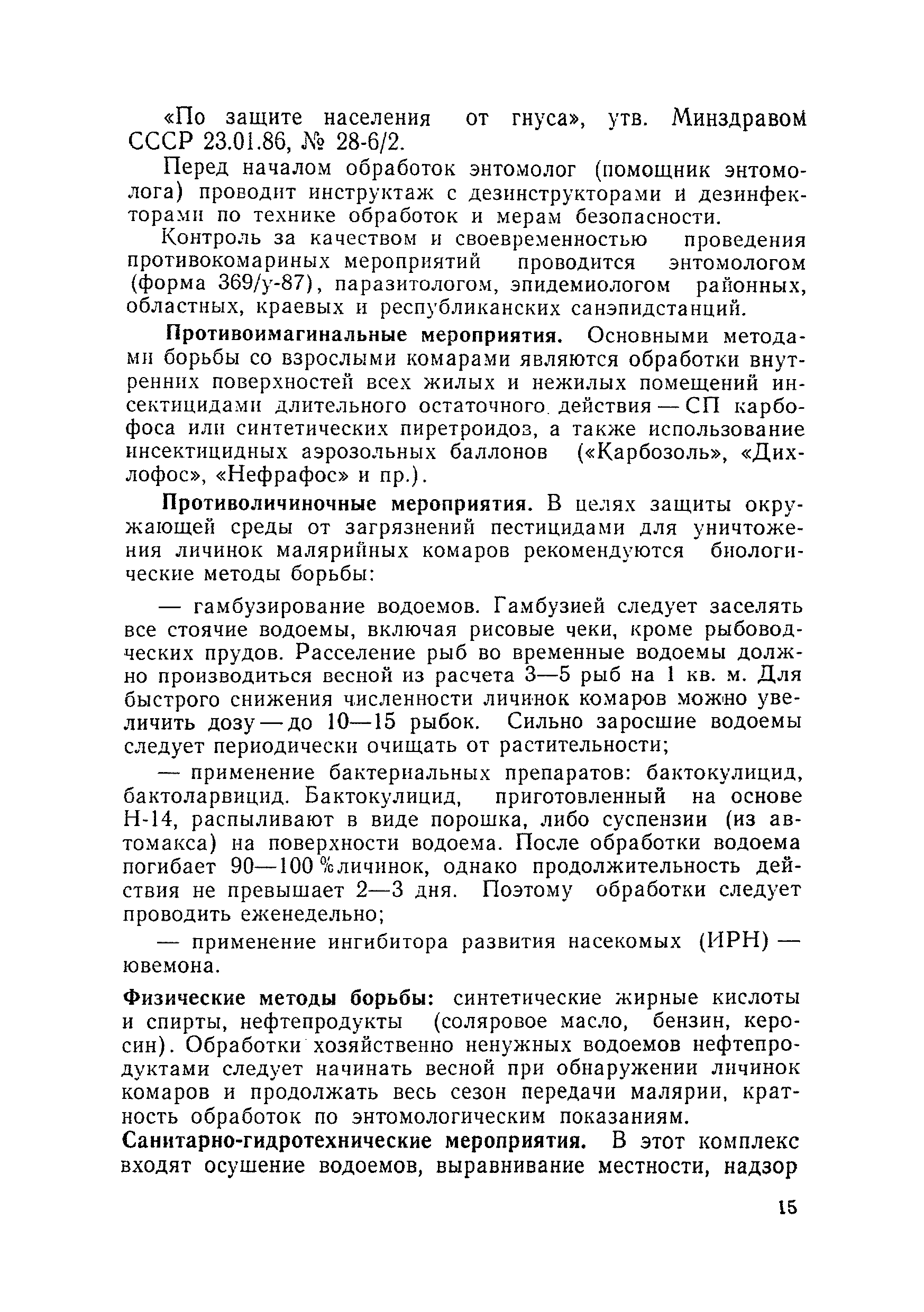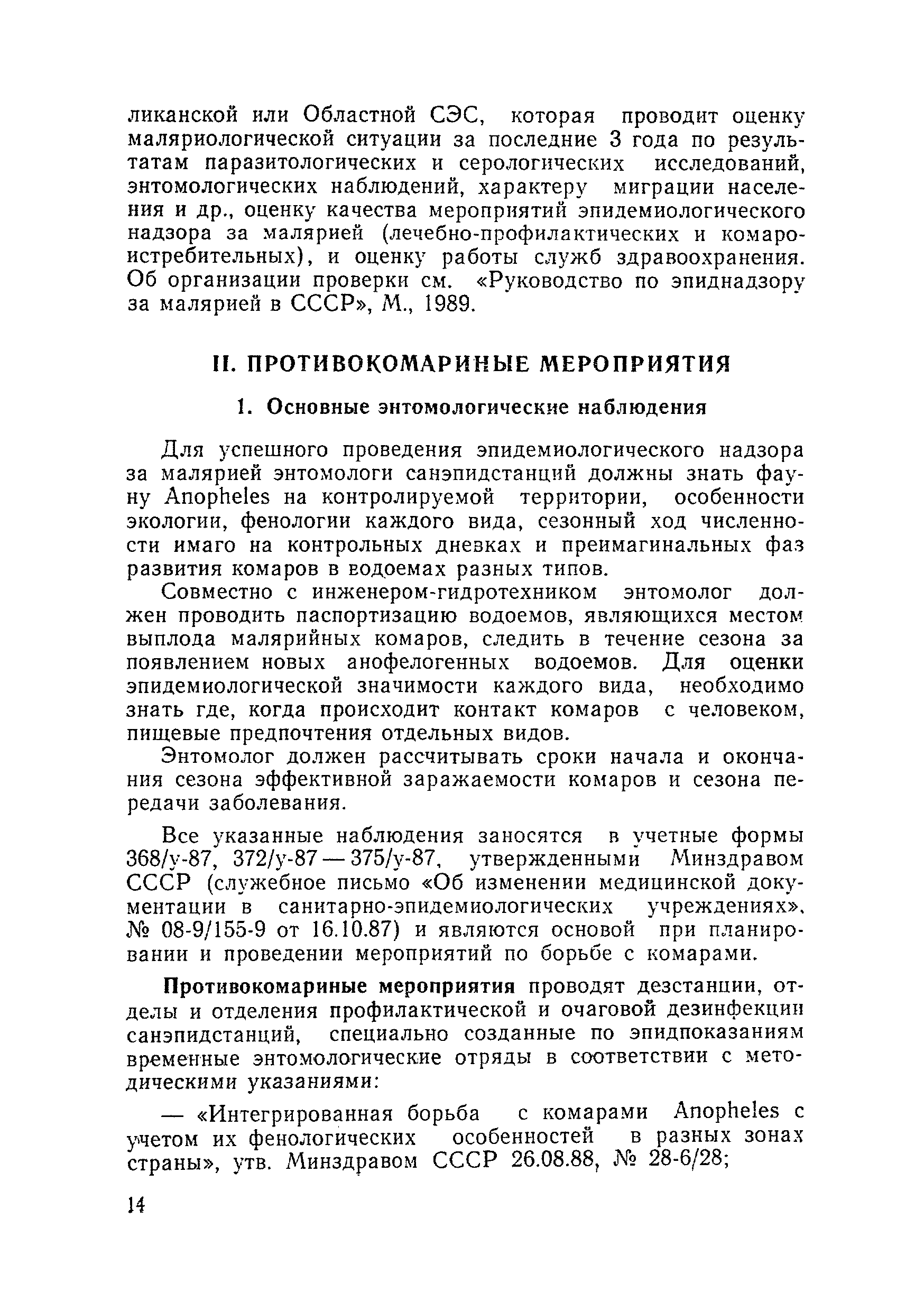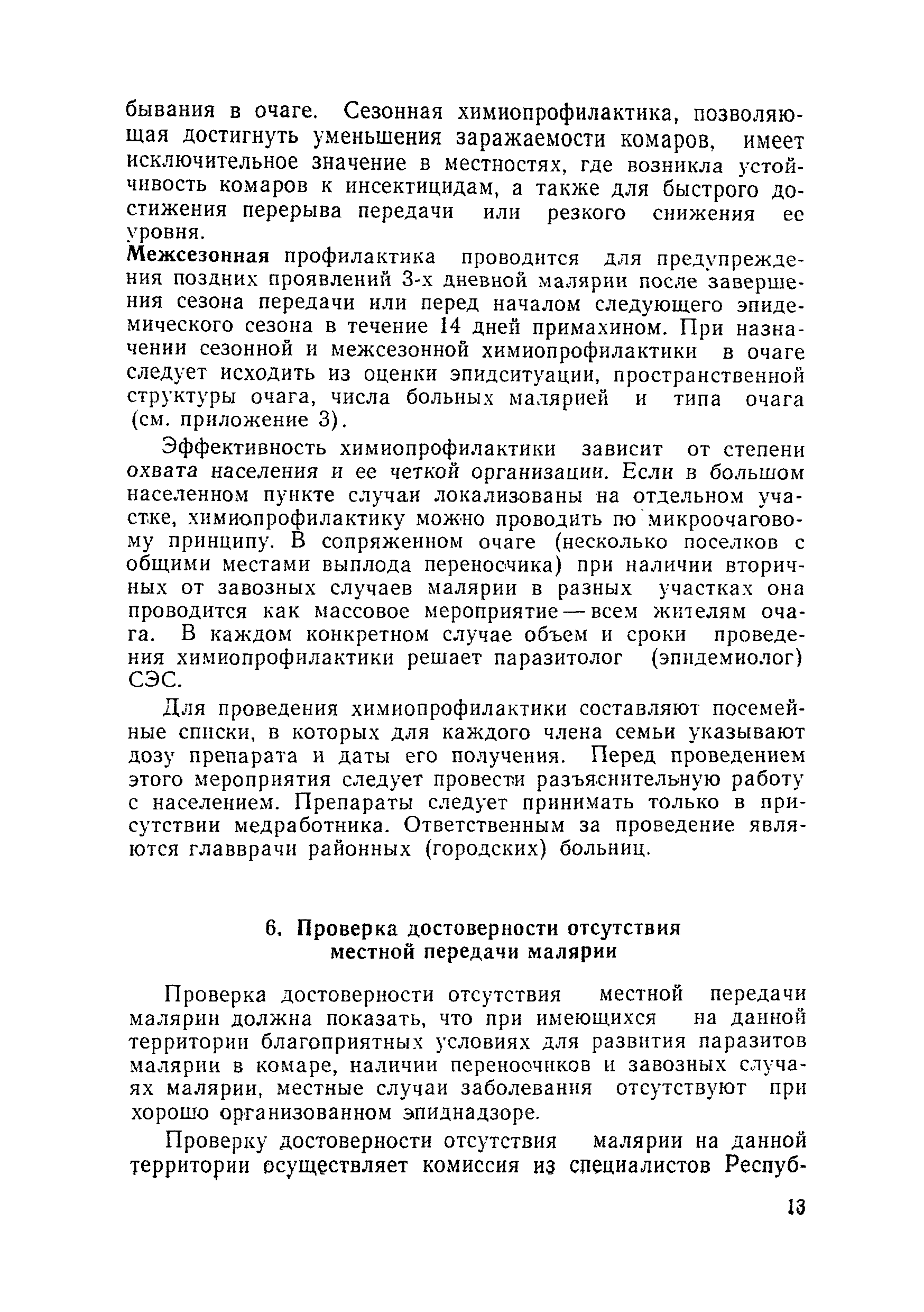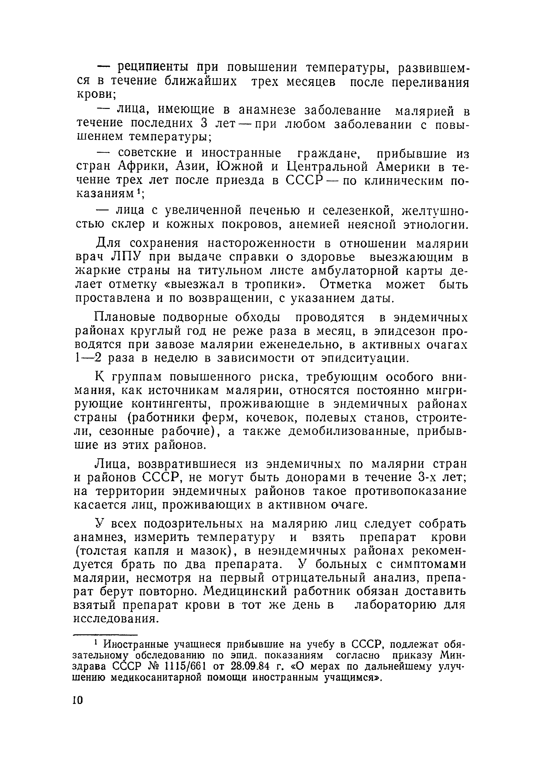 Методические указания по организации эпидемиологического надзора за малярией на территории СССР| Статус: | действует | | Название рус.: | Методические указания по организации эпидемиологического надзора за малярией на территории СССР | | Дата добавления в базу: | 01.02.2017 | | Дата актуализации: | 01.01.2021 | | Область применения: | Эпидемиологический надзор за малярией - это система противоэпидемических и профилактических мероприятий, направленных на поддержание благополучия по малярии, включающая сбор и оценку информации о заболеваемости малярией и маляриогенности территории, проведение необходимых профилактических и противоэпидемических мероприятий, анализ и оценку их эффективности | | Оглавление: | I. Лечебно-профилактические мероприятия 1. Выявление больных малярией и паразитоносителей 2. Лечение больных малярией и паразитоносителей 3. Эпидемиологическое обследование очага малярии 4. Химиопрофилактика (сезонная и межсезонная) 6. Проверка достоверности отсутствия местной передачи малярии II. Противокомариные мероприятия 1. Основные энтомологические наблюдения III. Санитарно-просветительная работа среди населения Приложение 2. Изменение в перечне внеочередных донесений, представляемых Министерству здравоохранению СССР, утвержденном приказом Министра здравоохранения СССР от 4 сентября 1984 г. № 1025-ДСП Приложение 3. Инструкция к заполнению "Карты эпидемиологического обследования очага инфекционного заболевания" (учетная форма 357/у) при выявлении больного малярией или паразитоносителя IV. Выводы из эпидемиологического обследования | | Утверждён: | 27.04.1990 Министерство здравоохранения СССР (USSR Ministry of Health Care 171)