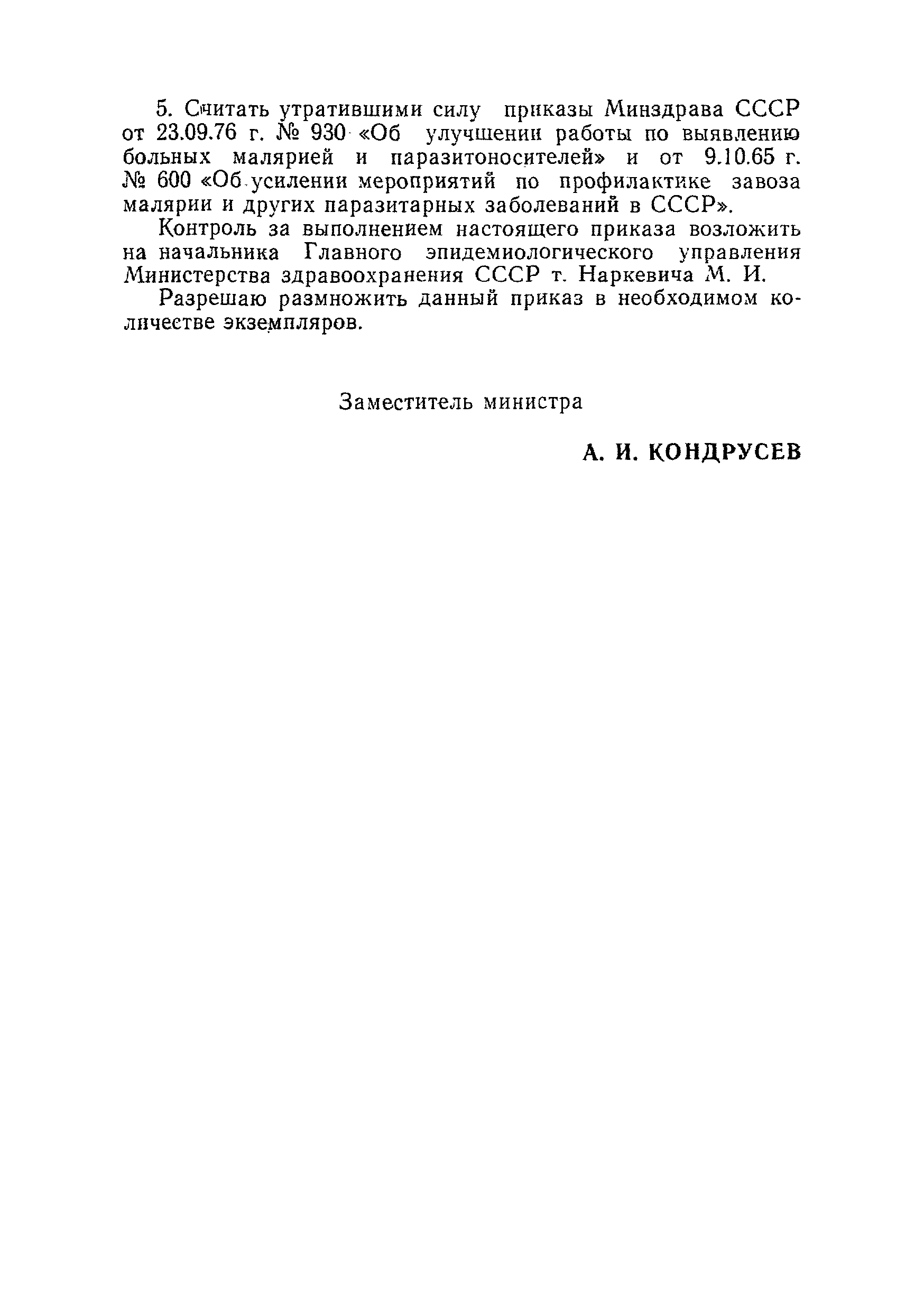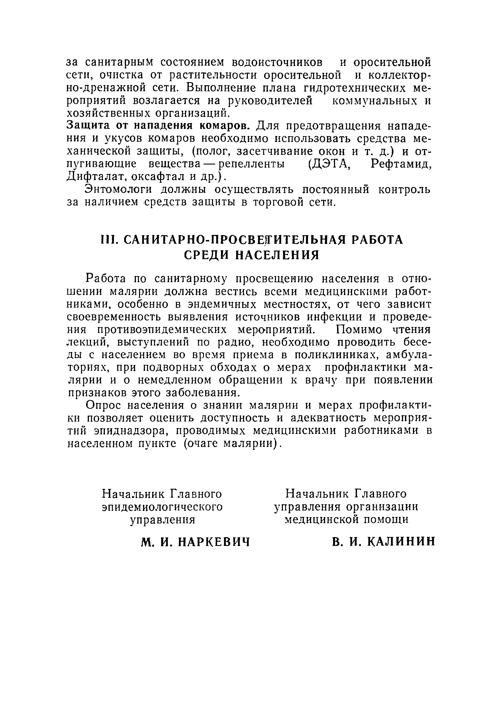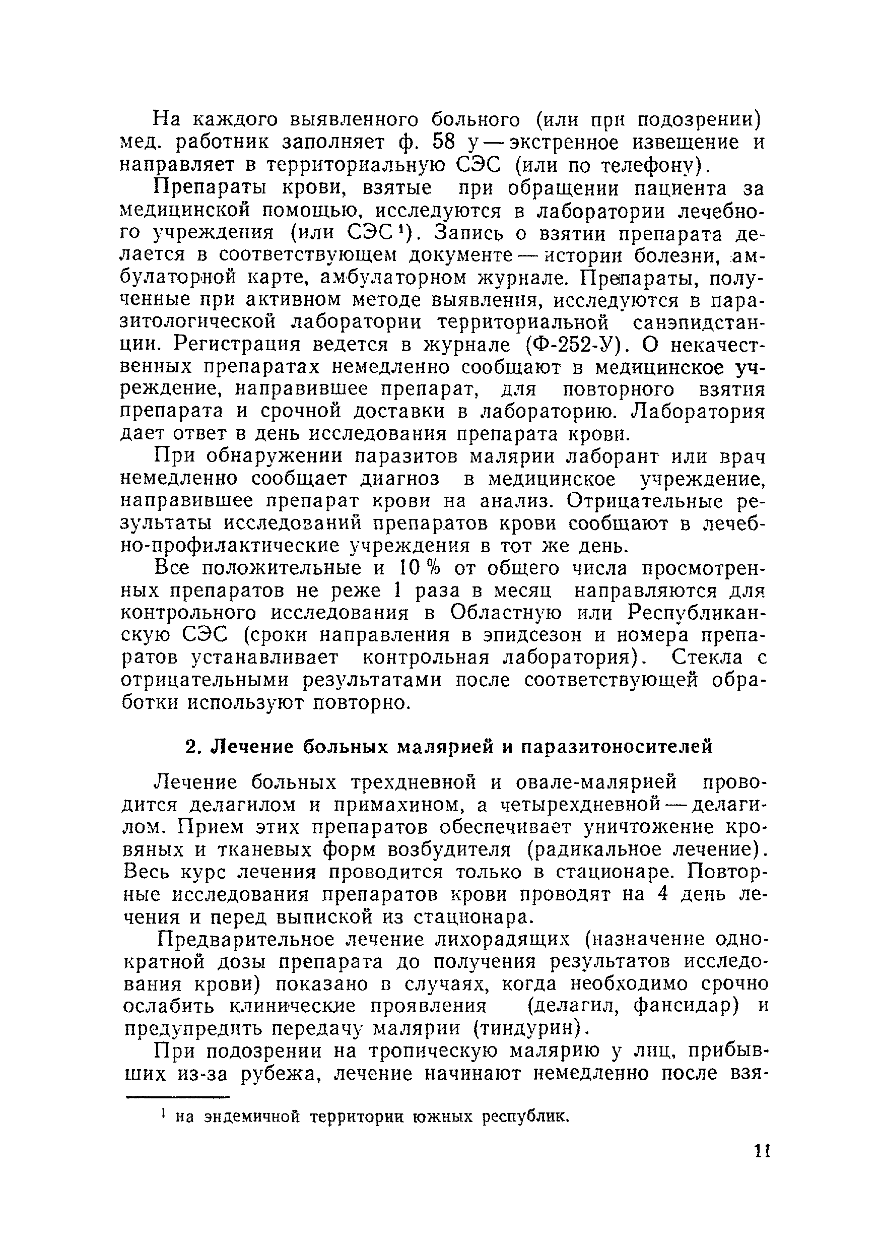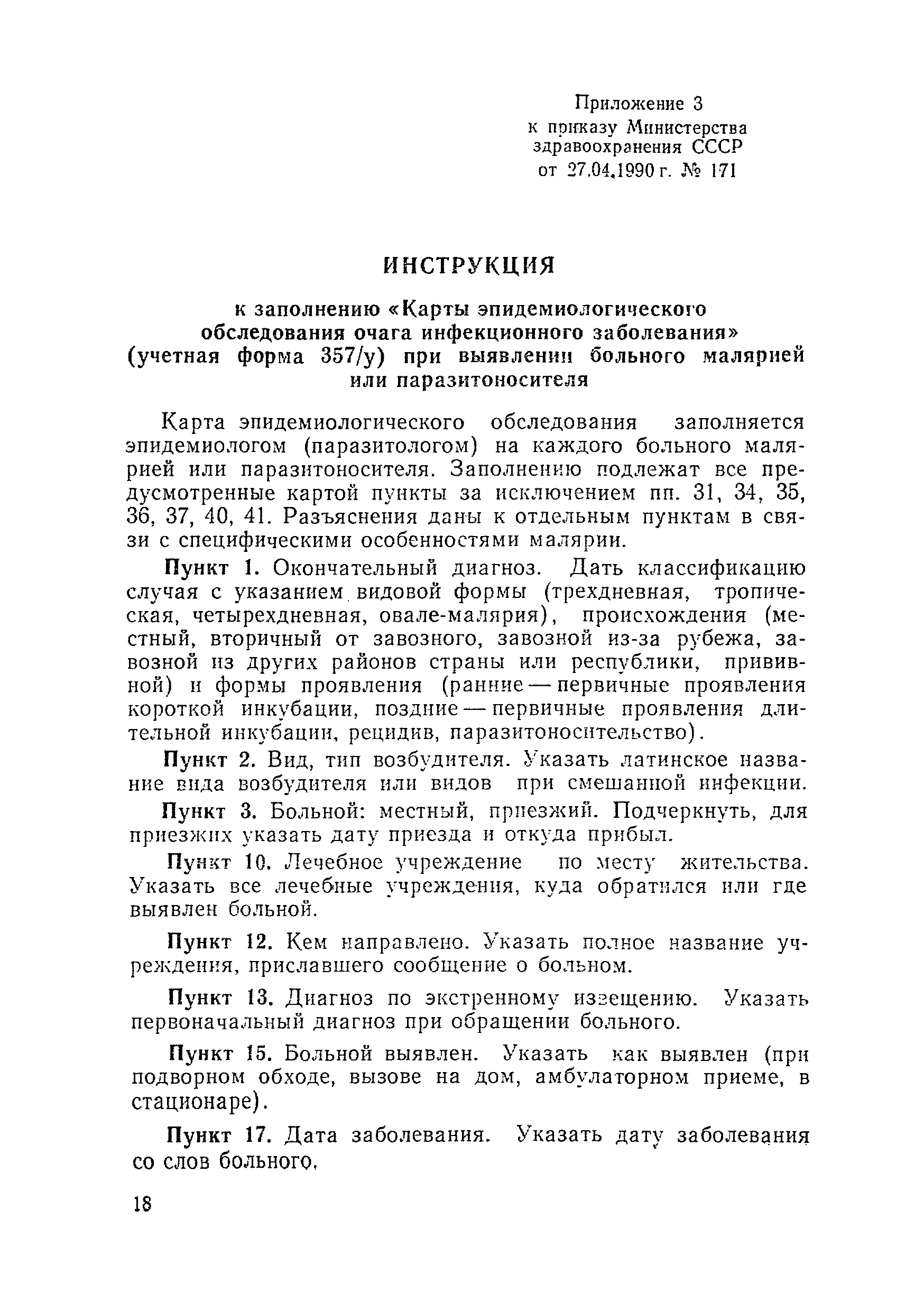 Методические указания по организации эпидемиологического надзора за малярией на территории СССР| Статус: | действует | | Название рус.: | Методические указания по организации эпидемиологического надзора за малярией на территории СССР | | Дата добавления в базу: | 01.02.2017 | | Дата актуализации: | 01.01.2021 | | Область применения: | Эпидемиологический надзор за малярией - это система противоэпидемических и профилактических мероприятий, направленных на поддержание благополучия по малярии, включающая сбор и оценку информации о заболеваемости малярией и маляриогенности территории, проведение необходимых профилактических и противоэпидемических мероприятий, анализ и оценку их эффективности | | Оглавление: | I. Лечебно-профилактические мероприятия 1. Выявление больных малярией и паразитоносителей 2. Лечение больных малярией и паразитоносителей 3. Эпидемиологическое обследование очага малярии 4. Химиопрофилактика (сезонная и межсезонная) 6. Проверка достоверности отсутствия местной передачи малярии II. Противокомариные мероприятия 1. Основные энтомологические наблюдения III. Санитарно-просветительная работа среди населения Приложение 2. Изменение в перечне внеочередных донесений, представляемых Министерству здравоохранению СССР, утвержденном приказом Министра здравоохранения СССР от 4 сентября 1984 г. № 1025-ДСП Приложение 3. Инструкция к заполнению "Карты эпидемиологического обследования очага инфекционного заболевания" (учетная форма 357/у) при выявлении больного малярией или паразитоносителя IV. Выводы из эпидемиологического обследования | | Утверждён: | 27.04.1990 Министерство здравоохранения СССР (USSR Ministry of Health Care 171)