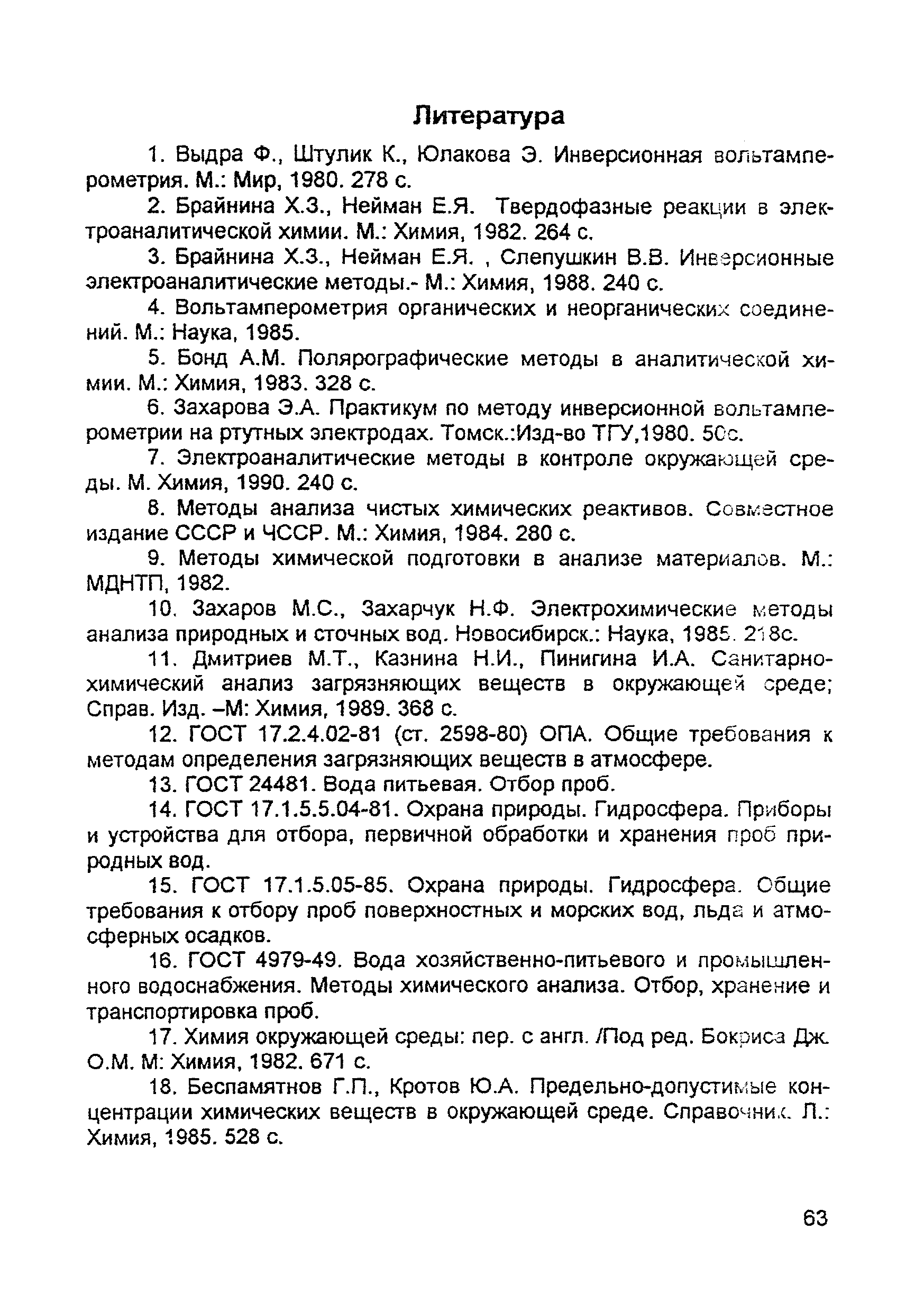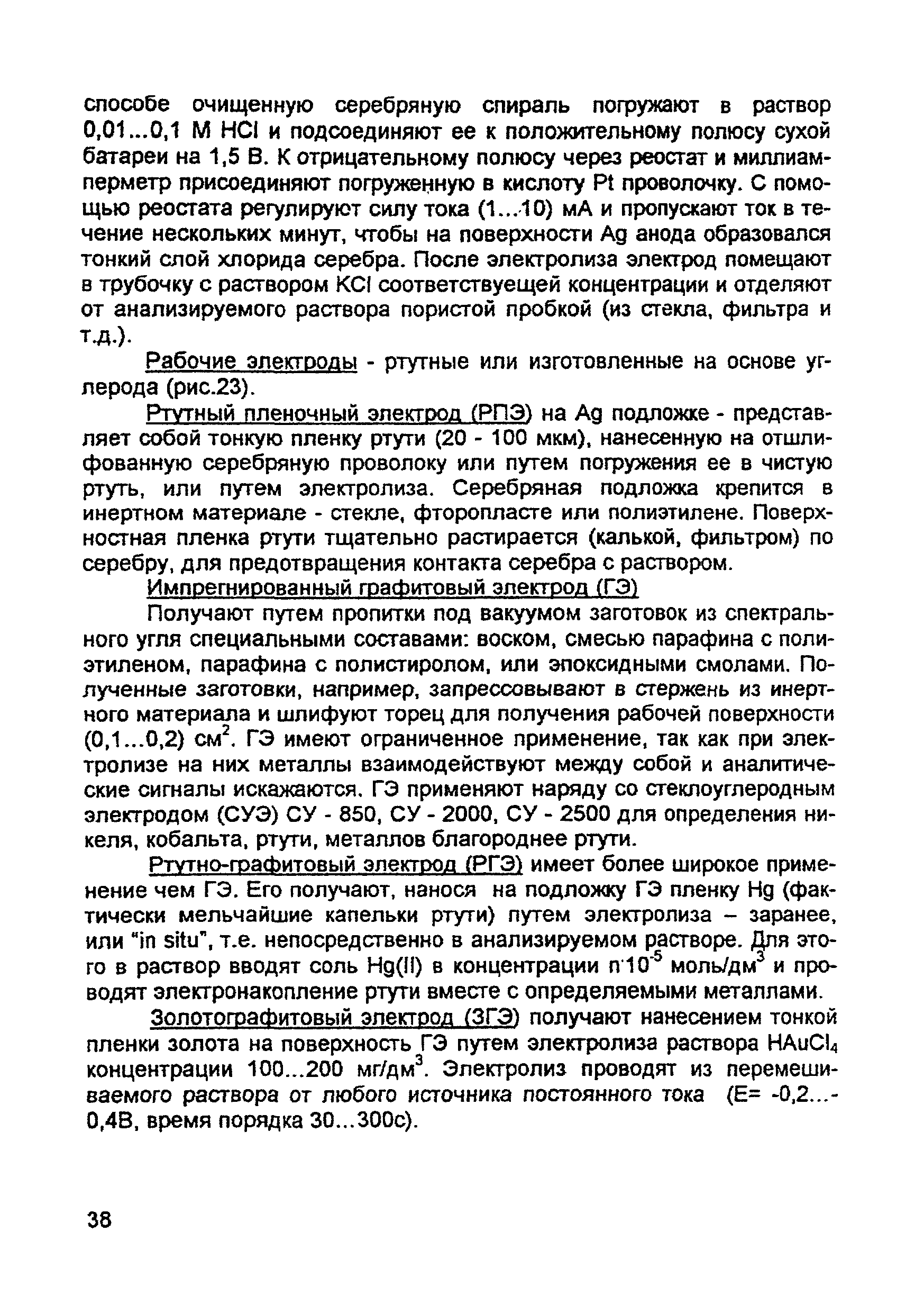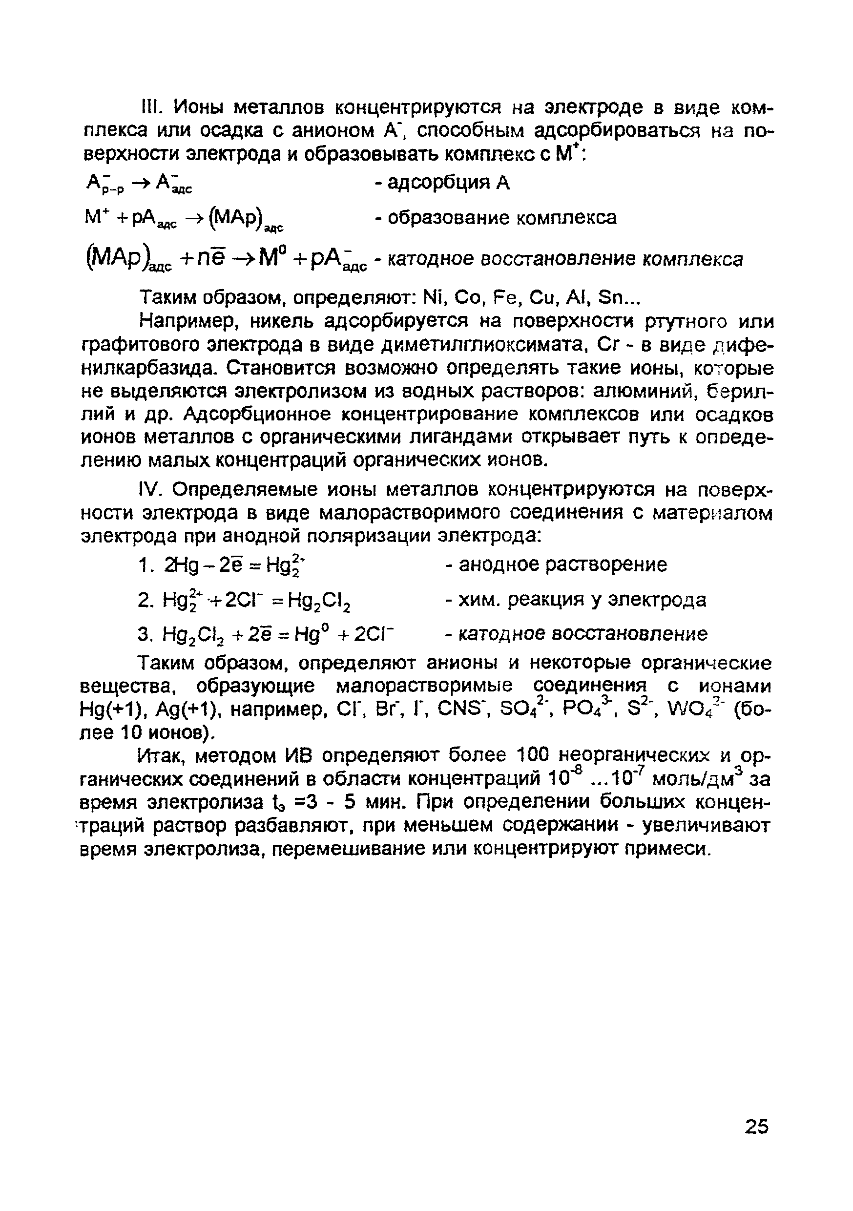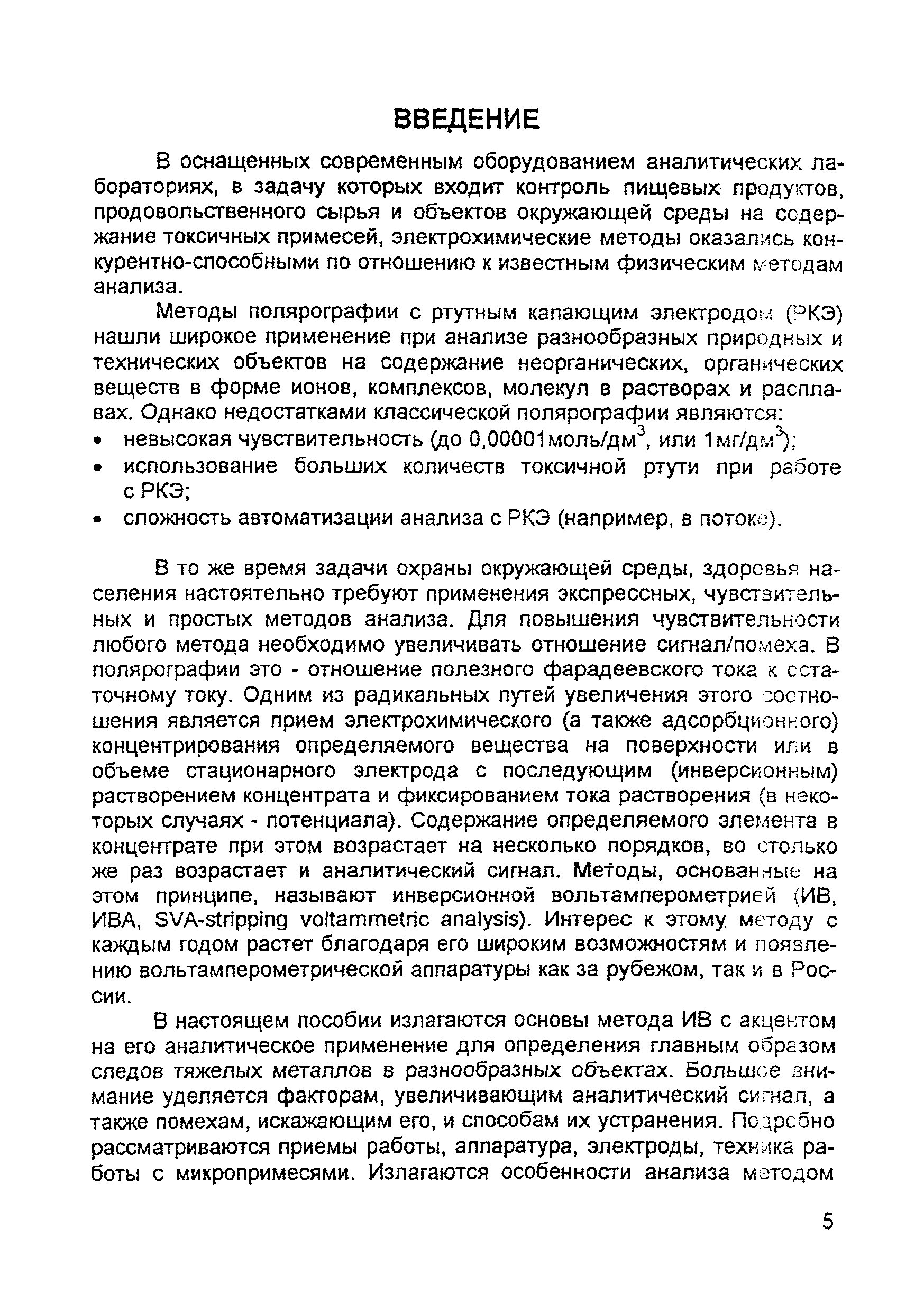 | Оглавление: | Введение 1. Сущность метода инверсионной вольтамперометрии 1.1. Аппаратура 1.2. Электрохимическая ячейка 1.3. Аналитический сигнал и помеха в методе ИВ 2. Факторы, влияющие на положение, форму и величину аналитического сигнала в методе ИВ 2.1. Краткое теоретическое введение 2.2. Изучение зависимостей Ia от Eэ, tэ, Cи на опыте для выбора оптимальных условий анализа 2.2.1. Выбор рабочего электрода 2.2.2. Выбор полярографического фона 2.2.3. Выбор потенциала электролиза 2.2.4. Выбор времени электролиза 2.2.5. Способы оценки концентрации неизвестного раствора 3. Способы концентрирования элементов на электроде. Определяемые вещества 4. Факторы, искажающие и снижающие аналитический сигнал. Способы устранения помех 4.1. Растворенный кислород 4.2. Наложение пиков элементов 4.3. Достижение растворимости металла в ртути 4.4. Образование интерметаллических соединений (ИМС) между металлами, выделенными на электроде 4.5. Влияние поверхностно-активных веществ (ПАВ, ПАОВ) 5. Техника работы в методе ИВ 5.1. Требования к чистоте лаборатории 5.2. Требования к чистоте воды, реактивов. Приготовление стандартных растворов 5.3. Требования к посуде 5.4. Подготовка к работе датчика 5.5. Подготовка электродов и их активация Способы регенерации электродов 5.6. Подготовка к работе прибора (анализатора) 5.6.1. Калибровка прибора по току и проверка его работоспособности 5.6.2. Снятие вольтамперограммы в анализируемом растворе 5.7. Типичные искажения вольтамперограмм 6. Анализ объектов окружающей среды методом ИВ 6.1. Анализ вод 6.2. Анализ аэрозолей и воздуха 6.3. Анализ почв 6.4. Анализ биологических объектов 6.5. Анализ пищевых продуктов 7. Метрологическое обеспечение 7.1. Общие положения 7.2. Нормативы контроля точности 7.3. Расчет нормативов оперативного контроля Приложение 1. Перечень аттестованных вольтамперометрических методик количественного химического анализа, разработанных в Томском политехническом университете Литература |