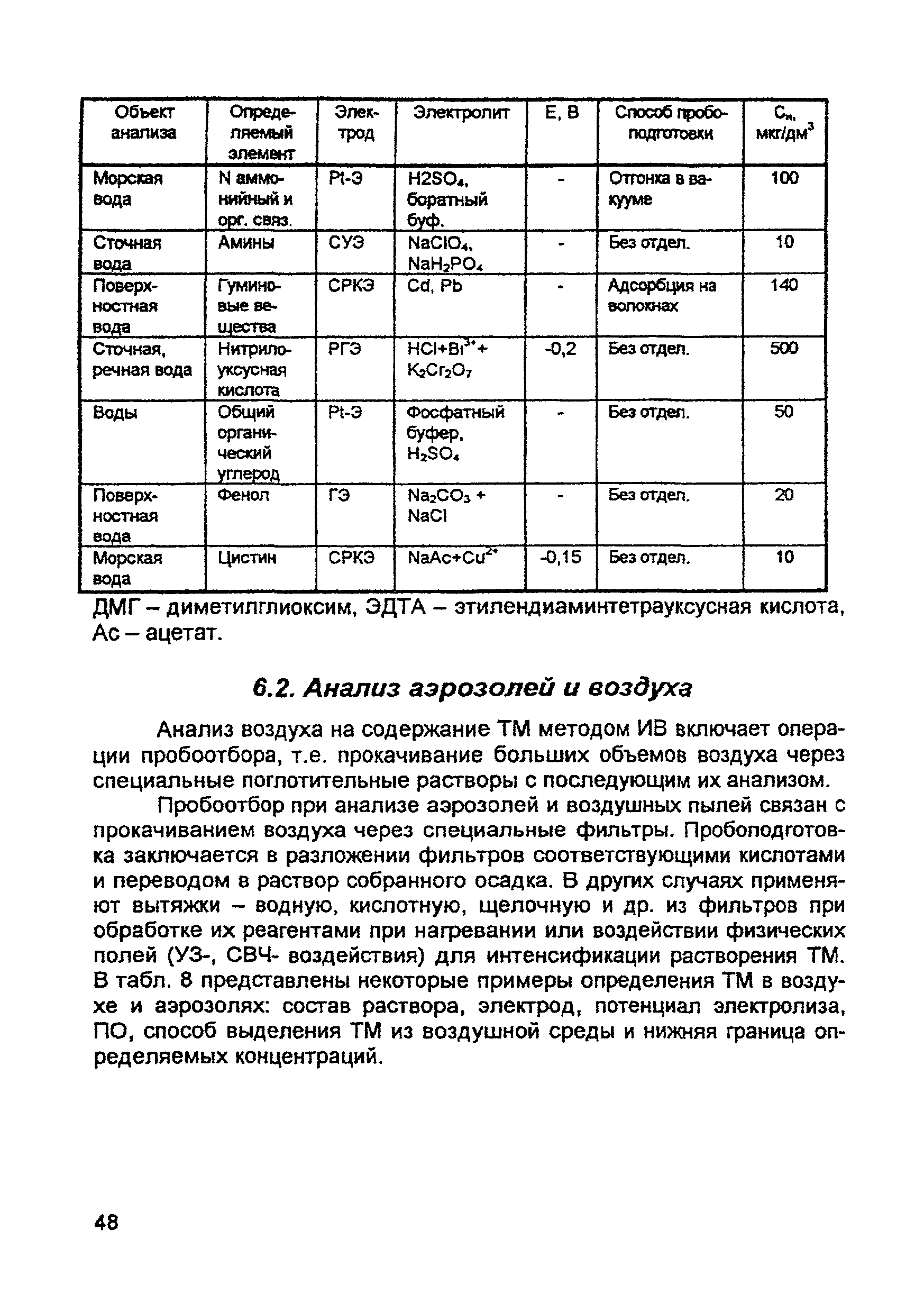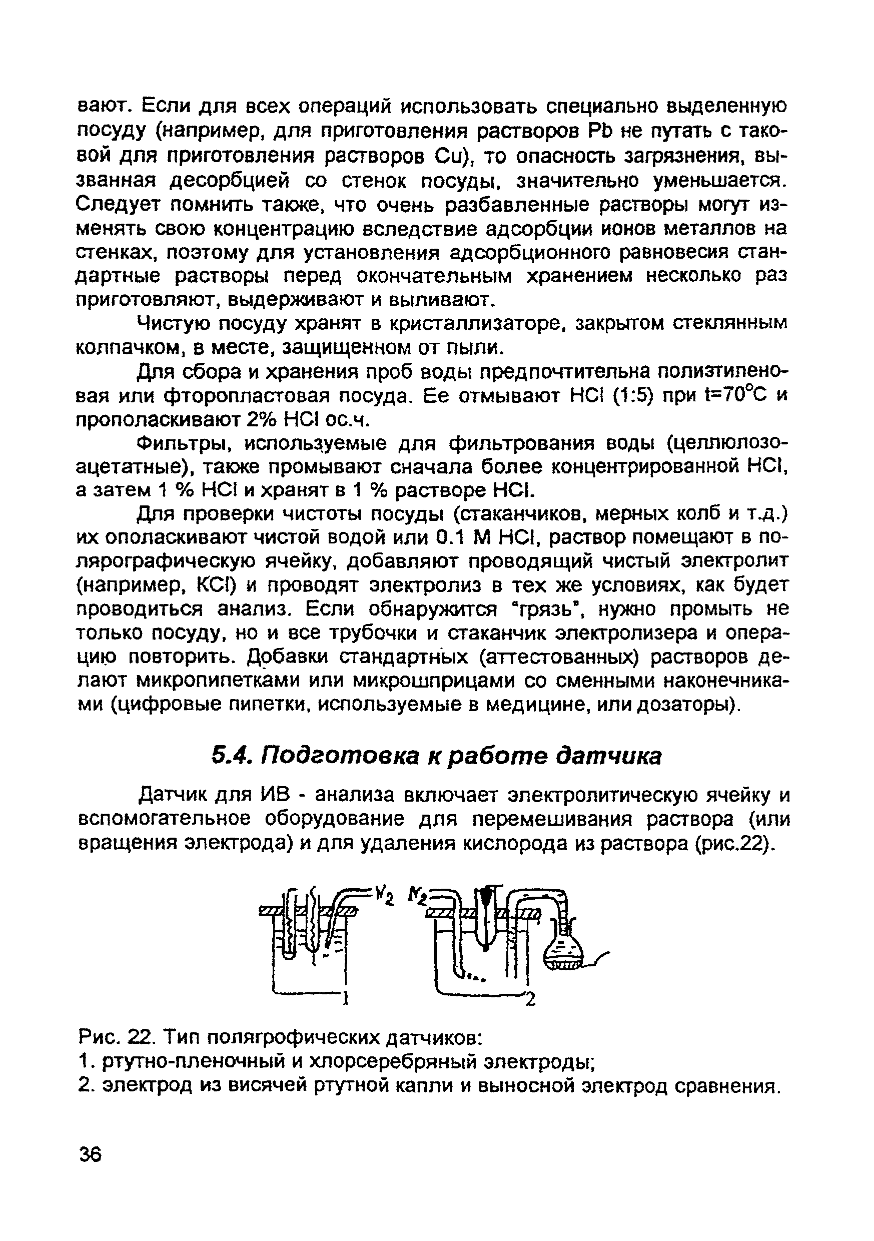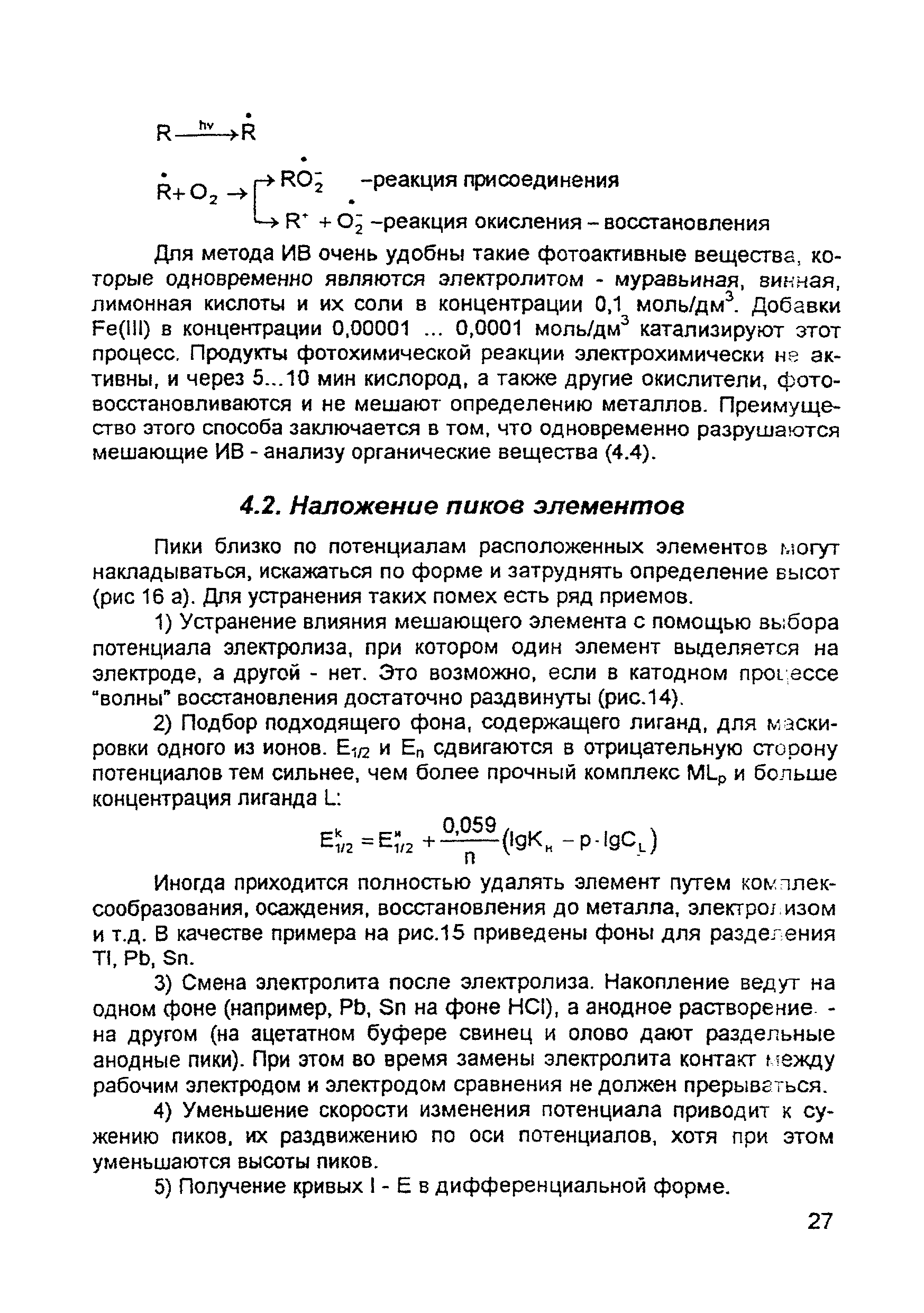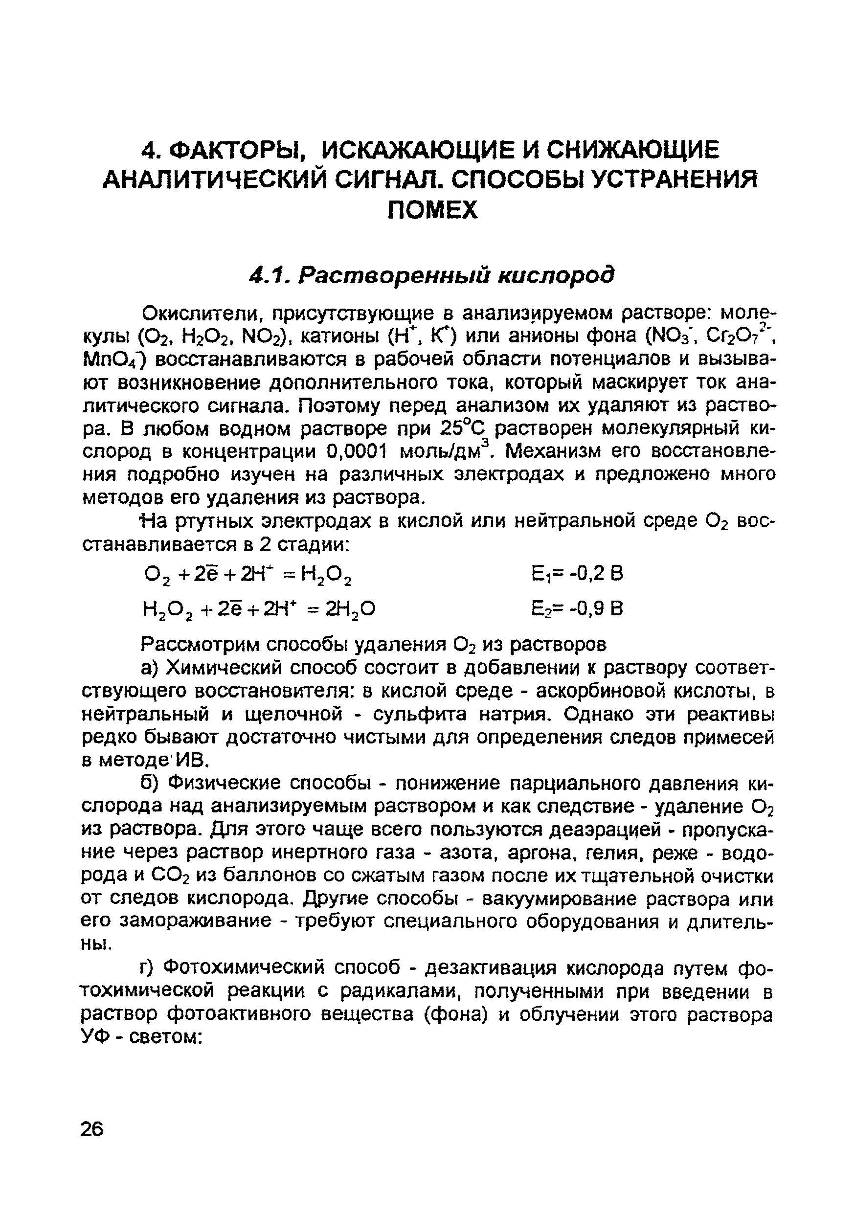 | Оглавление: | Введение 1. Сущность метода инверсионной вольтамперометрии 1.1. Аппаратура 1.2. Электрохимическая ячейка 1.3. Аналитический сигнал и помеха в методе ИВ 2. Факторы, влияющие на положение, форму и величину аналитического сигнала в методе ИВ 2.1. Краткое теоретическое введение 2.2. Изучение зависимостей Ia от Eэ, tэ, Cи на опыте для выбора оптимальных условий анализа 2.2.1. Выбор рабочего электрода 2.2.2. Выбор полярографического фона 2.2.3. Выбор потенциала электролиза 2.2.4. Выбор времени электролиза 2.2.5. Способы оценки концентрации неизвестного раствора 3. Способы концентрирования элементов на электроде. Определяемые вещества 4. Факторы, искажающие и снижающие аналитический сигнал. Способы устранения помех 4.1. Растворенный кислород 4.2. Наложение пиков элементов 4.3. Достижение растворимости металла в ртути 4.4. Образование интерметаллических соединений (ИМС) между металлами, выделенными на электроде 4.5. Влияние поверхностно-активных веществ (ПАВ, ПАОВ) 5. Техника работы в методе ИВ 5.1. Требования к чистоте лаборатории 5.2. Требования к чистоте воды, реактивов. Приготовление стандартных растворов 5.3. Требования к посуде 5.4. Подготовка к работе датчика 5.5. Подготовка электродов и их активация Способы регенерации электродов 5.6. Подготовка к работе прибора (анализатора) 5.6.1. Калибровка прибора по току и проверка его работоспособности 5.6.2. Снятие вольтамперограммы в анализируемом растворе 5.7. Типичные искажения вольтамперограмм 6. Анализ объектов окружающей среды методом ИВ 6.1. Анализ вод 6.2. Анализ аэрозолей и воздуха 6.3. Анализ почв 6.4. Анализ биологических объектов 6.5. Анализ пищевых продуктов 7. Метрологическое обеспечение 7.1. Общие положения 7.2. Нормативы контроля точности 7.3. Расчет нормативов оперативного контроля Приложение 1. Перечень аттестованных вольтамперометрических методик количественного химического анализа, разработанных в Томском политехническом университете Литература |
