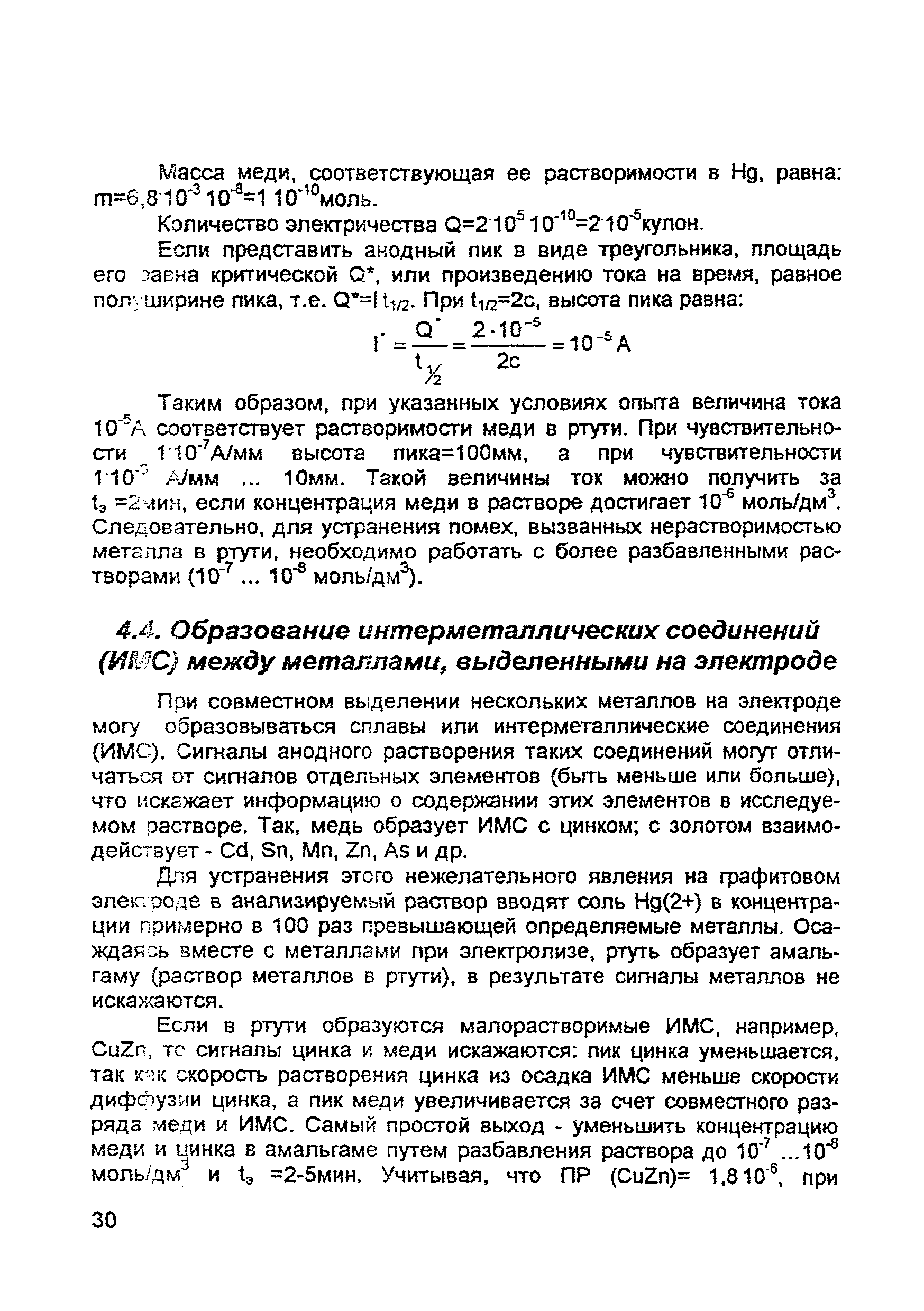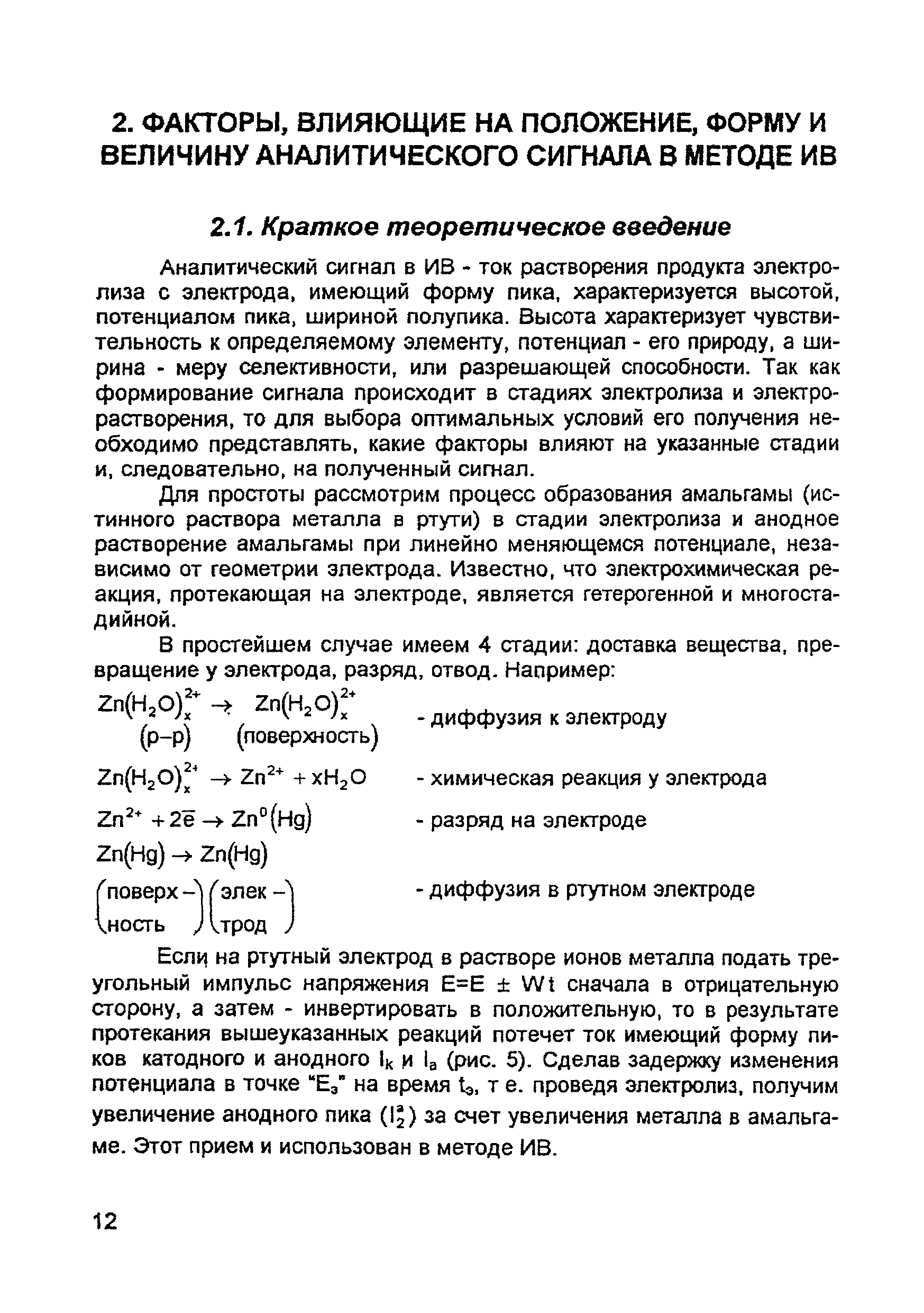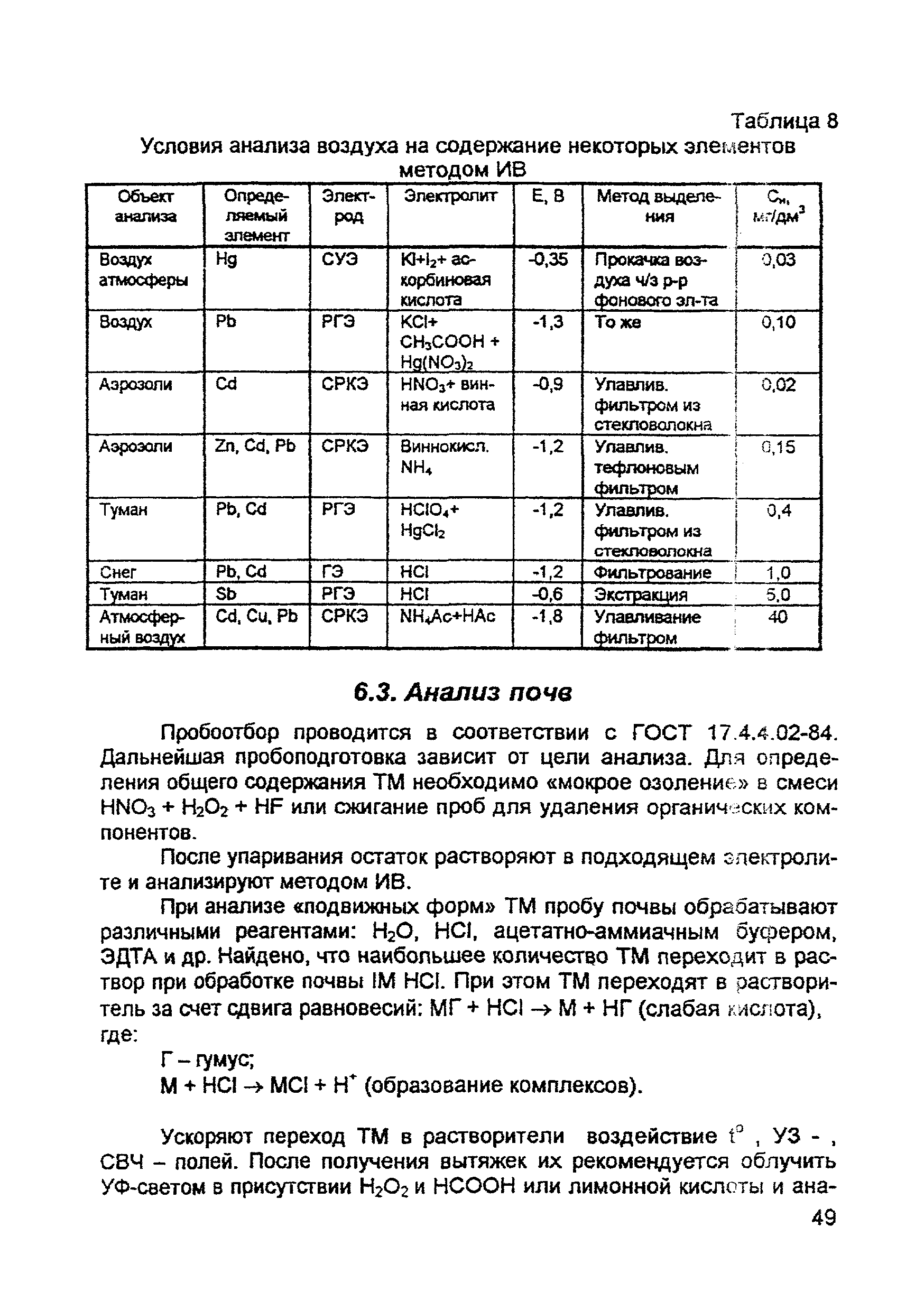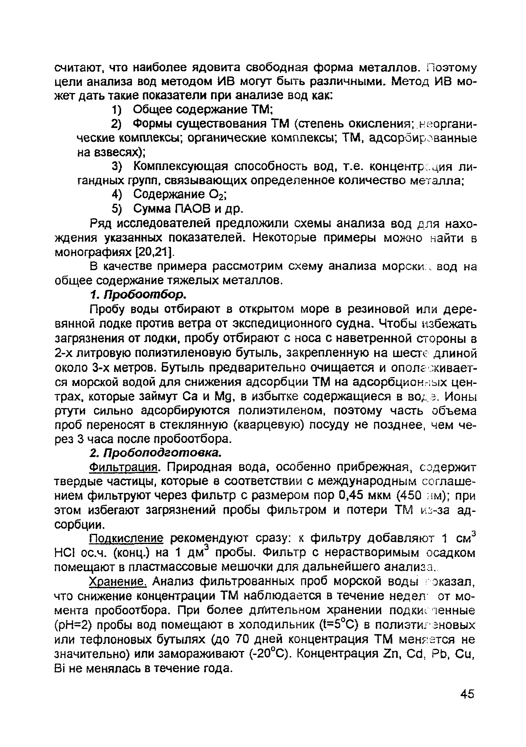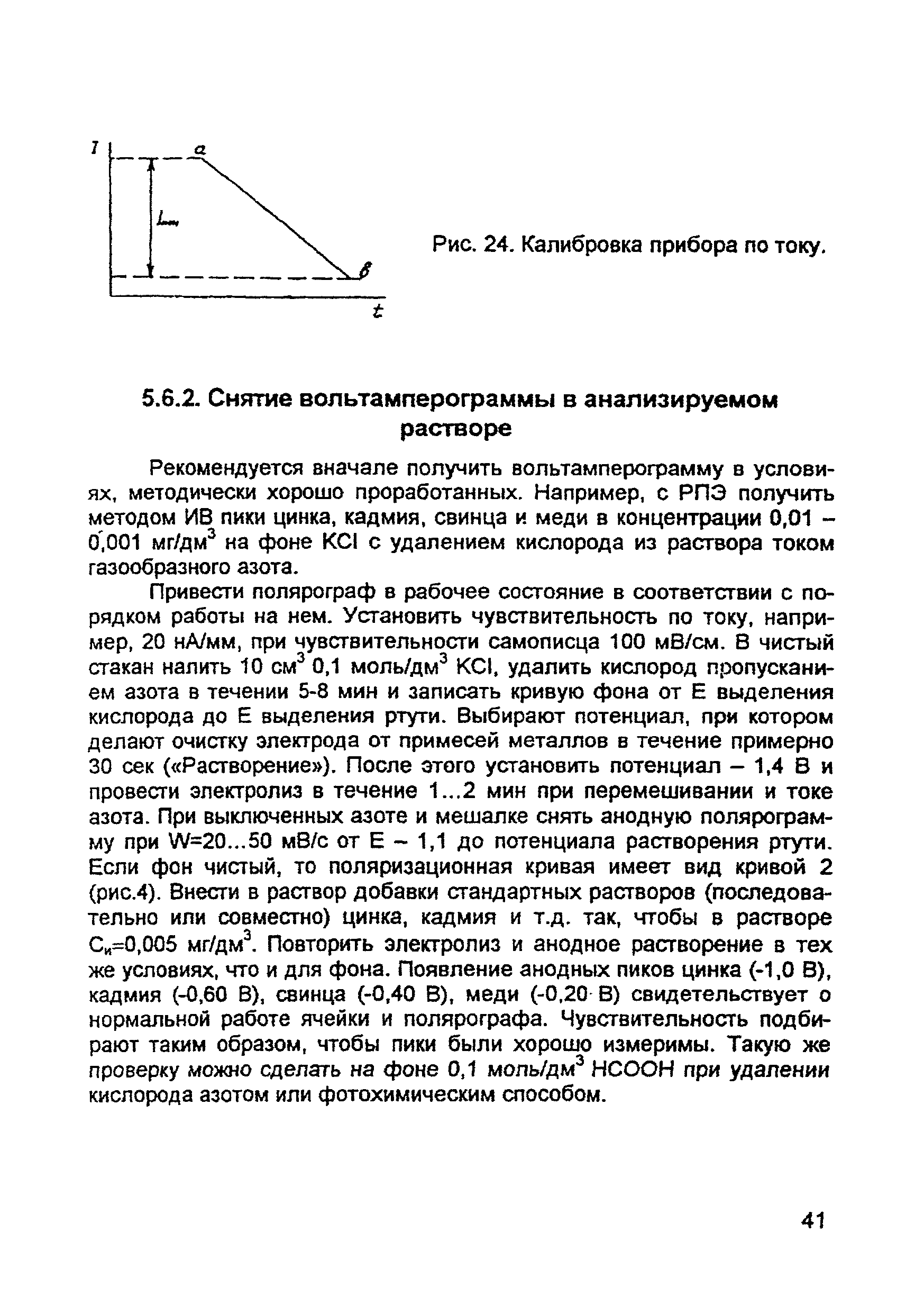 | Оглавление: | Введение 1. Сущность метода инверсионной вольтамперометрии 1.1. Аппаратура 1.2. Электрохимическая ячейка 1.3. Аналитический сигнал и помеха в методе ИВ 2. Факторы, влияющие на положение, форму и величину аналитического сигнала в методе ИВ 2.1. Краткое теоретическое введение 2.2. Изучение зависимостей Ia от Eэ, tэ, Cи на опыте для выбора оптимальных условий анализа 2.2.1. Выбор рабочего электрода 2.2.2. Выбор полярографического фона 2.2.3. Выбор потенциала электролиза 2.2.4. Выбор времени электролиза 2.2.5. Способы оценки концентрации неизвестного раствора 3. Способы концентрирования элементов на электроде. Определяемые вещества 4. Факторы, искажающие и снижающие аналитический сигнал. Способы устранения помех 4.1. Растворенный кислород 4.2. Наложение пиков элементов 4.3. Достижение растворимости металла в ртути 4.4. Образование интерметаллических соединений (ИМС) между металлами, выделенными на электроде 4.5. Влияние поверхностно-активных веществ (ПАВ, ПАОВ) 5. Техника работы в методе ИВ 5.1. Требования к чистоте лаборатории 5.2. Требования к чистоте воды, реактивов. Приготовление стандартных растворов 5.3. Требования к посуде 5.4. Подготовка к работе датчика 5.5. Подготовка электродов и их активация Способы регенерации электродов 5.6. Подготовка к работе прибора (анализатора) 5.6.1. Калибровка прибора по току и проверка его работоспособности 5.6.2. Снятие вольтамперограммы в анализируемом растворе 5.7. Типичные искажения вольтамперограмм 6. Анализ объектов окружающей среды методом ИВ 6.1. Анализ вод 6.2. Анализ аэрозолей и воздуха 6.3. Анализ почв 6.4. Анализ биологических объектов 6.5. Анализ пищевых продуктов 7. Метрологическое обеспечение 7.1. Общие положения 7.2. Нормативы контроля точности 7.3. Расчет нормативов оперативного контроля Приложение 1. Перечень аттестованных вольтамперометрических методик количественного химического анализа, разработанных в Томском политехническом университете Литература |