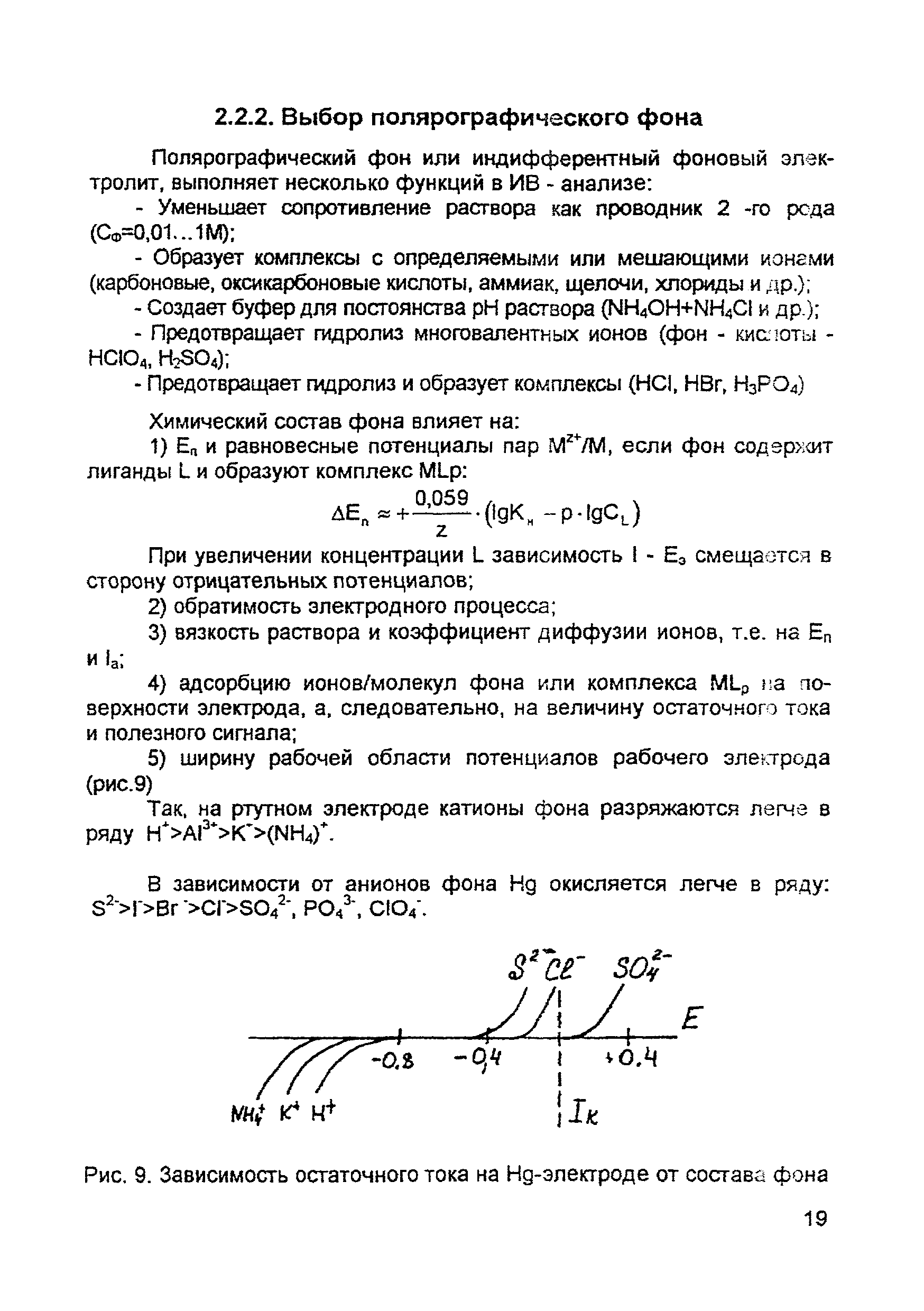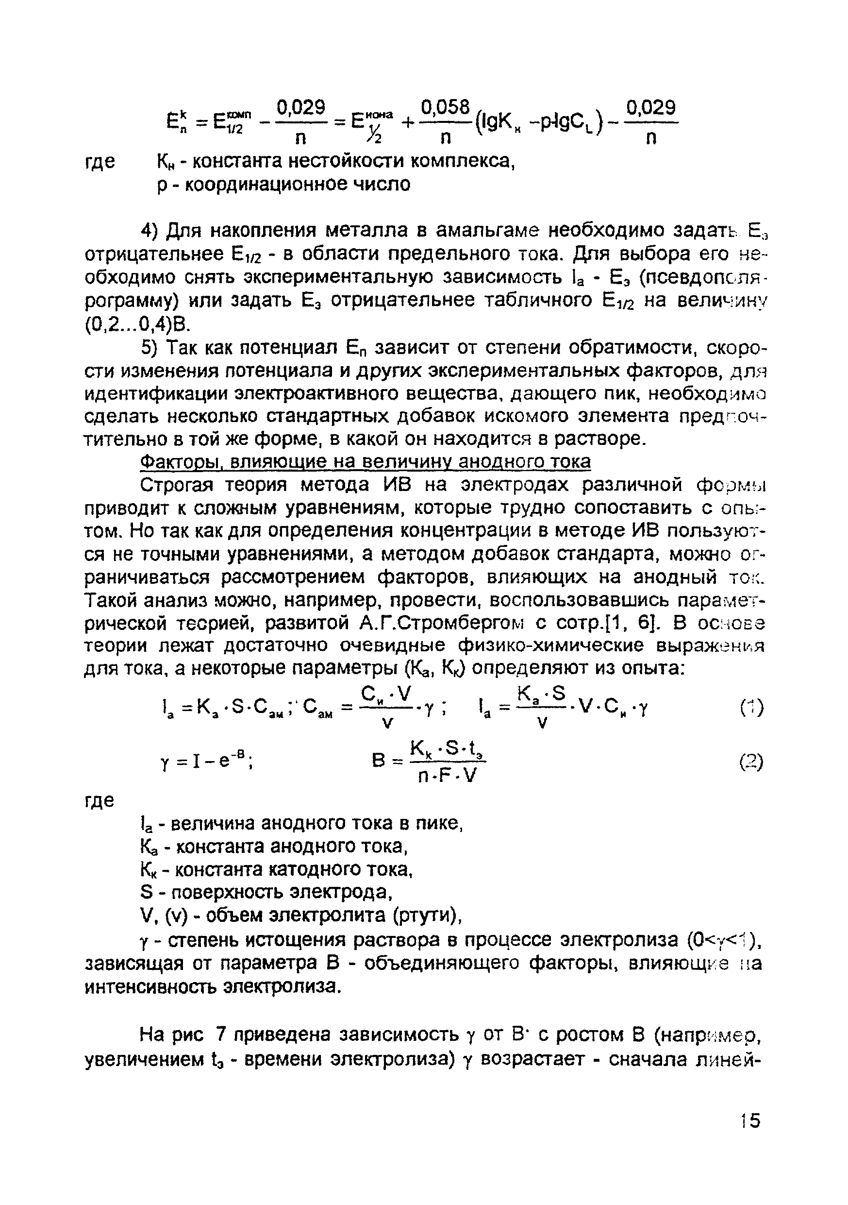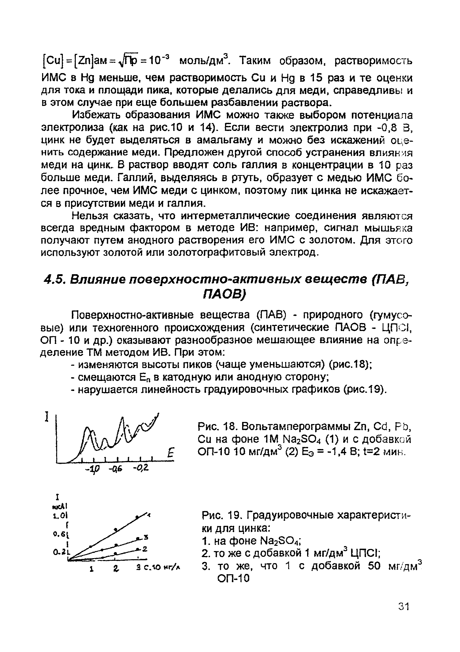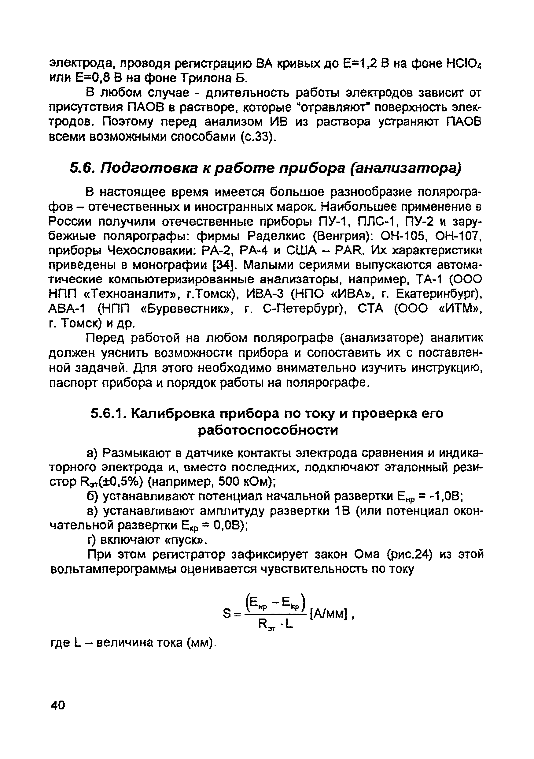 | Оглавление: | Введение 1. Сущность метода инверсионной вольтамперометрии 1.1. Аппаратура 1.2. Электрохимическая ячейка 1.3. Аналитический сигнал и помеха в методе ИВ 2. Факторы, влияющие на положение, форму и величину аналитического сигнала в методе ИВ 2.1. Краткое теоретическое введение 2.2. Изучение зависимостей Ia от Eэ, tэ, Cи на опыте для выбора оптимальных условий анализа 2.2.1. Выбор рабочего электрода 2.2.2. Выбор полярографического фона 2.2.3. Выбор потенциала электролиза 2.2.4. Выбор времени электролиза 2.2.5. Способы оценки концентрации неизвестного раствора 3. Способы концентрирования элементов на электроде. Определяемые вещества 4. Факторы, искажающие и снижающие аналитический сигнал. Способы устранения помех 4.1. Растворенный кислород 4.2. Наложение пиков элементов 4.3. Достижение растворимости металла в ртути 4.4. Образование интерметаллических соединений (ИМС) между металлами, выделенными на электроде 4.5. Влияние поверхностно-активных веществ (ПАВ, ПАОВ) 5. Техника работы в методе ИВ 5.1. Требования к чистоте лаборатории 5.2. Требования к чистоте воды, реактивов. Приготовление стандартных растворов 5.3. Требования к посуде 5.4. Подготовка к работе датчика 5.5. Подготовка электродов и их активация Способы регенерации электродов 5.6. Подготовка к работе прибора (анализатора) 5.6.1. Калибровка прибора по току и проверка его работоспособности 5.6.2. Снятие вольтамперограммы в анализируемом растворе 5.7. Типичные искажения вольтамперограмм 6. Анализ объектов окружающей среды методом ИВ 6.1. Анализ вод 6.2. Анализ аэрозолей и воздуха 6.3. Анализ почв 6.4. Анализ биологических объектов 6.5. Анализ пищевых продуктов 7. Метрологическое обеспечение 7.1. Общие положения 7.2. Нормативы контроля точности 7.3. Расчет нормативов оперативного контроля Приложение 1. Перечень аттестованных вольтамперометрических методик количественного химического анализа, разработанных в Томском политехническом университете Литература |