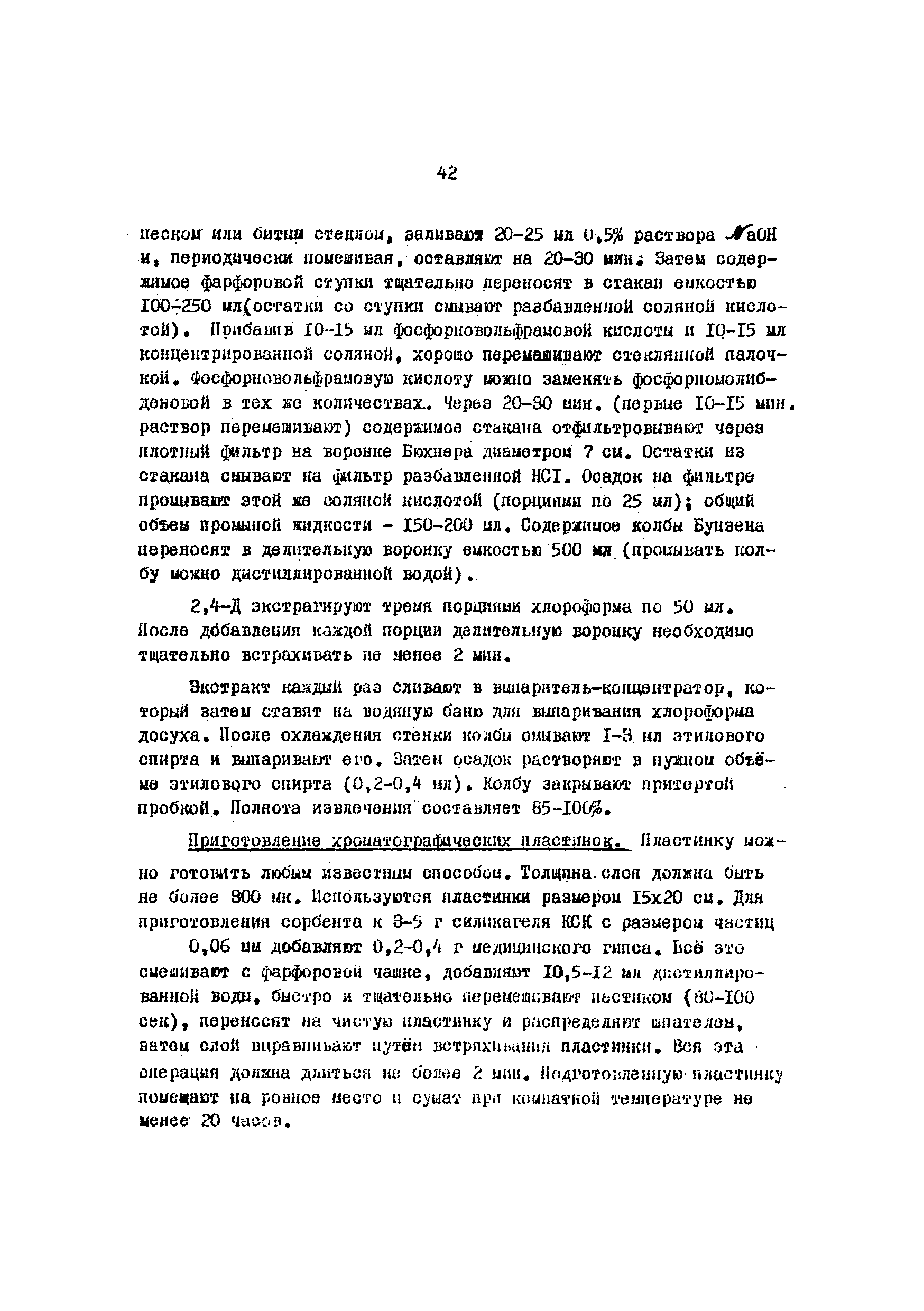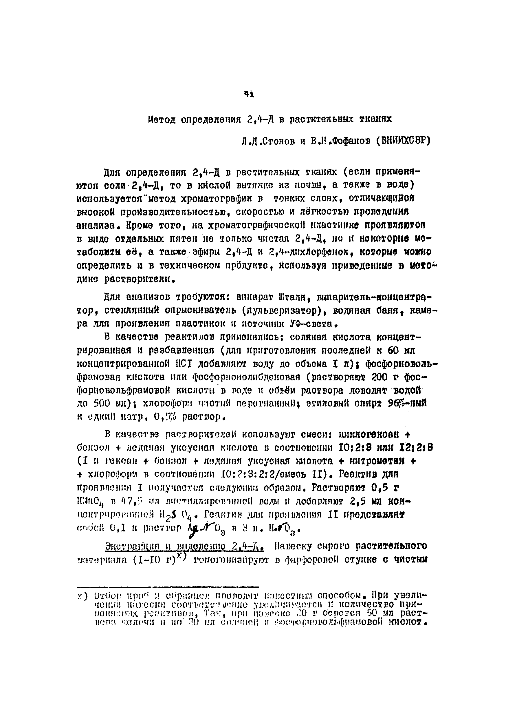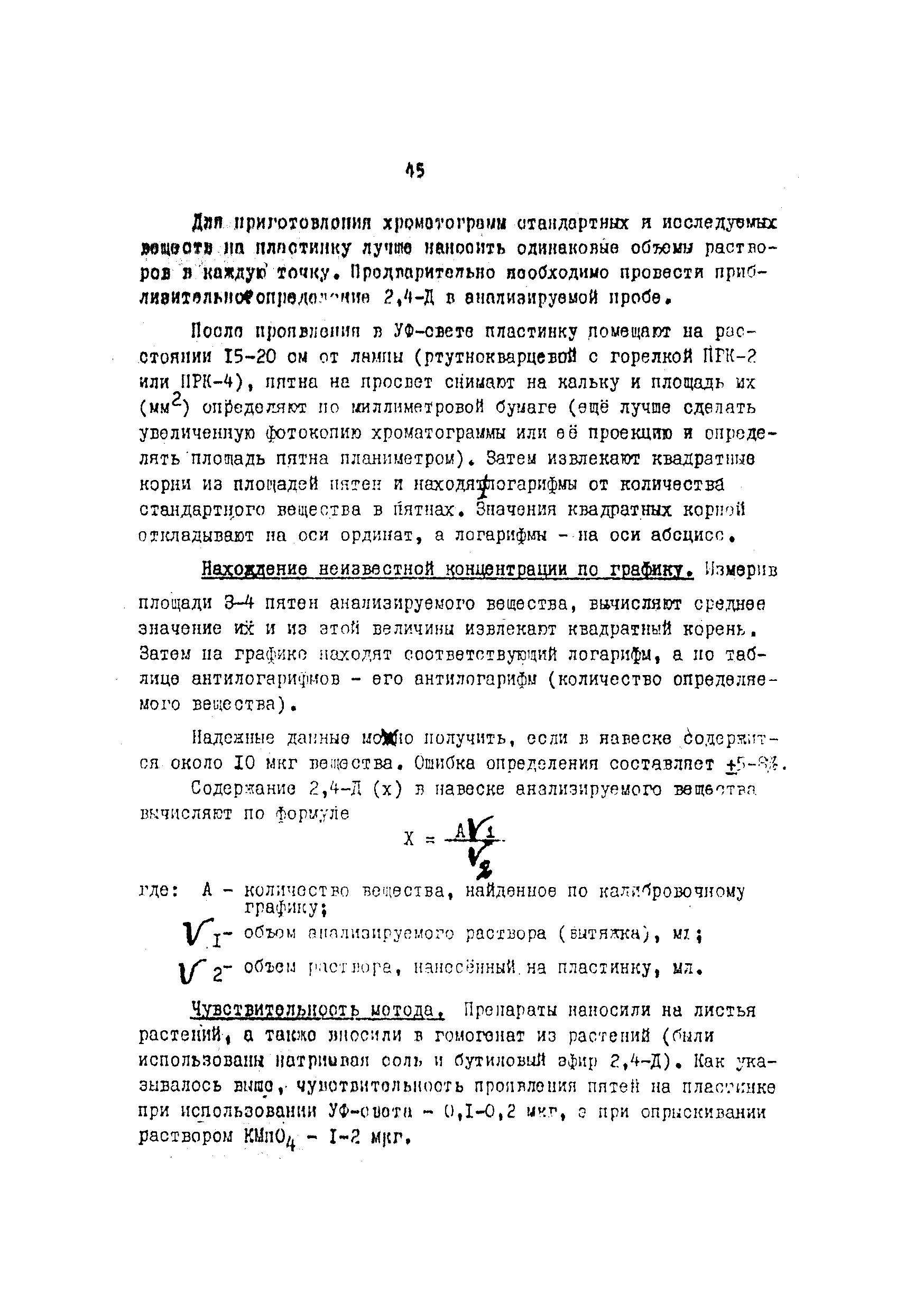 Метод определения 2,4-Д в растительных тканях| Статус: | действует | | Название рус.: | Метод определения 2,4-Д в растительных тканях | | Дата добавления в базу: | 01.02.2017 | | Дата актуализации: | 01.01.2021 | | Область применения: | Для определения 2,4-Д в растительных тканях (если применяются соли 2,4-Д, то в кислой вытяжке из почвы, а также в воде) используется метод хроматографии в тонких слоях, отличающийся высокой производительностью, скоростью и легкостью проведения анализа | | Оглавление: | Экстракция и выделение 2,4-Д Приготовление хроматографических пластинок Ход анализа Количественная оценка хроматограмм в тонких слоях Калибровочный график Нахождение неизвестной концентрации по графику Чувствительность метода | | Разработан: | ВНИИХСЗР