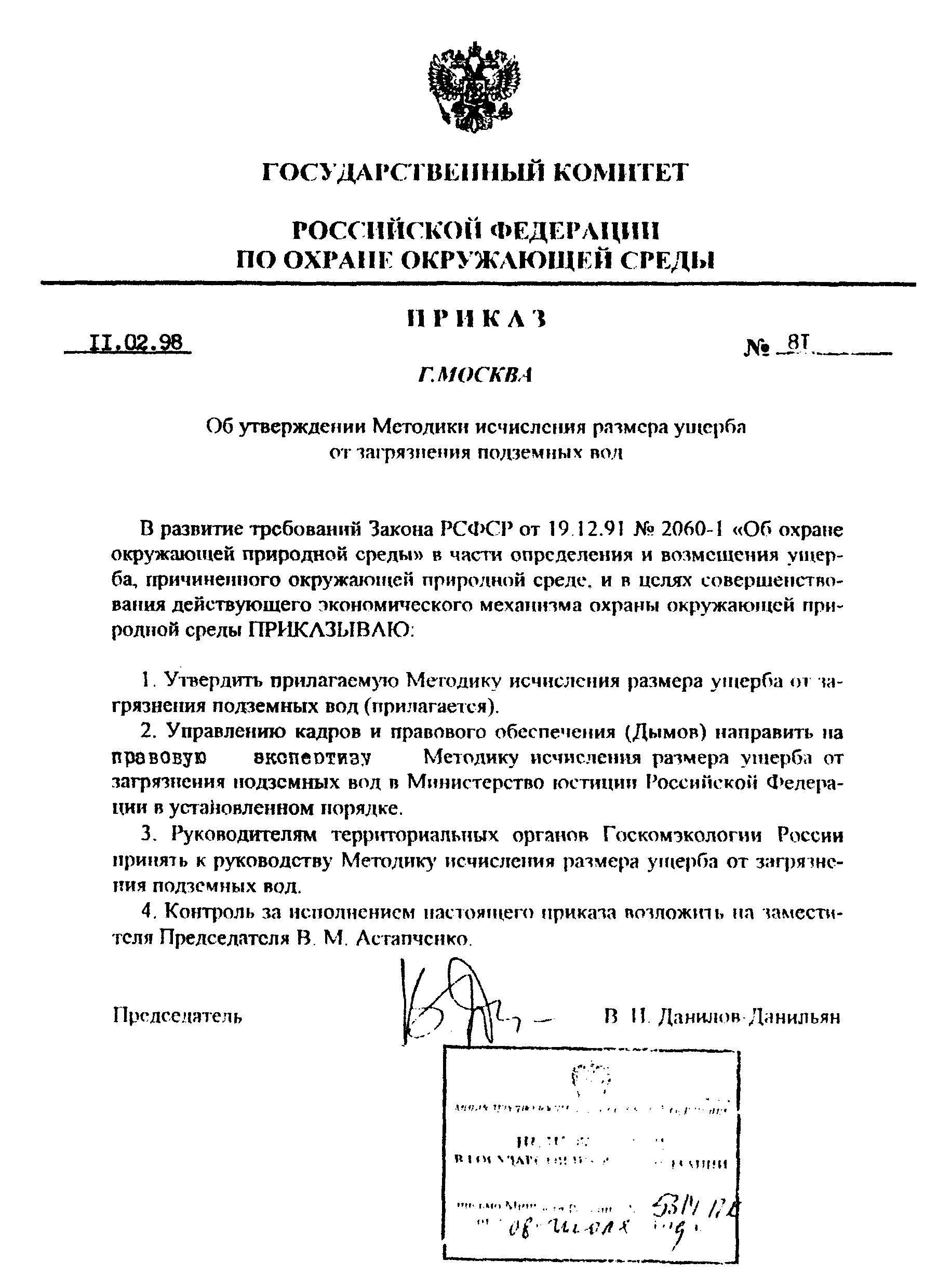 | Утверждён: | 11.02.1998 Госкомэкология РФ (Russian Federation Goskomekologiya 81) |