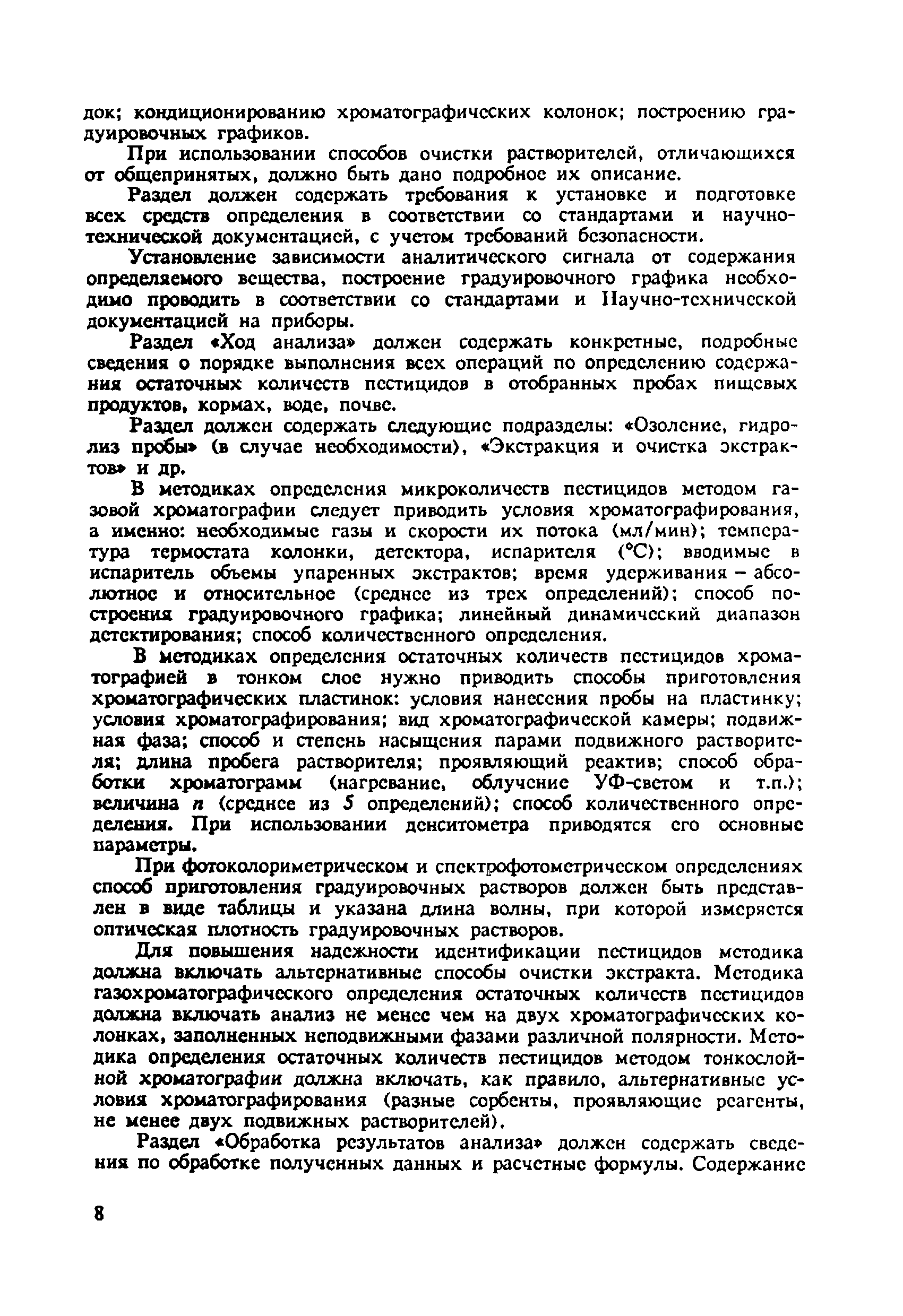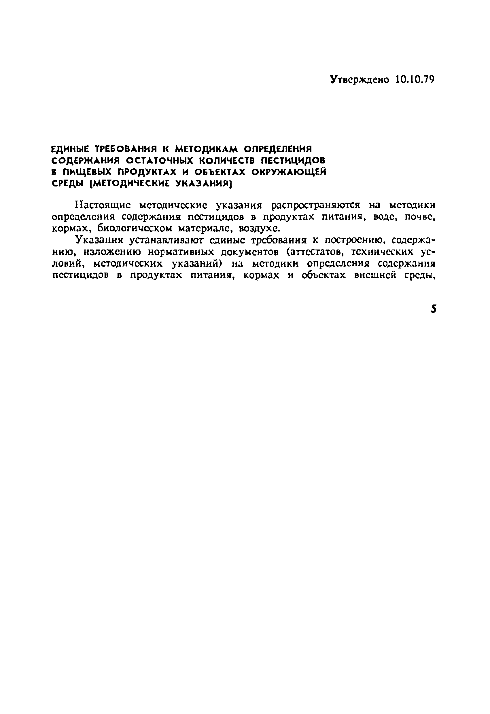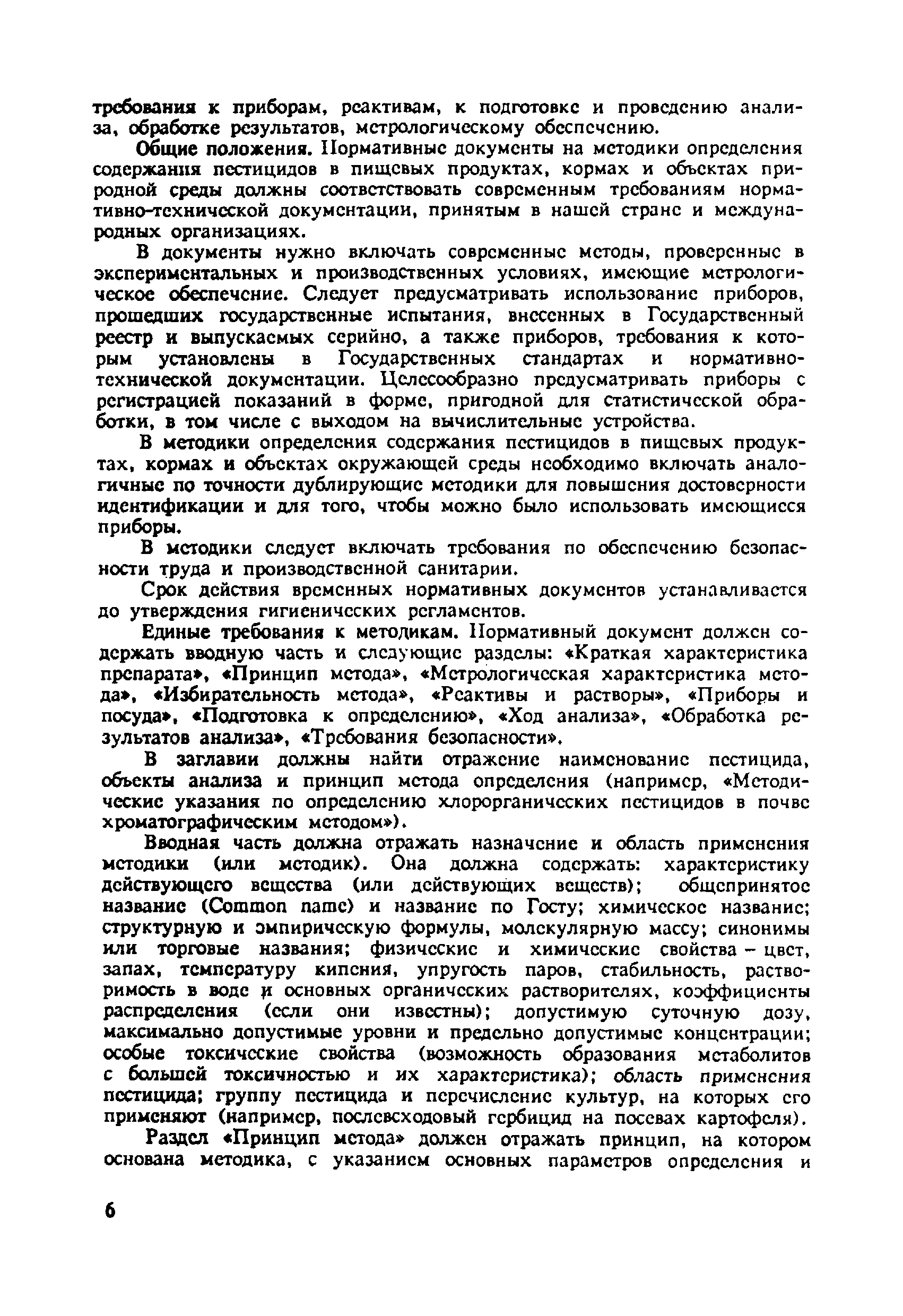 Указания устанавливают единые требования к построению, содержанию, изложению нормативных документов (аттестатов, технических условий, методических указаний) на методики определения содержания пестицидов в продуктах питания, кормах и объектах внешней среды, требования к приборам, реактивам, к подготовке и проведению анализа, обработке результатов, метрологическому обеспечению. | | Оглавление: | Общие положения Единые требования к методикам | | Утверждён: | 10.10.1979 Минздрав СССР (USSR Minzdrav )