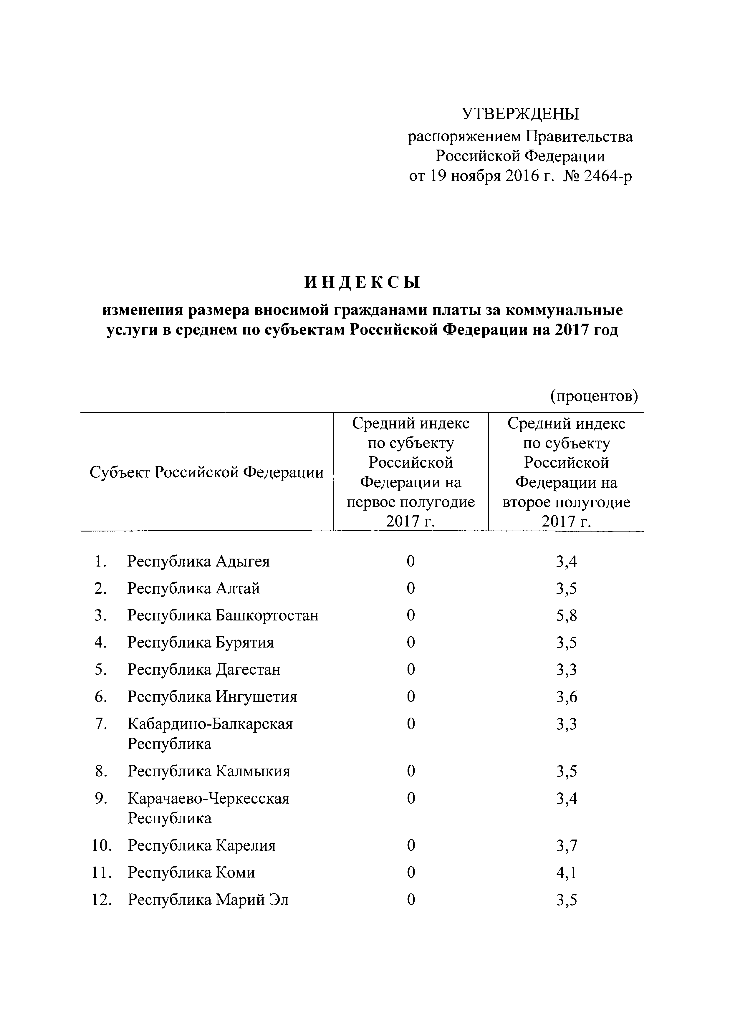 Индексы изменения размера вносимой гражданами платы за коммунальные услуги в среднем по субъектам Российской Федерации на 2017 год| Статус: | действует | | Название рус.: | Индексы изменения размера вносимой гражданами платы за коммунальные услуги в среднем по субъектам Российской Федерации на 2017 год | | Дата добавления в базу: | 01.02.2017 | | Дата актуализации: | 01.01.2021 | | Дата введения: | 19.11.2016 | | Утверждён: | 19.11.2016 Правительство Российской Федерации (2464-р)