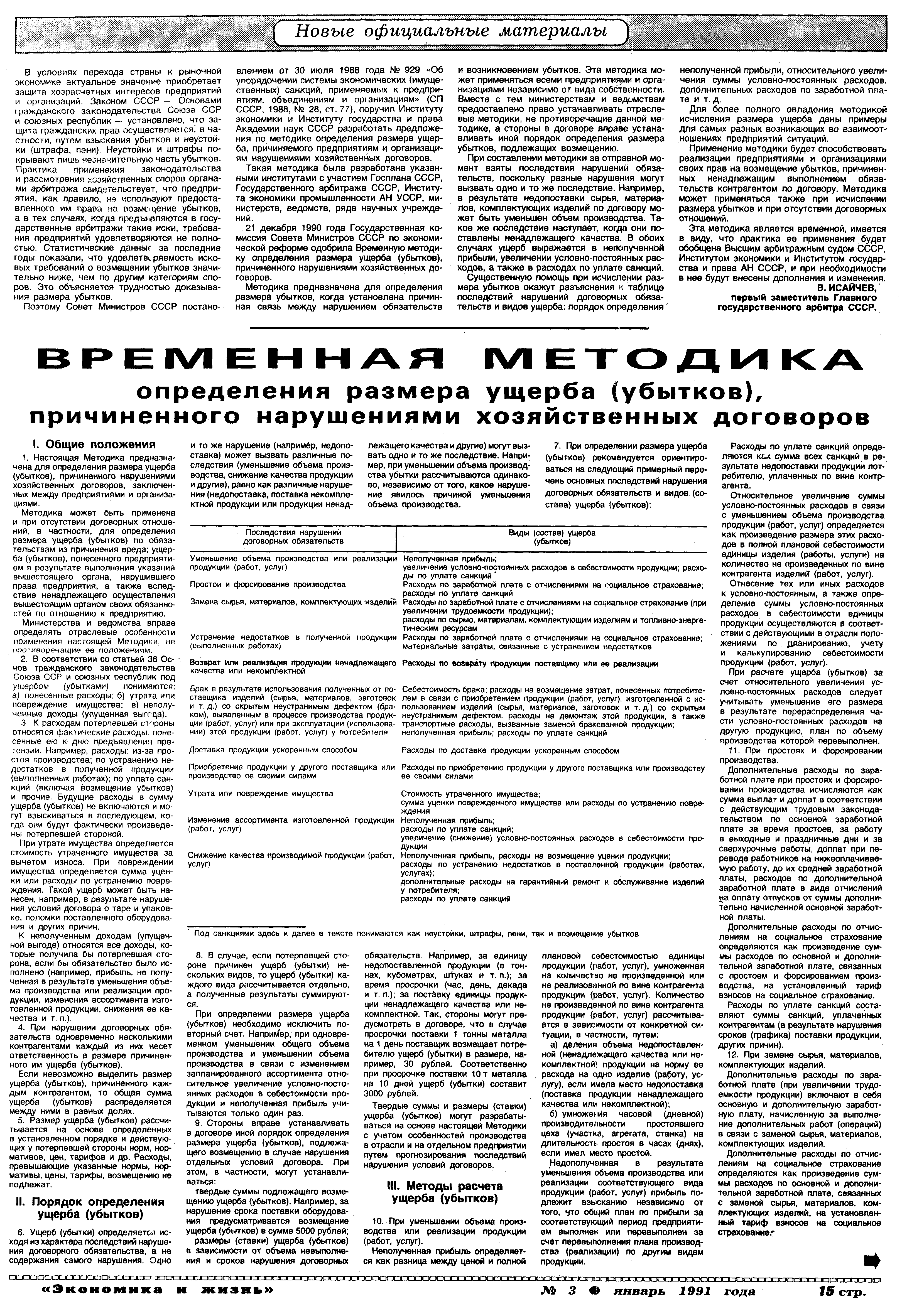 Временная методика определения размера ущерба (убытков), причиненного нарушениями хозяйственных договоров| Статус: | действует | | Название рус.: | Временная методика определения размера ущерба (убытков), причиненного нарушениями хозяйственных договоров | | Дата добавления в базу: | 01.02.2017 | | Дата актуализации: | 01.01.2021 | | Область применения: | Методика предназначена для определения размера ущерба (убытков), причиненного нарушениями хозяйственных договоров, заключенных между предприятиями и организациями. | | Оглавление: | I. Общие положения II. Порядок определения ущерба (убытков) III. Методы расчета ущебра (убытков) IV. Примеры расчета ущерба (убытков) | | Утверждён: | 28.12.1990 Госарбитраж СССР (С-12/НА-225)