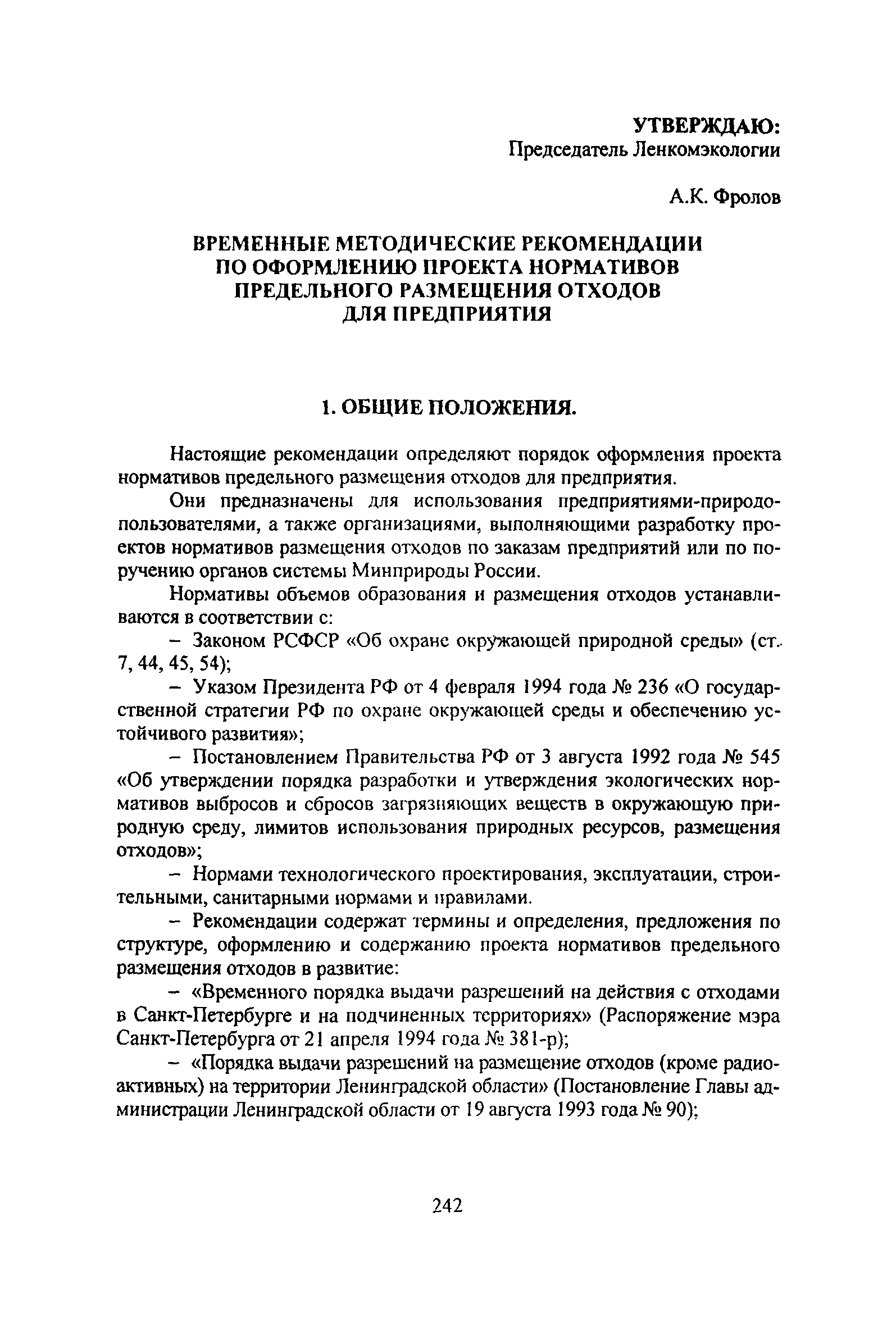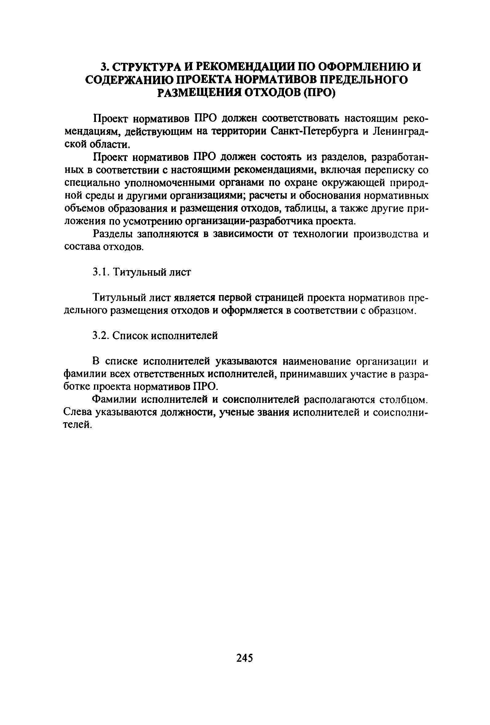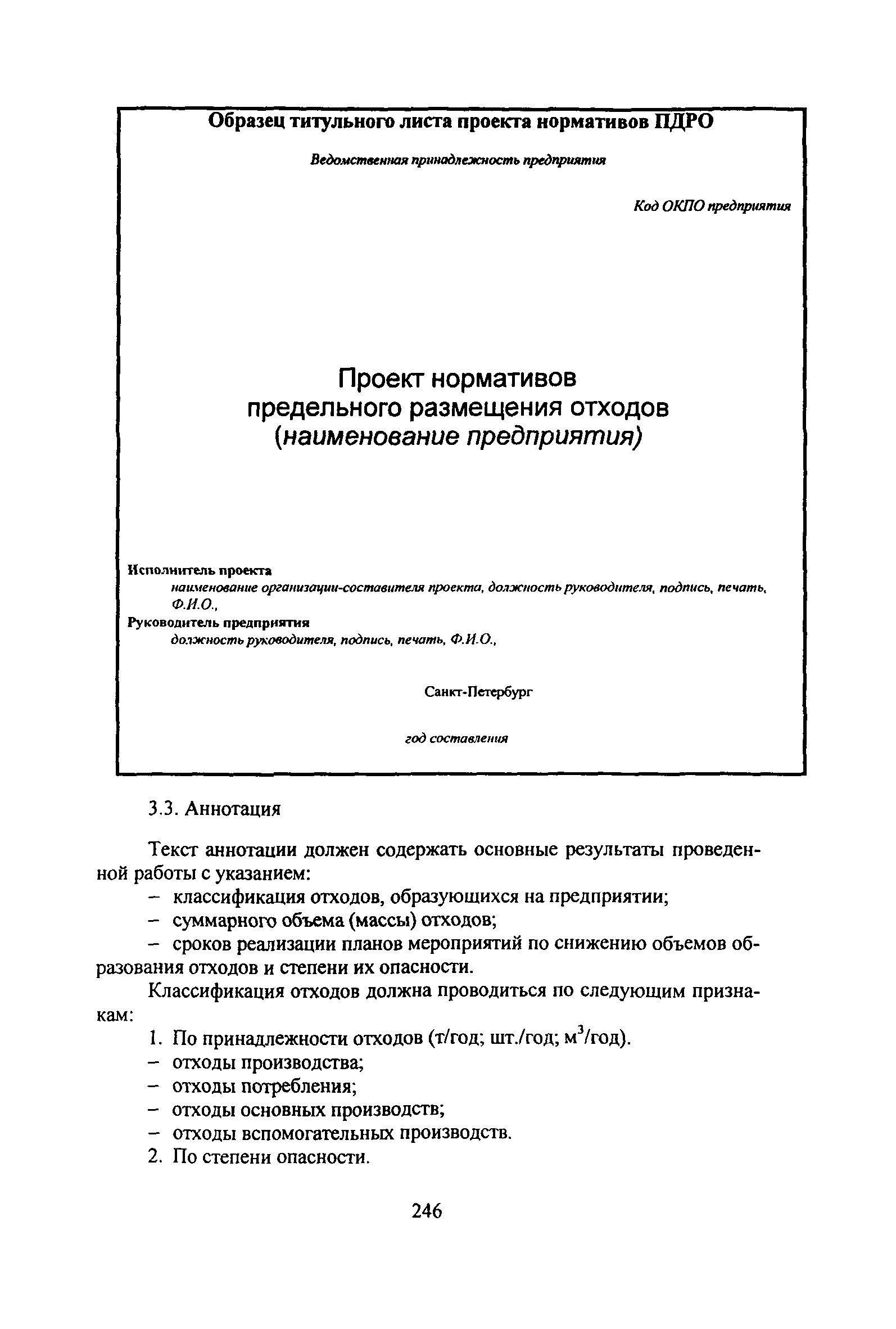 | Оглавление: | 1. Общие положения 2. Термины и определения 3. Структура и рекомендации по оформлению и содержанию проекта нормативов предельного размещения отходов (ПРО) Приложение 1. Перечень, характеристика и масса отходов производства и потребления подлежащих размещению Приложение 2. Временных региональных кодификатор отходов |
