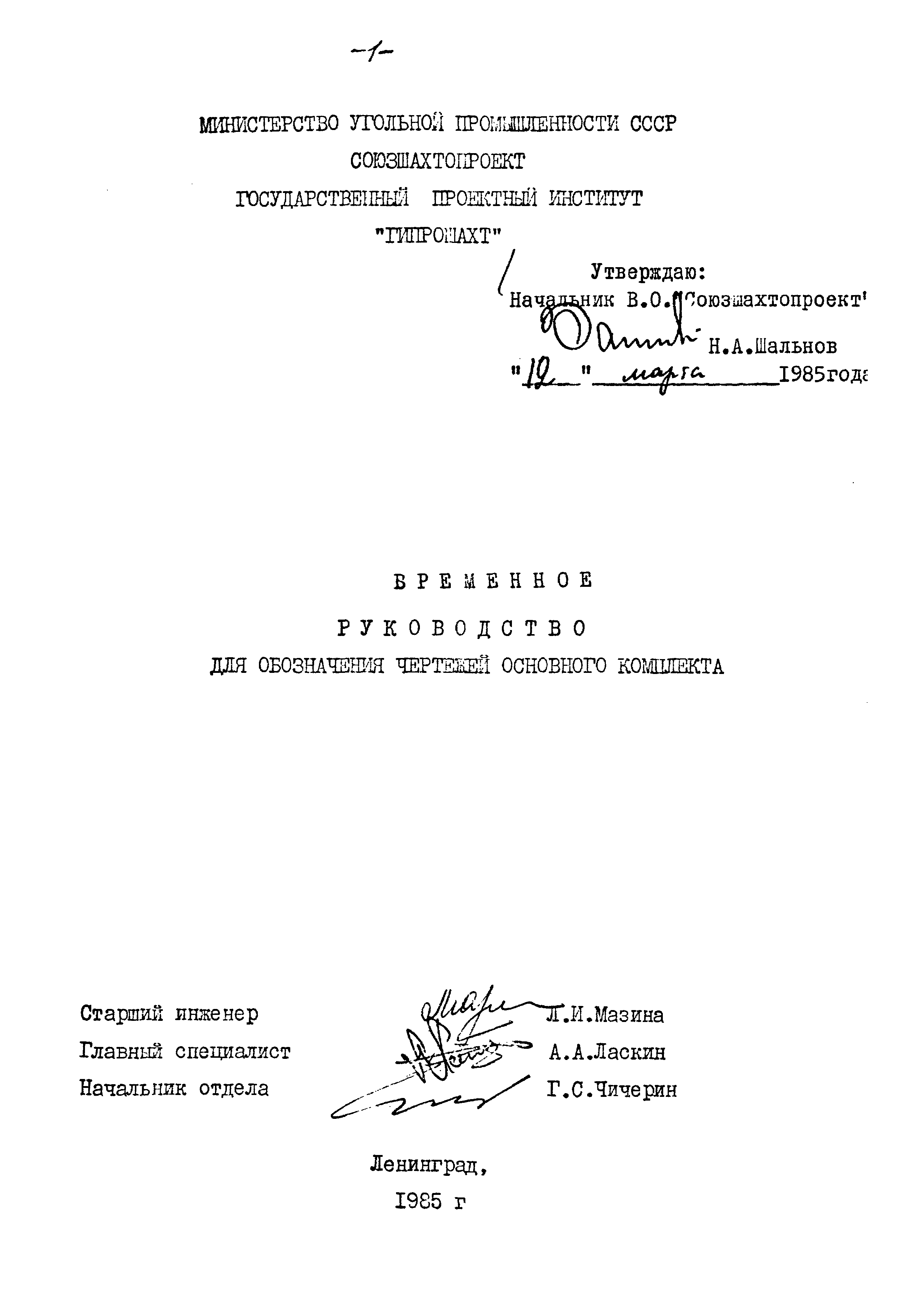 | Утверждён: | 12.03.1985 В.О. Союзшахтопроект
