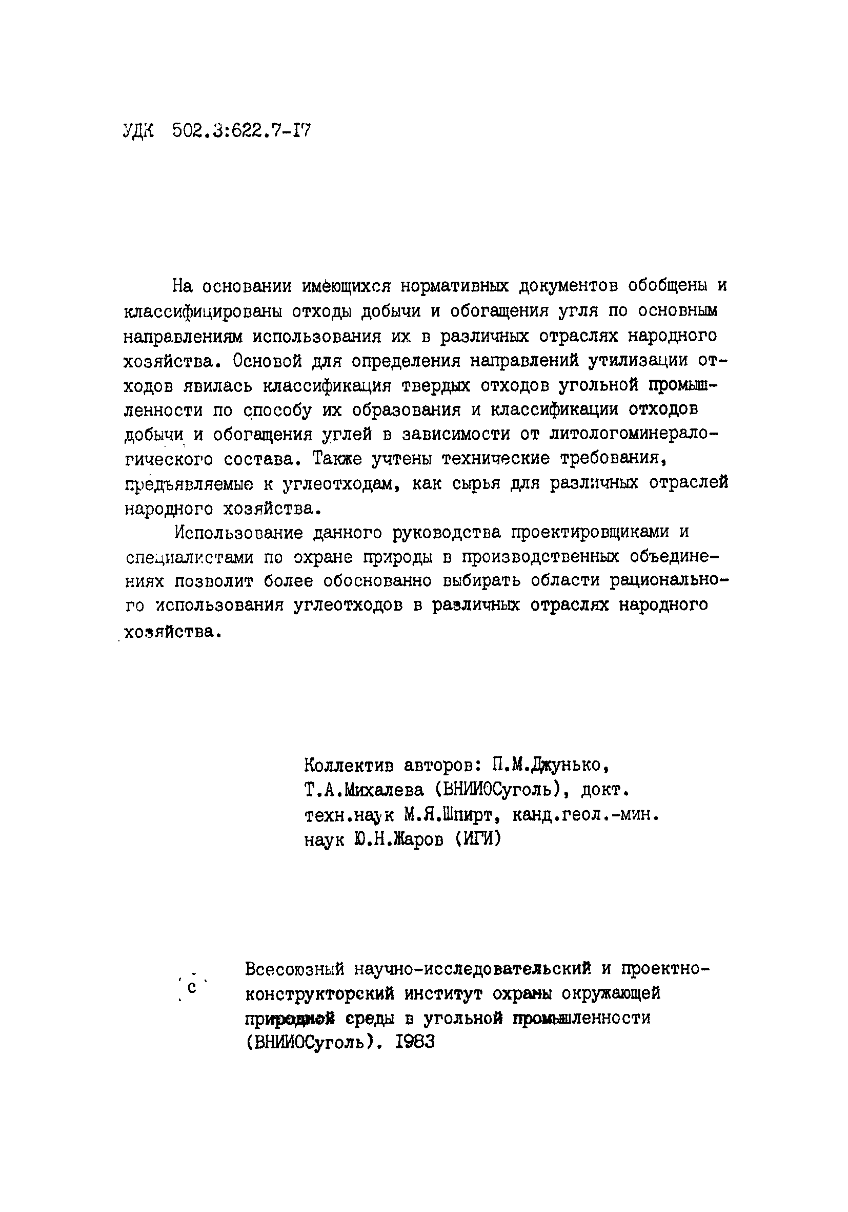 | Область применения: | Использование руководства проектировщиками и специалистами по охране природы в производственных объединениях позволит более основательно выбирать области рационального использования углеотходов в различных отраслях народного хозяйства. |