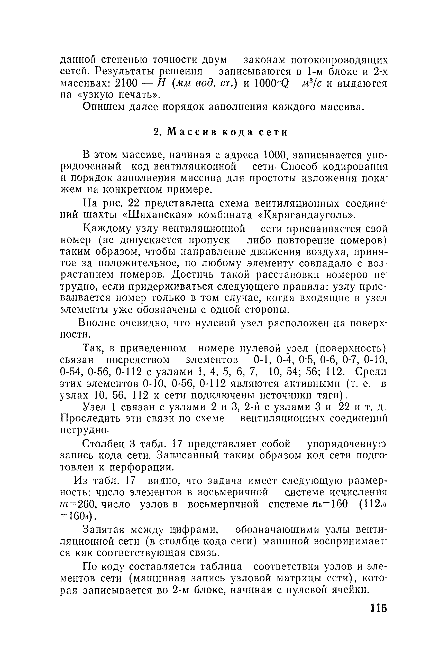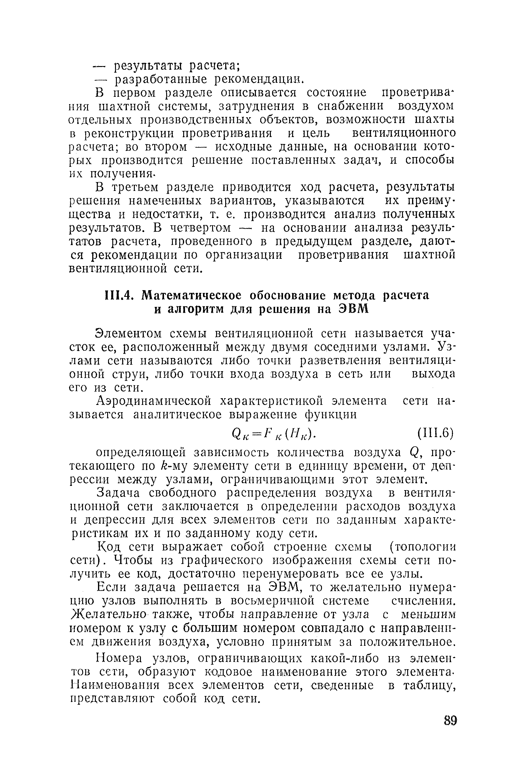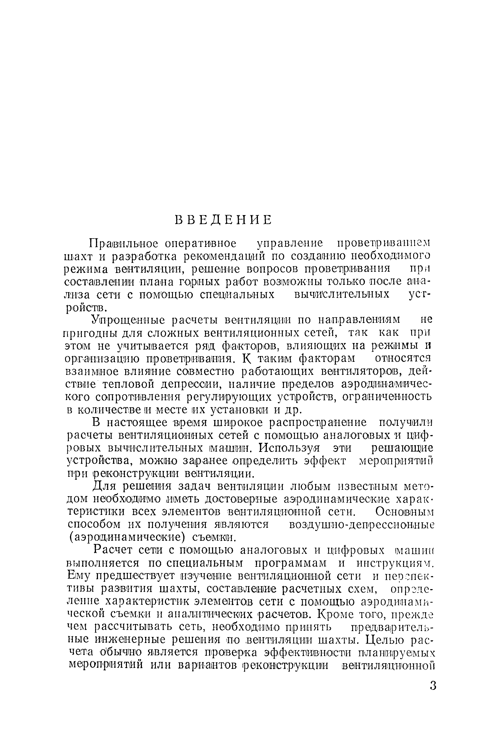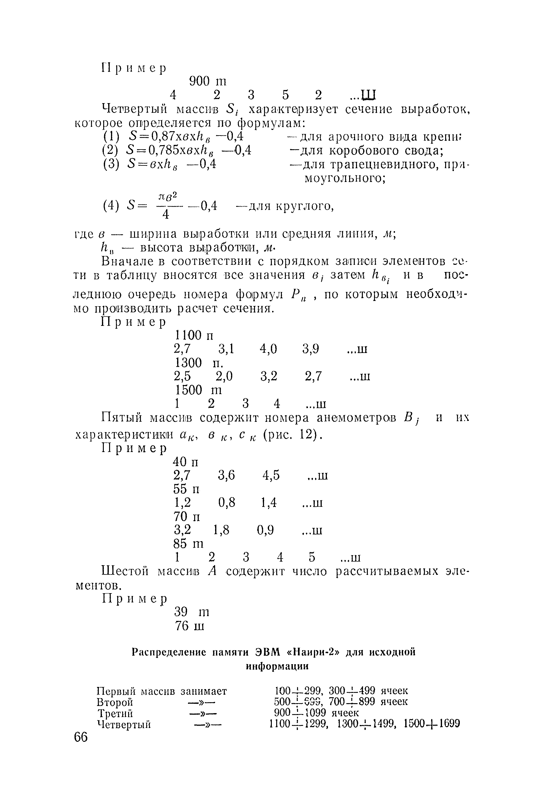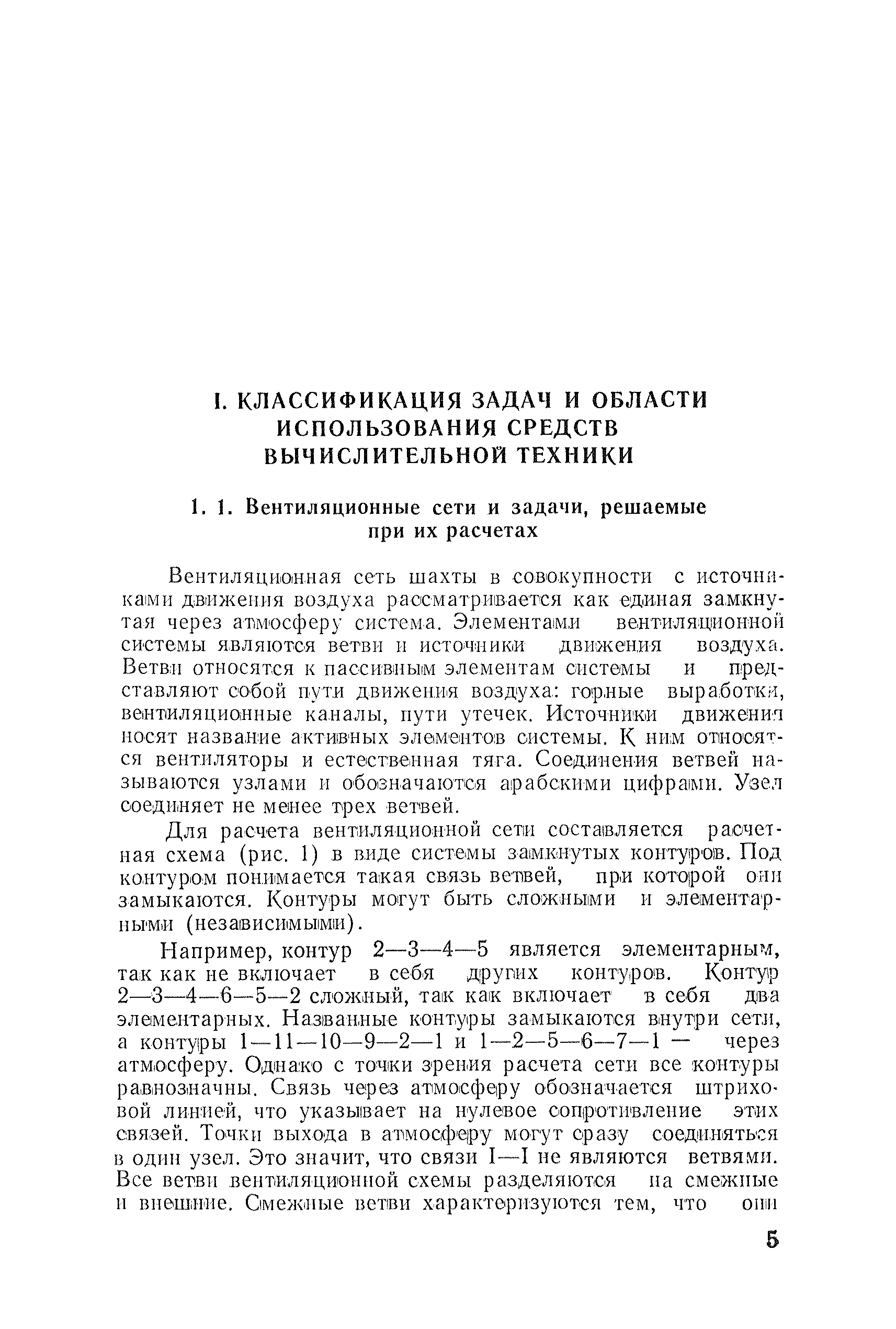 | Оглавление: | Введение I. Классификация задач и области использования средств вычислительной техники I.1. Вентиляционные сети и задачи, решаемые при их расчете I.2. Этапы расчета вентиляционной сети I.3. Методы и средства расчета вентиляционных сетей I.4. Критерии оценки рациональных областей применения средств вычислительной техники I.5. Области применения средств вычислительной техники II. Методы получения и подготовки исходных данных для расчета вентиляционных сетей II.1. Составление расчетных схем аэродинамических съемок II.2. Приборы для депрессионных съемок II.3. Методы и способы проведения депрессионных съемок II.4. Обследование вентиляторных установок II.5. Оформление результатов воздушно-депрессионной съемки II.6. Составление расчетных схем, анализируемых вариантов проветривания II.7. Обработка и накопление информации для расчета вентиляционных сетей на ЭВМ II.8. Внесение естественной тяги в расчетные схемы комбинациями условных вентиляторов II.9. Задачи, при решении которых необходимо учитывать естественные депрессии II.10. Методы учета естественных депрессий при выборе вентиляторов III. Методика решения вентиляторных задач с помощью ЭВМ и аналоговых устройств III.1. Принцип электрического моделирования вентиляторных сетей III.2. Основные требования к приборам электрической аналогии для расчета шахтных вентиляторных сетей. Краткая техническая характеристика электромодели ЭВМС-6 III.3. Методика решения вентиляторных задач с использованием электроаналоговых установок III.4. Математическое обоснование метода расчета и алгоритм для решения ЭВМ III.5. Применение метода узловых матриц при нагнетательном способе проветривания III.6. Применение метода узловых матриц при учете естественных депрессий III.7. Распределение оперативной памяти под промежуточные данные III.8. Анализ совместной работы вентиляторов главного проветривания III.9. Пример решения задачи свободного распределения воздуха III.10. Программа переработки программ из режима машины "Минск-22" в режим "Т" (ППРТ) III.11. Описание программы расчета шахтных вентиляционных сетей ЭВМ "Минск-32" III.12. Методика проверки устойчивости режимов работы вентиляторов III.13. Расчет равномерно распределенных утечек через зону обрушения Приложение 1. Обработка результатов воздушно-депрессионной съемки на ЭВМ Минск-22 Приложение 2. Обработка результатов воздушно-депрессионной съемки на ЭВМ НАИРИ-2 (I часть) Приложение 3. Ввод информации Приложение 4. Переработка программ в режим Т |