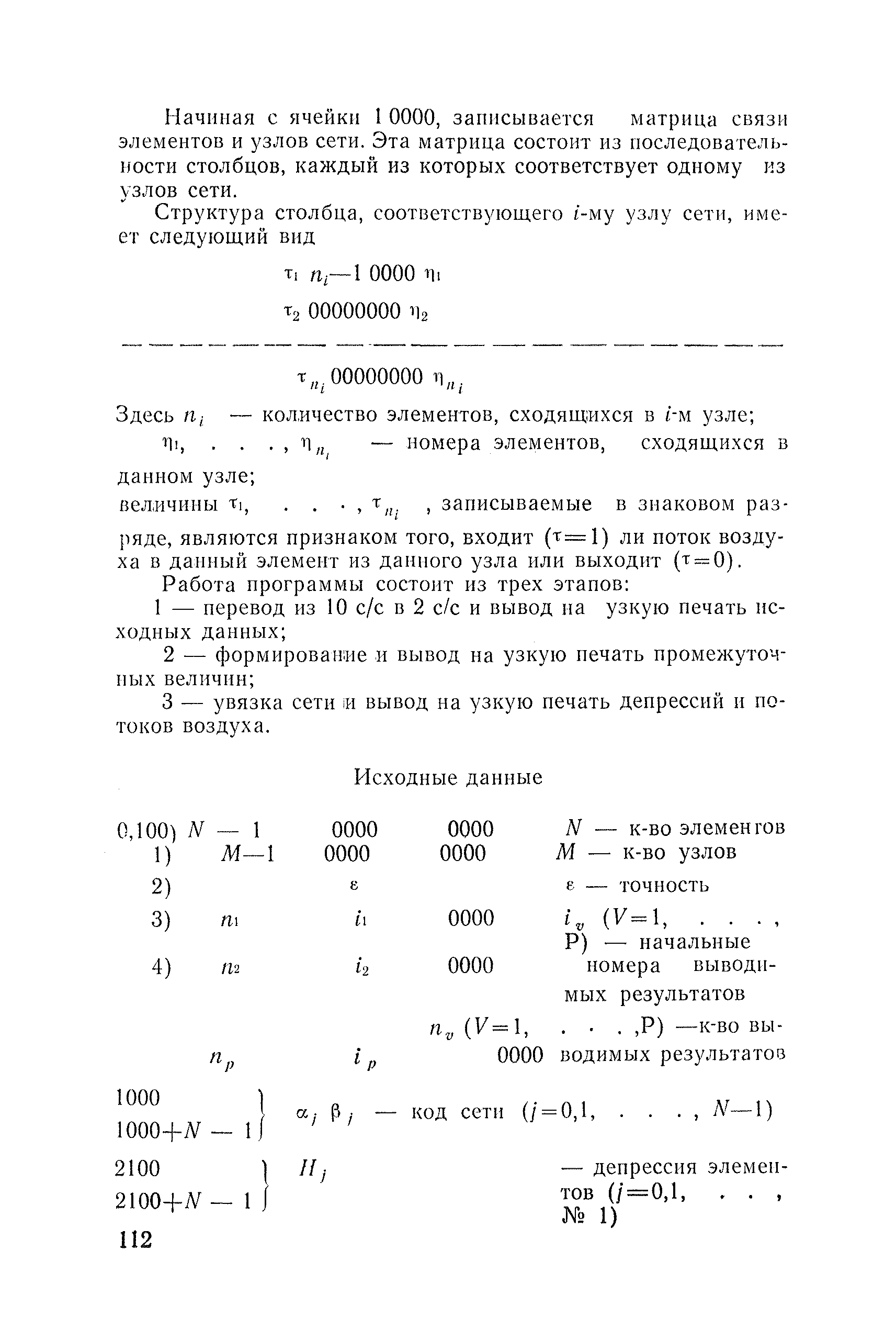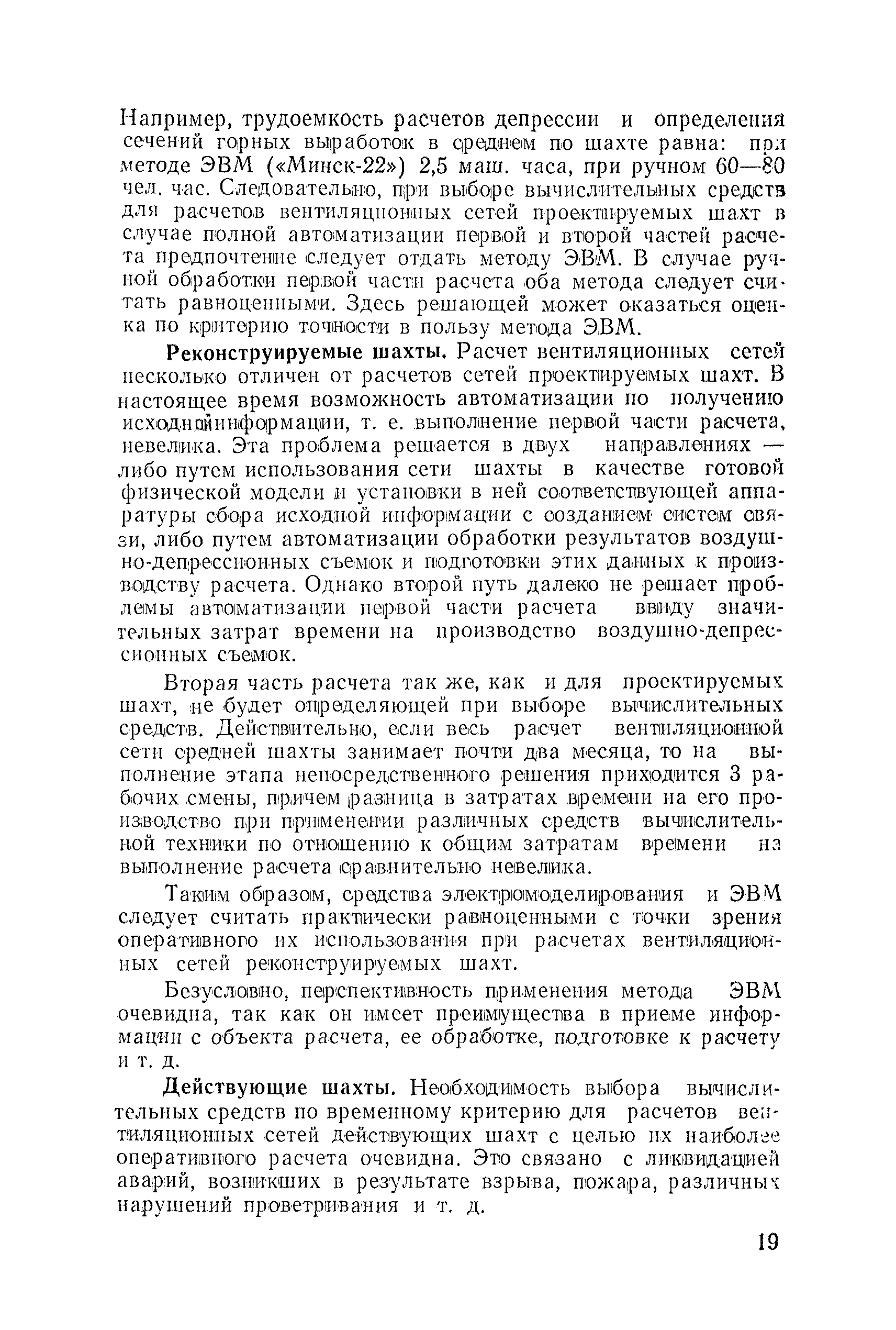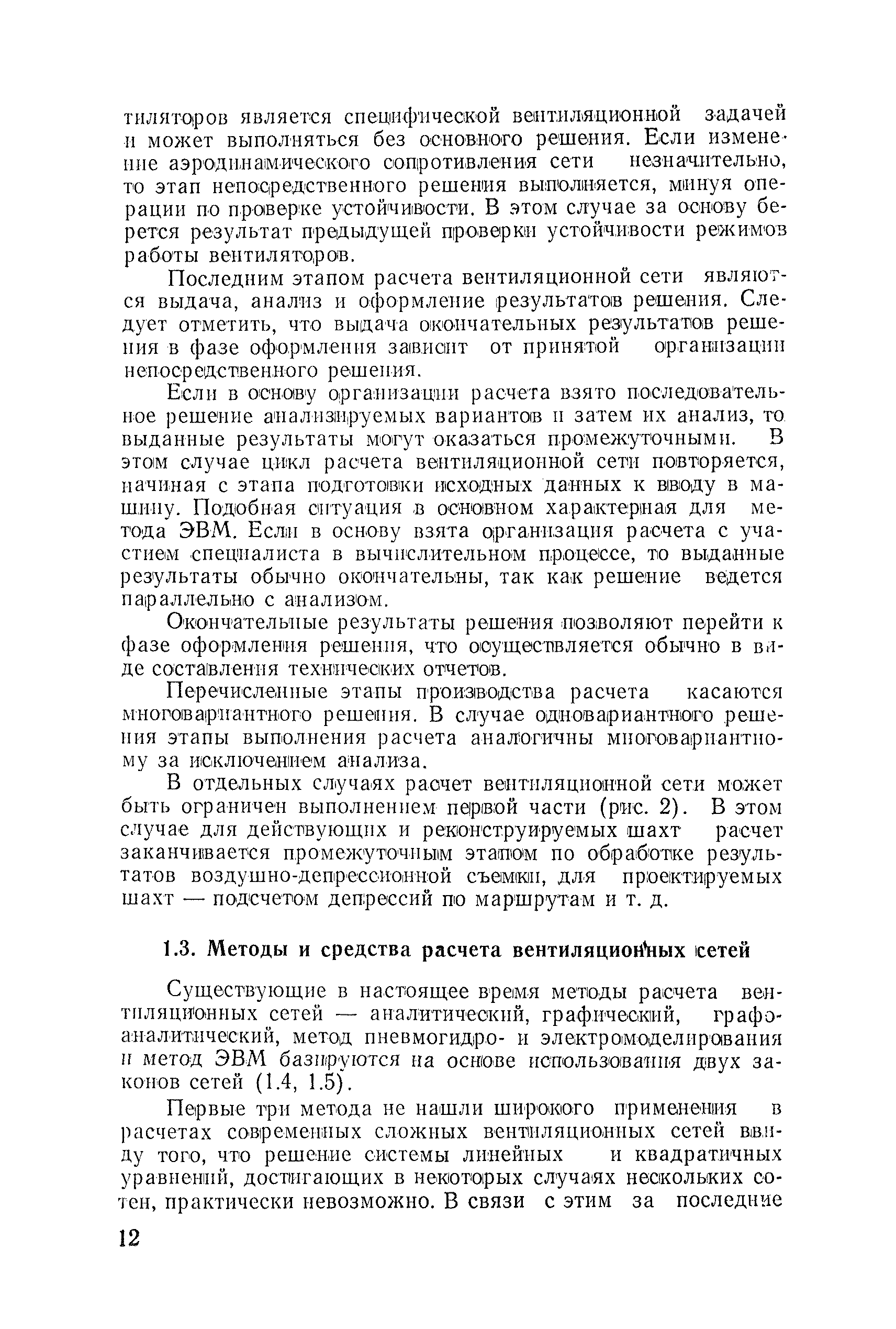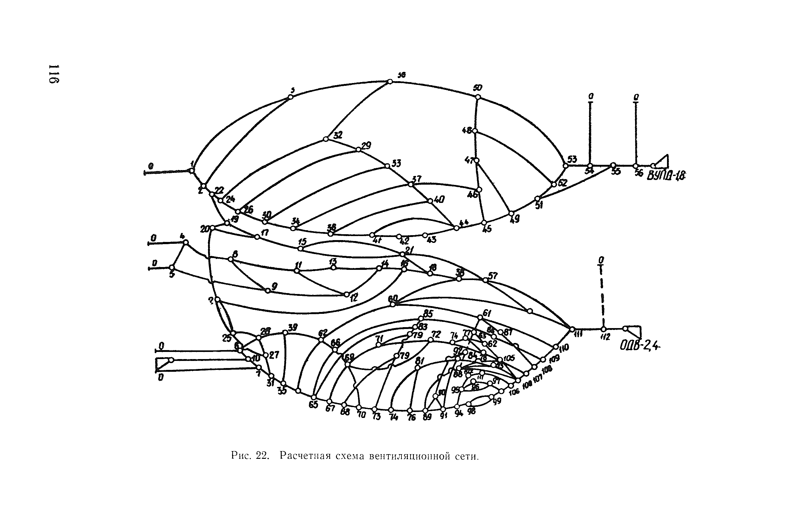 | Оглавление: | Введение I. Классификация задач и области использования средств вычислительной техники I.1. Вентиляционные сети и задачи, решаемые при их расчете I.2. Этапы расчета вентиляционной сети I.3. Методы и средства расчета вентиляционных сетей I.4. Критерии оценки рациональных областей применения средств вычислительной техники I.5. Области применения средств вычислительной техники II. Методы получения и подготовки исходных данных для расчета вентиляционных сетей II.1. Составление расчетных схем аэродинамических съемок II.2. Приборы для депрессионных съемок II.3. Методы и способы проведения депрессионных съемок II.4. Обследование вентиляторных установок II.5. Оформление результатов воздушно-депрессионной съемки II.6. Составление расчетных схем, анализируемых вариантов проветривания II.7. Обработка и накопление информации для расчета вентиляционных сетей на ЭВМ II.8. Внесение естественной тяги в расчетные схемы комбинациями условных вентиляторов II.9. Задачи, при решении которых необходимо учитывать естественные депрессии II.10. Методы учета естественных депрессий при выборе вентиляторов III. Методика решения вентиляторных задач с помощью ЭВМ и аналоговых устройств III.1. Принцип электрического моделирования вентиляторных сетей III.2. Основные требования к приборам электрической аналогии для расчета шахтных вентиляторных сетей. Краткая техническая характеристика электромодели ЭВМС-6 III.3. Методика решения вентиляторных задач с использованием электроаналоговых установок III.4. Математическое обоснование метода расчета и алгоритм для решения ЭВМ III.5. Применение метода узловых матриц при нагнетательном способе проветривания III.6. Применение метода узловых матриц при учете естественных депрессий III.7. Распределение оперативной памяти под промежуточные данные III.8. Анализ совместной работы вентиляторов главного проветривания III.9. Пример решения задачи свободного распределения воздуха III.10. Программа переработки программ из режима машины "Минск-22" в режим "Т" (ППРТ) III.11. Описание программы расчета шахтных вентиляционных сетей ЭВМ "Минск-32" III.12. Методика проверки устойчивости режимов работы вентиляторов III.13. Расчет равномерно распределенных утечек через зону обрушения Приложение 1. Обработка результатов воздушно-депрессионной съемки на ЭВМ Минск-22 Приложение 2. Обработка результатов воздушно-депрессионной съемки на ЭВМ НАИРИ-2 (I часть) Приложение 3. Ввод информации Приложение 4. Переработка программ в режим Т |