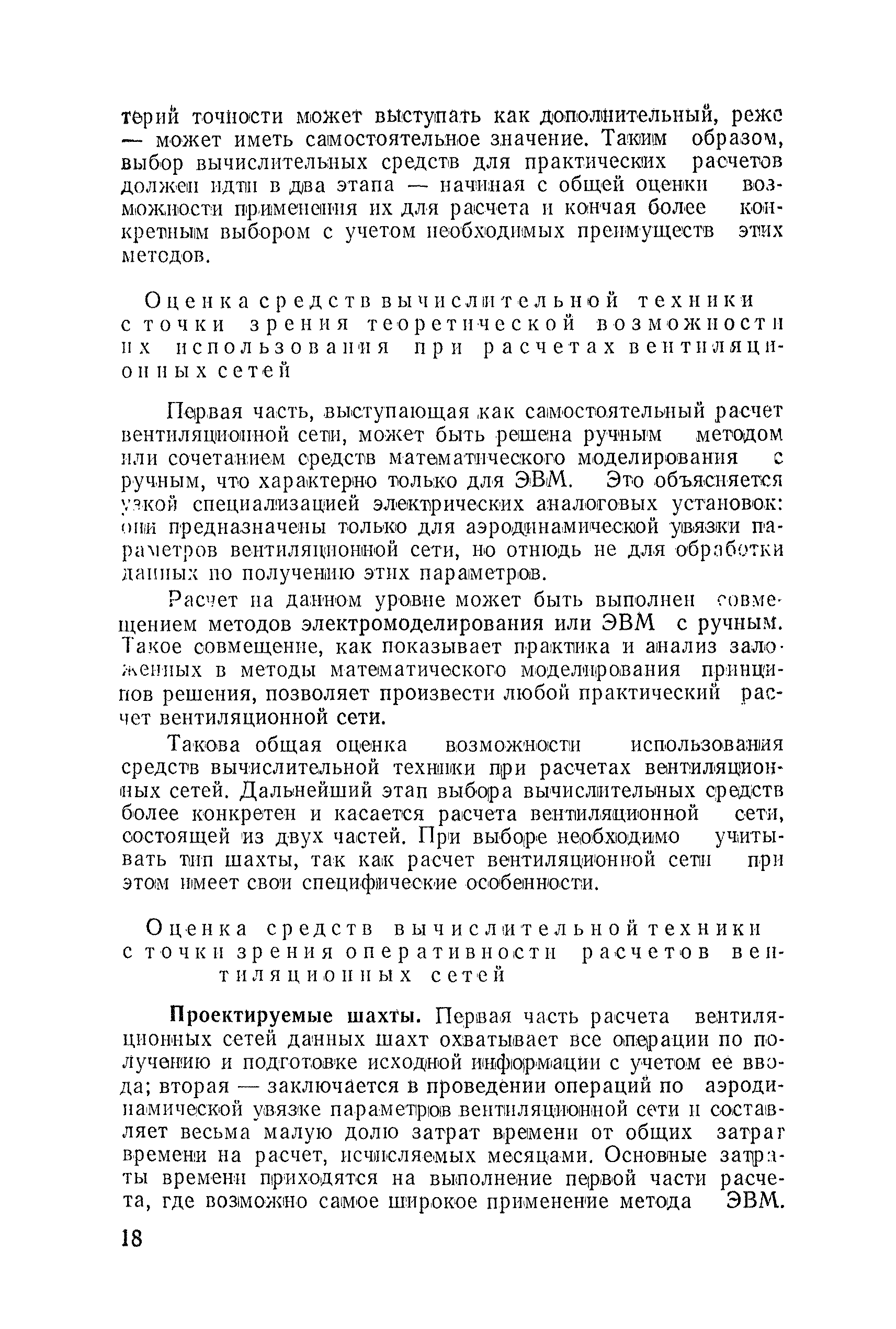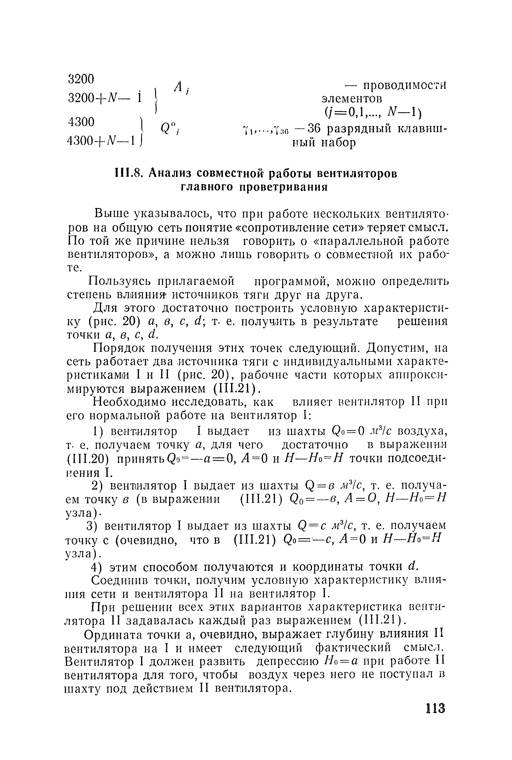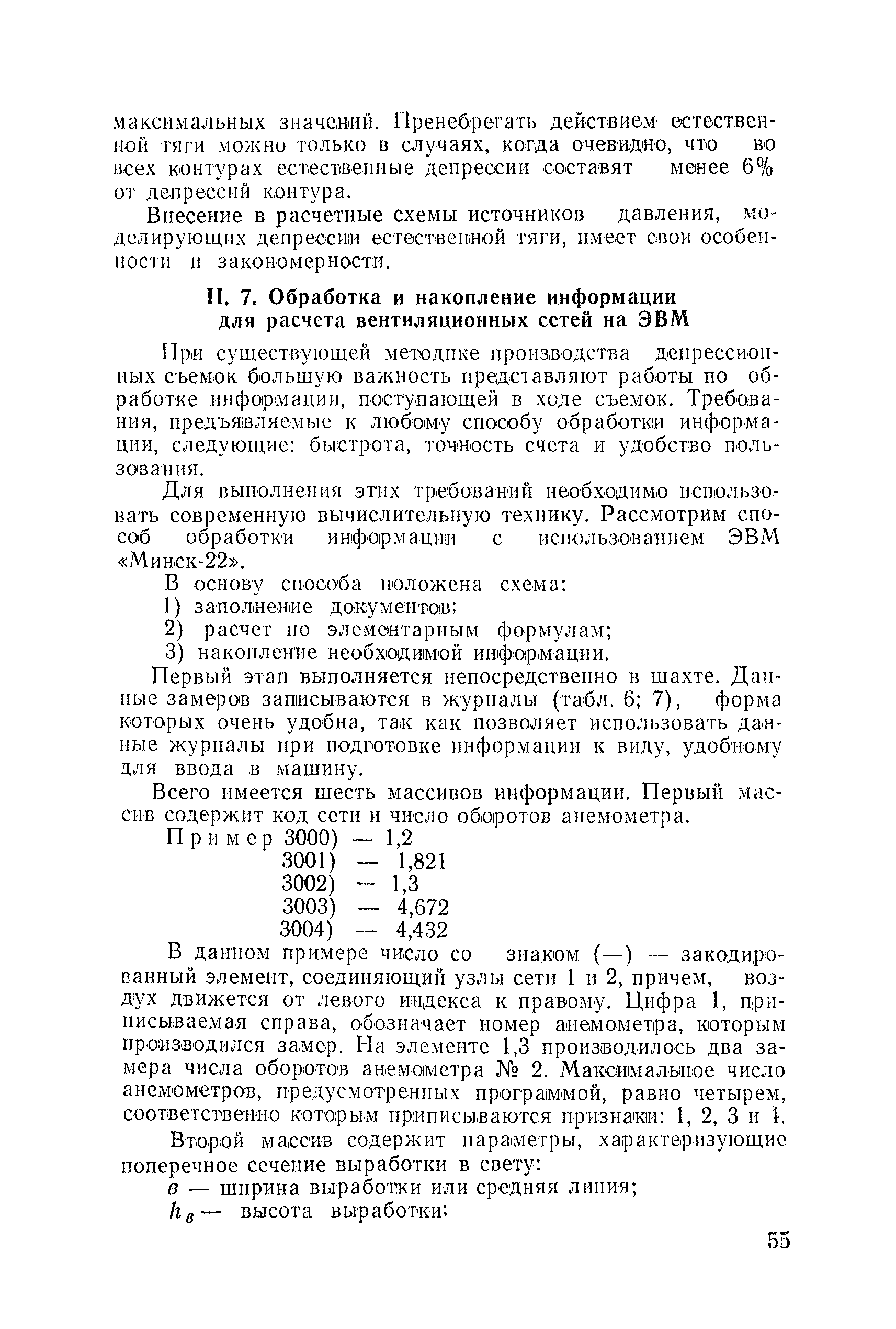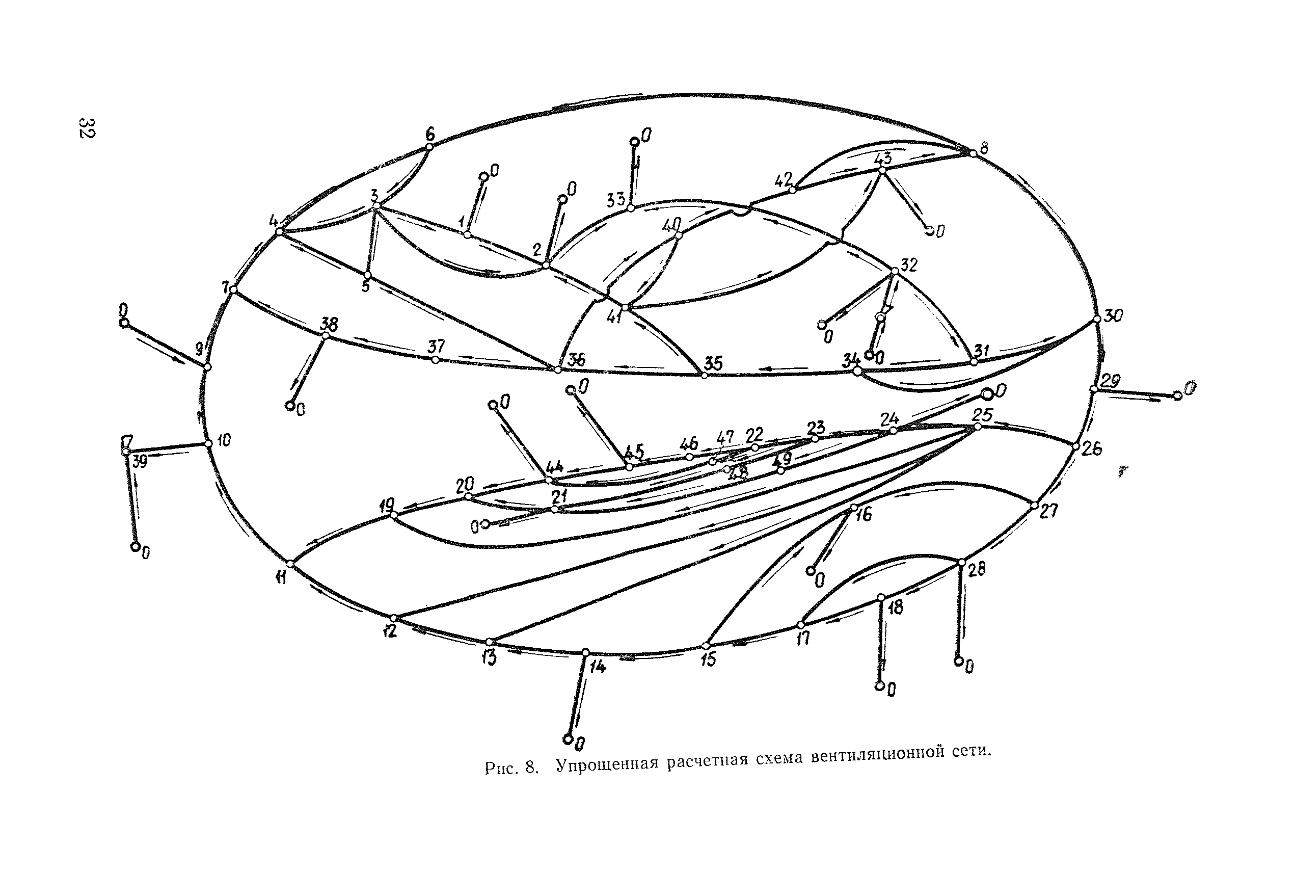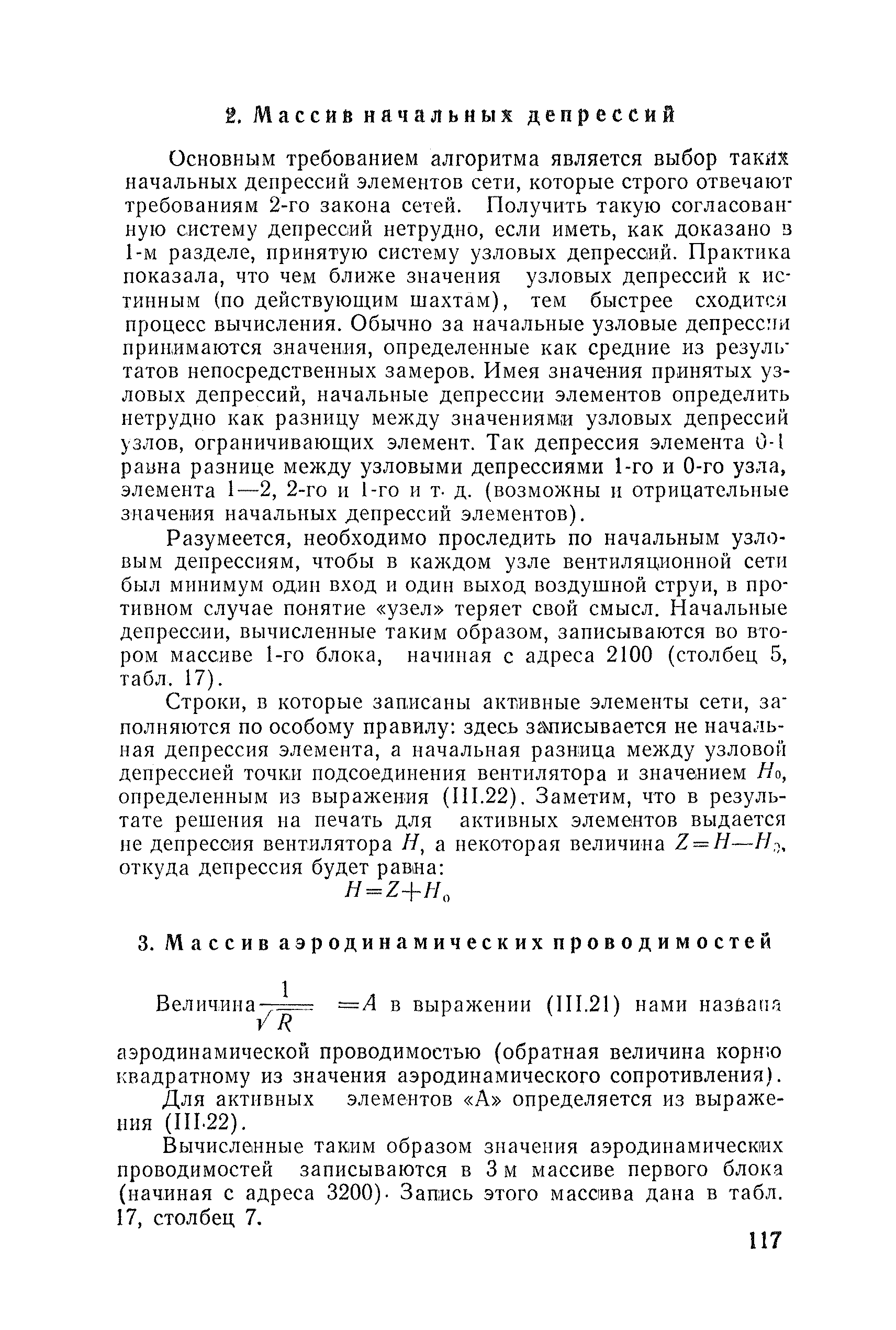 | Оглавление: | Введение I. Классификация задач и области использования средств вычислительной техники I.1. Вентиляционные сети и задачи, решаемые при их расчете I.2. Этапы расчета вентиляционной сети I.3. Методы и средства расчета вентиляционных сетей I.4. Критерии оценки рациональных областей применения средств вычислительной техники I.5. Области применения средств вычислительной техники II. Методы получения и подготовки исходных данных для расчета вентиляционных сетей II.1. Составление расчетных схем аэродинамических съемок II.2. Приборы для депрессионных съемок II.3. Методы и способы проведения депрессионных съемок II.4. Обследование вентиляторных установок II.5. Оформление результатов воздушно-депрессионной съемки II.6. Составление расчетных схем, анализируемых вариантов проветривания II.7. Обработка и накопление информации для расчета вентиляционных сетей на ЭВМ II.8. Внесение естественной тяги в расчетные схемы комбинациями условных вентиляторов II.9. Задачи, при решении которых необходимо учитывать естественные депрессии II.10. Методы учета естественных депрессий при выборе вентиляторов III. Методика решения вентиляторных задач с помощью ЭВМ и аналоговых устройств III.1. Принцип электрического моделирования вентиляторных сетей III.2. Основные требования к приборам электрической аналогии для расчета шахтных вентиляторных сетей. Краткая техническая характеристика электромодели ЭВМС-6 III.3. Методика решения вентиляторных задач с использованием электроаналоговых установок III.4. Математическое обоснование метода расчета и алгоритм для решения ЭВМ III.5. Применение метода узловых матриц при нагнетательном способе проветривания III.6. Применение метода узловых матриц при учете естественных депрессий III.7. Распределение оперативной памяти под промежуточные данные III.8. Анализ совместной работы вентиляторов главного проветривания III.9. Пример решения задачи свободного распределения воздуха III.10. Программа переработки программ из режима машины "Минск-22" в режим "Т" (ППРТ) III.11. Описание программы расчета шахтных вентиляционных сетей ЭВМ "Минск-32" III.12. Методика проверки устойчивости режимов работы вентиляторов III.13. Расчет равномерно распределенных утечек через зону обрушения Приложение 1. Обработка результатов воздушно-депрессионной съемки на ЭВМ Минск-22 Приложение 2. Обработка результатов воздушно-депрессионной съемки на ЭВМ НАИРИ-2 (I часть) Приложение 3. Ввод информации Приложение 4. Переработка программ в режим Т |