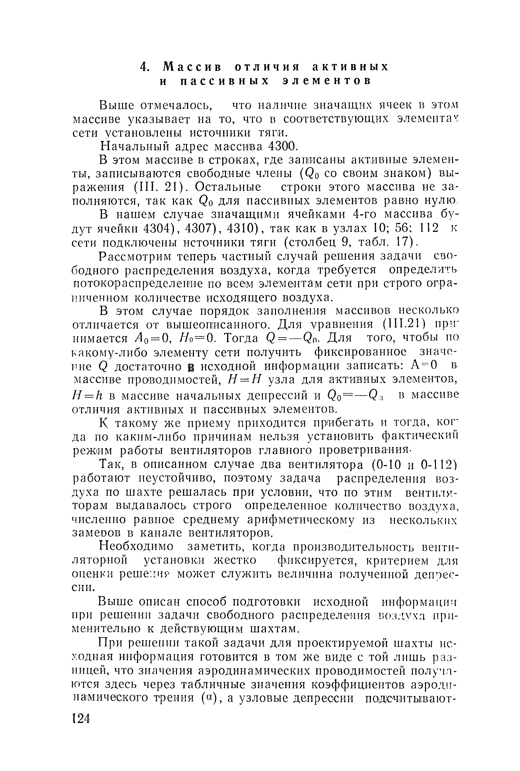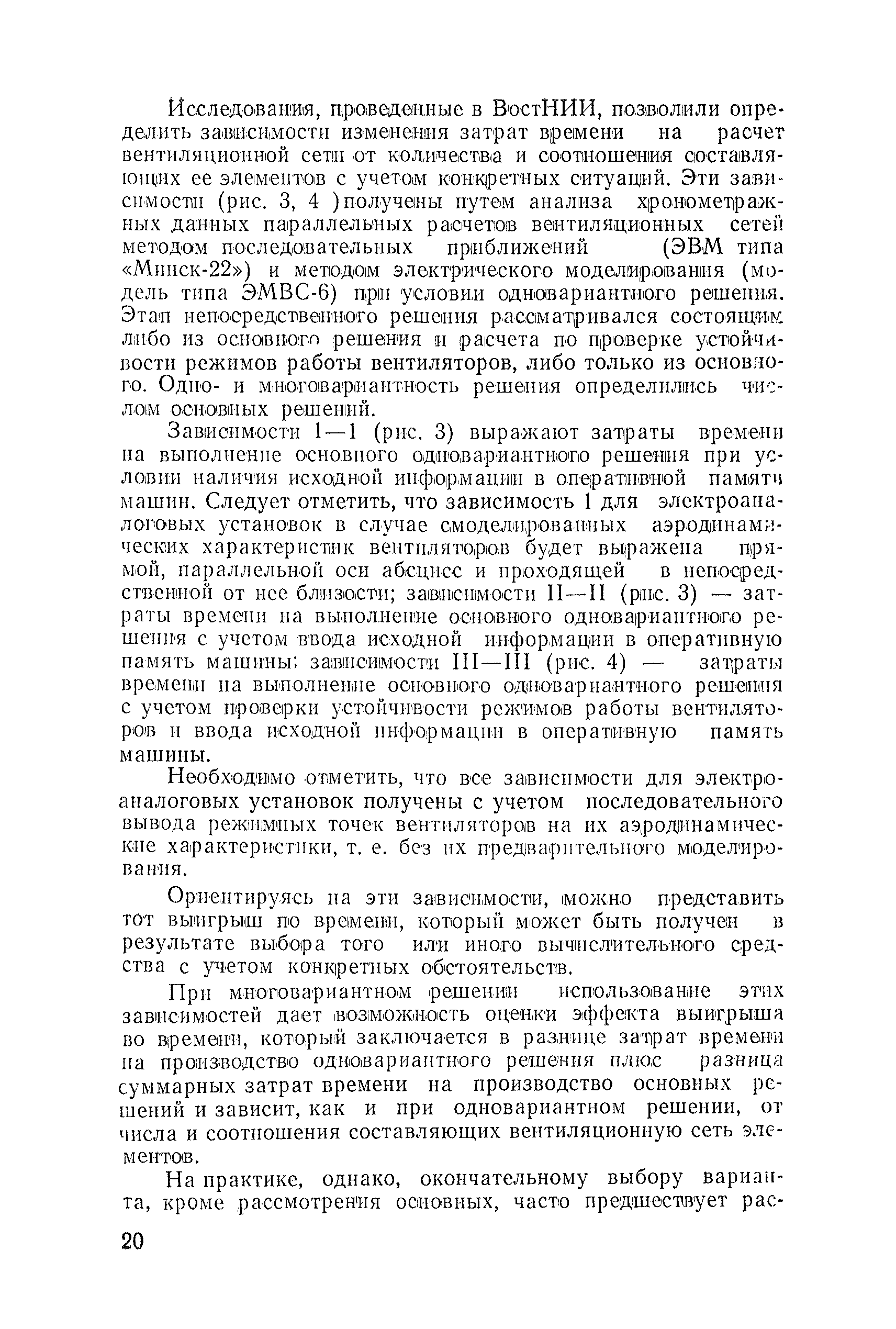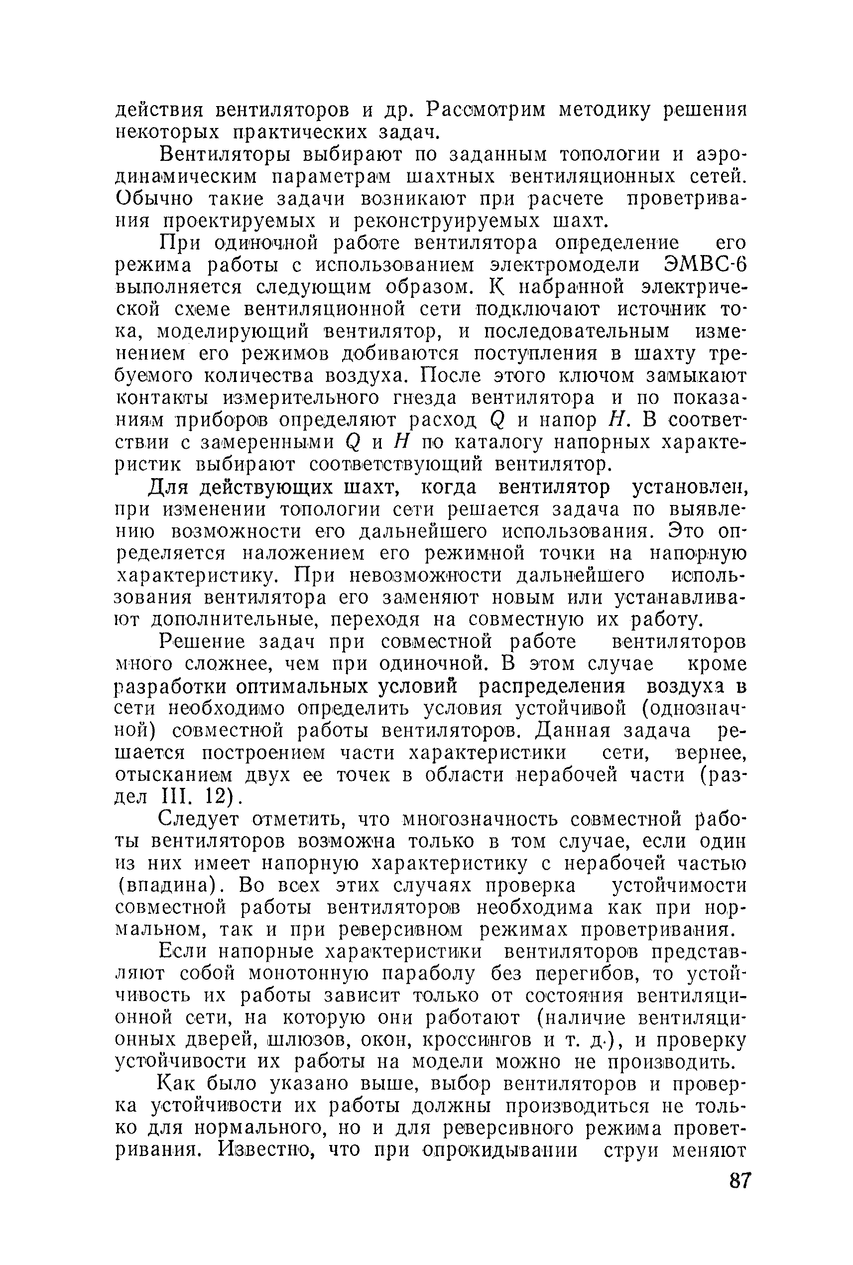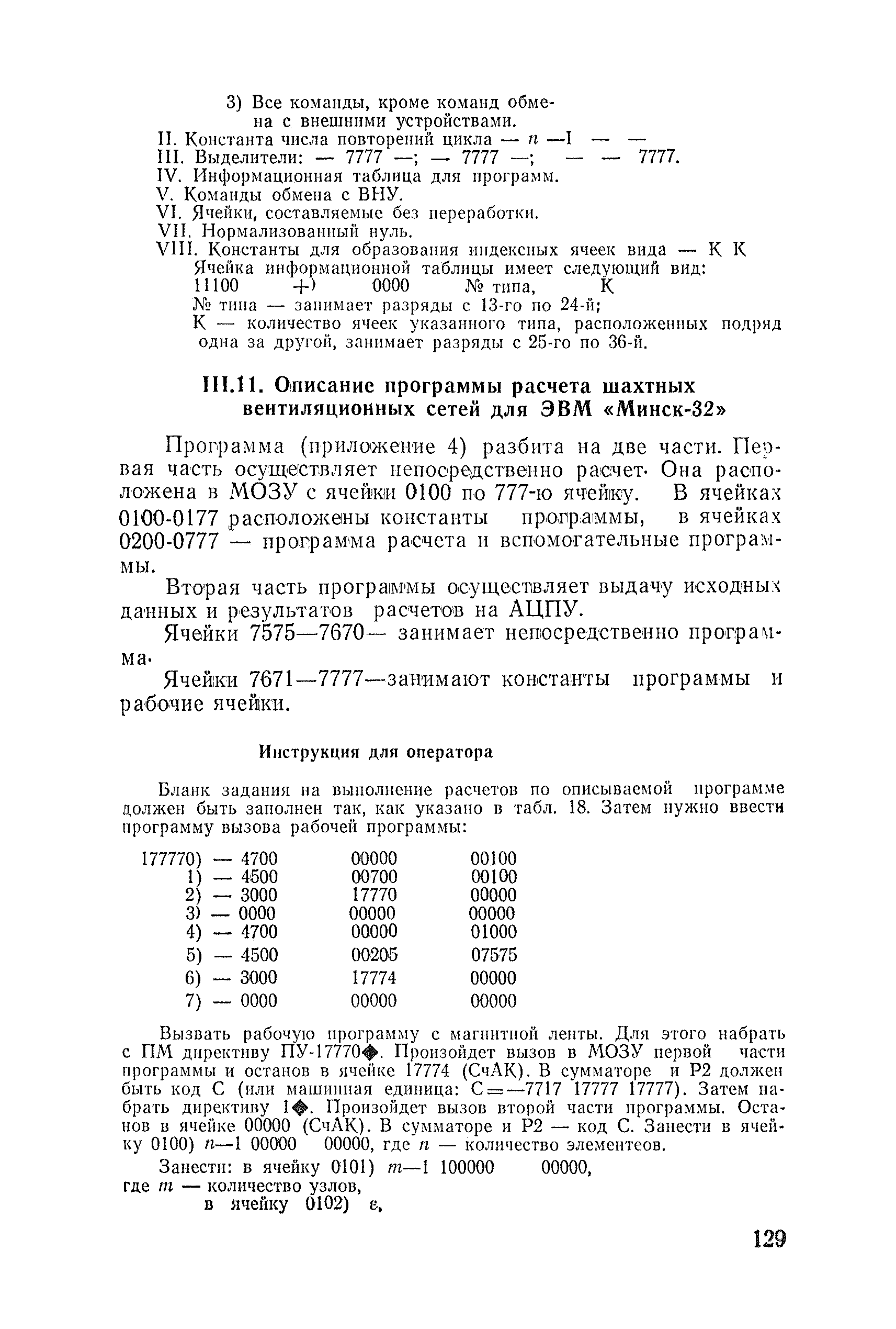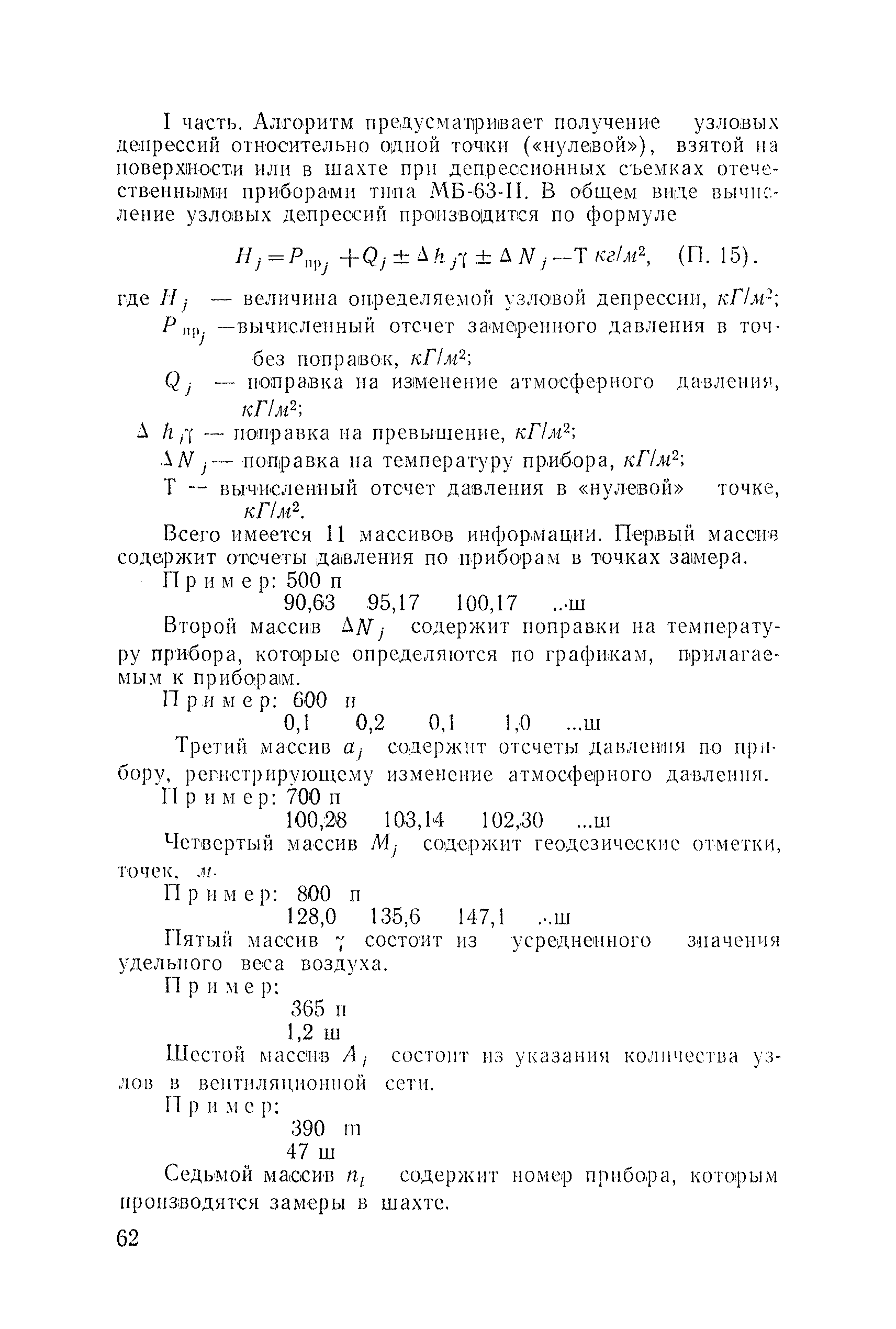 | Оглавление: | Введение I. Классификация задач и области использования средств вычислительной техники I.1. Вентиляционные сети и задачи, решаемые при их расчете I.2. Этапы расчета вентиляционной сети I.3. Методы и средства расчета вентиляционных сетей I.4. Критерии оценки рациональных областей применения средств вычислительной техники I.5. Области применения средств вычислительной техники II. Методы получения и подготовки исходных данных для расчета вентиляционных сетей II.1. Составление расчетных схем аэродинамических съемок II.2. Приборы для депрессионных съемок II.3. Методы и способы проведения депрессионных съемок II.4. Обследование вентиляторных установок II.5. Оформление результатов воздушно-депрессионной съемки II.6. Составление расчетных схем, анализируемых вариантов проветривания II.7. Обработка и накопление информации для расчета вентиляционных сетей на ЭВМ II.8. Внесение естественной тяги в расчетные схемы комбинациями условных вентиляторов II.9. Задачи, при решении которых необходимо учитывать естественные депрессии II.10. Методы учета естественных депрессий при выборе вентиляторов III. Методика решения вентиляторных задач с помощью ЭВМ и аналоговых устройств III.1. Принцип электрического моделирования вентиляторных сетей III.2. Основные требования к приборам электрической аналогии для расчета шахтных вентиляторных сетей. Краткая техническая характеристика электромодели ЭВМС-6 III.3. Методика решения вентиляторных задач с использованием электроаналоговых установок III.4. Математическое обоснование метода расчета и алгоритм для решения ЭВМ III.5. Применение метода узловых матриц при нагнетательном способе проветривания III.6. Применение метода узловых матриц при учете естественных депрессий III.7. Распределение оперативной памяти под промежуточные данные III.8. Анализ совместной работы вентиляторов главного проветривания III.9. Пример решения задачи свободного распределения воздуха III.10. Программа переработки программ из режима машины "Минск-22" в режим "Т" (ППРТ) III.11. Описание программы расчета шахтных вентиляционных сетей ЭВМ "Минск-32" III.12. Методика проверки устойчивости режимов работы вентиляторов III.13. Расчет равномерно распределенных утечек через зону обрушения Приложение 1. Обработка результатов воздушно-депрессионной съемки на ЭВМ Минск-22 Приложение 2. Обработка результатов воздушно-депрессионной съемки на ЭВМ НАИРИ-2 (I часть) Приложение 3. Ввод информации Приложение 4. Переработка программ в режим Т |