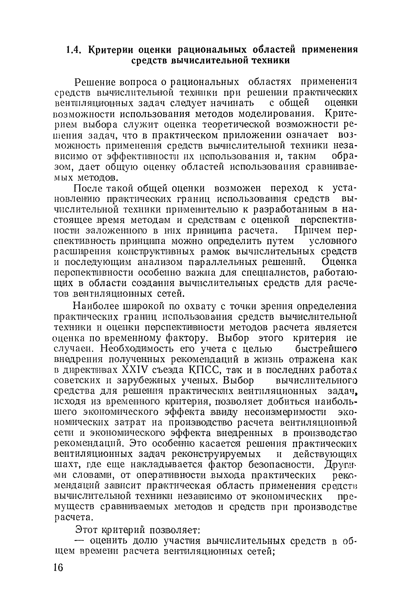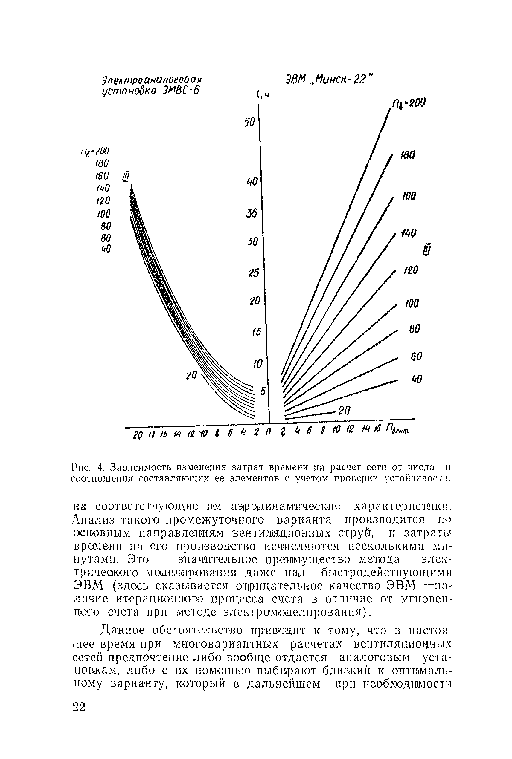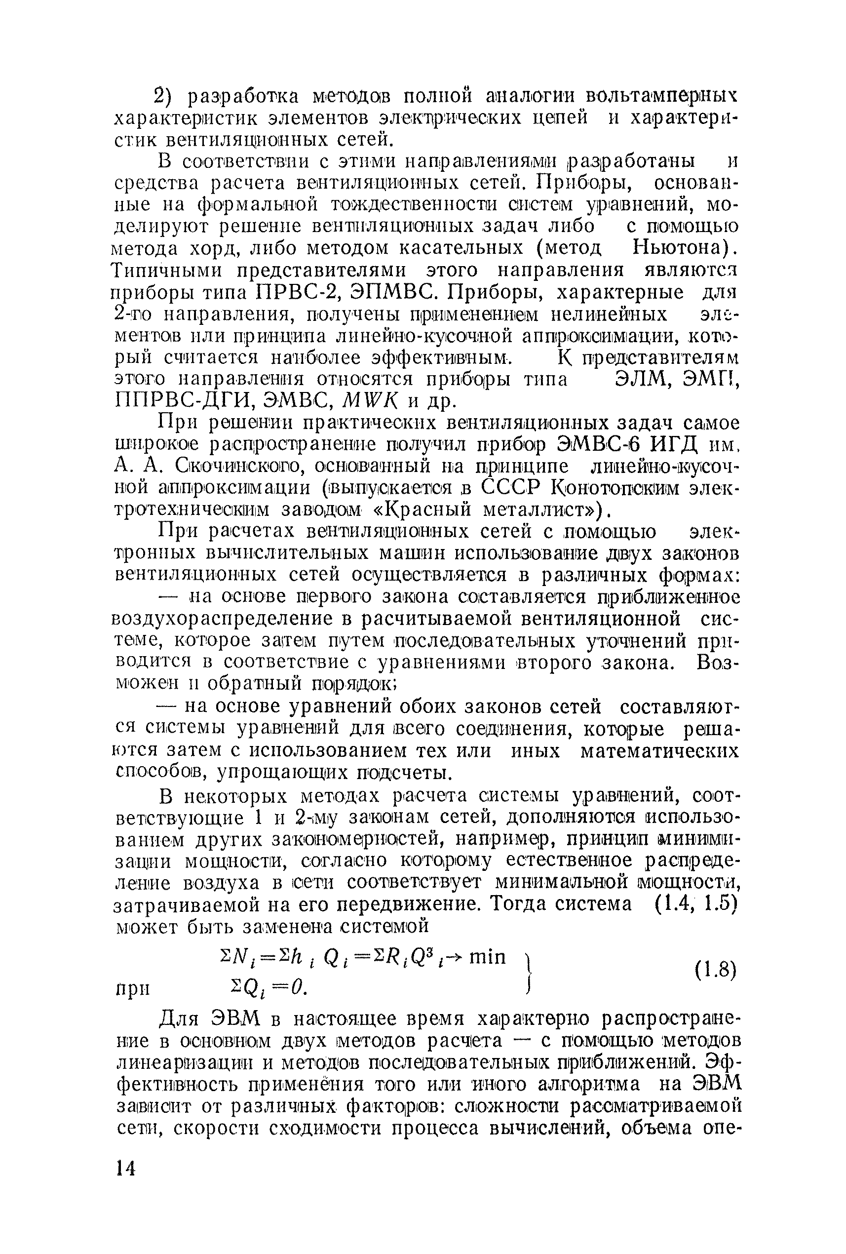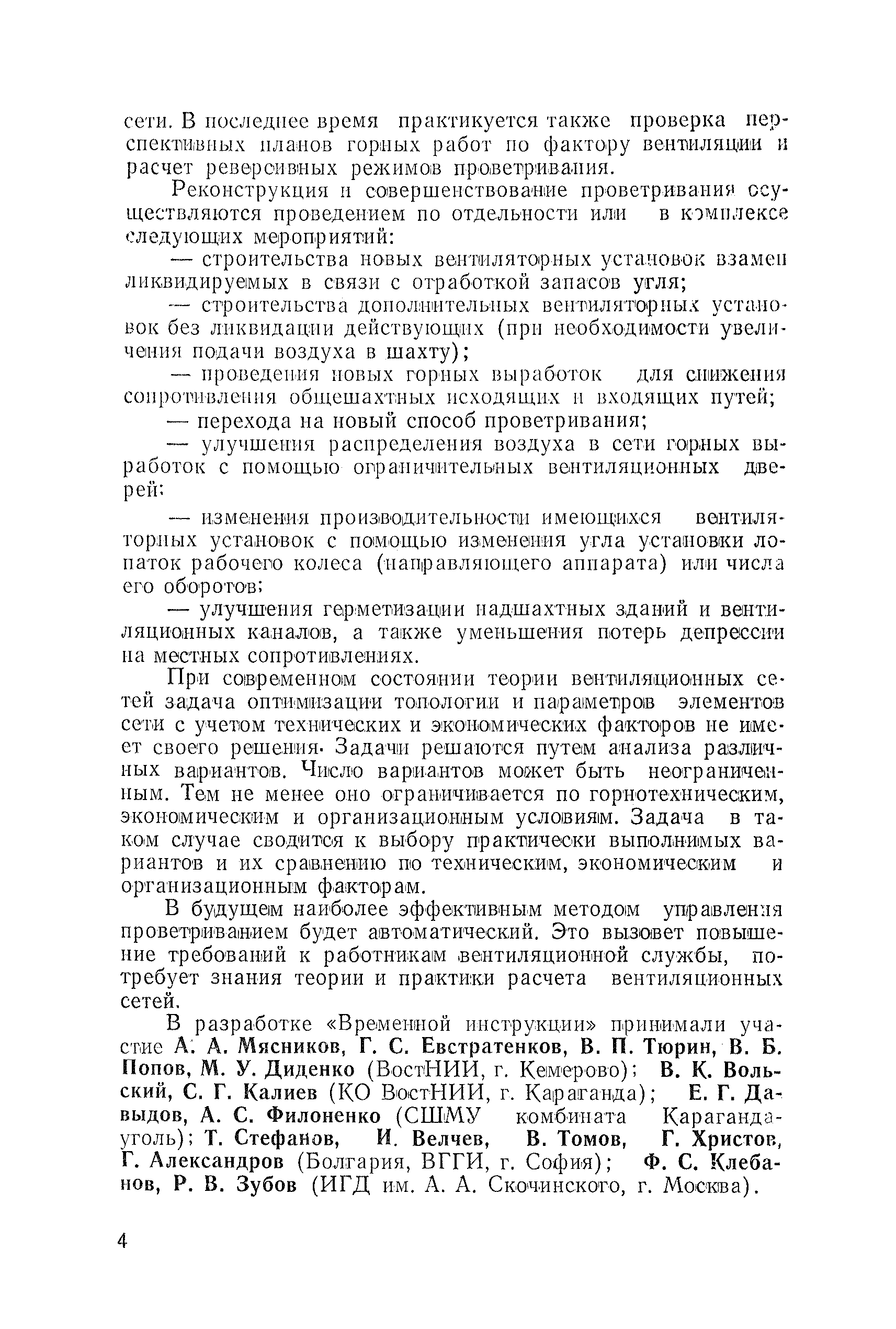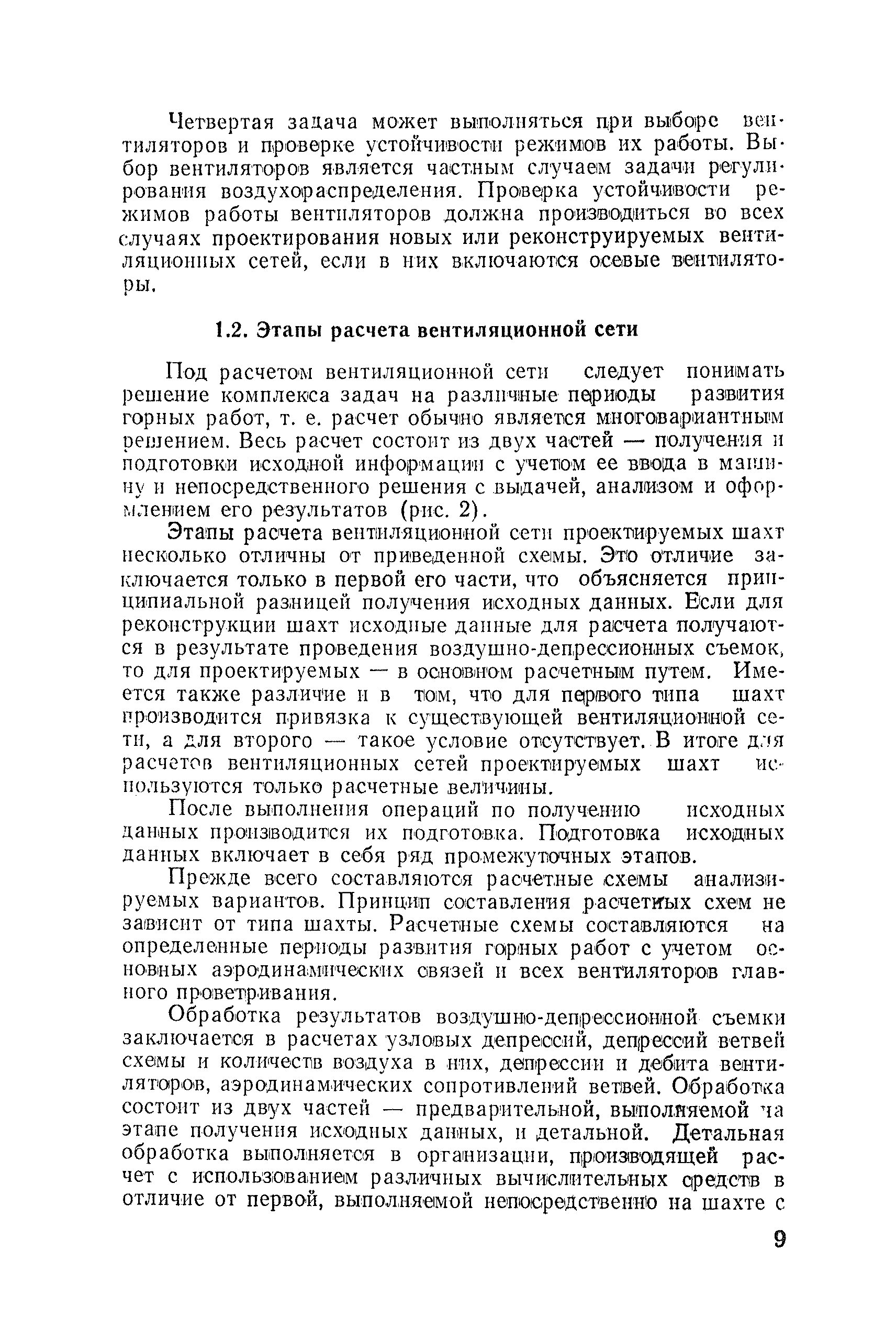 | Оглавление: | Введение I. Классификация задач и области использования средств вычислительной техники I.1. Вентиляционные сети и задачи, решаемые при их расчете I.2. Этапы расчета вентиляционной сети I.3. Методы и средства расчета вентиляционных сетей I.4. Критерии оценки рациональных областей применения средств вычислительной техники I.5. Области применения средств вычислительной техники II. Методы получения и подготовки исходных данных для расчета вентиляционных сетей II.1. Составление расчетных схем аэродинамических съемок II.2. Приборы для депрессионных съемок II.3. Методы и способы проведения депрессионных съемок II.4. Обследование вентиляторных установок II.5. Оформление результатов воздушно-депрессионной съемки II.6. Составление расчетных схем, анализируемых вариантов проветривания II.7. Обработка и накопление информации для расчета вентиляционных сетей на ЭВМ II.8. Внесение естественной тяги в расчетные схемы комбинациями условных вентиляторов II.9. Задачи, при решении которых необходимо учитывать естественные депрессии II.10. Методы учета естественных депрессий при выборе вентиляторов III. Методика решения вентиляторных задач с помощью ЭВМ и аналоговых устройств III.1. Принцип электрического моделирования вентиляторных сетей III.2. Основные требования к приборам электрической аналогии для расчета шахтных вентиляторных сетей. Краткая техническая характеристика электромодели ЭВМС-6 III.3. Методика решения вентиляторных задач с использованием электроаналоговых установок III.4. Математическое обоснование метода расчета и алгоритм для решения ЭВМ III.5. Применение метода узловых матриц при нагнетательном способе проветривания III.6. Применение метода узловых матриц при учете естественных депрессий III.7. Распределение оперативной памяти под промежуточные данные III.8. Анализ совместной работы вентиляторов главного проветривания III.9. Пример решения задачи свободного распределения воздуха III.10. Программа переработки программ из режима машины "Минск-22" в режим "Т" (ППРТ) III.11. Описание программы расчета шахтных вентиляционных сетей ЭВМ "Минск-32" III.12. Методика проверки устойчивости режимов работы вентиляторов III.13. Расчет равномерно распределенных утечек через зону обрушения Приложение 1. Обработка результатов воздушно-депрессионной съемки на ЭВМ Минск-22 Приложение 2. Обработка результатов воздушно-депрессионной съемки на ЭВМ НАИРИ-2 (I часть) Приложение 3. Ввод информации Приложение 4. Переработка программ в режим Т |