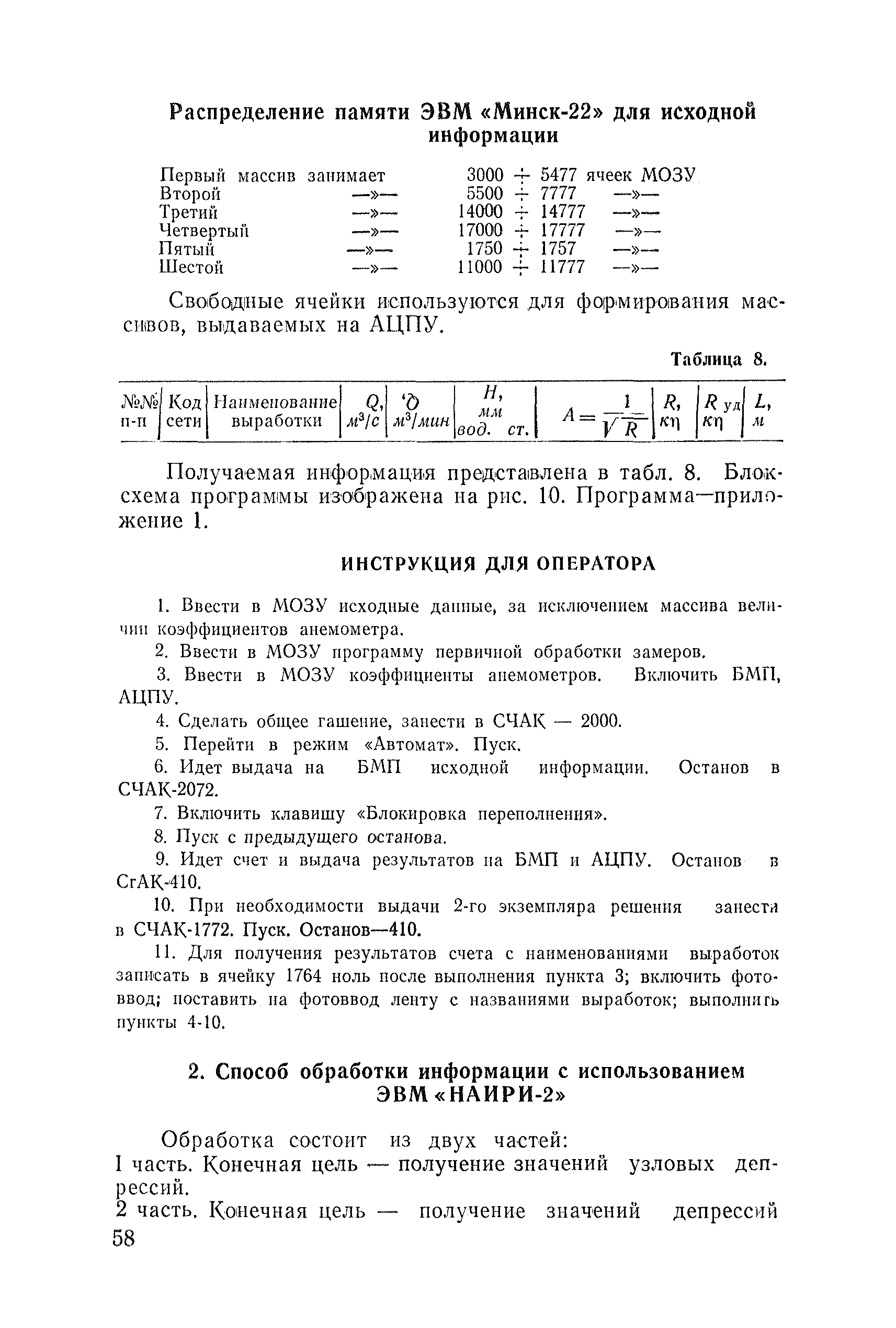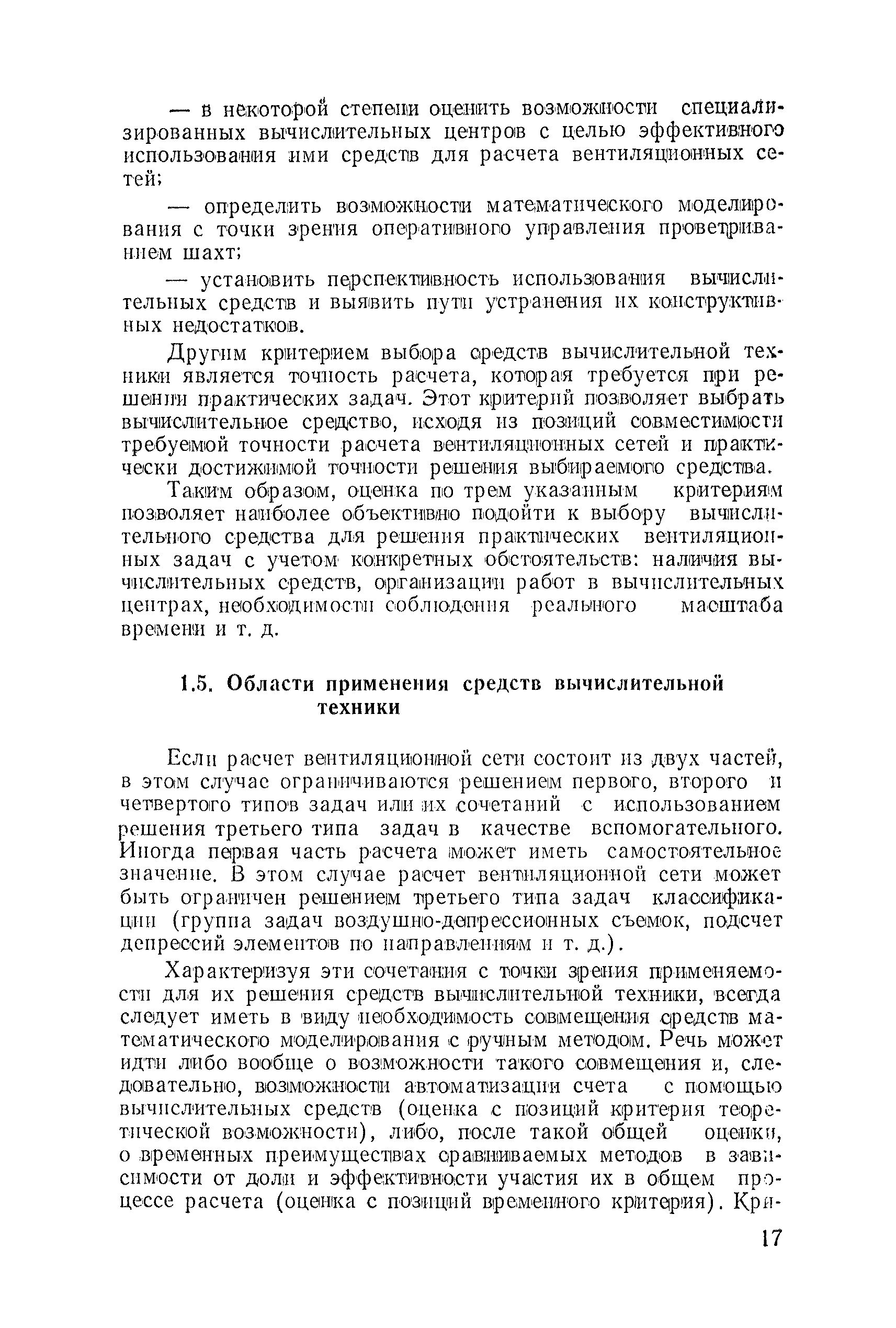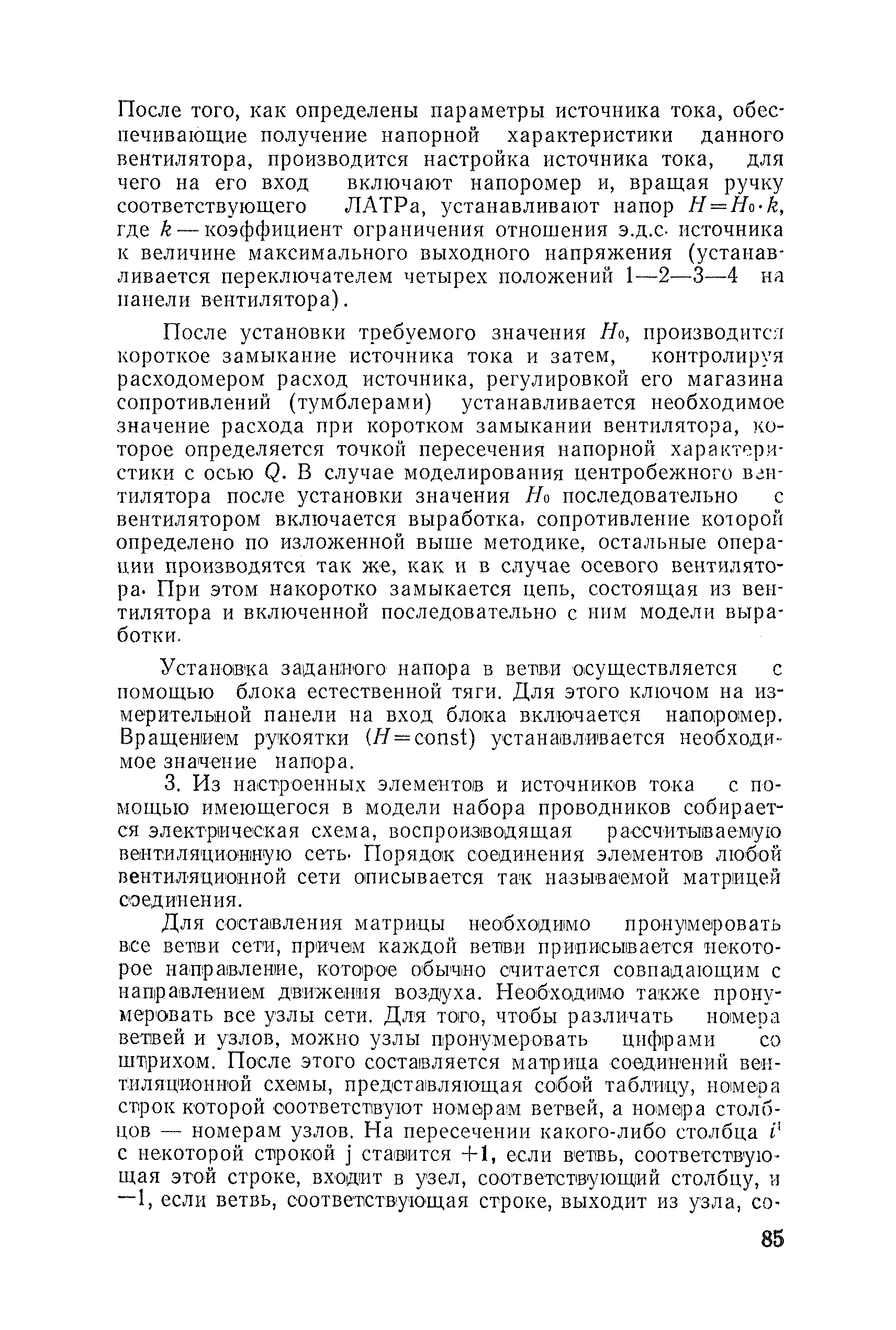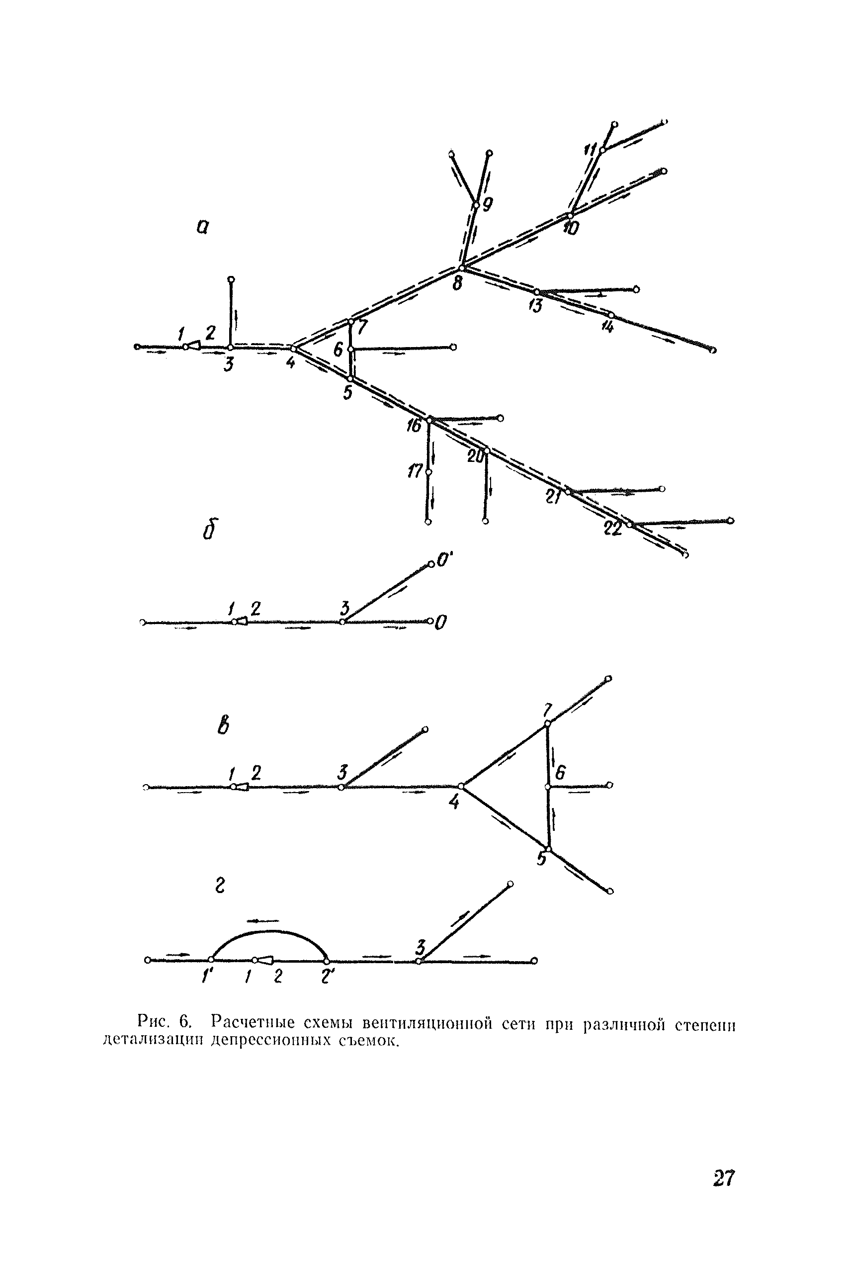 | Оглавление: | Введение I. Классификация задач и области использования средств вычислительной техники I.1. Вентиляционные сети и задачи, решаемые при их расчете I.2. Этапы расчета вентиляционной сети I.3. Методы и средства расчета вентиляционных сетей I.4. Критерии оценки рациональных областей применения средств вычислительной техники I.5. Области применения средств вычислительной техники II. Методы получения и подготовки исходных данных для расчета вентиляционных сетей II.1. Составление расчетных схем аэродинамических съемок II.2. Приборы для депрессионных съемок II.3. Методы и способы проведения депрессионных съемок II.4. Обследование вентиляторных установок II.5. Оформление результатов воздушно-депрессионной съемки II.6. Составление расчетных схем, анализируемых вариантов проветривания II.7. Обработка и накопление информации для расчета вентиляционных сетей на ЭВМ II.8. Внесение естественной тяги в расчетные схемы комбинациями условных вентиляторов II.9. Задачи, при решении которых необходимо учитывать естественные депрессии II.10. Методы учета естественных депрессий при выборе вентиляторов III. Методика решения вентиляторных задач с помощью ЭВМ и аналоговых устройств III.1. Принцип электрического моделирования вентиляторных сетей III.2. Основные требования к приборам электрической аналогии для расчета шахтных вентиляторных сетей. Краткая техническая характеристика электромодели ЭВМС-6 III.3. Методика решения вентиляторных задач с использованием электроаналоговых установок III.4. Математическое обоснование метода расчета и алгоритм для решения ЭВМ III.5. Применение метода узловых матриц при нагнетательном способе проветривания III.6. Применение метода узловых матриц при учете естественных депрессий III.7. Распределение оперативной памяти под промежуточные данные III.8. Анализ совместной работы вентиляторов главного проветривания III.9. Пример решения задачи свободного распределения воздуха III.10. Программа переработки программ из режима машины "Минск-22" в режим "Т" (ППРТ) III.11. Описание программы расчета шахтных вентиляционных сетей ЭВМ "Минск-32" III.12. Методика проверки устойчивости режимов работы вентиляторов III.13. Расчет равномерно распределенных утечек через зону обрушения Приложение 1. Обработка результатов воздушно-депрессионной съемки на ЭВМ Минск-22 Приложение 2. Обработка результатов воздушно-депрессионной съемки на ЭВМ НАИРИ-2 (I часть) Приложение 3. Ввод информации Приложение 4. Переработка программ в режим Т |