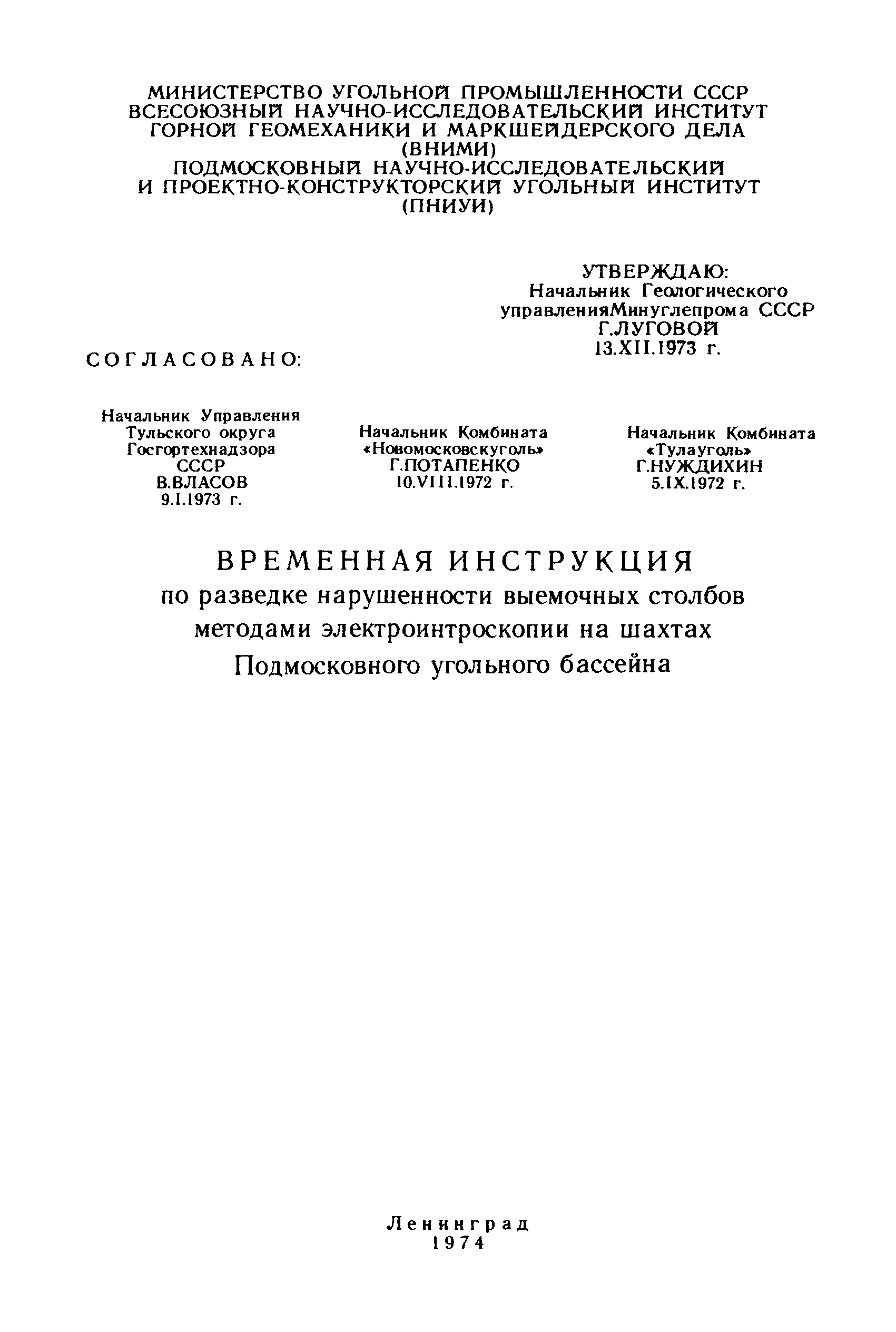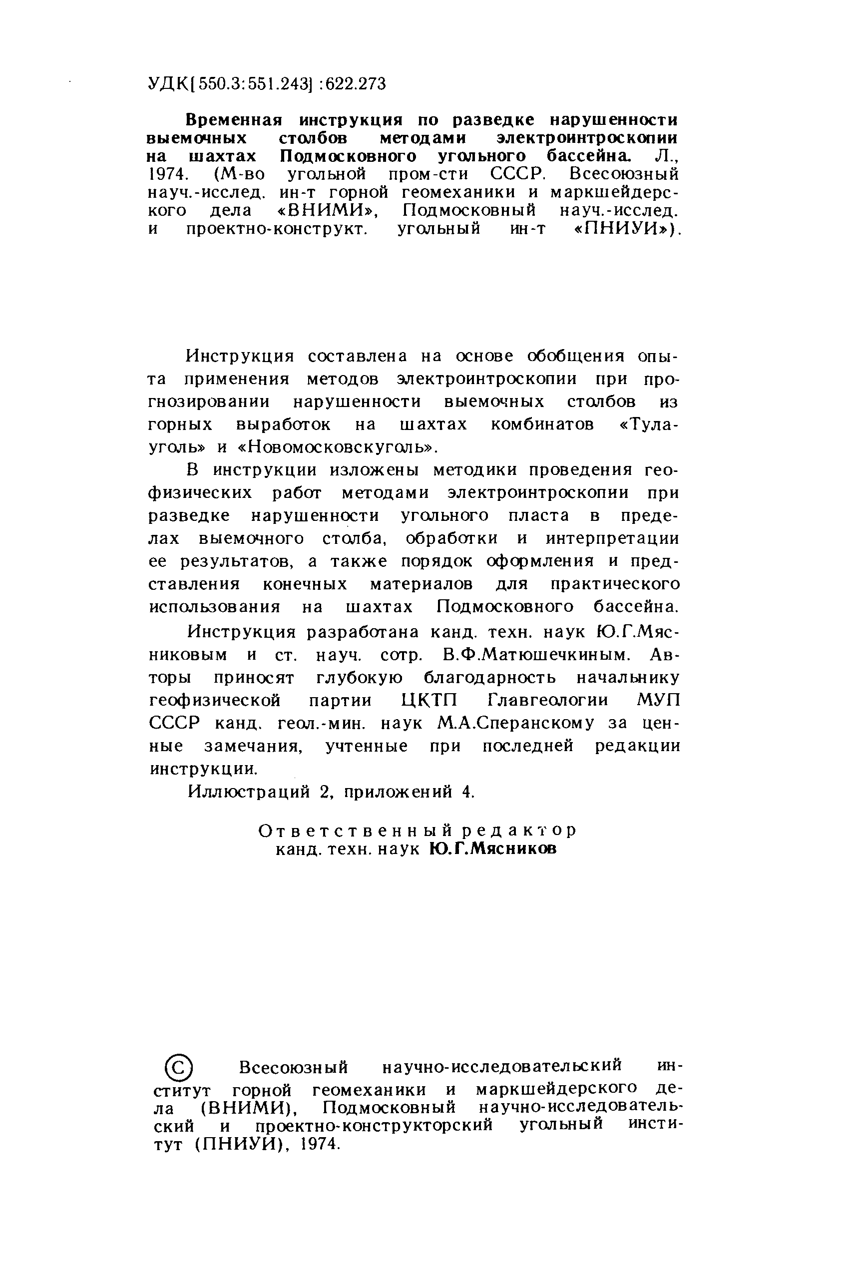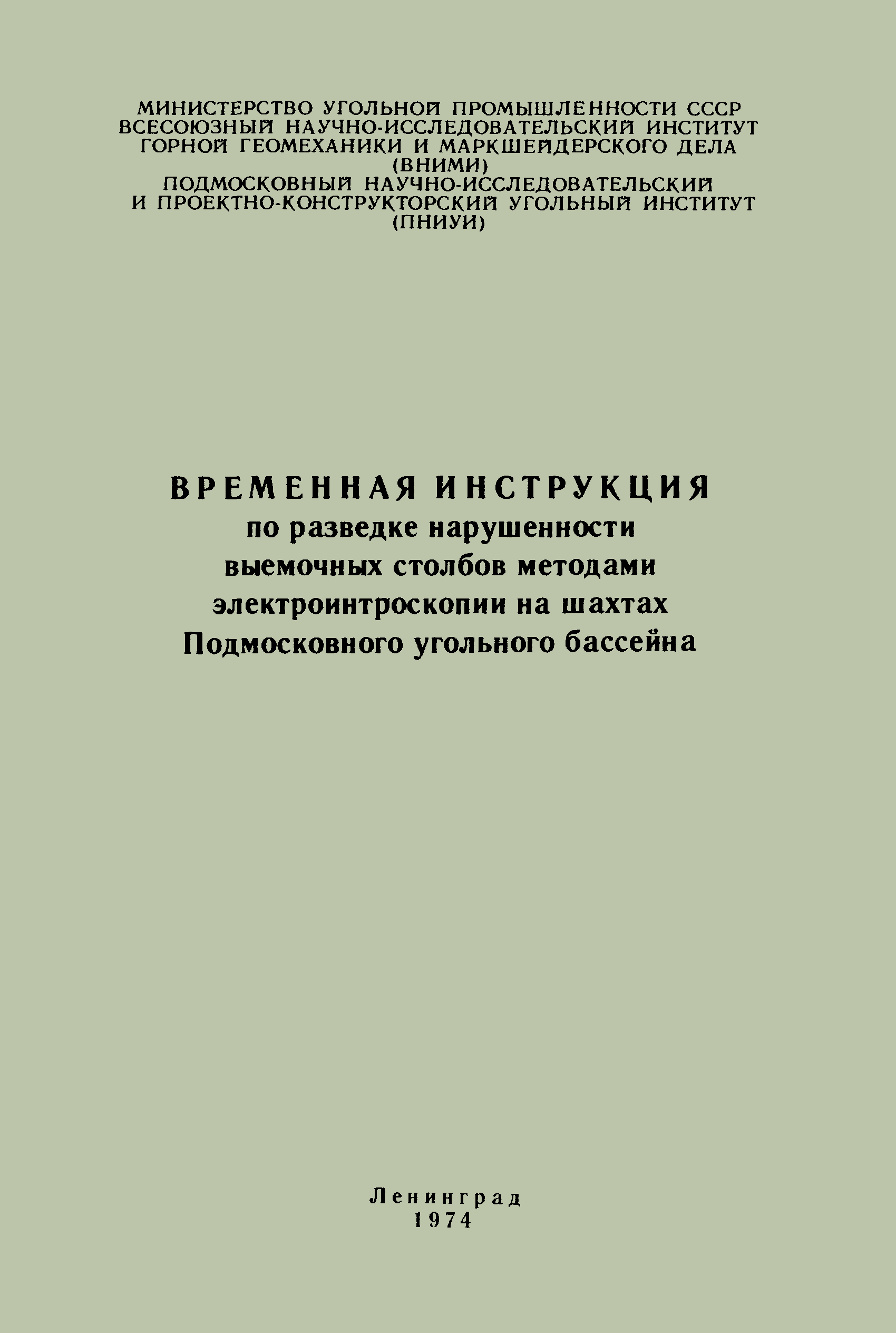 | Название рус.: | Временная инструкция по разведке нарушенности выемочных столбов методами электроинтроскопии на шахтах Подмосковного угольного бассейна |