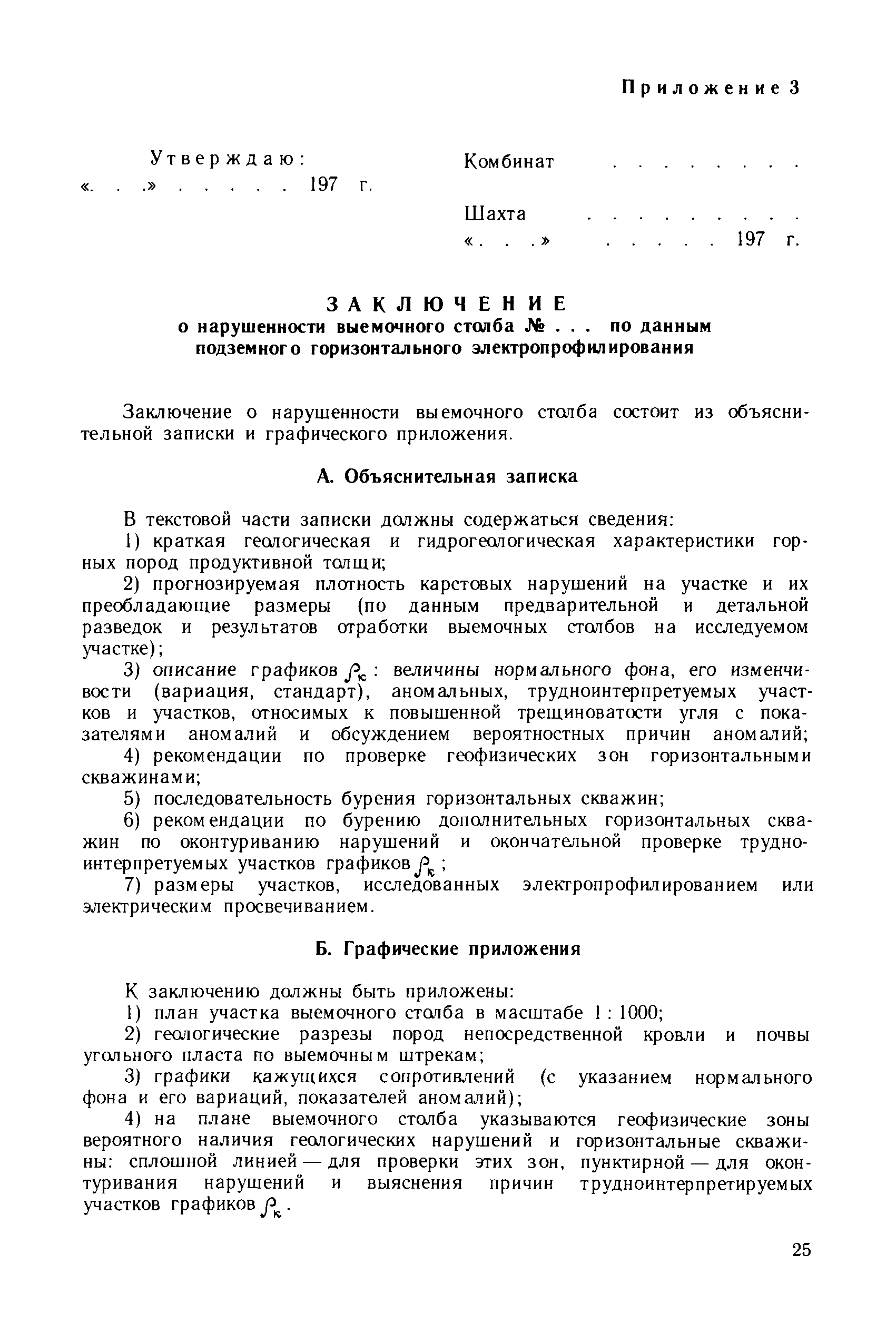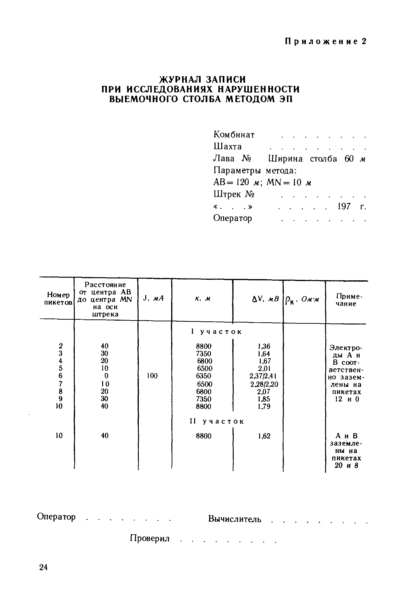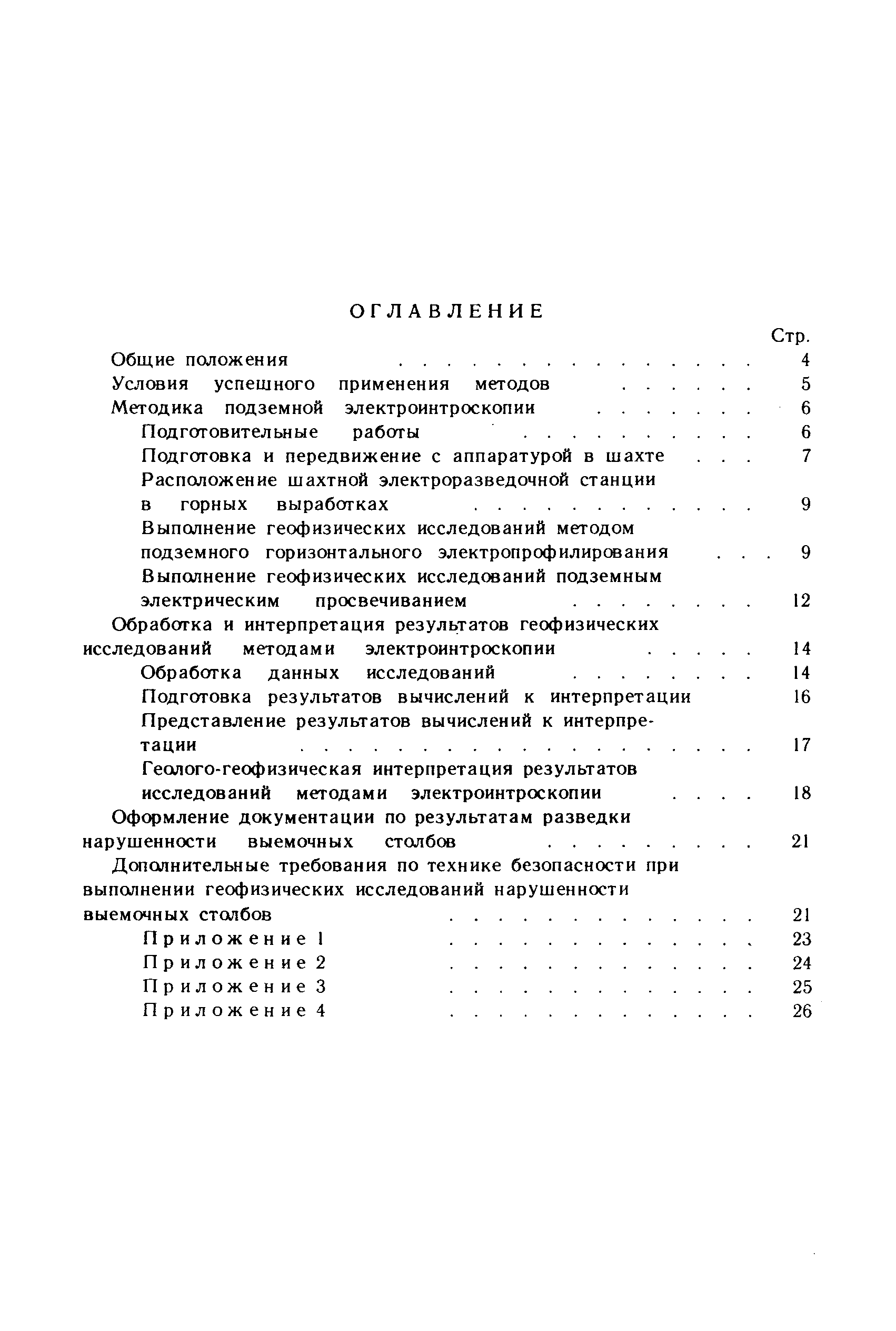 | Оглавление: | Общие положения Условия успешного применения методов Методика подземной электроинтроскопии Подготовительные работы Подготовка и передвижение с аппаратурой в шахте Расположение шахтной электроразведочной станции в горных выработках Выполнение геофизических исследований методом подземного горизонтального электропрофилирования Выполнение геофизических исследований подземным электрическим просвечиванием Обработка и интерпретация результатов геофизических исследований методами электроинтроскопии Обработка данных исследований Подготовка результатов вычислений к интерпретации Представление результатов вычислений к интерпретации Геолого-геофизическая интерпретация результатов исследований методами электроинтроскопии Оформление документации по результатам разведки нарушенности выемочных столбов Дополнительные требования по технике безопасности при выполнении геофизических исследований нарушенности выемочных столбов Приложение 1. Журнал записи при исследованиях нарушенности выемочного столба методом ПГЭП Приложение 2. Журнал записи при исследованиях нарушенности выемочного столба методом ЭП Приложение 3. Заключение о нарушенности выемочного столба по данным подземного горизонтального электропрофилирования Приложение 4. Акт о нарушенности выемочного столба |