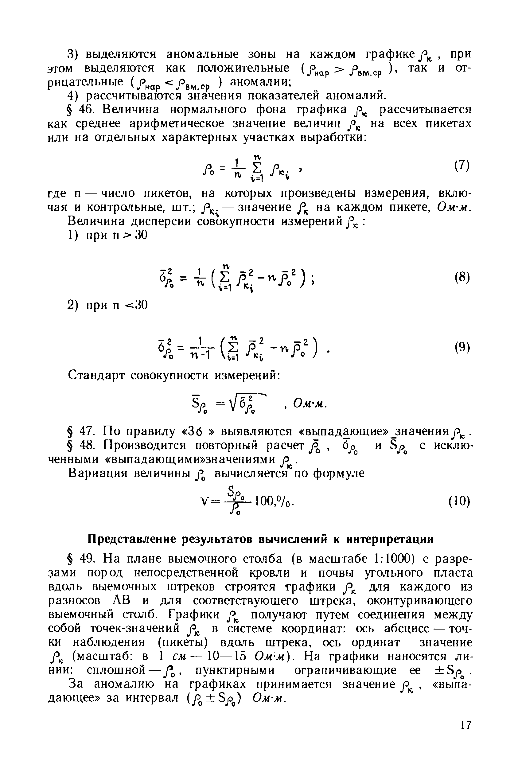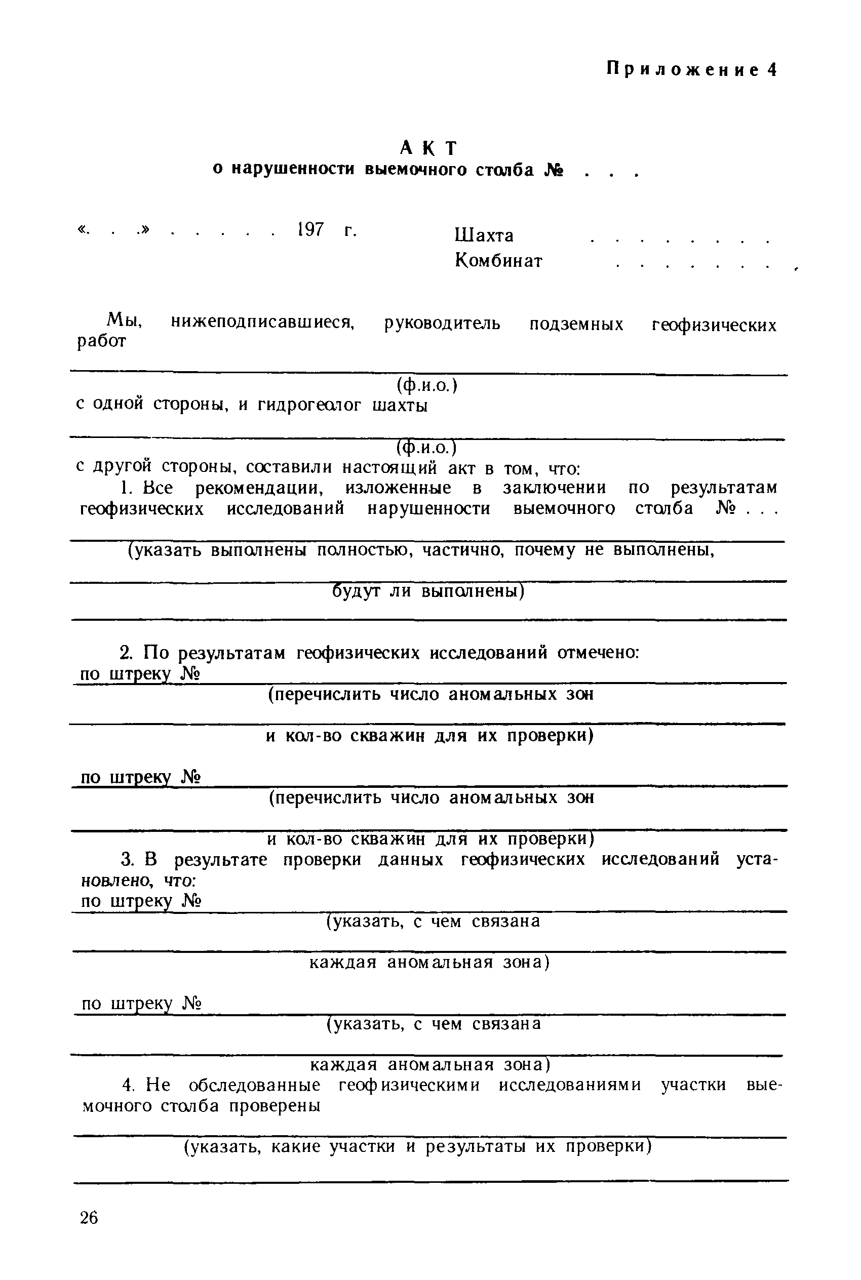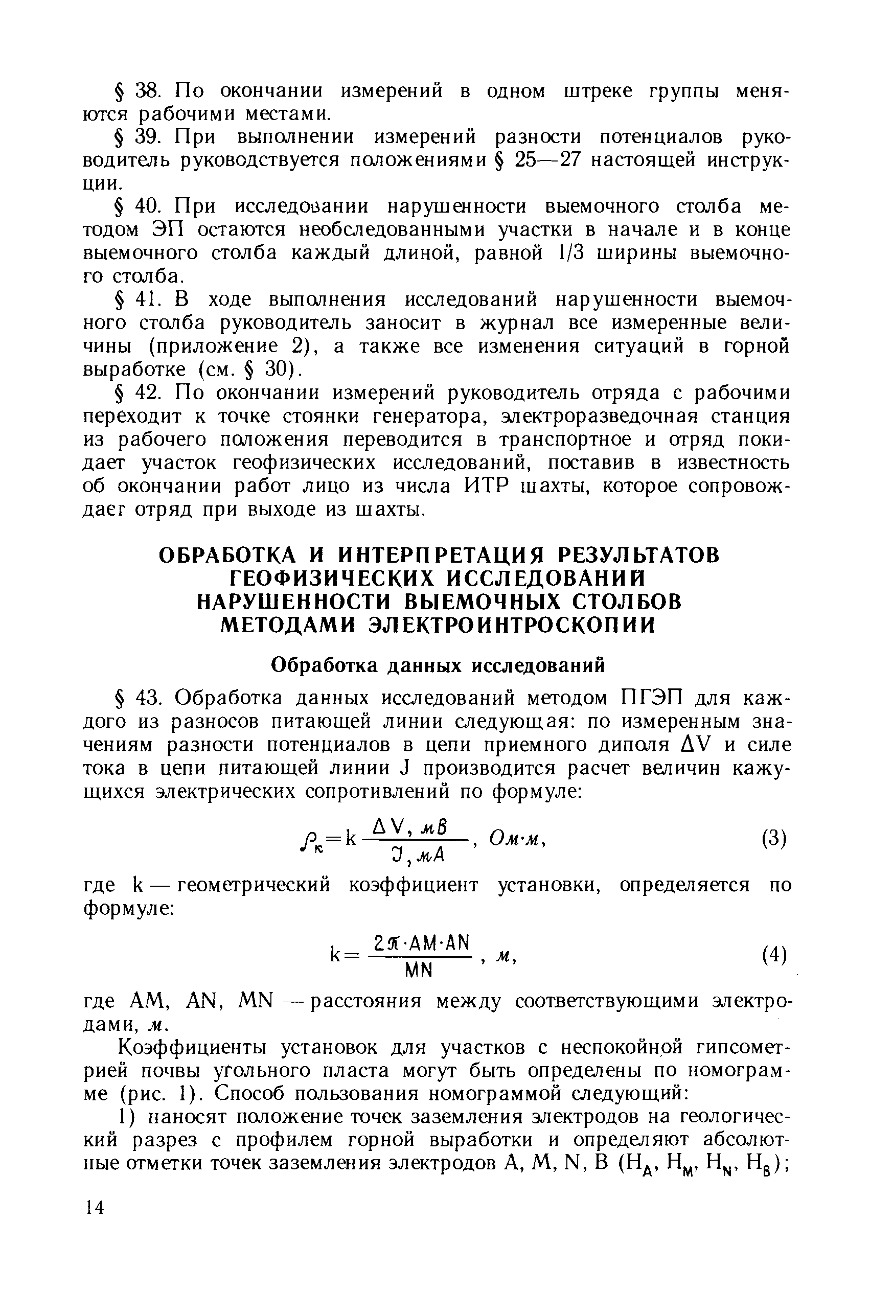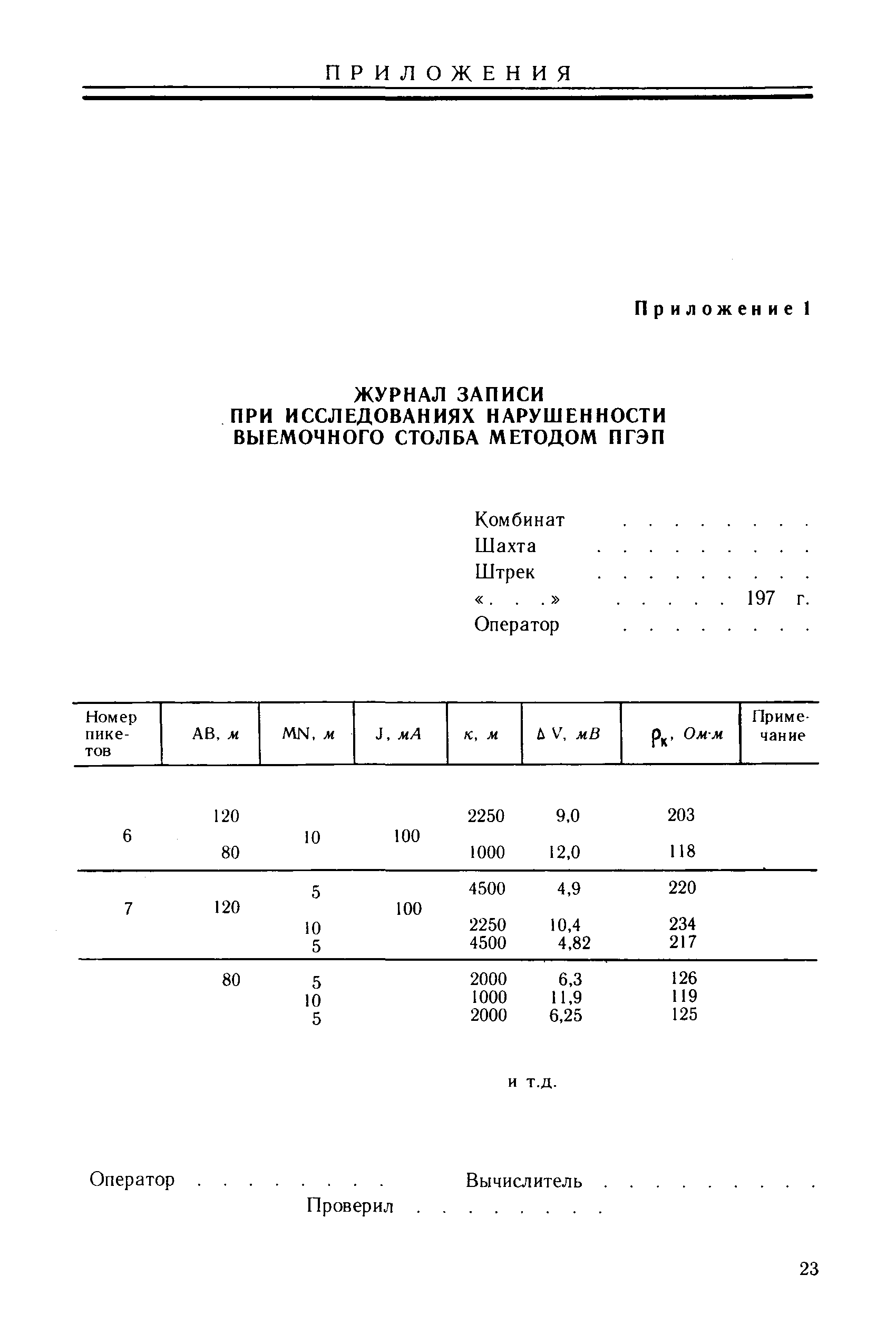 | Оглавление: | Общие положения Условия успешного применения методов Методика подземной электроинтроскопии Подготовительные работы Подготовка и передвижение с аппаратурой в шахте Расположение шахтной электроразведочной станции в горных выработках Выполнение геофизических исследований методом подземного горизонтального электропрофилирования Выполнение геофизических исследований подземным электрическим просвечиванием Обработка и интерпретация результатов геофизических исследований методами электроинтроскопии Обработка данных исследований Подготовка результатов вычислений к интерпретации Представление результатов вычислений к интерпретации Геолого-геофизическая интерпретация результатов исследований методами электроинтроскопии Оформление документации по результатам разведки нарушенности выемочных столбов Дополнительные требования по технике безопасности при выполнении геофизических исследований нарушенности выемочных столбов Приложение 1. Журнал записи при исследованиях нарушенности выемочного столба методом ПГЭП Приложение 2. Журнал записи при исследованиях нарушенности выемочного столба методом ЭП Приложение 3. Заключение о нарушенности выемочного столба по данным подземного горизонтального электропрофилирования Приложение 4. Акт о нарушенности выемочного столба |