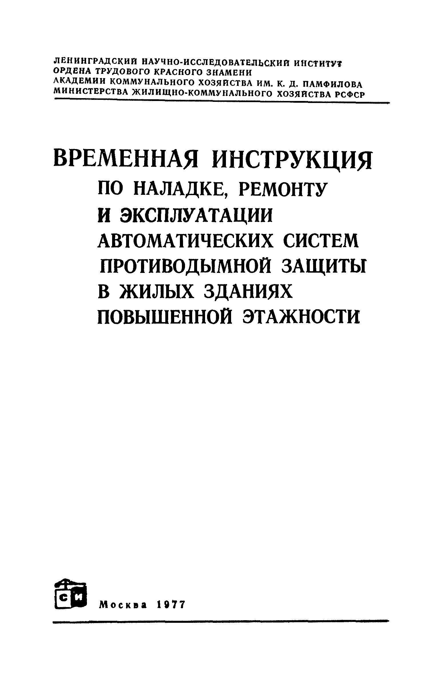 | Название рус.: | Временная инструкция по наладке, ремонту и эксплуатации автоматических систем противодымной защиты в жилых зданиях повышенной этажности |