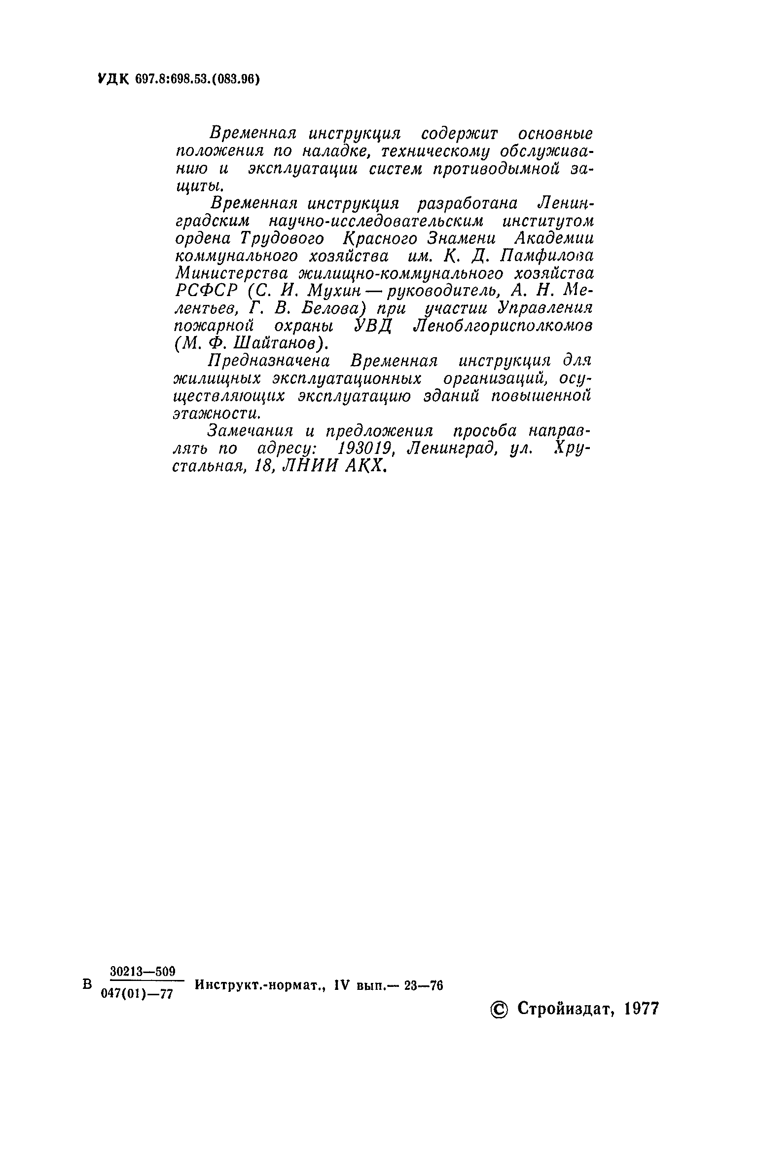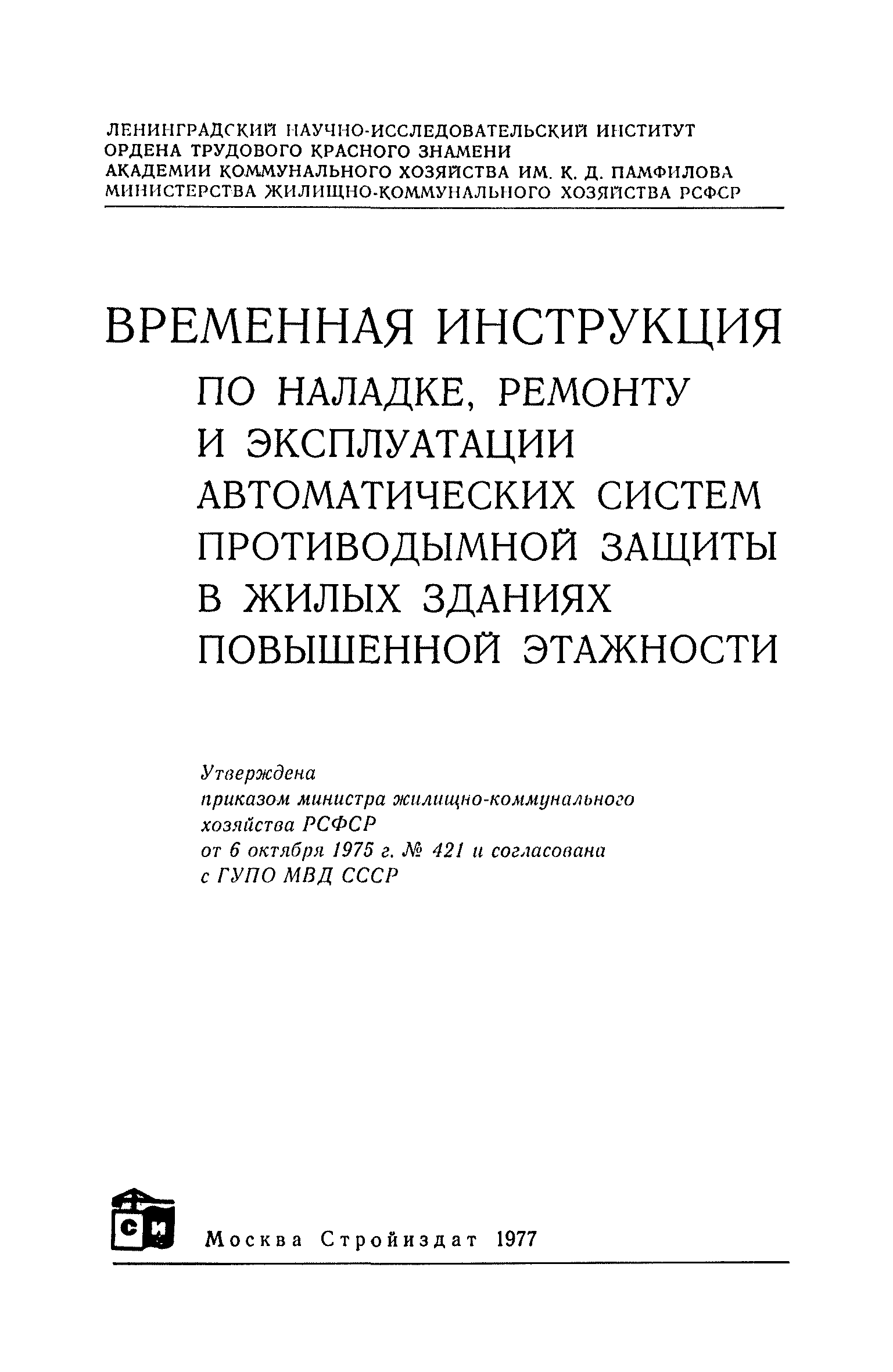| Разработан: | Министерство жилищно-коммунального хозяйства РСФСР Ленинградский научно-исследовательский институт ордена Трудового Красного Знамени Академии коммунального хозяйства им. К.Д. Памфилова Управление пожарной охраны УВД Леноблгорисполкомов
