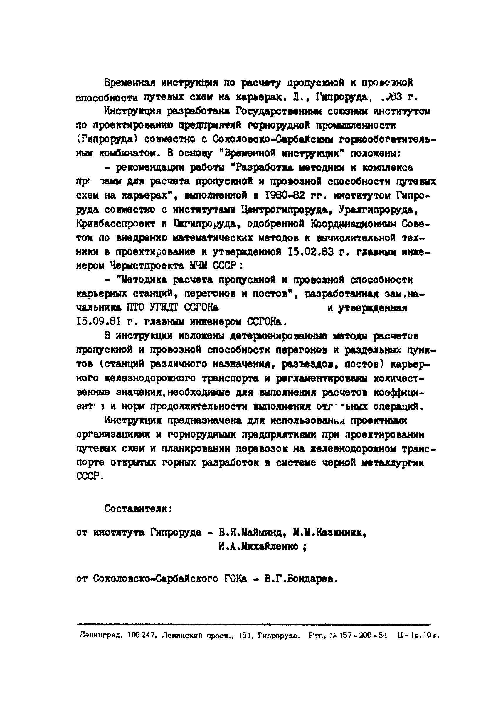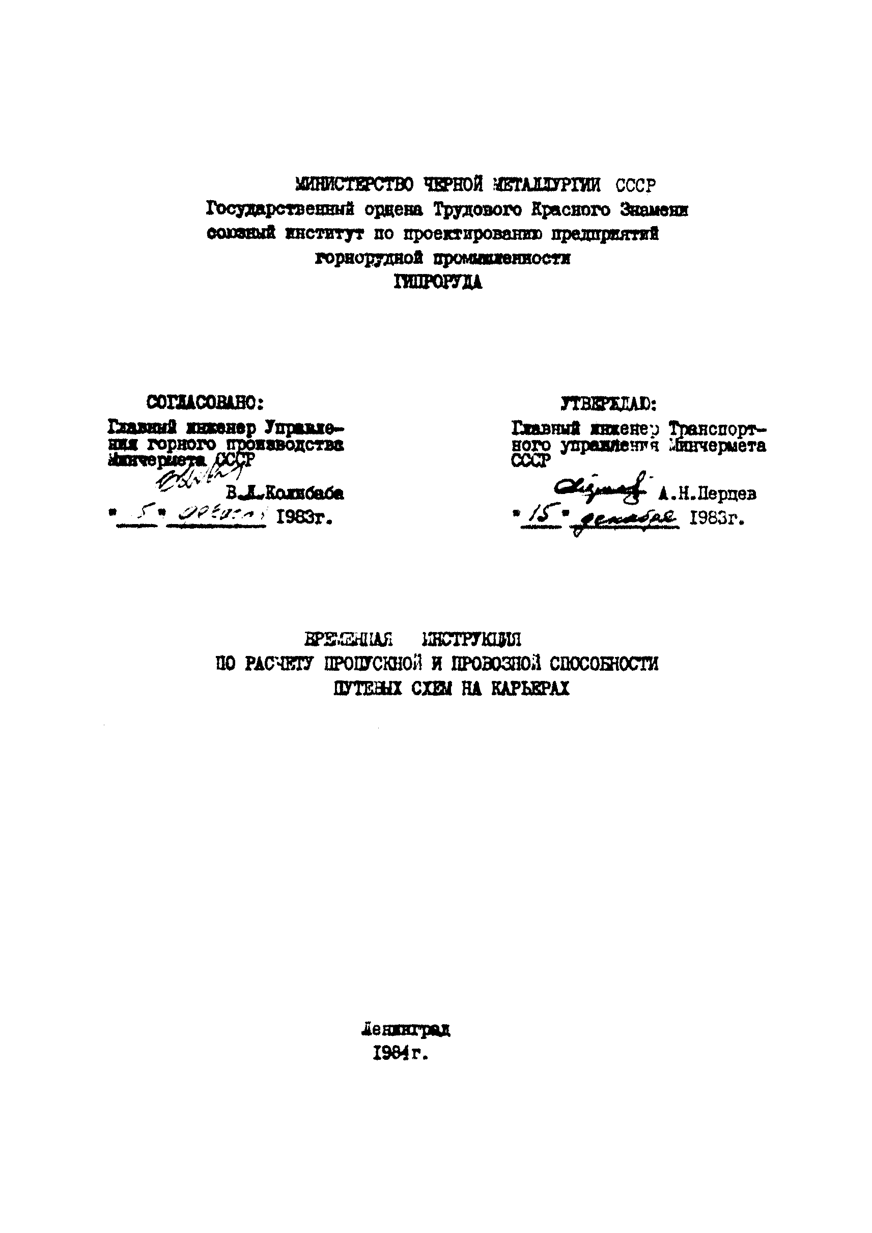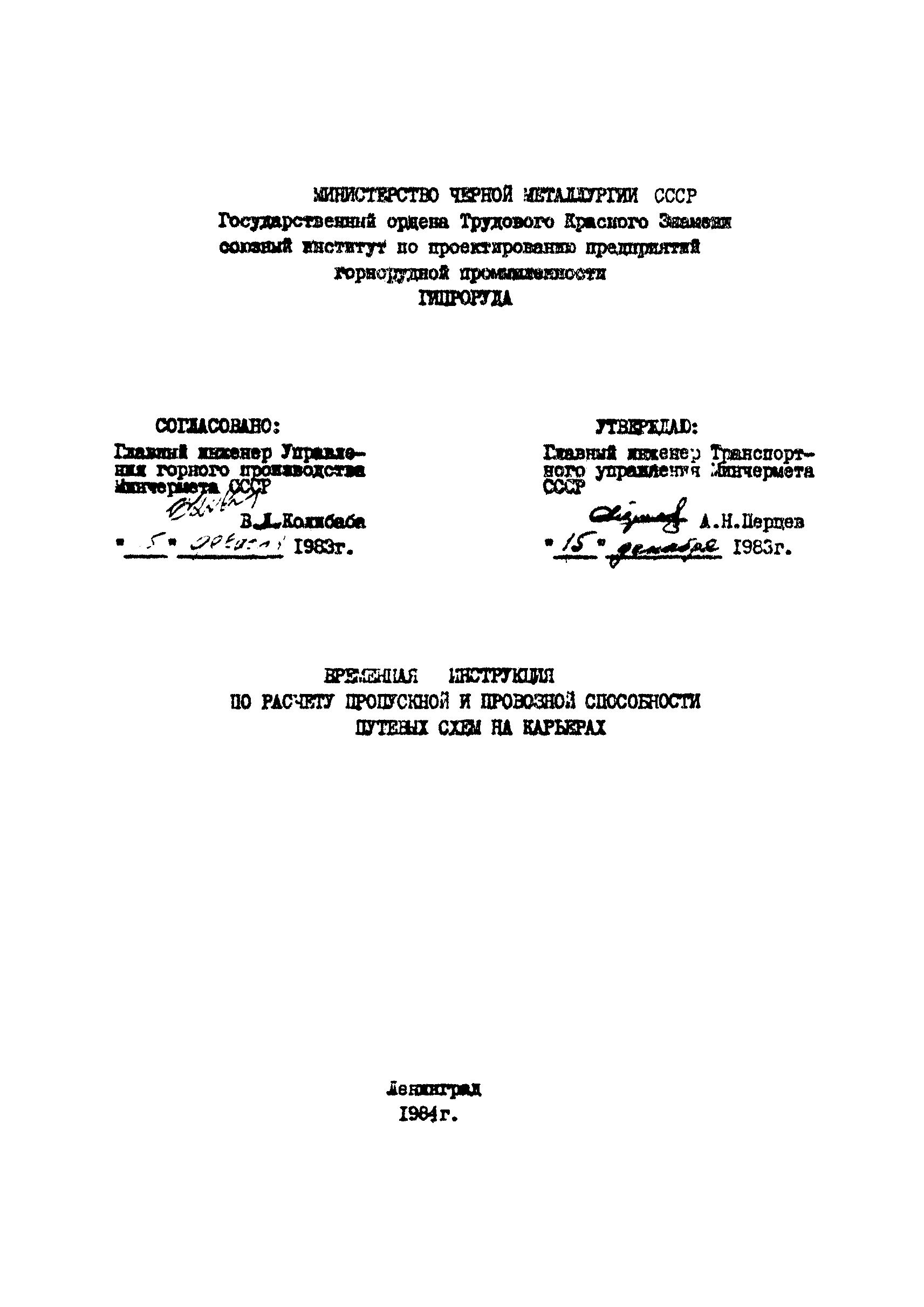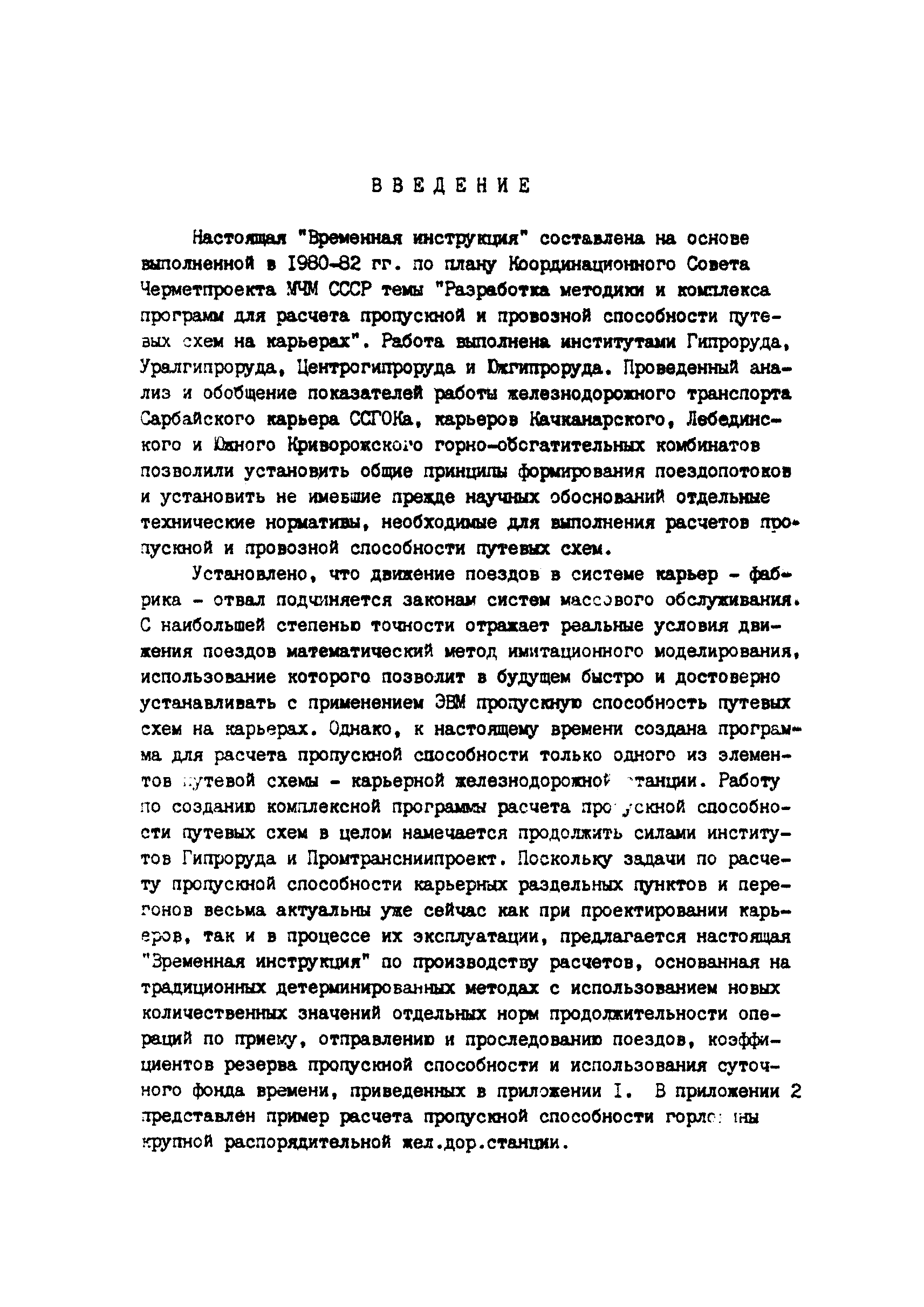 | Название рус.: | Временная инструкция по расчету пропускной и провозной способности путевых схем на карьерах |