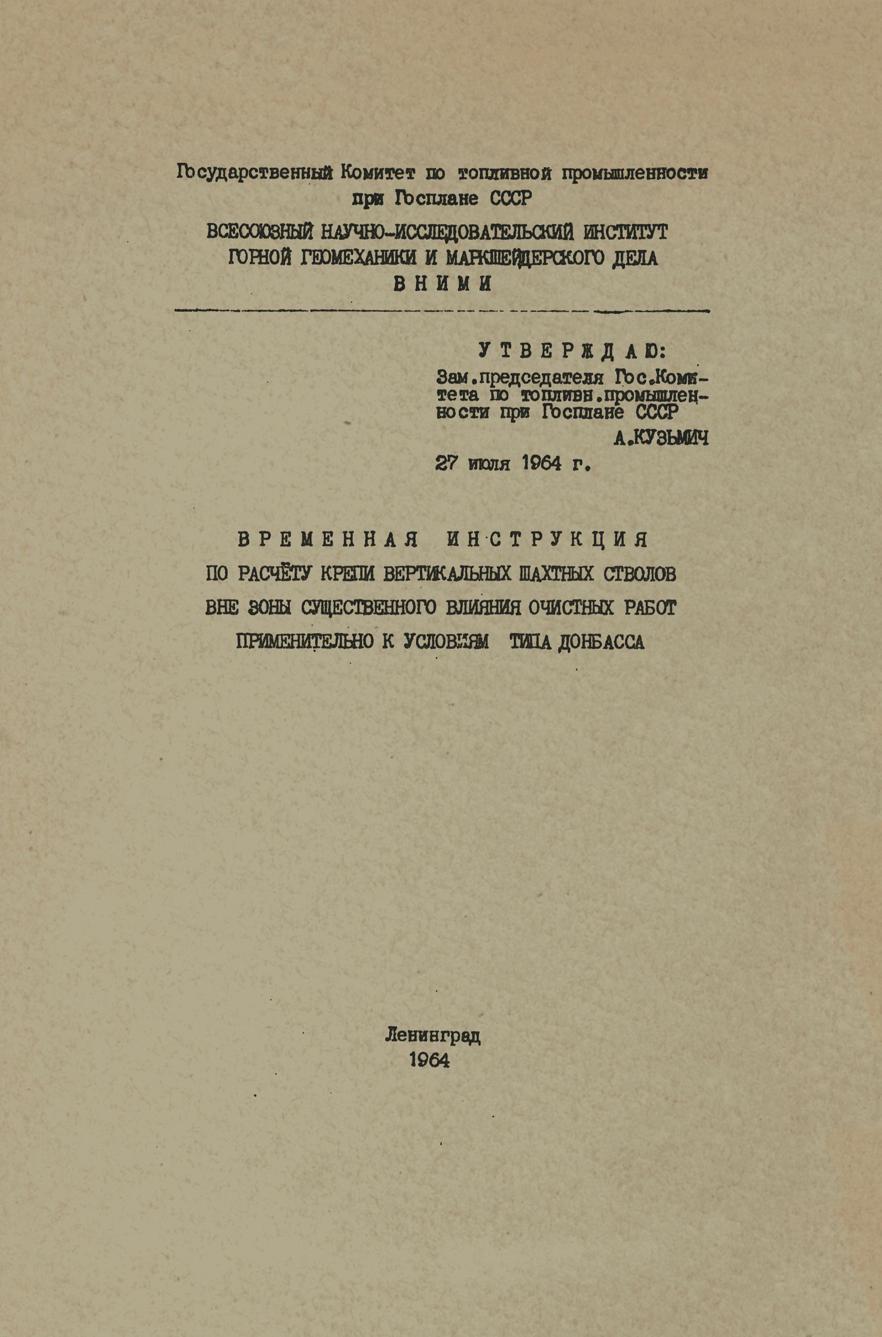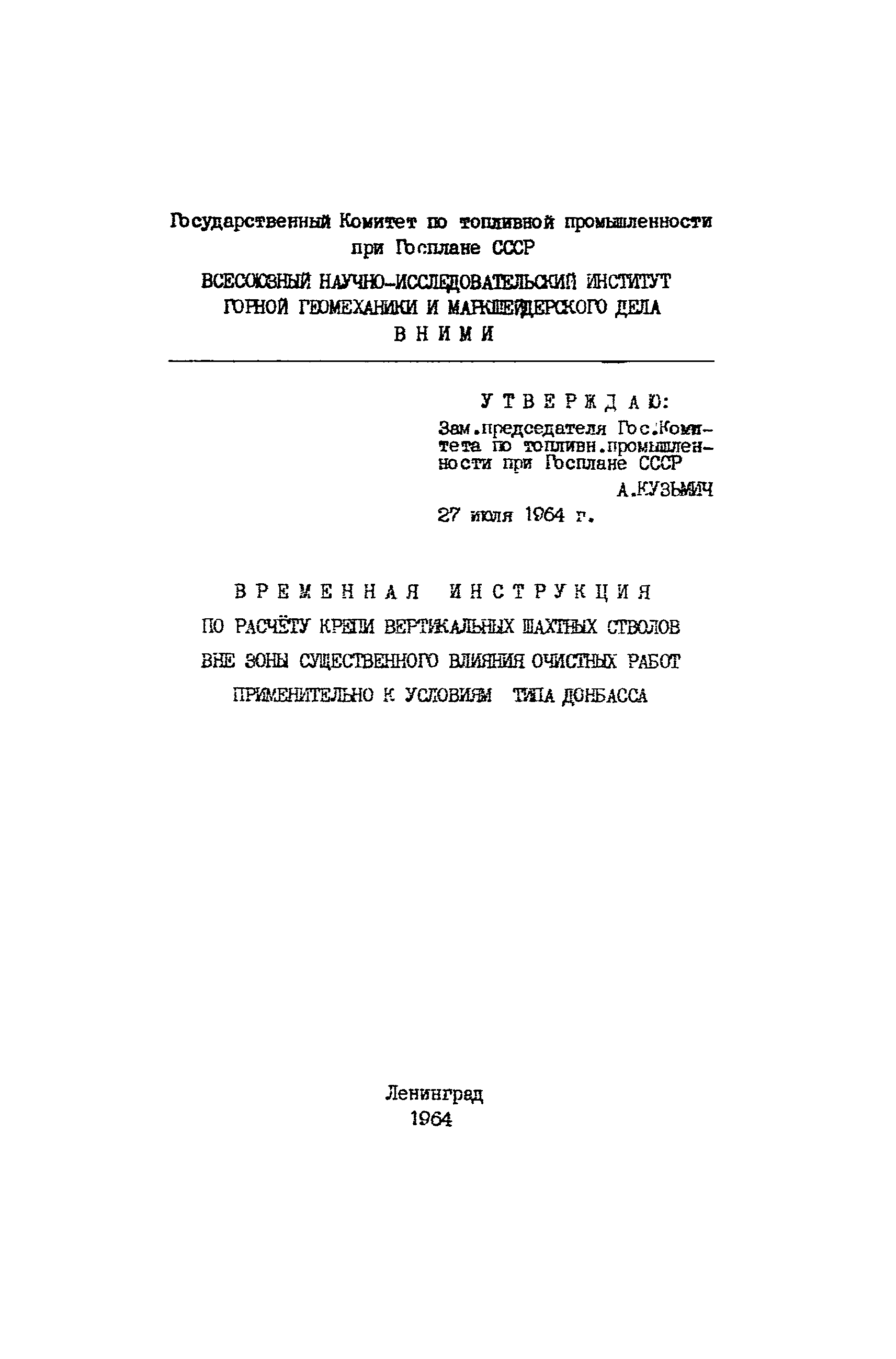 | Название рус.: | Временная инструкция по расчету крепи вертикальных шахтных стволов вне зоны существенного влияния очистных работ применительно к условиям типа Донбасса |