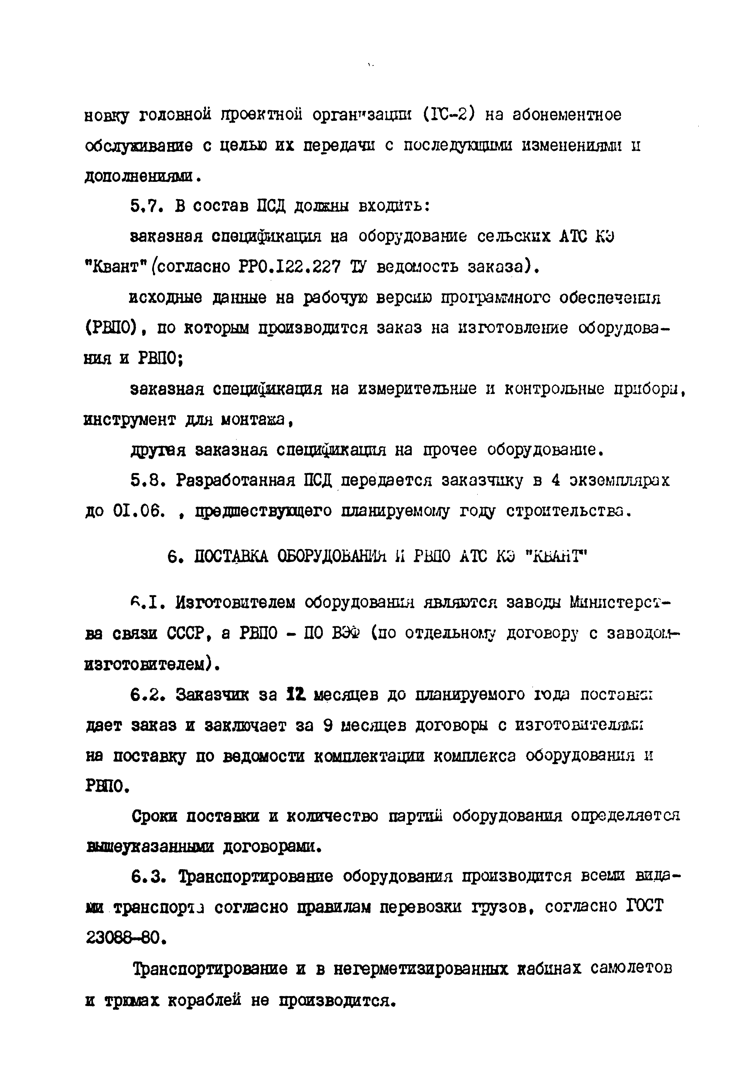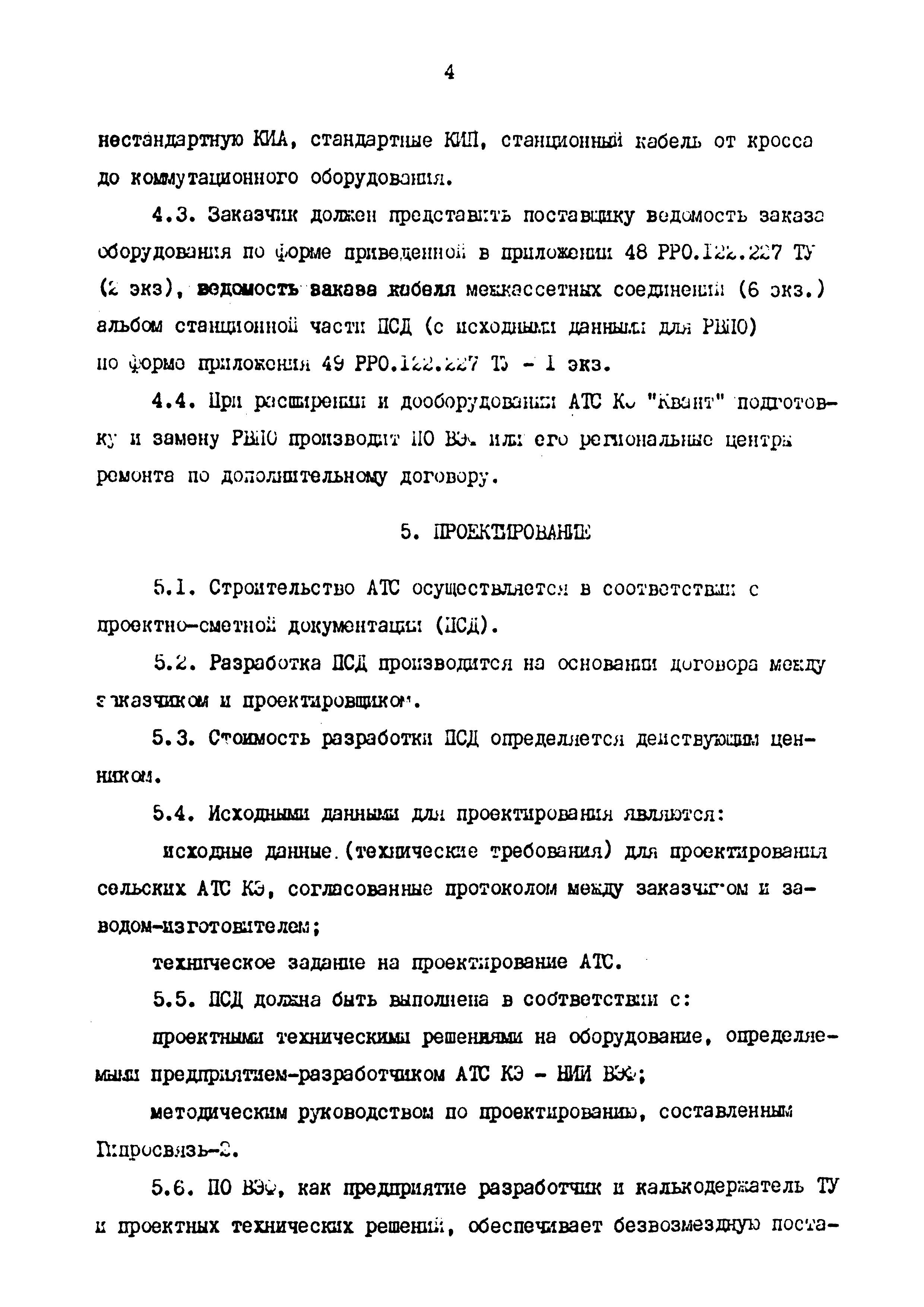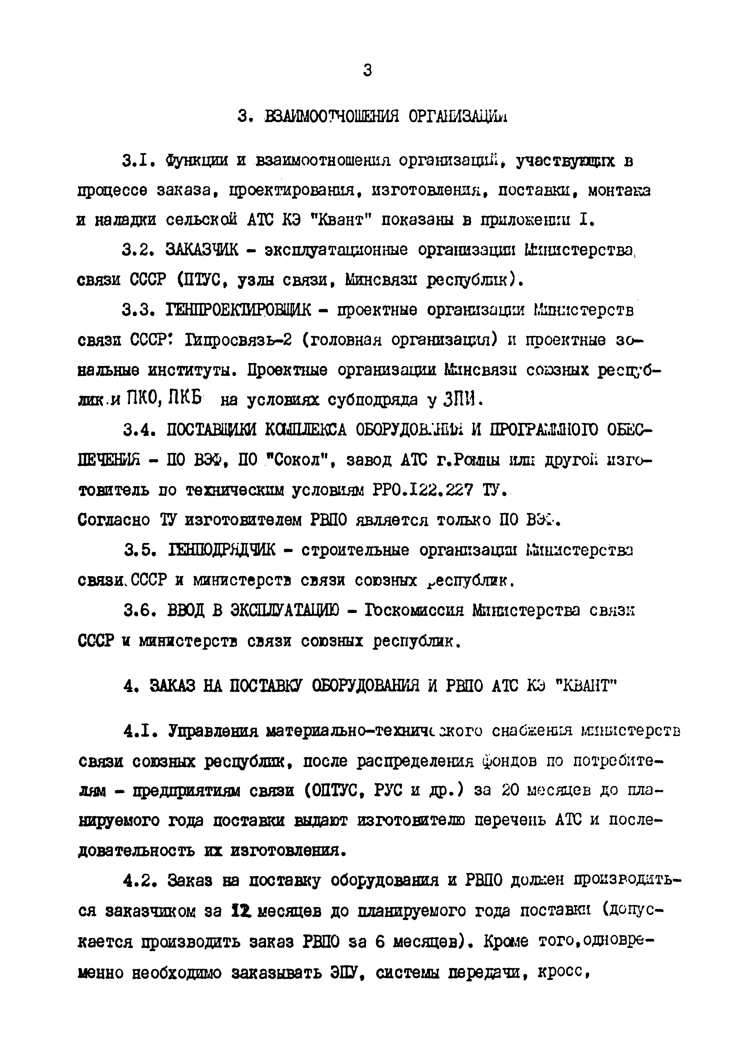 Временное положение о порядке заказа, проектирования, поставки, строительства и ввода в эксплуатацию сельских АТС КЭ "Квант"| Статус: | действует | | Название рус.: | Временное положение о порядке заказа, проектирования, поставки, строительства и ввода в эксплуатацию сельских АТС КЭ "Квант" | | Дата добавления в базу: | 05.05.2017 | | Дата актуализации: | 01.01.2021 | | Дата введения: | 31.12.1992 | | Область применения: | Положение определяет функции и взаимоотношения организаций (предприятий) в процессе заказа, проектирования, поставки, строительство и ввода в эксплуатацию сельской АТС КЭ "Квант". | | Оглавление: | 1. Общие положения 2. Нормативные документы 3. Взаимоотношения организации 4. Заказ на поставку оборудования и РВПО АТС КЭ "Квант" 5. Проектирование 6. Поставка оборудования и РВПО АТС КЭ "Квант" 7. Строительство Приложение | | Утверждён: | 29.03.1990 Заместитель Министра связи СССР