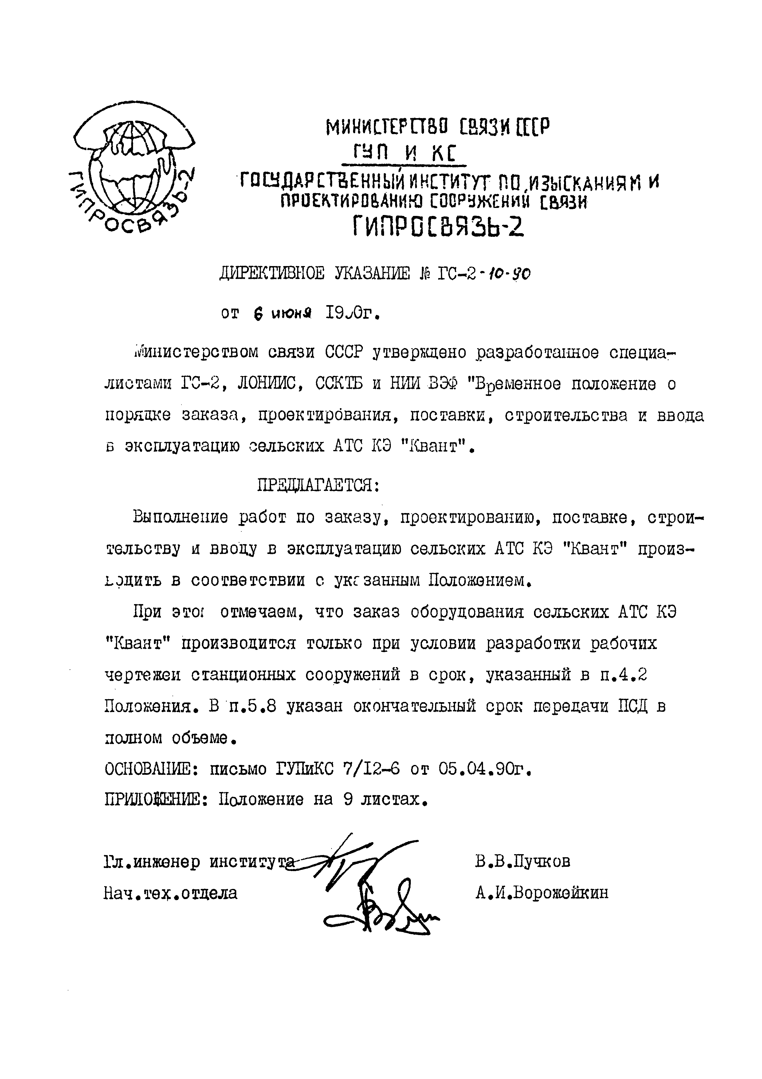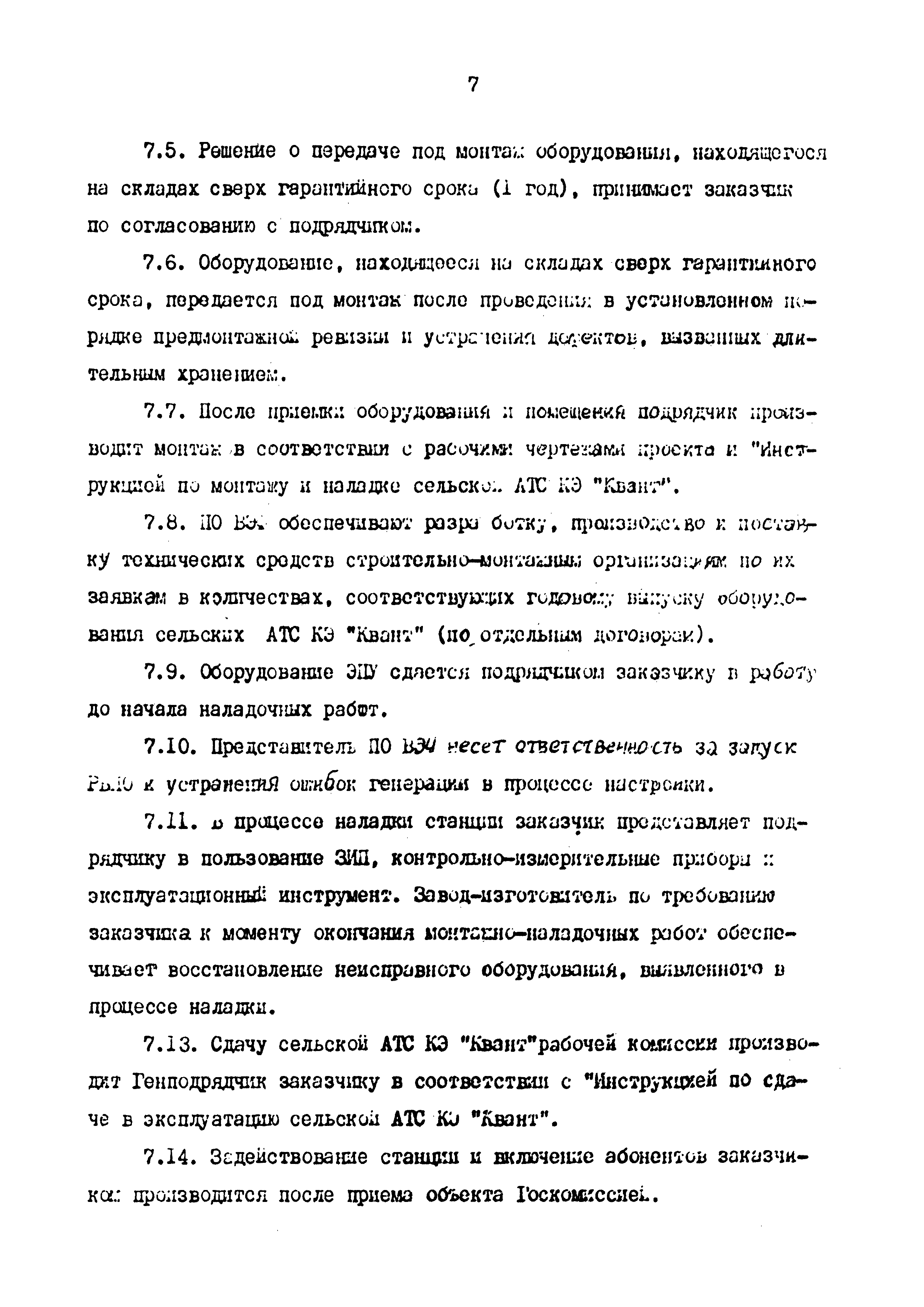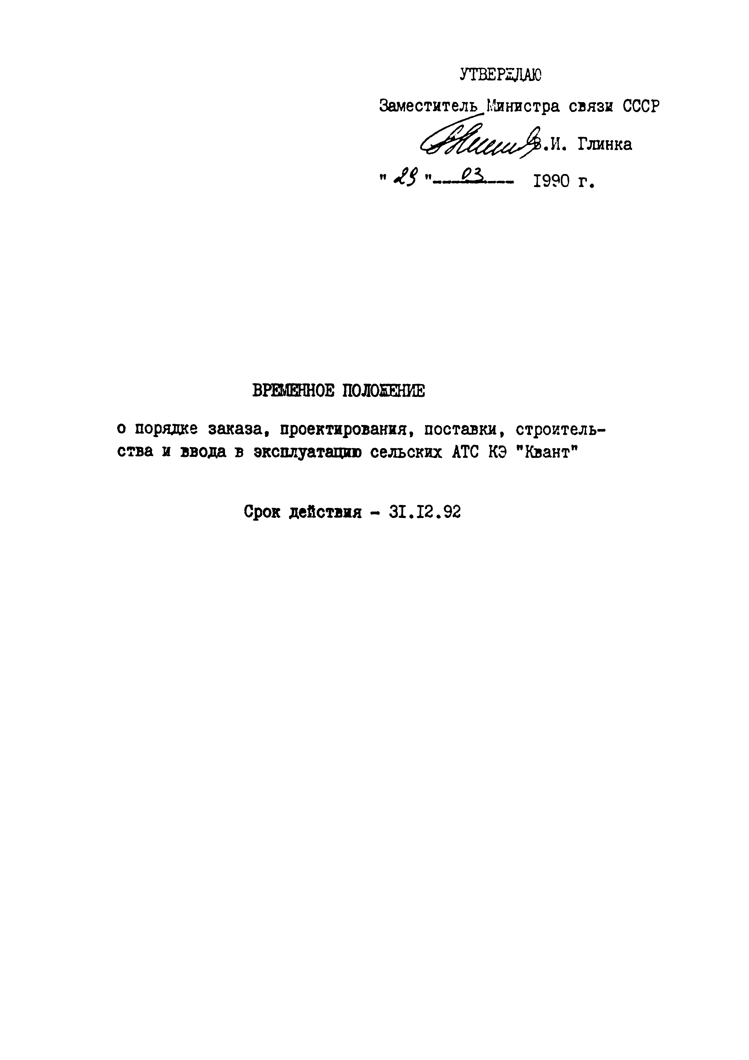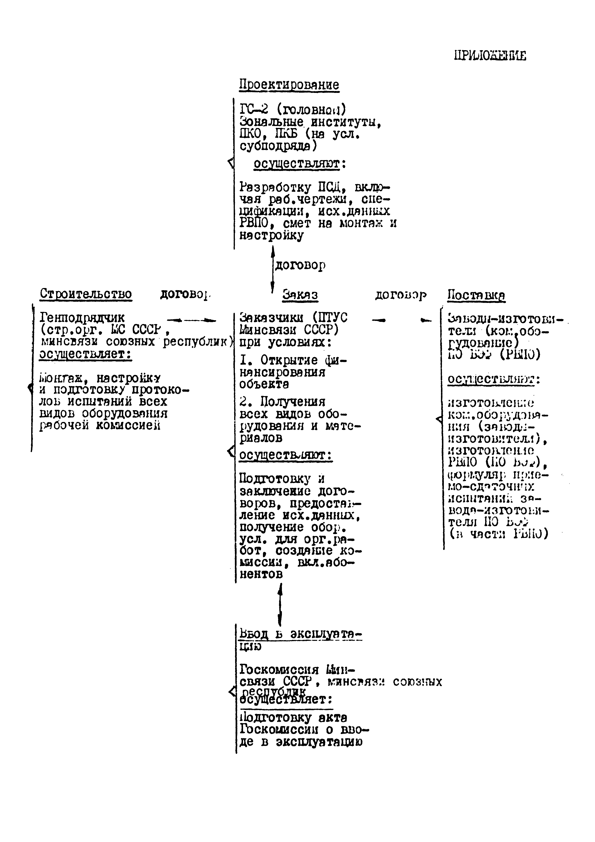 Временное положение о порядке заказа, проектирования, поставки, строительства и ввода в эксплуатацию сельских АТС КЭ "Квант"| Статус: | действует | | Название рус.: | Временное положение о порядке заказа, проектирования, поставки, строительства и ввода в эксплуатацию сельских АТС КЭ "Квант" | | Дата добавления в базу: | 05.05.2017 | | Дата актуализации: | 01.01.2021 | | Дата введения: | 31.12.1992 | | Область применения: | Положение определяет функции и взаимоотношения организаций (предприятий) в процессе заказа, проектирования, поставки, строительство и ввода в эксплуатацию сельской АТС КЭ "Квант". | | Оглавление: | 1. Общие положения 2. Нормативные документы 3. Взаимоотношения организации 4. Заказ на поставку оборудования и РВПО АТС КЭ "Квант" 5. Проектирование 6. Поставка оборудования и РВПО АТС КЭ "Квант" 7. Строительство Приложение | | Утверждён: | 29.03.1990 Заместитель Министра связи СССР