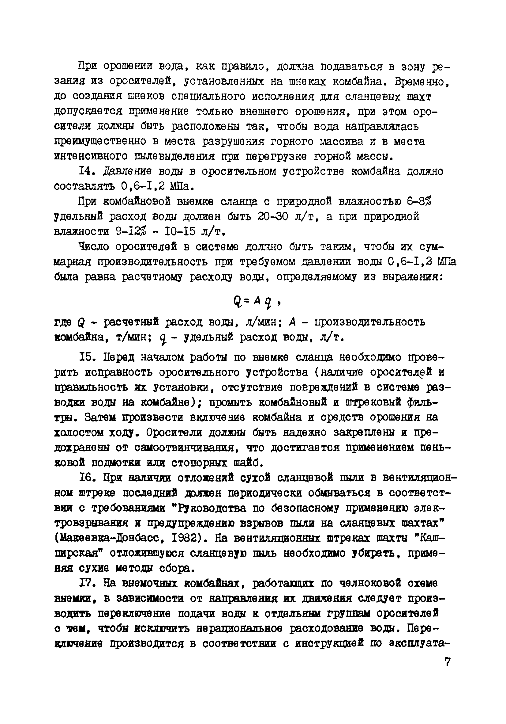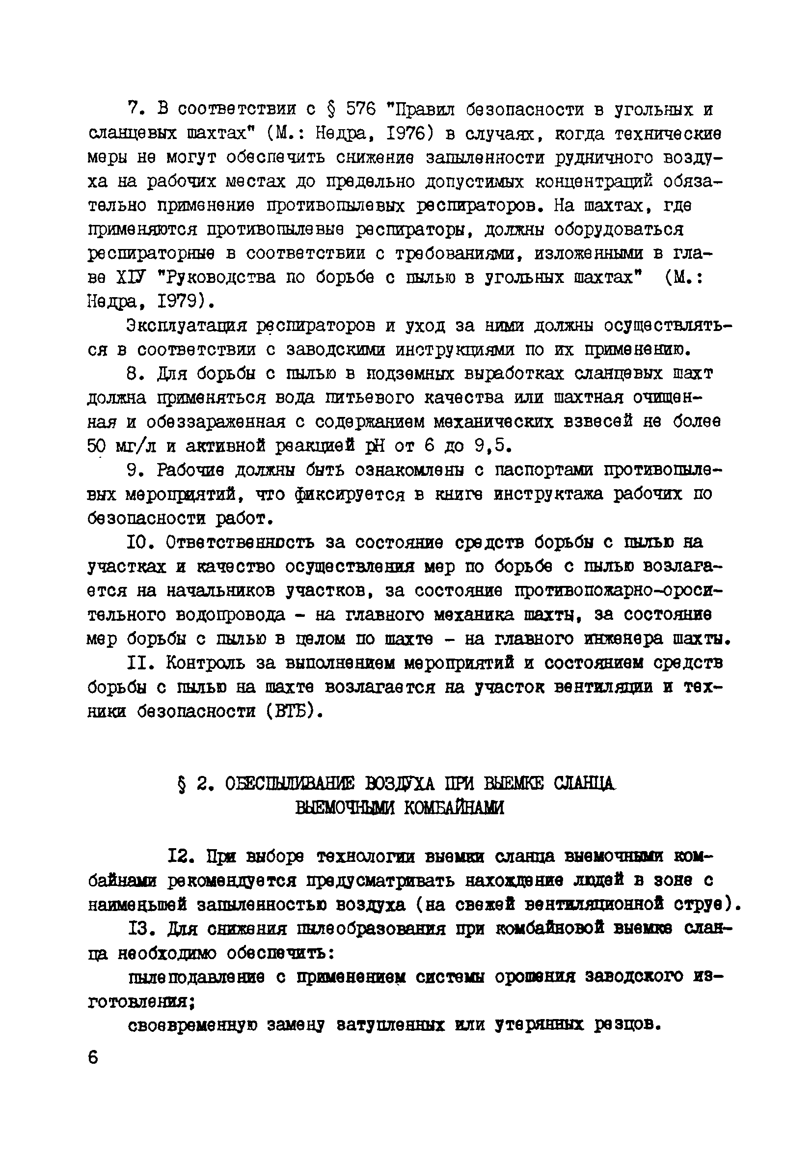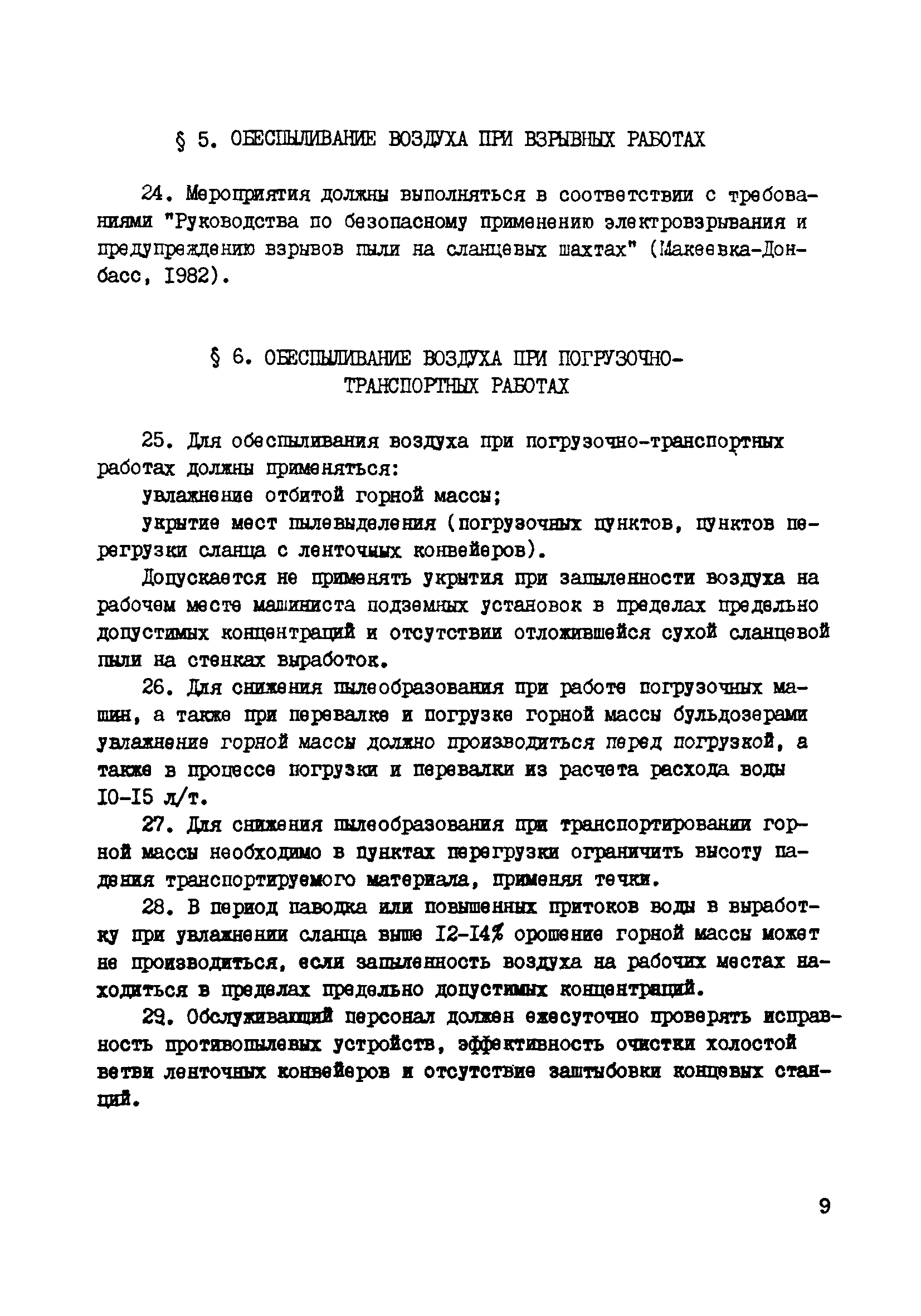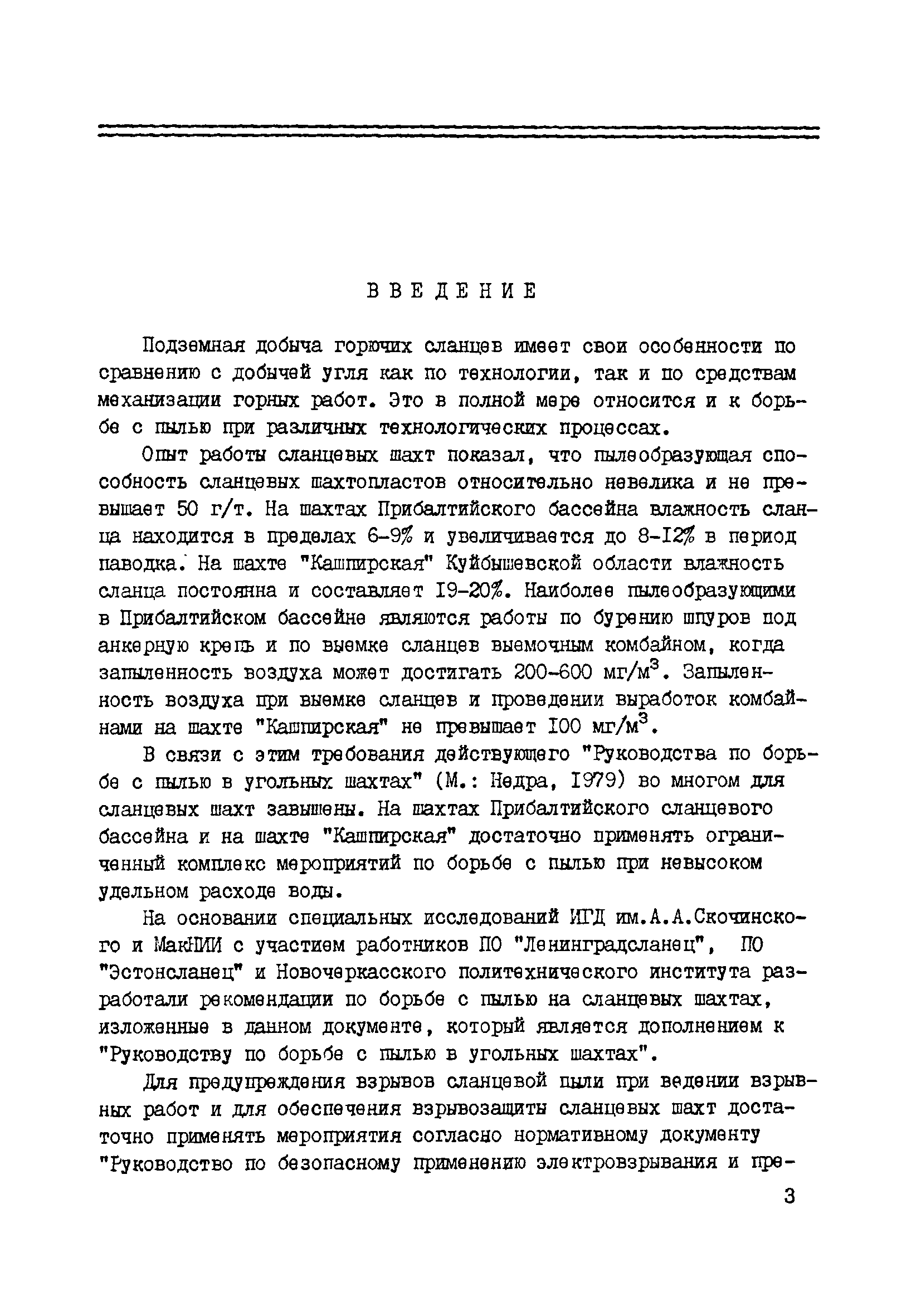 | Оглавление: | Введение 1. Общие положения 2. Обеспыливание воздуха при выемке сланца выемочными комбайнами 3. Обеспыливание воздуха при подрубке пласта врубовой машиной 4. Обеспыливание воздуха при бурении шпуров 5. Обеспыливание воздуха при взрывных работах 6. Обеспыливание воздуха при погрузочно-транспортных работах 7. Пылевой контроль |