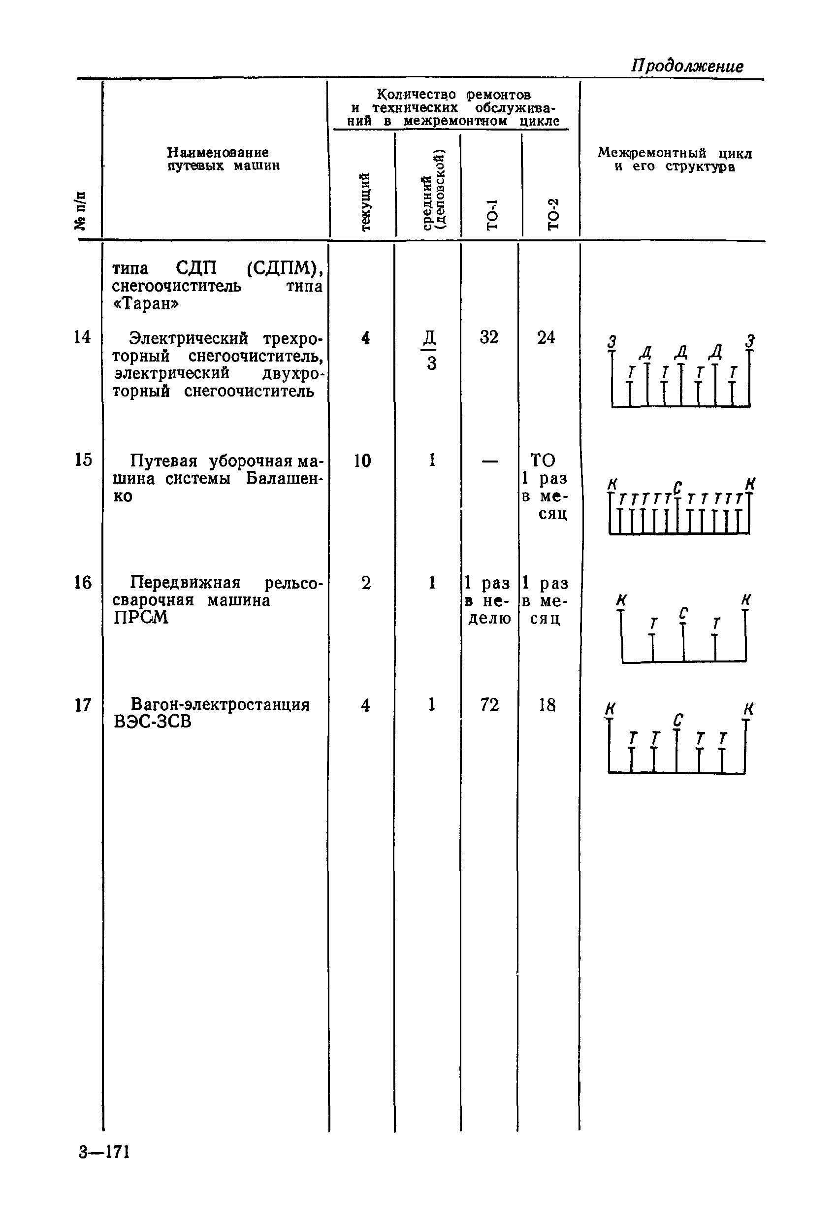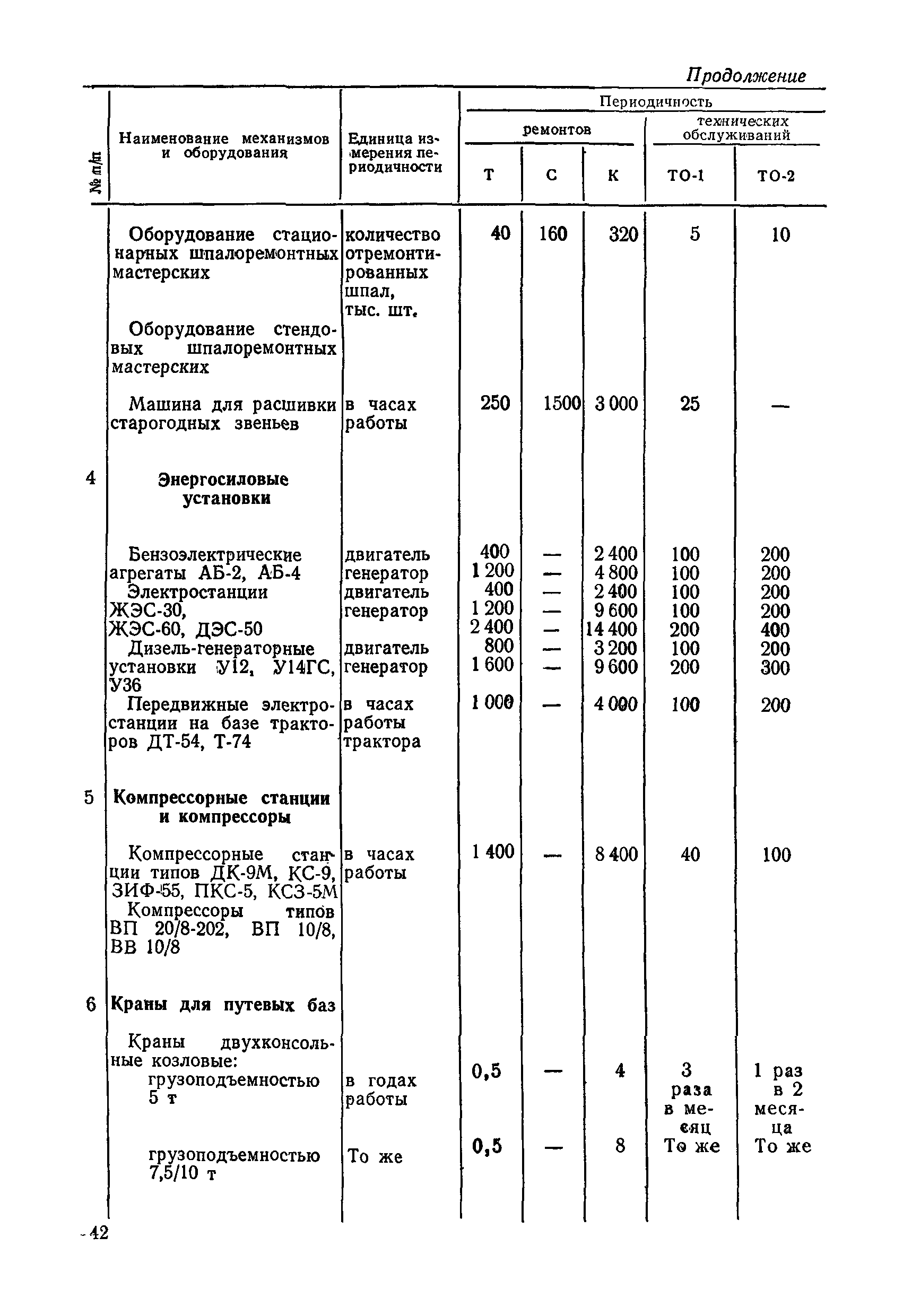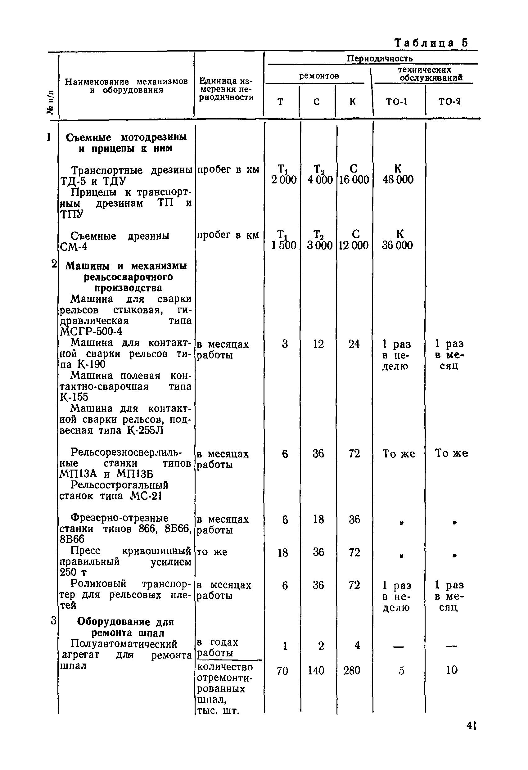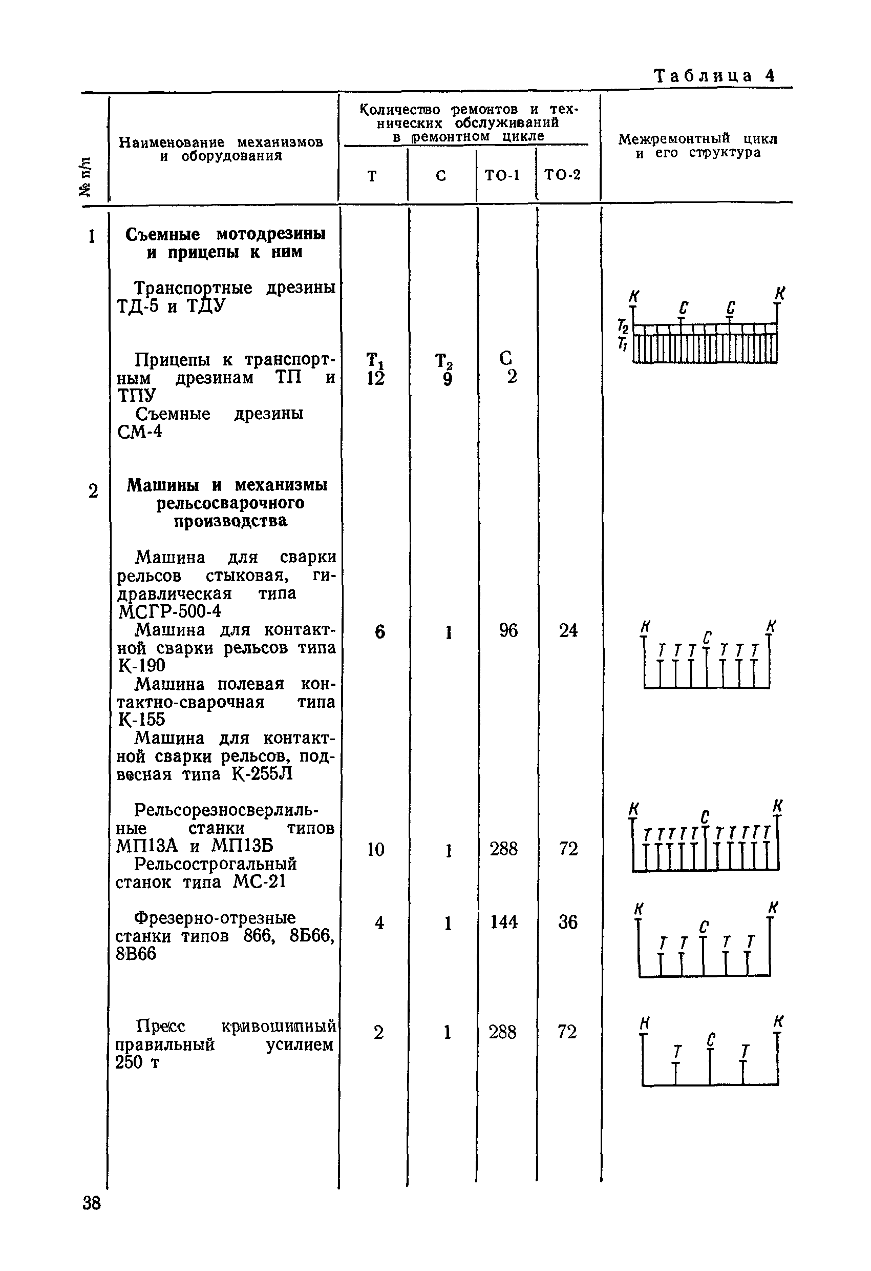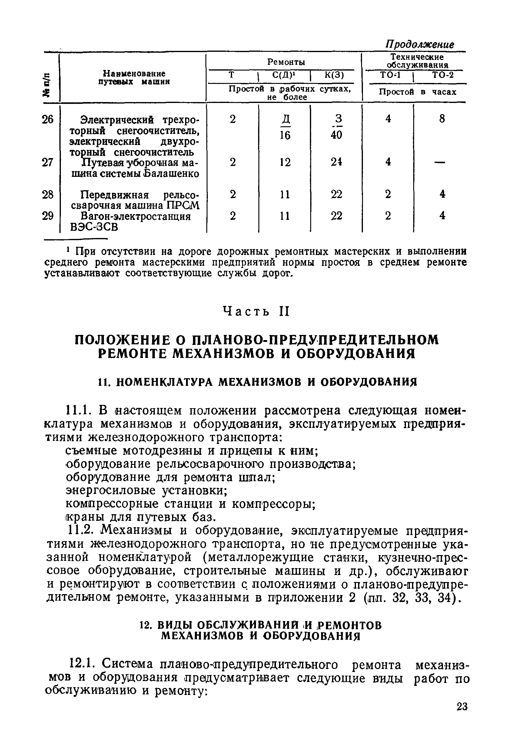 Положение устанавливает принципиальные основы технического обслуживания и ремонта путевых машин, механизмов и оборудования, направленные на улучшение показателей их использования. | | Оглавление: | 1. Общие положения 2. Основная техническая документация на путевые машины, механизмы и оборудование 3. Планирование ремонта путевых машин, механизмов и оборудования 4. Сдача путевых машин, механизмов, оборудования в ремонт и получение их из ремонта 5. Материалы, запасные части и изделия для ремонта 6. Модернизация путевых машин, механизмов и оборудования Часть I. Положение о планово-предупредительном ремонте путевых машин 7. Виды обслуживаний и ремонтов путевых машин Состав работ по техническому обслуживанию путевых машин Состав работ по ремонту путевых машин 8. Контроль-технический осмотр 9. Порядок хранения и консервации путевых машин 10. Межремонтные циклы путевых машин Часть II. Положение о планово-предупредительном ремонте механизмов и оборудования 11. Номенклатура механизмов и оборудования 12. Виды обслуживаний и ремонтов механизмов и оборудования 13. Состав работ по техническому обслуживанию (осмотру) и ремонту механизмов и оборудования 13.1. Съемные мотодрезины и прицепы к ним 13.2. Оборудование рельсосварочного производства 13.3. Оборудование для ремонта шпал 13.4. Энергосиловые установки 13.5. Компрессорные станции и компрессоры 13.6. Краны для путевых баз 14. Межремонтные циклы механизмов и оборудования Приложение 1. Перечень действующих правил ремонта путевых машин, механизмов и оборудования Приложение 2. Перечень технической документации, требования которой при ремонте и техническом обслуживании обязательны Приложение 3. Формы документации | | Разработан: | Министерство путей сообщения СССР