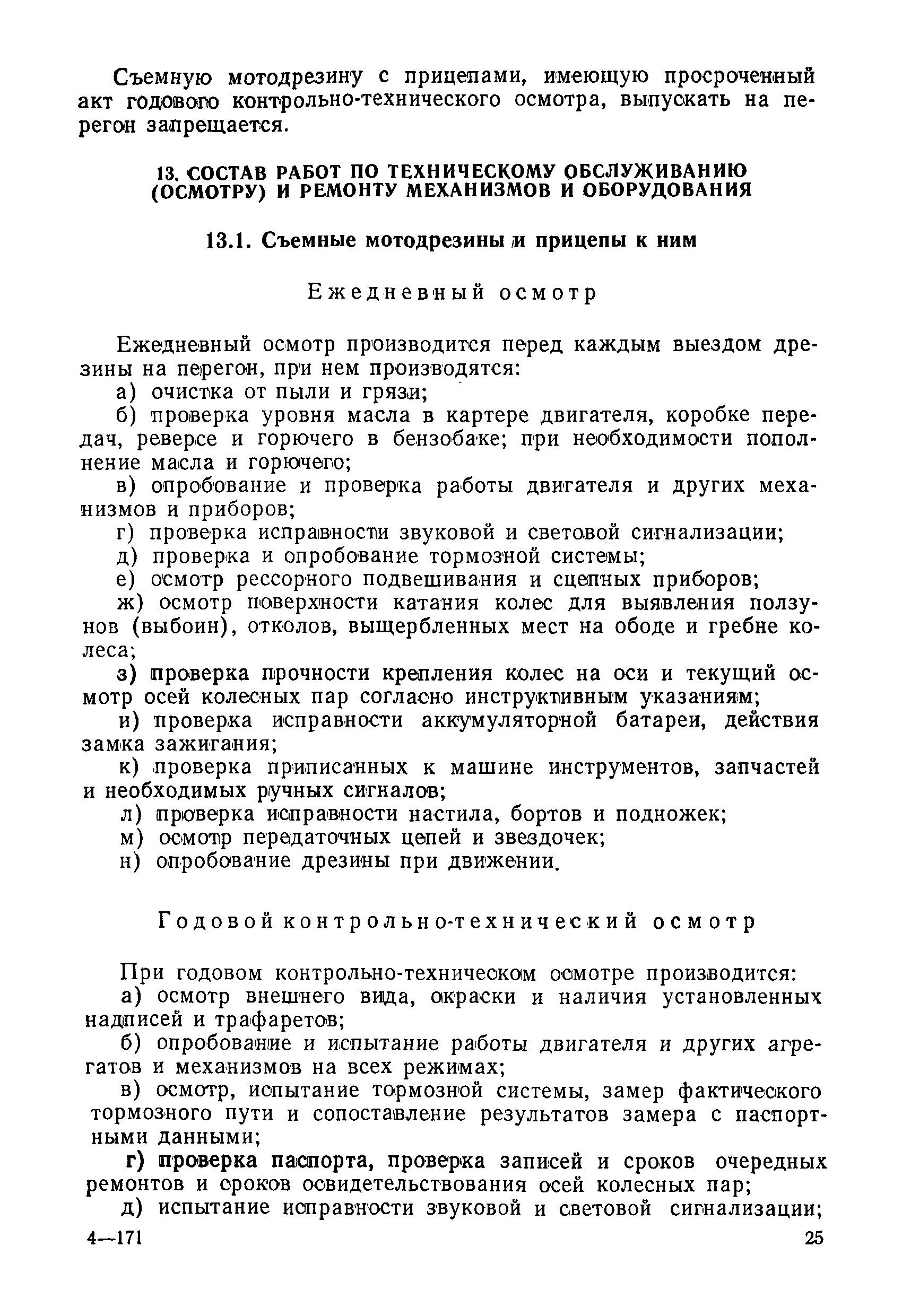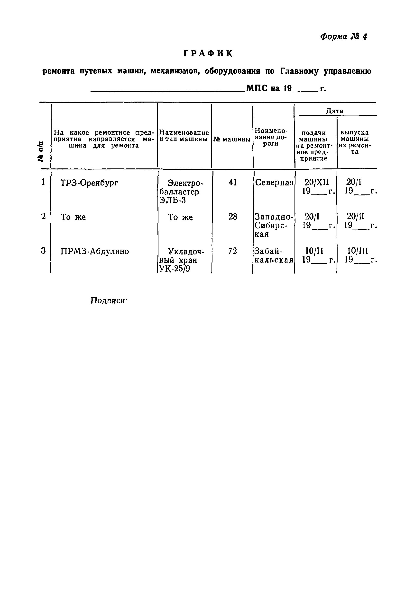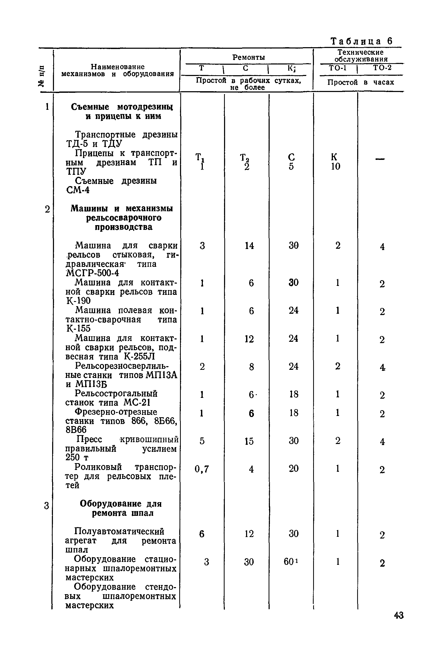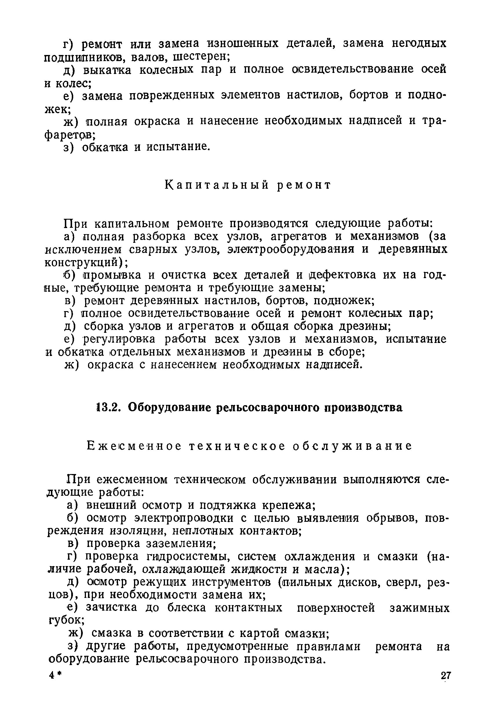Положение устанавливает принципиальные основы технического обслуживания и ремонта путевых машин, механизмов и оборудования, направленные на улучшение показателей их использования. | | Оглавление: | 1. Общие положения 2. Основная техническая документация на путевые машины, механизмы и оборудование 3. Планирование ремонта путевых машин, механизмов и оборудования 4. Сдача путевых машин, механизмов, оборудования в ремонт и получение их из ремонта 5. Материалы, запасные части и изделия для ремонта 6. Модернизация путевых машин, механизмов и оборудования Часть I. Положение о планово-предупредительном ремонте путевых машин 7. Виды обслуживаний и ремонтов путевых машин Состав работ по техническому обслуживанию путевых машин Состав работ по ремонту путевых машин 8. Контроль-технический осмотр 9. Порядок хранения и консервации путевых машин 10. Межремонтные циклы путевых машин Часть II. Положение о планово-предупредительном ремонте механизмов и оборудования 11. Номенклатура механизмов и оборудования 12. Виды обслуживаний и ремонтов механизмов и оборудования 13. Состав работ по техническому обслуживанию (осмотру) и ремонту механизмов и оборудования 13.1. Съемные мотодрезины и прицепы к ним 13.2. Оборудование рельсосварочного производства 13.3. Оборудование для ремонта шпал 13.4. Энергосиловые установки 13.5. Компрессорные станции и компрессоры 13.6. Краны для путевых баз 14. Межремонтные циклы механизмов и оборудования Приложение 1. Перечень действующих правил ремонта путевых машин, механизмов и оборудования Приложение 2. Перечень технической документации, требования которой при ремонте и техническом обслуживании обязательны Приложение 3. Формы документации | | Разработан: | Министерство путей сообщения СССР