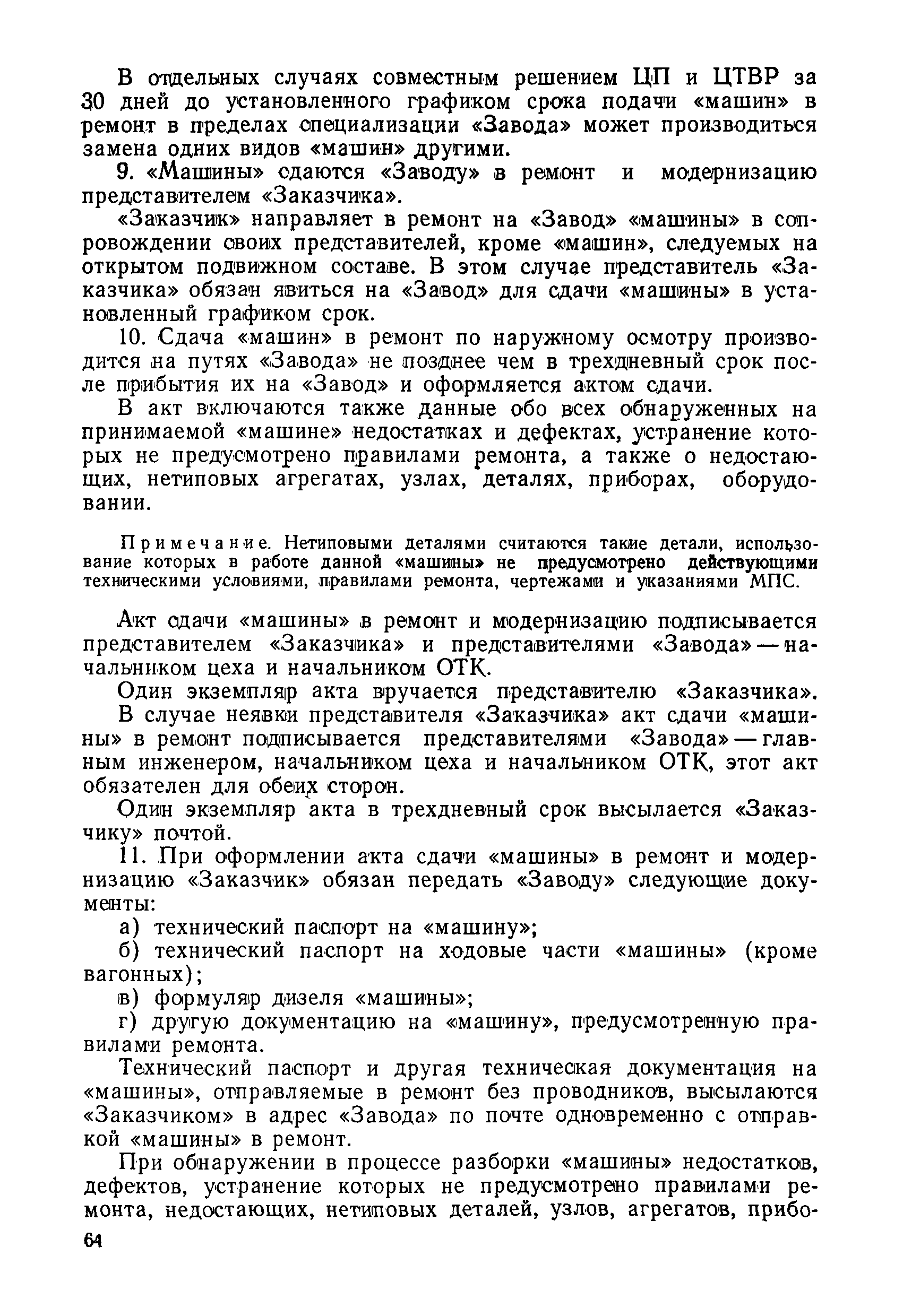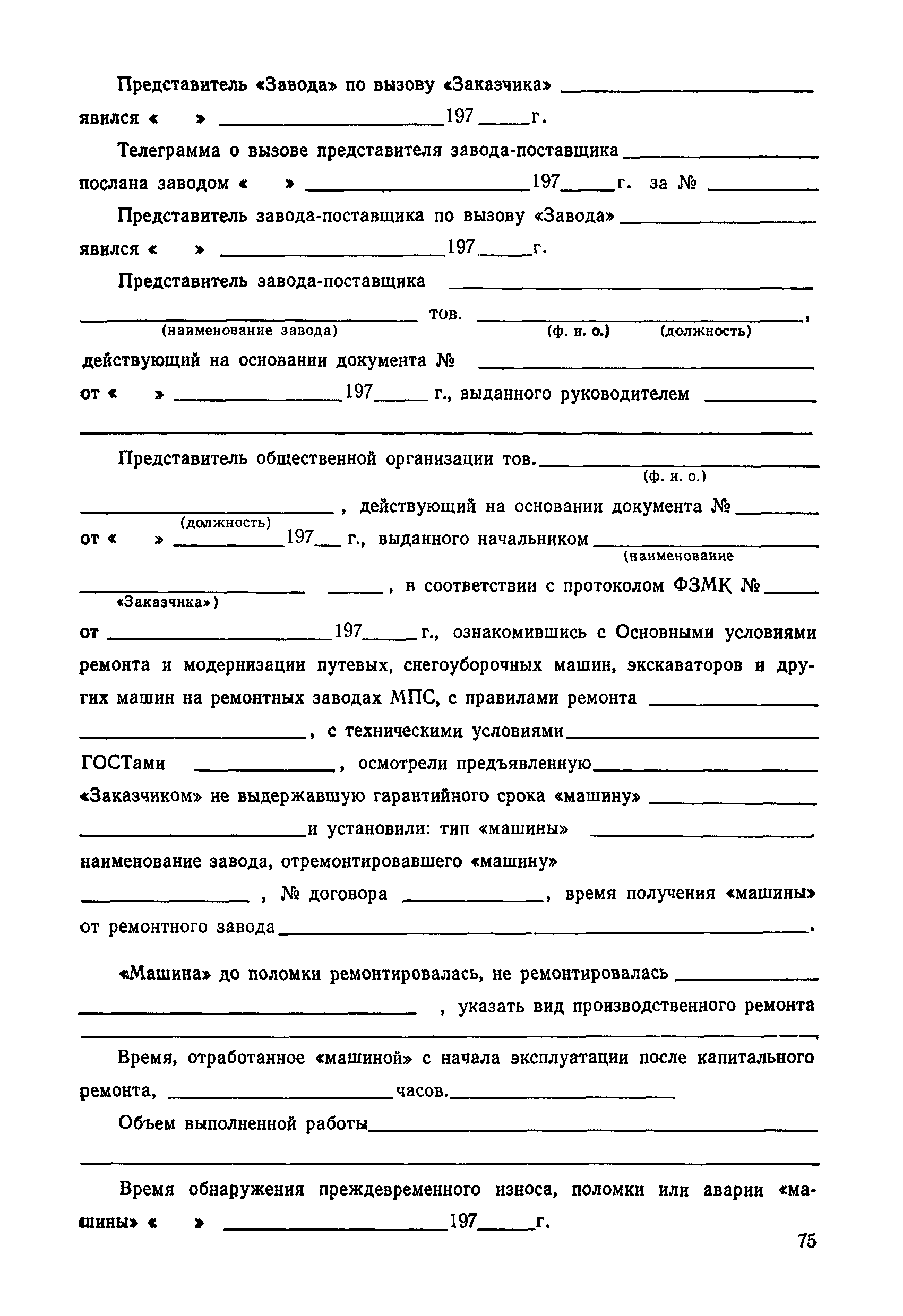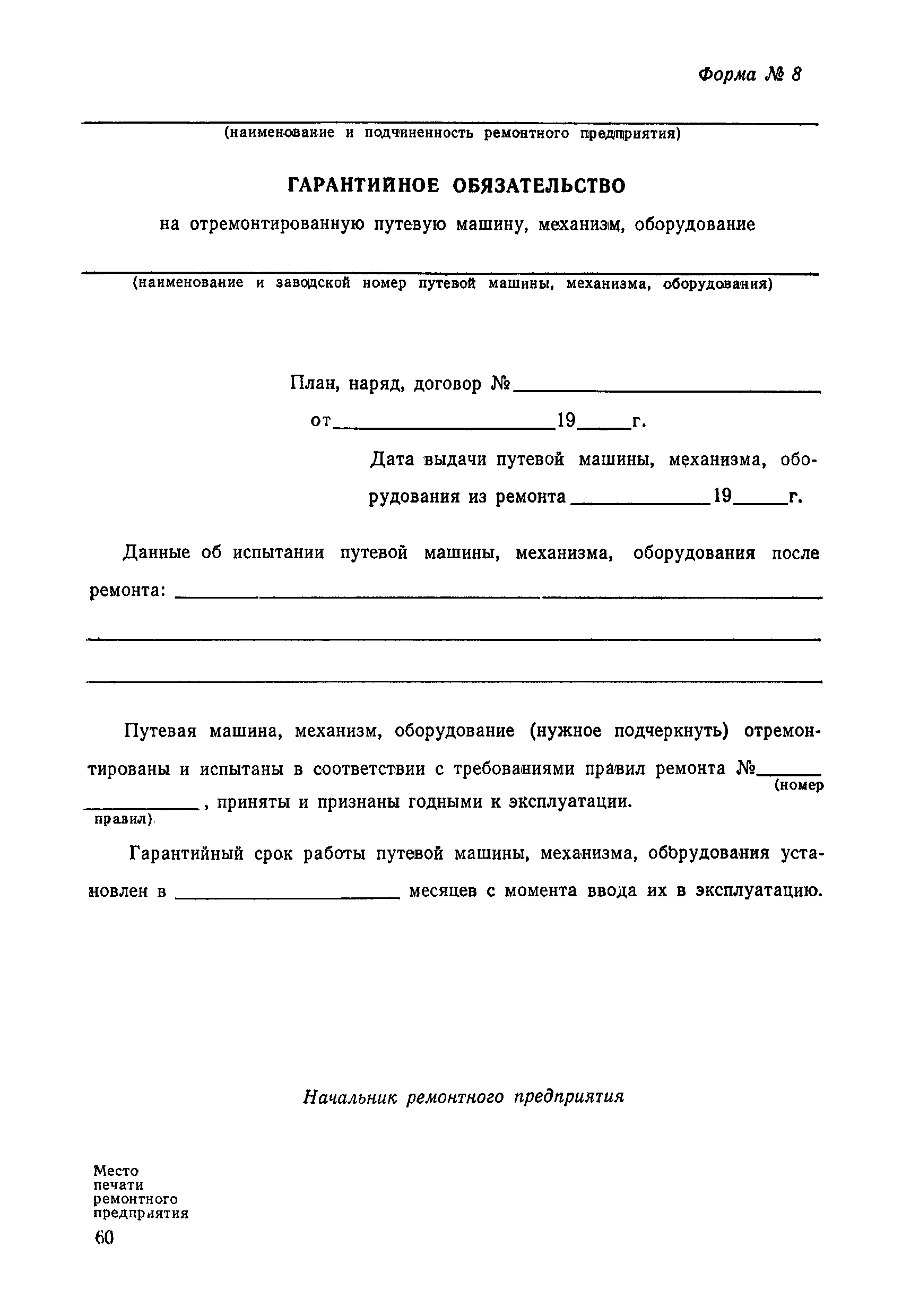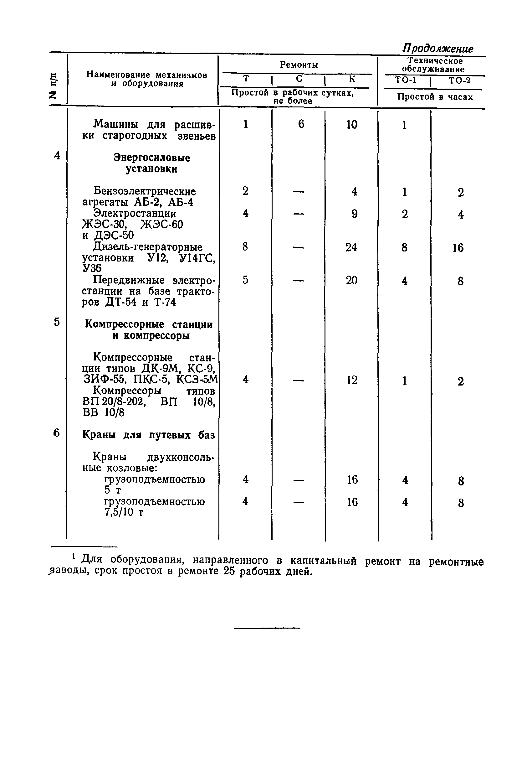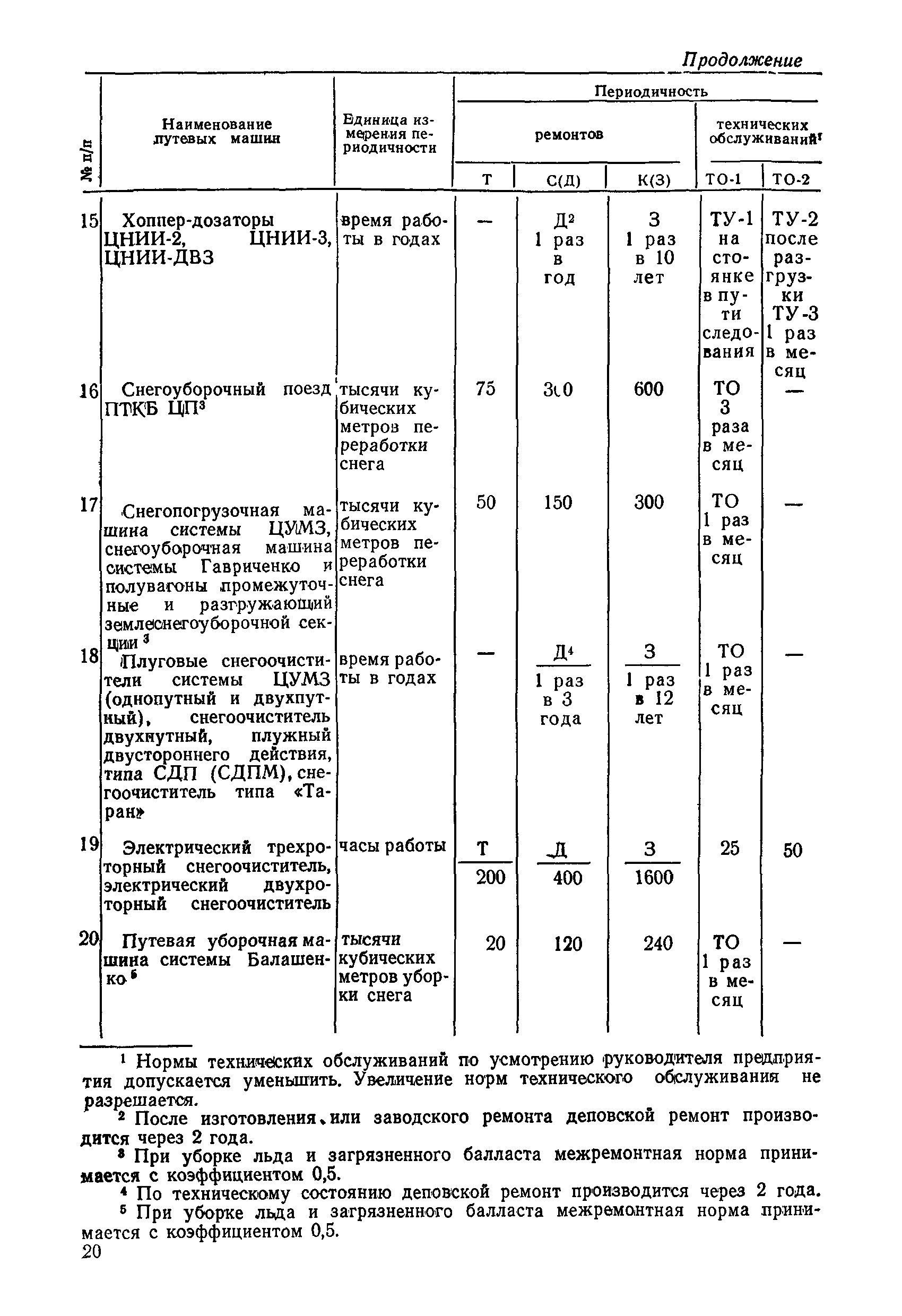 Положение устанавливает принципиальные основы технического обслуживания и ремонта путевых машин, механизмов и оборудования, направленные на улучшение показателей их использования. | | Оглавление: | 1. Общие положения 2. Основная техническая документация на путевые машины, механизмы и оборудование 3. Планирование ремонта путевых машин, механизмов и оборудования 4. Сдача путевых машин, механизмов, оборудования в ремонт и получение их из ремонта 5. Материалы, запасные части и изделия для ремонта 6. Модернизация путевых машин, механизмов и оборудования Часть I. Положение о планово-предупредительном ремонте путевых машин 7. Виды обслуживаний и ремонтов путевых машин Состав работ по техническому обслуживанию путевых машин Состав работ по ремонту путевых машин 8. Контроль-технический осмотр 9. Порядок хранения и консервации путевых машин 10. Межремонтные циклы путевых машин Часть II. Положение о планово-предупредительном ремонте механизмов и оборудования 11. Номенклатура механизмов и оборудования 12. Виды обслуживаний и ремонтов механизмов и оборудования 13. Состав работ по техническому обслуживанию (осмотру) и ремонту механизмов и оборудования 13.1. Съемные мотодрезины и прицепы к ним 13.2. Оборудование рельсосварочного производства 13.3. Оборудование для ремонта шпал 13.4. Энергосиловые установки 13.5. Компрессорные станции и компрессоры 13.6. Краны для путевых баз 14. Межремонтные циклы механизмов и оборудования Приложение 1. Перечень действующих правил ремонта путевых машин, механизмов и оборудования Приложение 2. Перечень технической документации, требования которой при ремонте и техническом обслуживании обязательны Приложение 3. Формы документации | | Разработан: | Министерство путей сообщения СССР