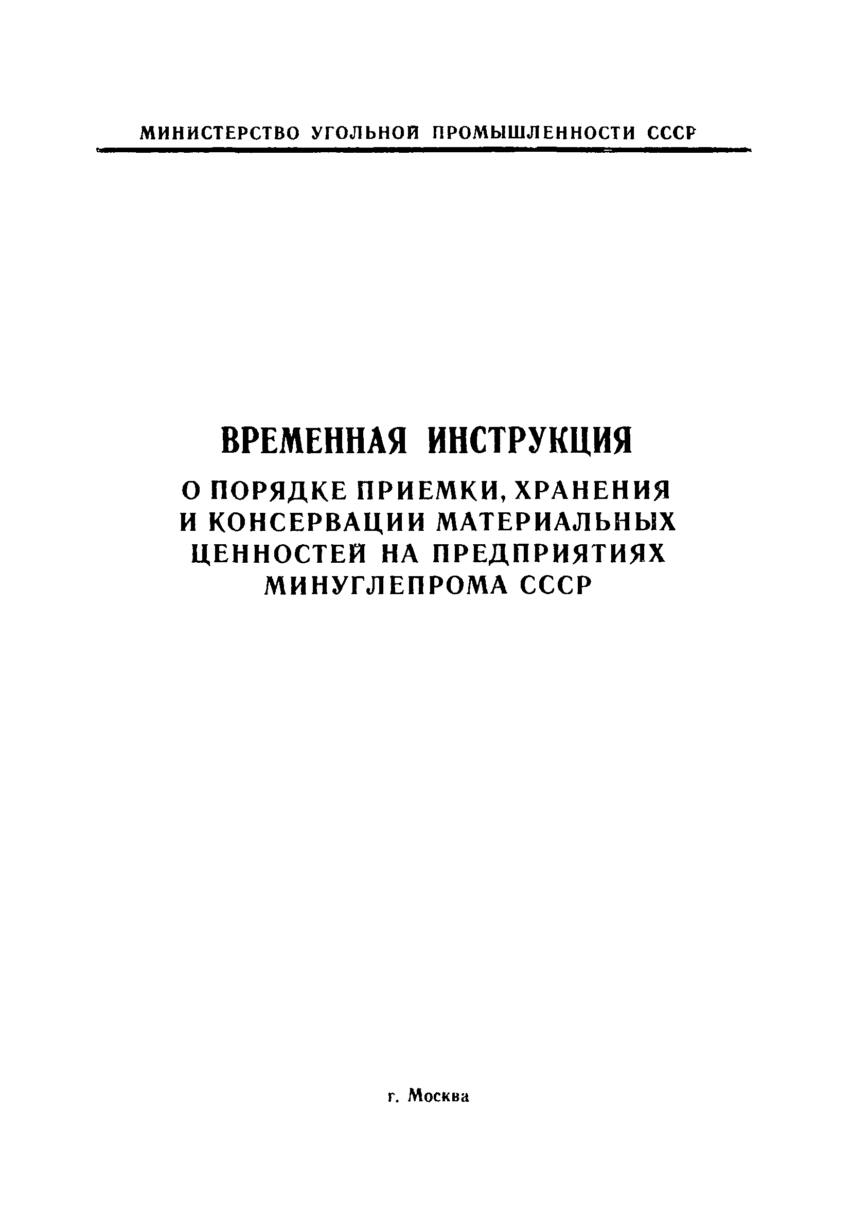 | Название рус.: | Временная инструкция о порядке приемки, хранения и консервации материальных ценностей на предприятиях Минуглепрома СССР |
