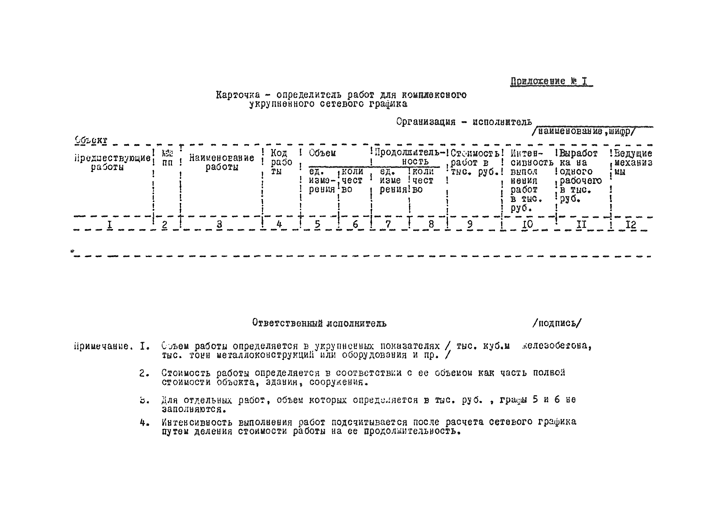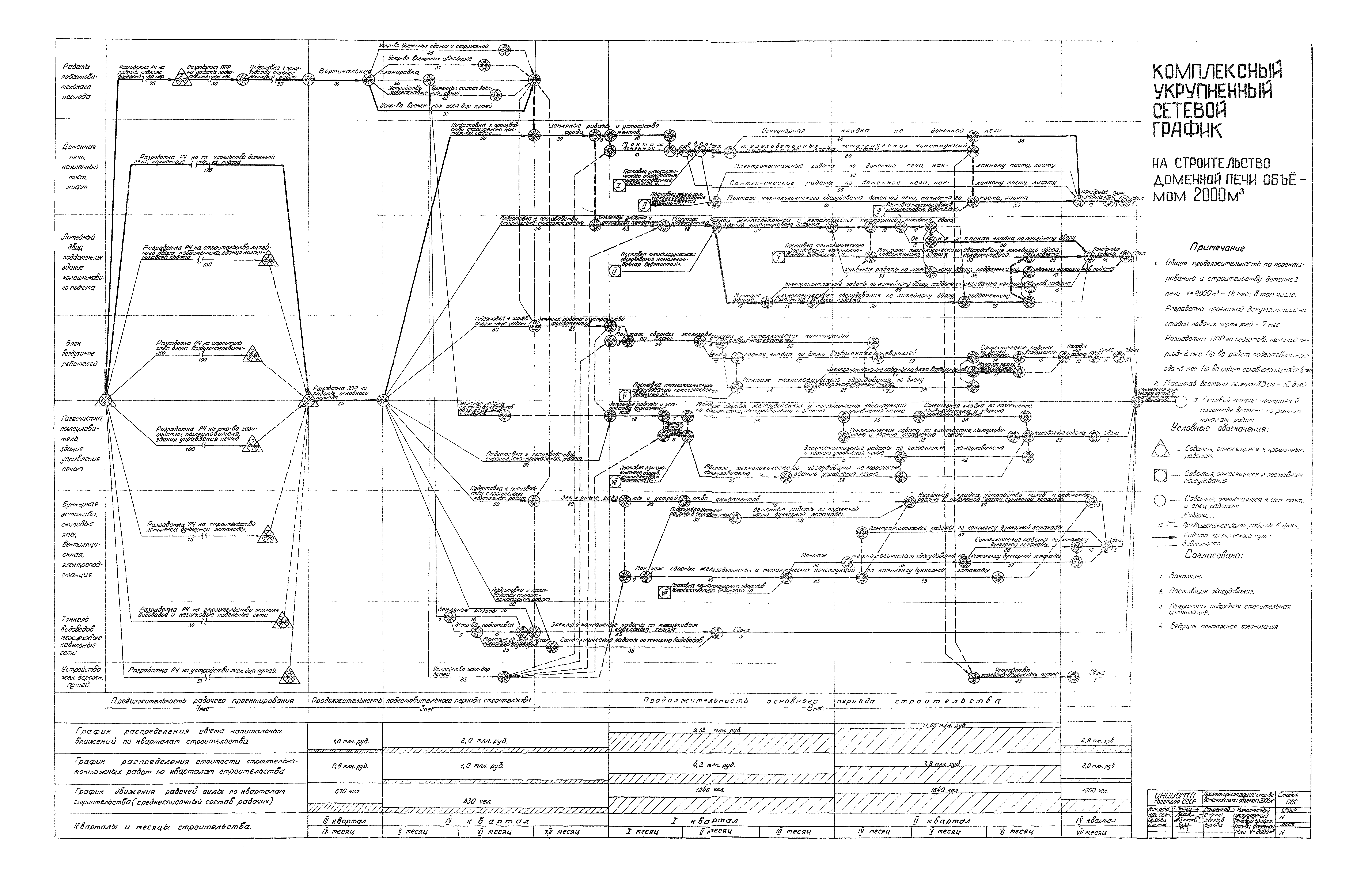 | Оглавление: | I. Общие указания II. Состав комплексного укрупненного сетевого графика III. Разработка комплексного укрупненного сетевого графика IV. Определение потребности в ресурсах по периодам строительства Приложение № 1. Карточка-определитель работ для комплексного укрупненного сетевого графика Приложение № 2. Перечень программ комплексного укрупненного сетевого графика на электронных вычислительных машинах Приложение № 3. Примерный комплексный укрупненный сетевой график на строительство доменной печи |