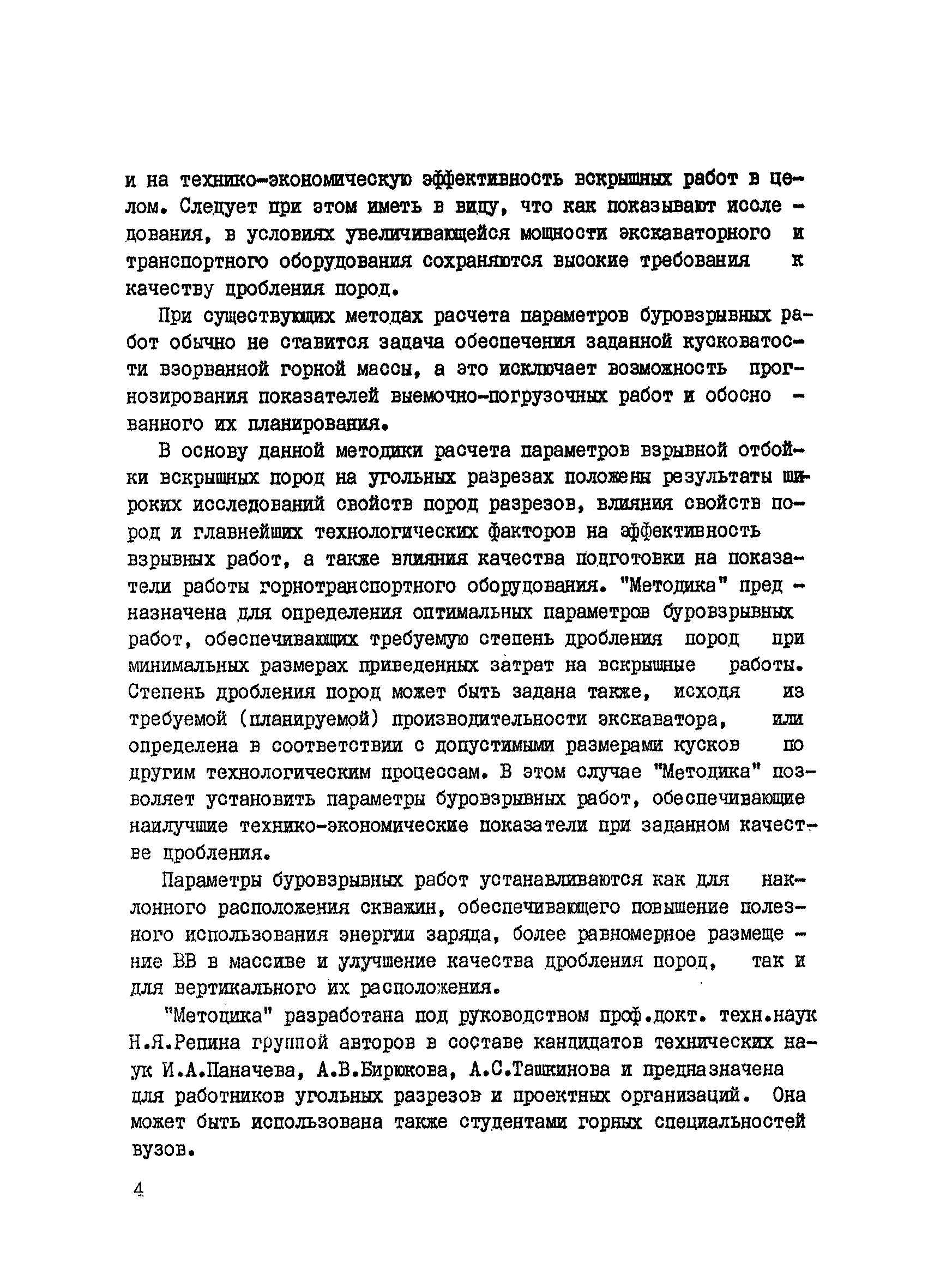 | Оглавление: | Введение I. Классификация вскрышных пород угольных разрезов II. Определение оптимальных параметров буровзрывных работ 1. Определение удельного расхода ВВ и диаметра скважин 2. Расчет параметров сетки скважин 3. Определение веса заряда в скважине 4. Выбор параметров короткозамедленного взрывания III. Определение параметров буровзрывных работ для достижения требуемой степени дробления пород 1. Определение требуемой степени дробления пород 2. Выбор рационального сочетания основных параметров экскаваторов и буровых станков 3. Определение требуемого удельного расхода ВВ IV. Особенности расчета параметров взрывной подготовки пород при бестранспортной разработке с использованием драглайнов 1. Расчет оптимальных параметров буровзрывных работ 2. Расчет параметров развала при установленных параметрах буровзрывных работ 3. Расчет параметров буровзрывных работ для обеспечения заданного качества подготовки пород Приложение 1. Начальная скорость движения кусков (м/сек) Приложение 2. Список организация и предприятий, принявших участие в обсуждении проекта "Временной методики расчета параметров взрывной отбойки пород на угольных разрезах |