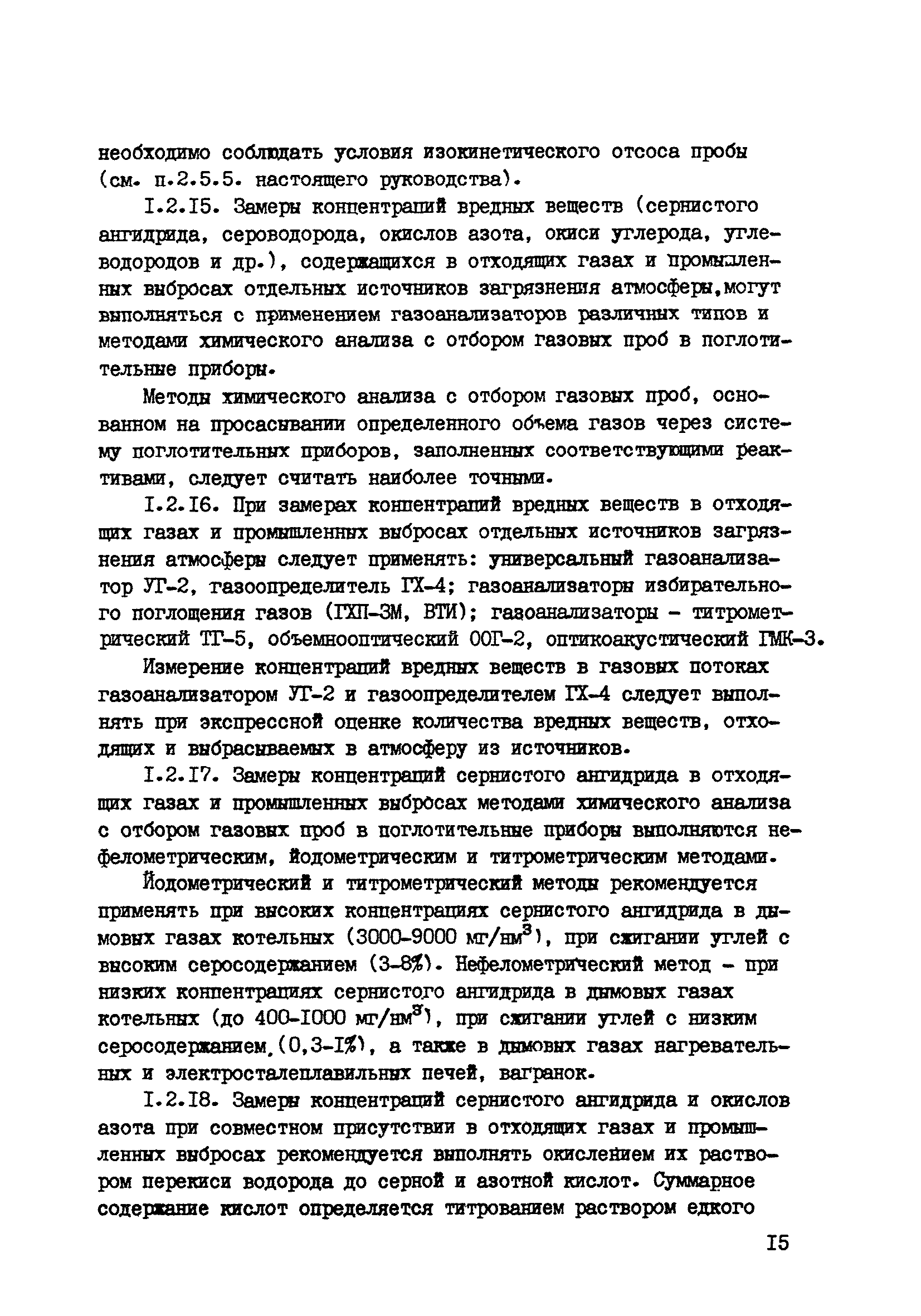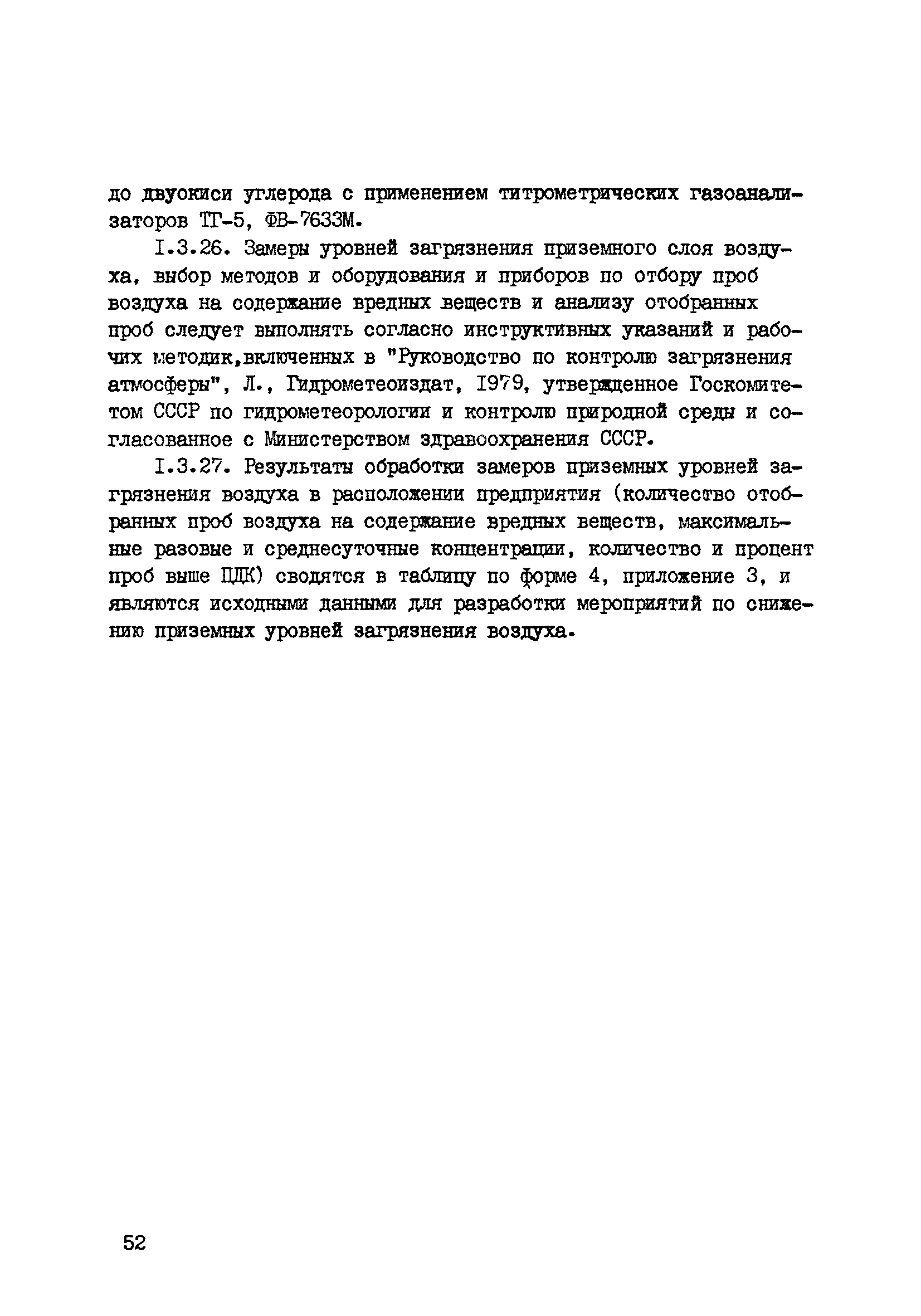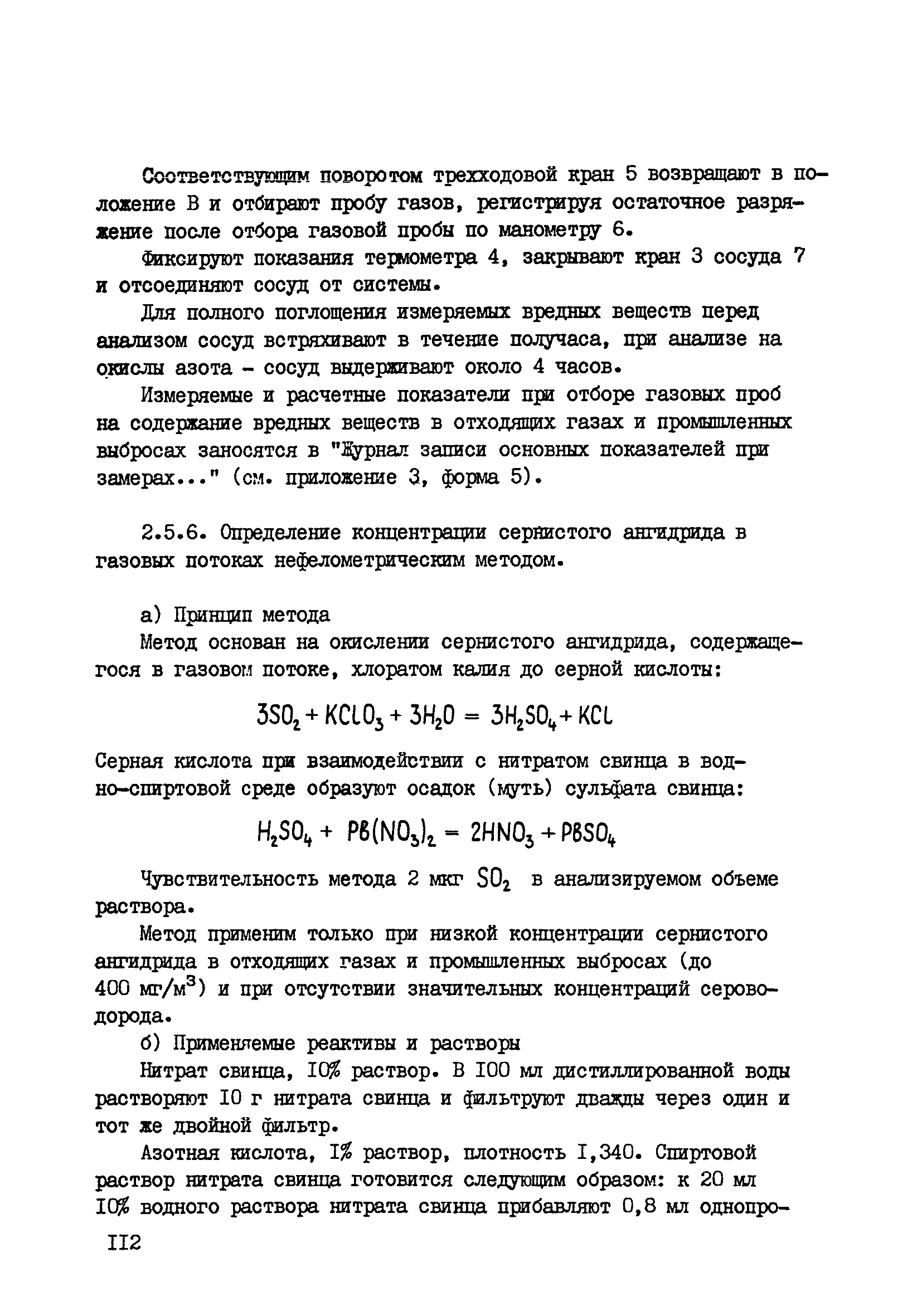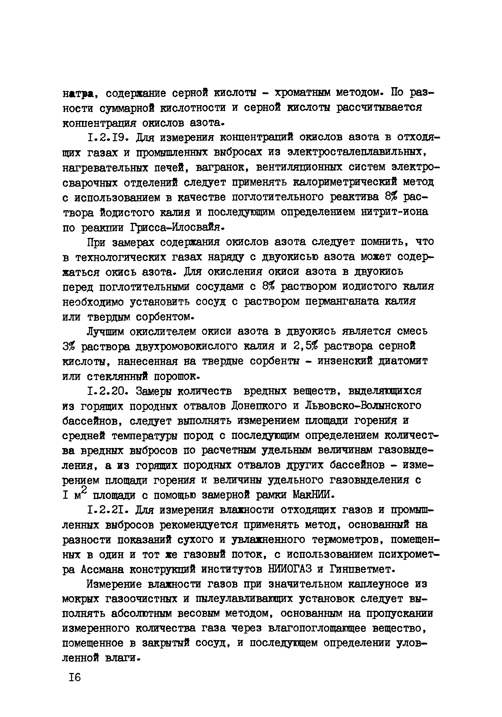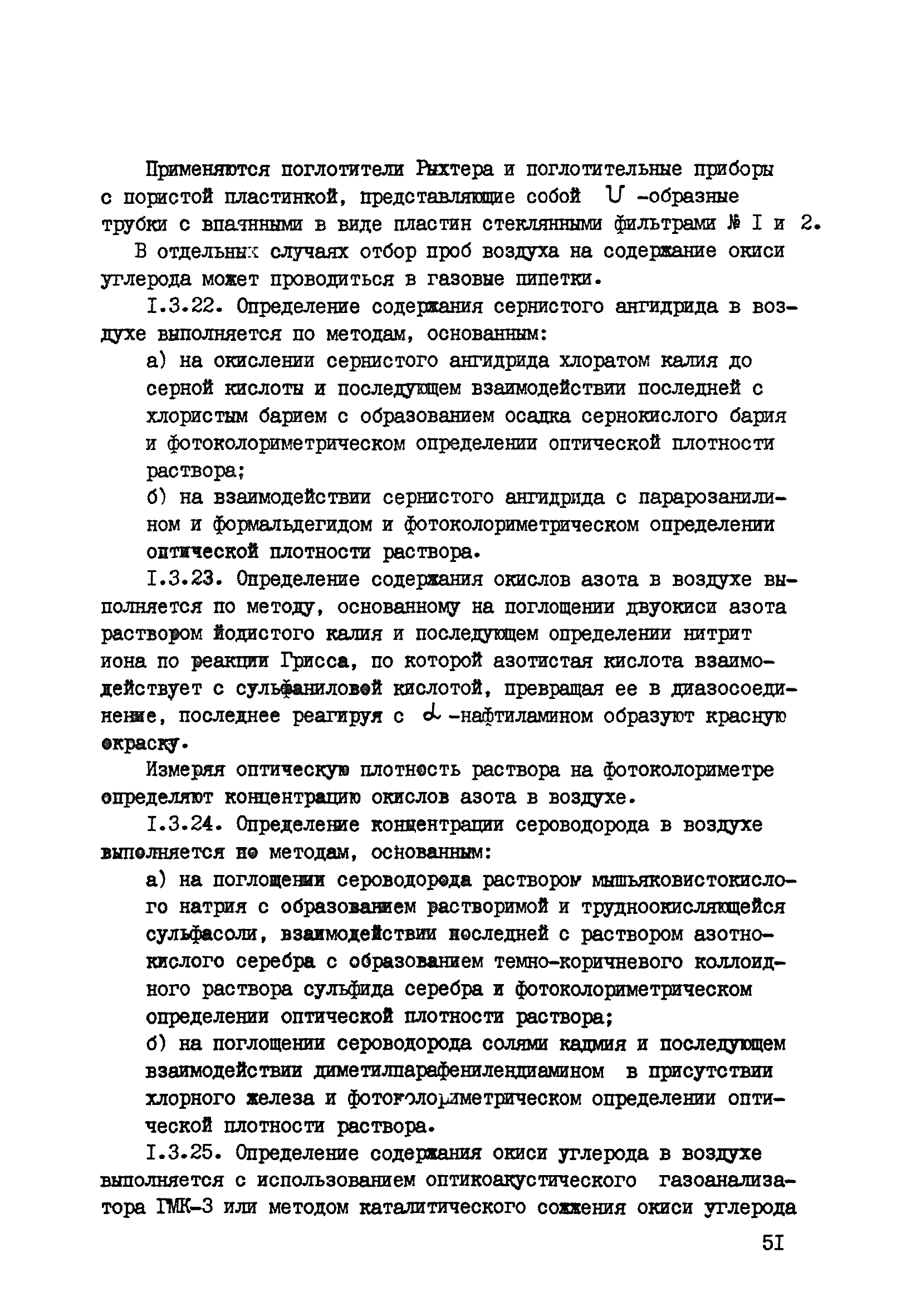 | Оглавление: | 1. Инструктивно-методические указания по выявлению источников загрязнения атмосферы, производству замеров выбросов вредных веществ и загрязнения атмосферного воздуха 1.1. Выявление источников загрязнения атмосферы, инвентаризация и контроль количества выбросов вредных веществ и качества атмосферного воздуха 1.2. Организация и производство замеров количества выбросов вредных веществ в атмосферу 1.3. Организация и производство замеров уровней загрязнения приземного слоя воздуха в зонах рассеивания промышленных выбросов 2. Методики и оборудование для производства замером вредных веществ, отходящих от источника, промышленных выбросов в атмосферу 2.1. Измерение температуры отходящих газов и промышленных выбросов 2.1.1. Измерение температуры газовых потоков техническим стеклянными термометрами 2.1.2. Измерение температуры газовых потоков термометрами сопротивления 2.1.3. Измерение температуры газовых потоков термоэлектрическими пирометрами (термопарами) 2.2. Измерение влажности отходящих газов и промышленных выбросов 2.2.1. Измерение влажности газовых потоков абсолютным весовым методом 2.2.2. Измерение влажности газовых потоков по разности температур сухого и влажного термометров 2.3. Измерение скорости газовых потоков 2.3.1. Измерение скорости незапыленных газовых потоков анемометрами 2.3.2. Измерение скорости давлений газовых потоков с применением пневмометрических трубок 2.4. Измерение запыленности газовых потоков 2.4.1. Общие положения 2.4.2. Аппаратура для измерения запыленности газов методом внешней фильтрации 2.4.3. Методика измерения запыленности газов с применением простой заборной трубки и внешней фильтрации 2.4.4. Аппаратура для измерения запыленности газов методом внутренней фильтрации 2.4.5. Методика измерения запыленности газов с применением пылезаборной трубки нулевого цикла с внутренней фильтрацией 2.5. Измерение концентраций вредных веществ в отходящих газах и промышленных выбросах 2.5.1. Общие положения 2.5.2. Измерение концентрации вредных веществ в газовых потоках газоанализаторами УГ-2 и газоопределителями ГХ-4 2.5.3. Измерение концентрации вредных веществ в газовых потоках газоанализаторами ГХП-3М и ВТИ-2 2.5.4. Измерение концентрации вредных веществ в газовых потоках газоанализаторами ТГ-5 и ФВ-7633М 2.5.5. Оборудование для отбора газовых проб из газоходов при измерении концентраций вредных веществ в газовых потоках методами химического анализа 2.5.6. Определение концентрации сернистого ангидрида (нефелометрический метод) 2.5.7. Определение концентрации сернистого ангидрида (йодометрический метод) 2.5.8. Определение концентрации окислов азота (колориметрический метод) 2.5.9. Определение концентрации сернистого ангидрида и окислов азота при их совместном присутствии (титриметрический метод) 2.6. Методика и оборудование для измерения количества вредных веществ, выделяемых горящими породными отвалами Приложения |