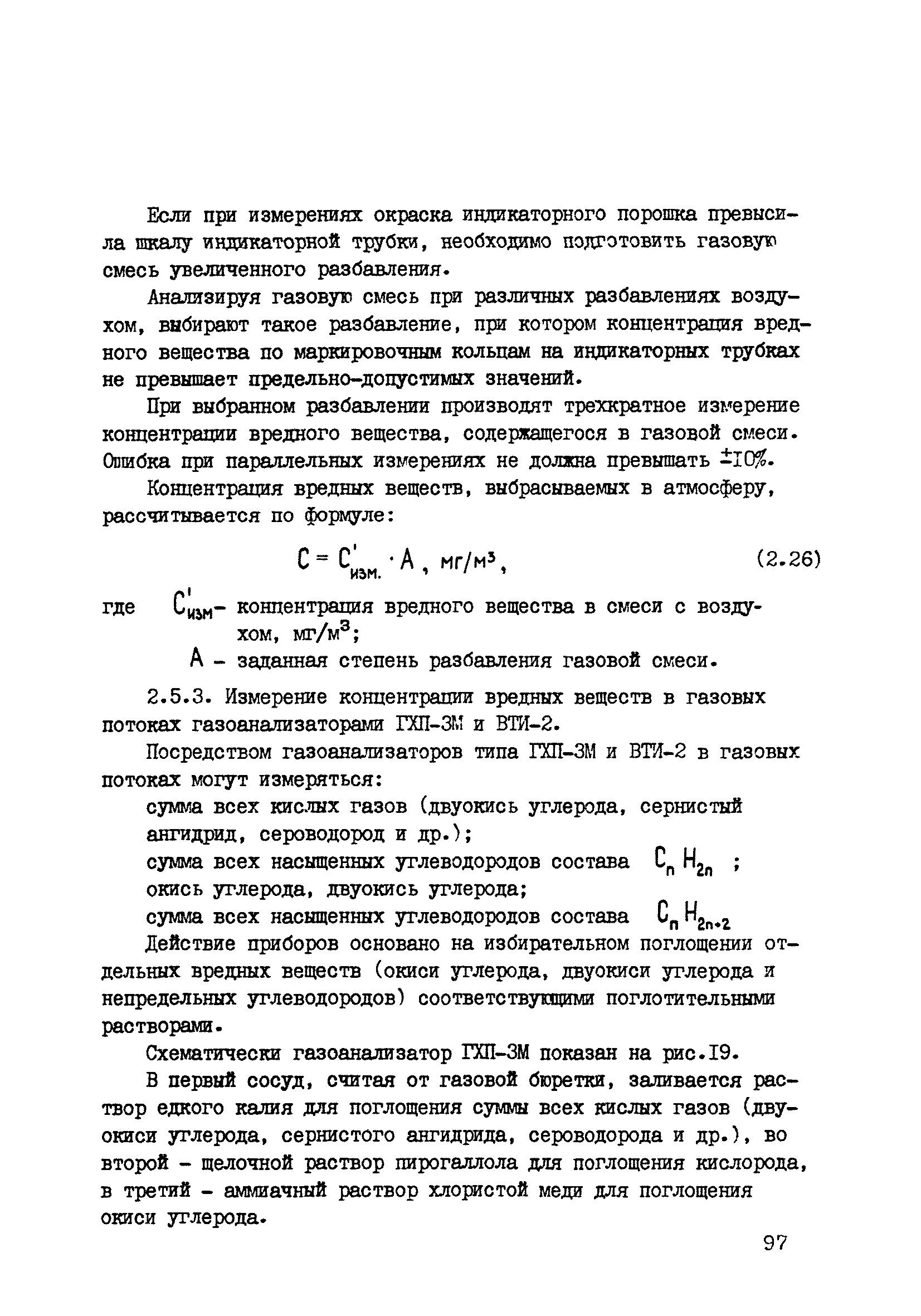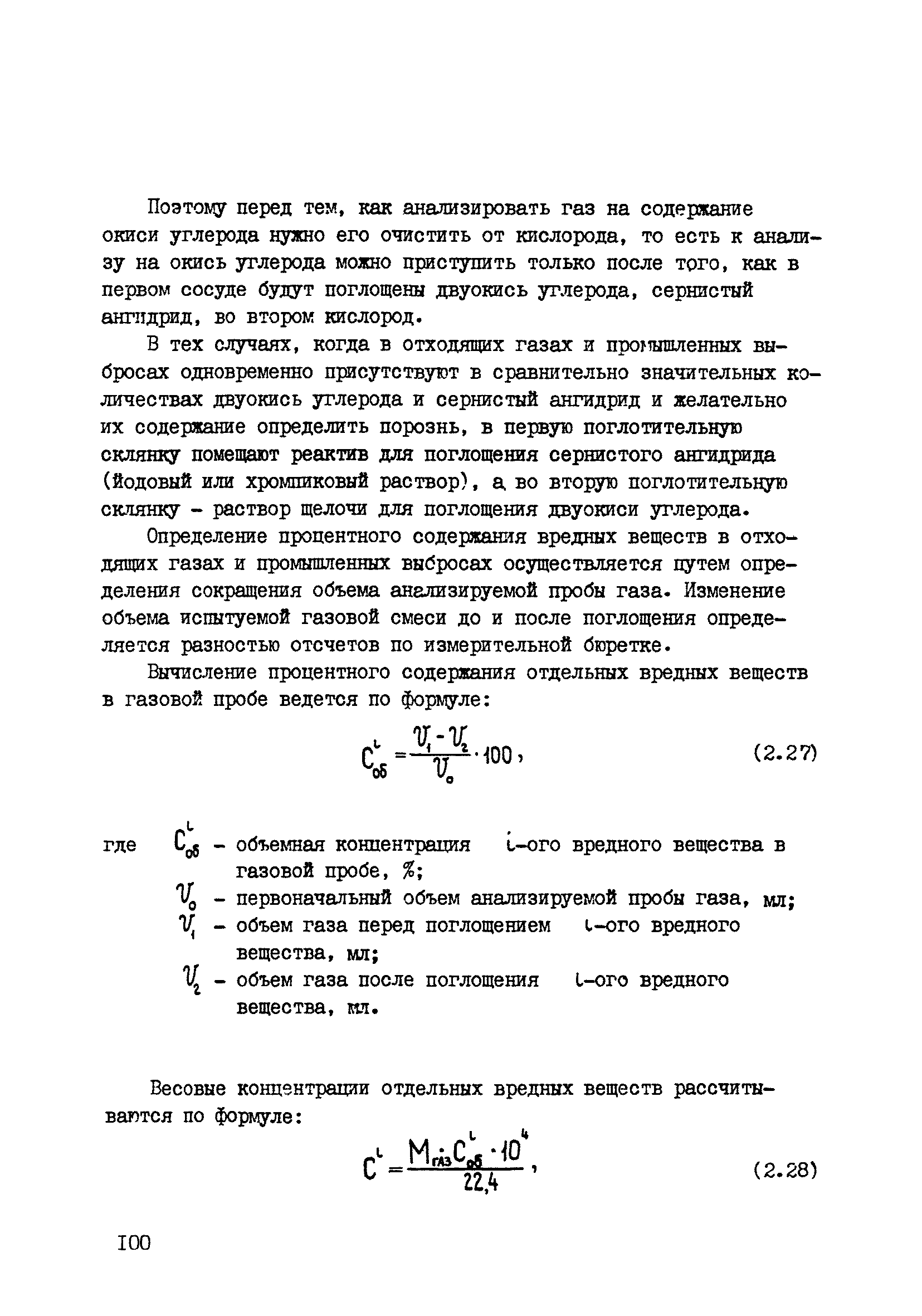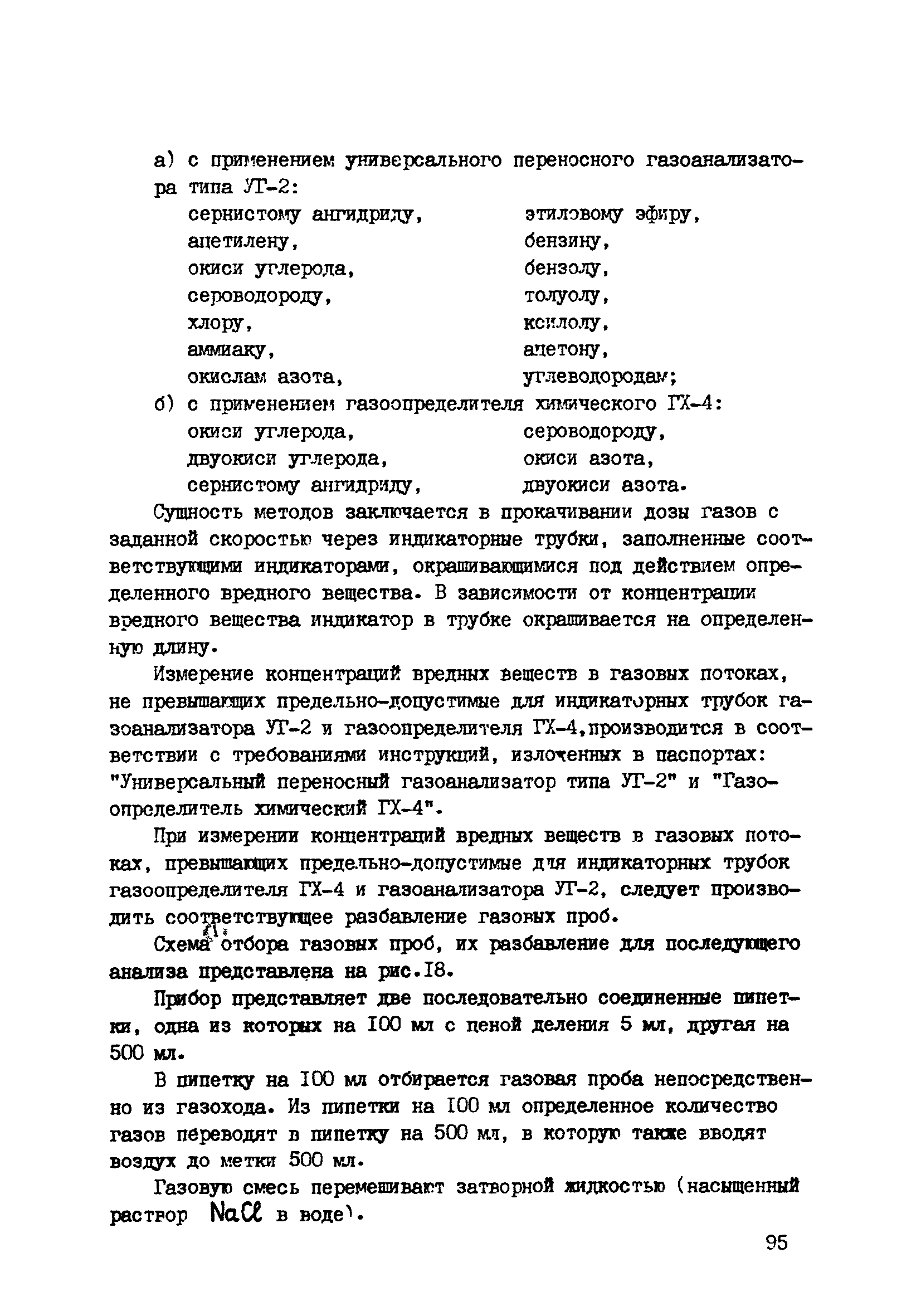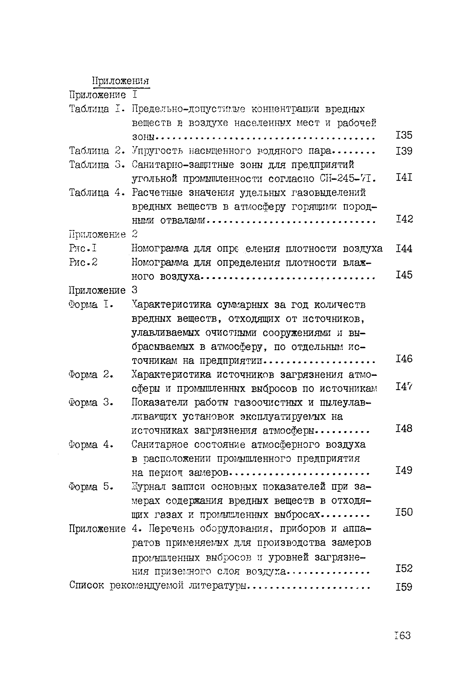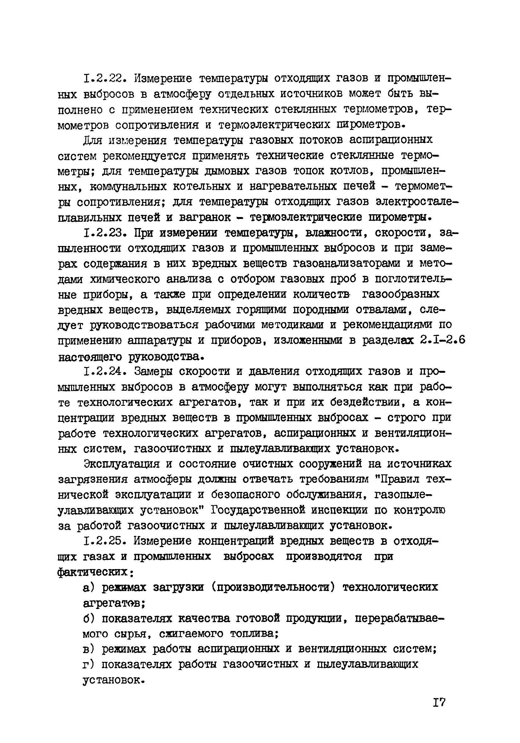 | Оглавление: | 1. Инструктивно-методические указания по выявлению источников загрязнения атмосферы, производству замеров выбросов вредных веществ и загрязнения атмосферного воздуха 1.1. Выявление источников загрязнения атмосферы, инвентаризация и контроль количества выбросов вредных веществ и качества атмосферного воздуха 1.2. Организация и производство замеров количества выбросов вредных веществ в атмосферу 1.3. Организация и производство замеров уровней загрязнения приземного слоя воздуха в зонах рассеивания промышленных выбросов 2. Методики и оборудование для производства замером вредных веществ, отходящих от источника, промышленных выбросов в атмосферу 2.1. Измерение температуры отходящих газов и промышленных выбросов 2.1.1. Измерение температуры газовых потоков техническим стеклянными термометрами 2.1.2. Измерение температуры газовых потоков термометрами сопротивления 2.1.3. Измерение температуры газовых потоков термоэлектрическими пирометрами (термопарами) 2.2. Измерение влажности отходящих газов и промышленных выбросов 2.2.1. Измерение влажности газовых потоков абсолютным весовым методом 2.2.2. Измерение влажности газовых потоков по разности температур сухого и влажного термометров 2.3. Измерение скорости газовых потоков 2.3.1. Измерение скорости незапыленных газовых потоков анемометрами 2.3.2. Измерение скорости давлений газовых потоков с применением пневмометрических трубок 2.4. Измерение запыленности газовых потоков 2.4.1. Общие положения 2.4.2. Аппаратура для измерения запыленности газов методом внешней фильтрации 2.4.3. Методика измерения запыленности газов с применением простой заборной трубки и внешней фильтрации 2.4.4. Аппаратура для измерения запыленности газов методом внутренней фильтрации 2.4.5. Методика измерения запыленности газов с применением пылезаборной трубки нулевого цикла с внутренней фильтрацией 2.5. Измерение концентраций вредных веществ в отходящих газах и промышленных выбросах 2.5.1. Общие положения 2.5.2. Измерение концентрации вредных веществ в газовых потоках газоанализаторами УГ-2 и газоопределителями ГХ-4 2.5.3. Измерение концентрации вредных веществ в газовых потоках газоанализаторами ГХП-3М и ВТИ-2 2.5.4. Измерение концентрации вредных веществ в газовых потоках газоанализаторами ТГ-5 и ФВ-7633М 2.5.5. Оборудование для отбора газовых проб из газоходов при измерении концентраций вредных веществ в газовых потоках методами химического анализа 2.5.6. Определение концентрации сернистого ангидрида (нефелометрический метод) 2.5.7. Определение концентрации сернистого ангидрида (йодометрический метод) 2.5.8. Определение концентрации окислов азота (колориметрический метод) 2.5.9. Определение концентрации сернистого ангидрида и окислов азота при их совместном присутствии (титриметрический метод) 2.6. Методика и оборудование для измерения количества вредных веществ, выделяемых горящими породными отвалами Приложения |