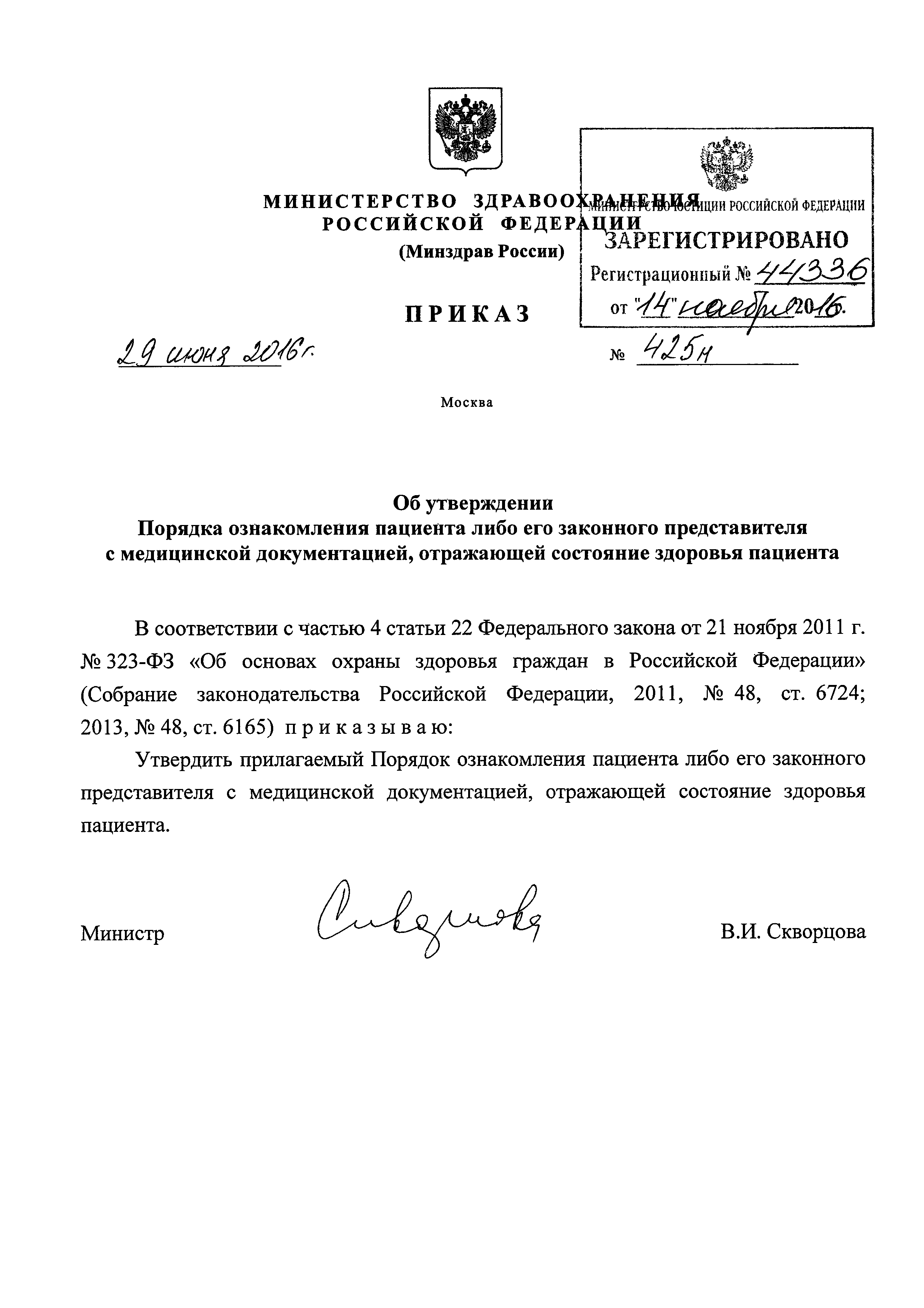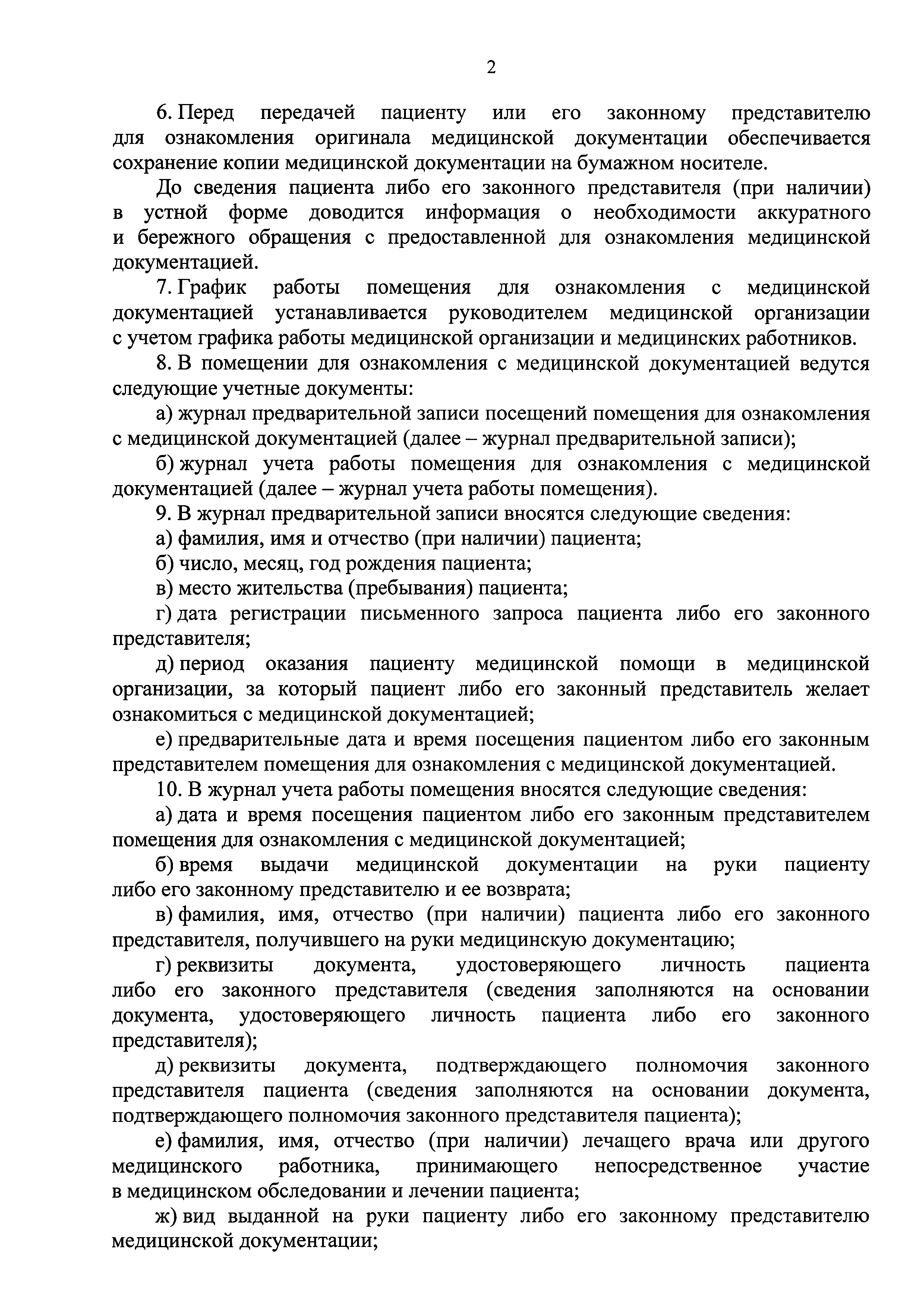Порядок ознакомления пациента либо его законного представителя с медицинской документацией, отражающей состояние здоровья пациента| Статус: | действует | | Название рус.: | Порядок ознакомления пациента либо его законного представителя с медицинской документацией, отражающей состояние здоровья пациента | | Дата добавления в базу: | 01.02.2017 | | Дата актуализации: | 01.01.2021 | | Дата введения: | 27.11.2016 | | Область применения: | Порядок устанавливает правила ознакомления пациента либо его законного представителя с оригиналами медицинской документации, отражающей состояние здоровья пациента и находящейся на рассмотрении в медицинской организации и иной организации, осуществляющей медицинскую деятельность на основании соответствующей лицензии | | Утверждён: | 29.06.2016 Министерство здравоохранения Российской Федерации (425н)