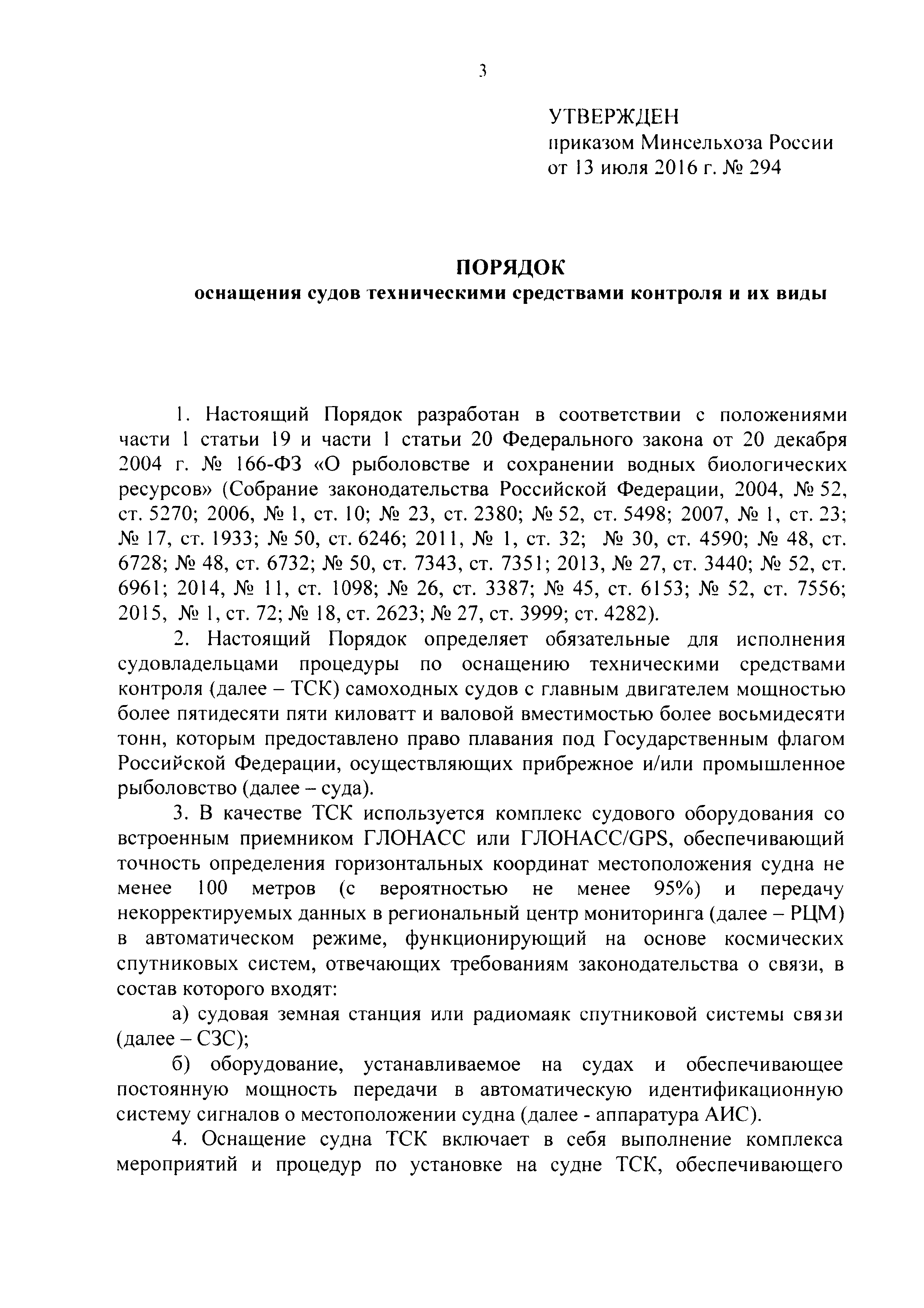 | Область применения: | Порядок определяет обязательные для исполнения судовладельцами процедуры по оснащению техническими средствами контроля самоходных судов с главным двигателем мощностью более пятидесяти пяти киловатт и валовой вместимостью более восьмидесяти тонн, которым предоставлено право плавания под Государственным флагом Российской Федерации, осуществляющих прибрежное и/или промышленное рыболовство |