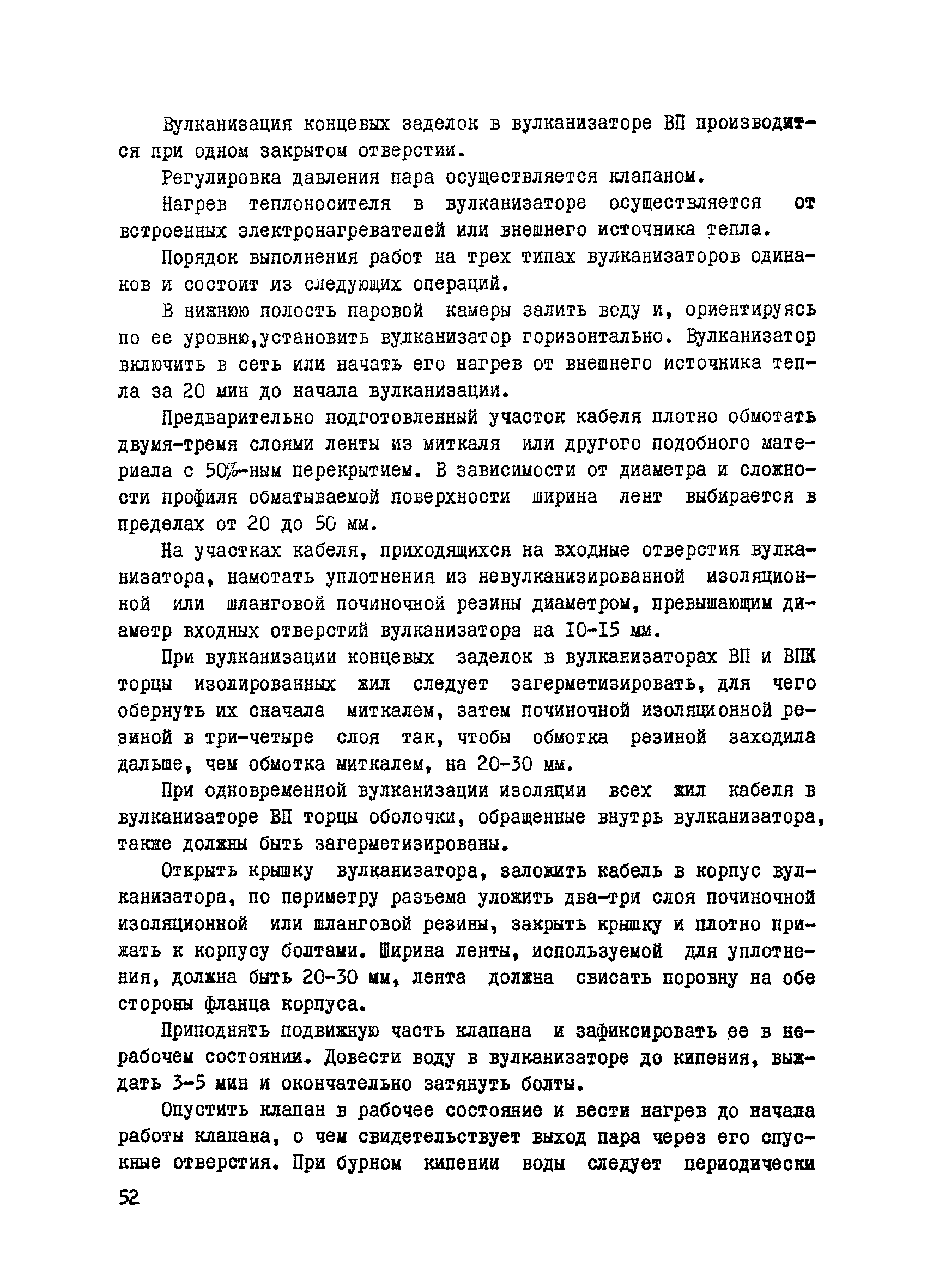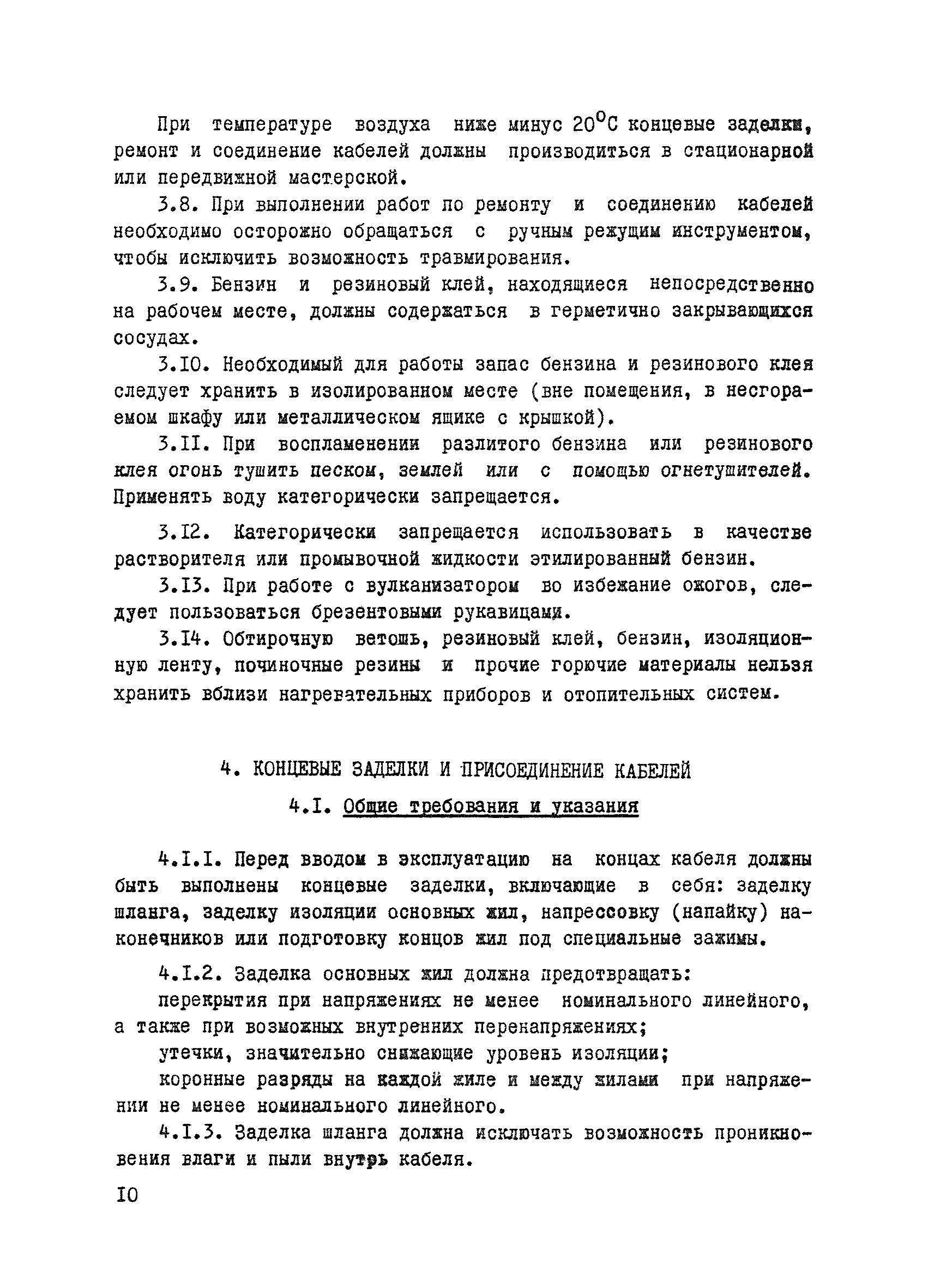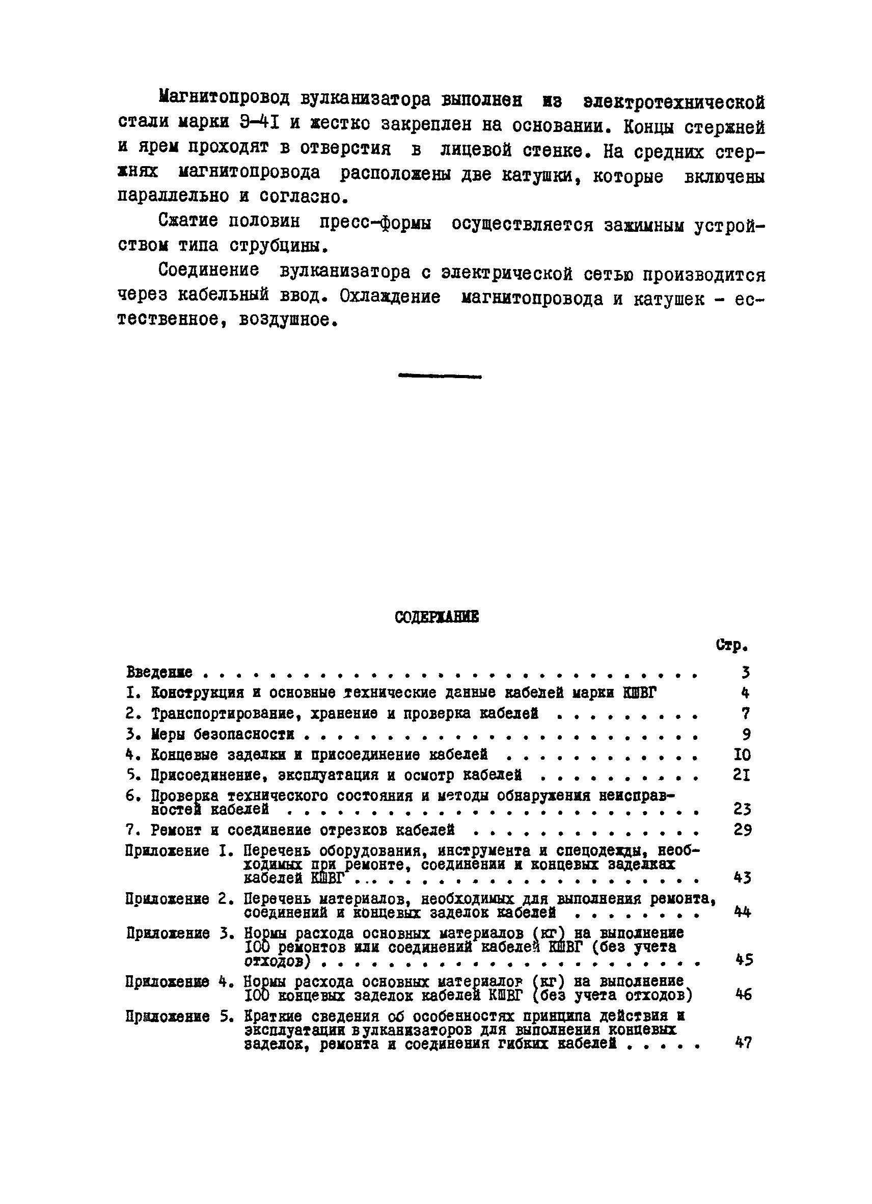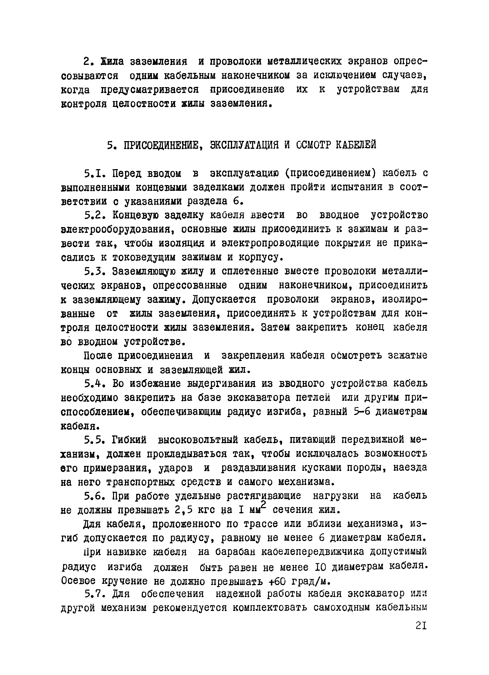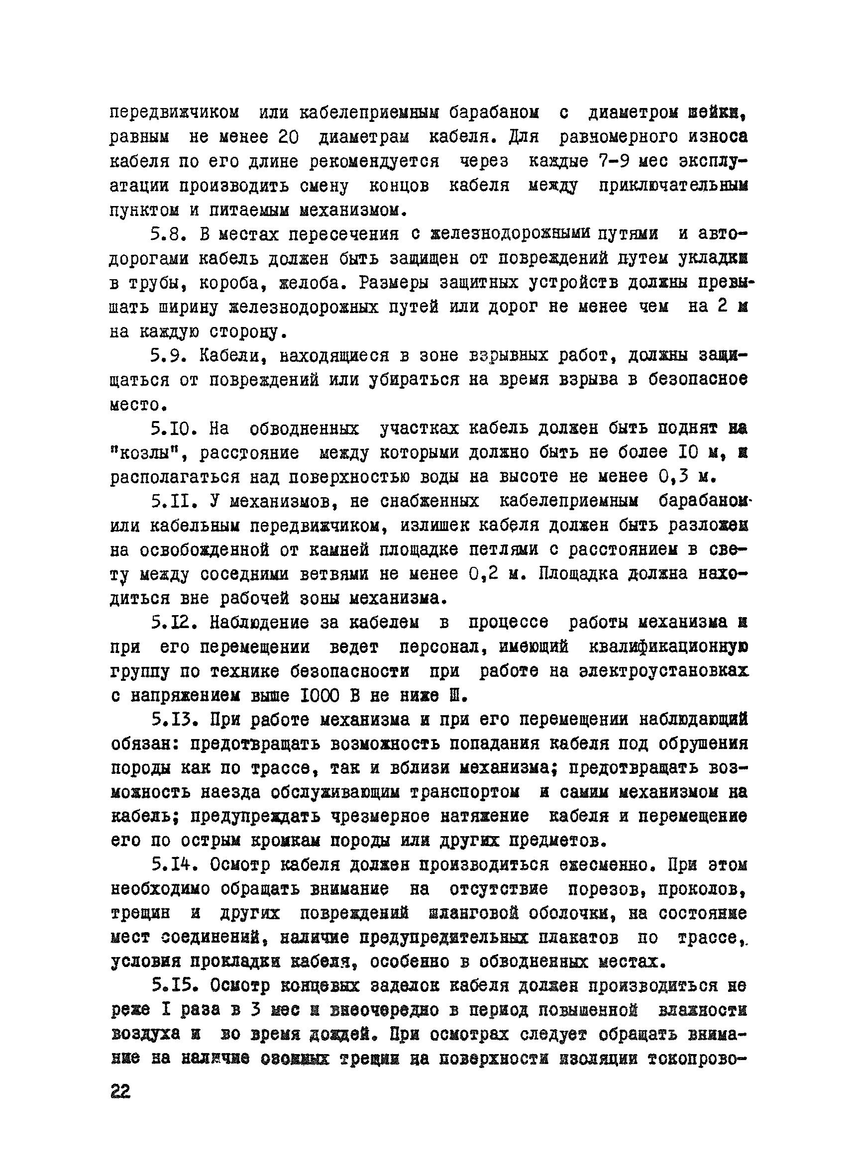 Временная инструкция по эксплуатации, ремонту, соединениям и концевым заделкам высоковольтного гибкого кабеля марки КШВГ (КШВГМ)| Статус: | справочные материалы, мп, тпр | | Название рус.: | Временная инструкция по эксплуатации, ремонту, соединениям и концевым заделкам высоковольтного гибкого кабеля марки КШВГ (КШВГМ) | | Дата добавления в базу: | 01.02.2017 | | Дата актуализации: | 01.01.2021 | | Область применения: | Инструкция является руководящим документом при выполнении концевых заделок, ремонте, соединений и испытаниях кабелей марки КШВГ силами и средствами эксплуатирующих предприятий и предназначена для работников, обслуживающих гибкие силовые кабели с медными токопроводящими жилами, резиновой изоляцией, в резиновой оболочке, используемые для присоединения экскаваторов, драг и других передвижных механизмов к электрическим сетям с изолированной нейтралью при номинальном напряжении 6000 В переменного тока частотой 50 Гц. | | Оглавление: | Введение 1. Конструкция и основные технические данные кабелей марки КШВГ 2. Транспортирование, хранение и проверка кабелей 3. Меры безопасности 4. Концевые заделки и присоединение кабелей 5. Присоединение, эксплуатация и осмотр кабелей 6. Проверка технического состояния и методы обнаружения неисправностей кабелей 7. Ремонт и соединение отрезков кабелей Приложение 1. Перечень оборудования, инструмента и спецодежды, необходимых при ремонте, соединении и концевых заделках кабелей КШВГ Приложение 2. Перечень материалов, необходимых для выполнения ремонта, соединений и концевых заделок кабелей Приложение 3. Нормы расхода основных материалов (кг) на выполнение 100 ремонтов или соединение кабелей КШВГ (без учета отходов) Приложение 4. Нормы расхода основных материалов (кг) на выполнение 100 концевых заделок КШВГ (без учета отходов) Приложение 5. Краткие сведения об особенностях принципа действия и эксплуатации вулканизаторов для выполнения концевых заделок, ремонта и соединения гибких кабелей | | Разработан: | Институт горного дела им. А.А. Скочинского НИПКТИ