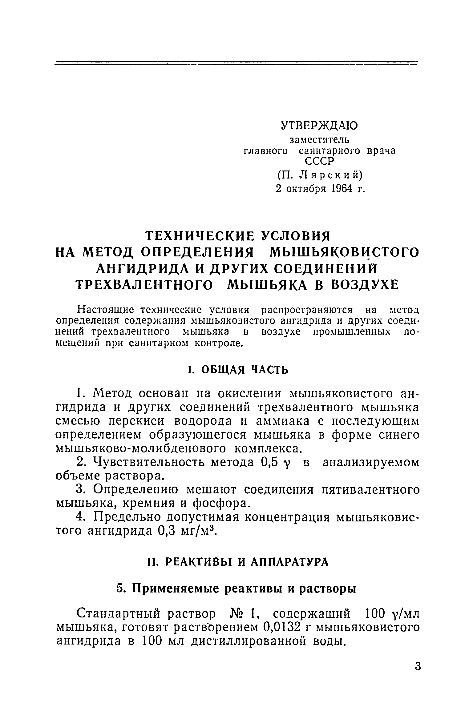 | Название рус.: | Технические условия на метод определения мышьяковистого ангидрида и других соединений трехвалентного мышьяка в воздухе |