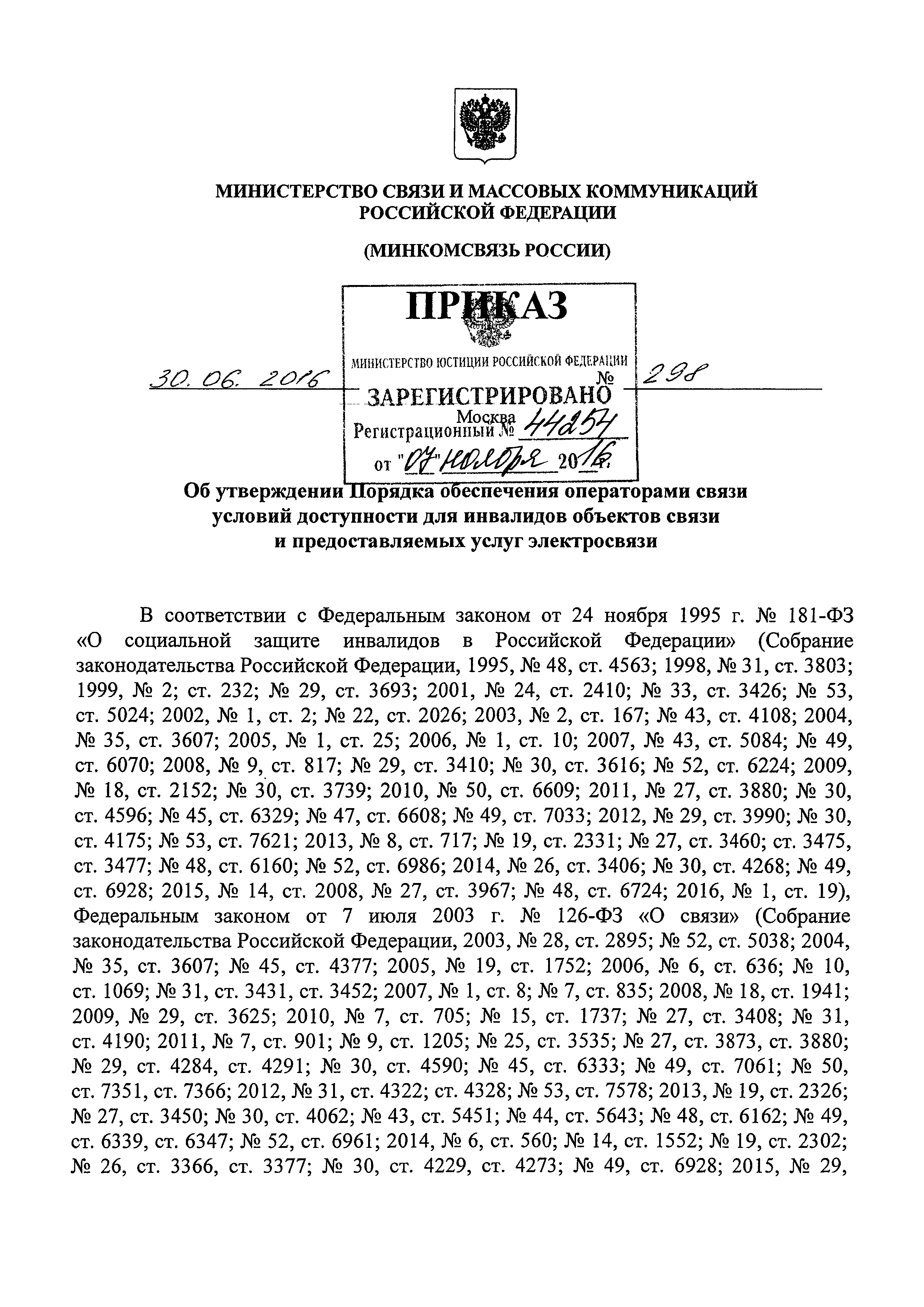 | Утверждён: | 30.06.2016 Министерство связи и массовых коммуникаций РФ (298) |
