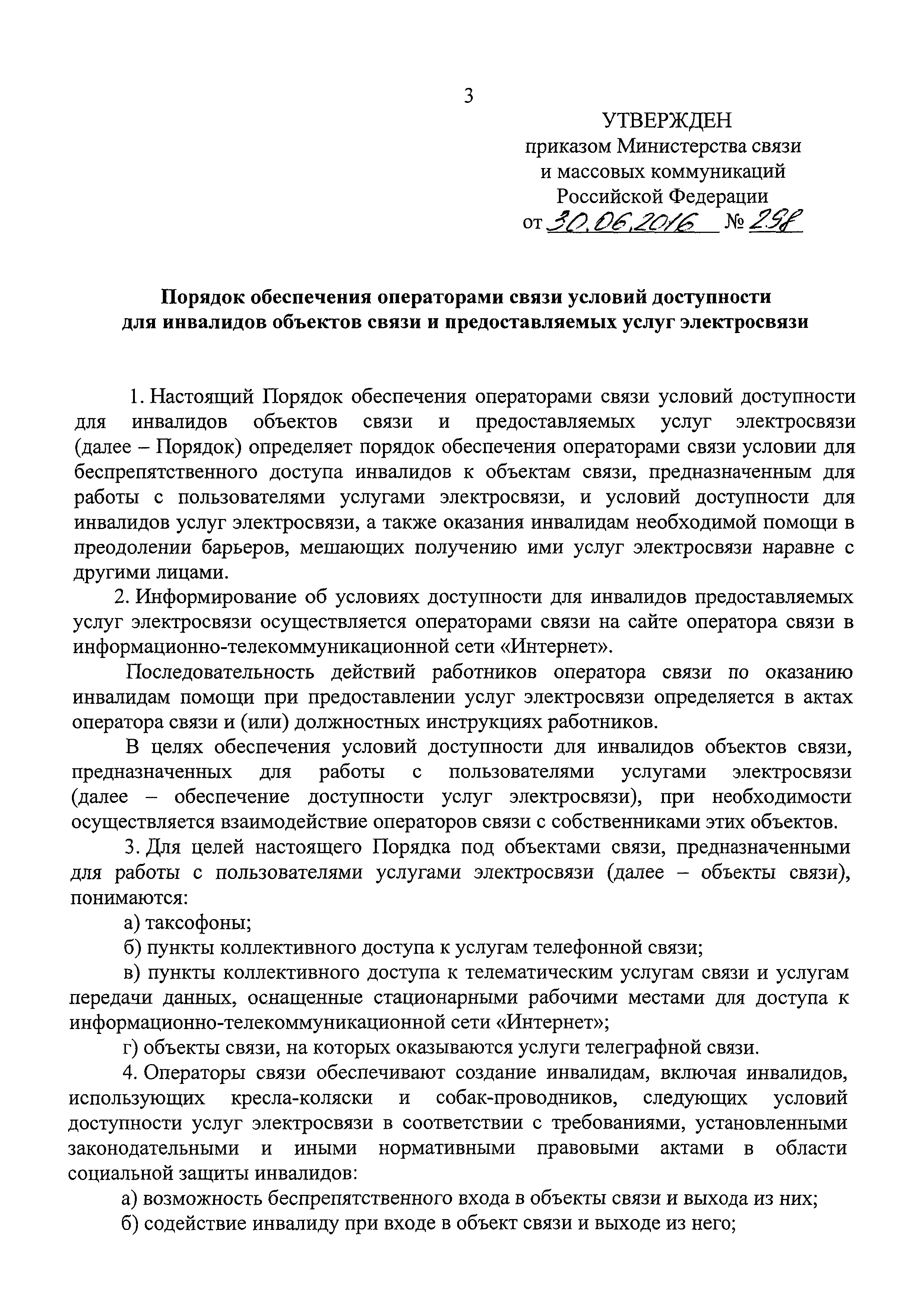 | Название рус.: | Порядок обеспечения операторами связи условий доступности для инвалидов объектов связи и предоставляемых услуг электросвязи |