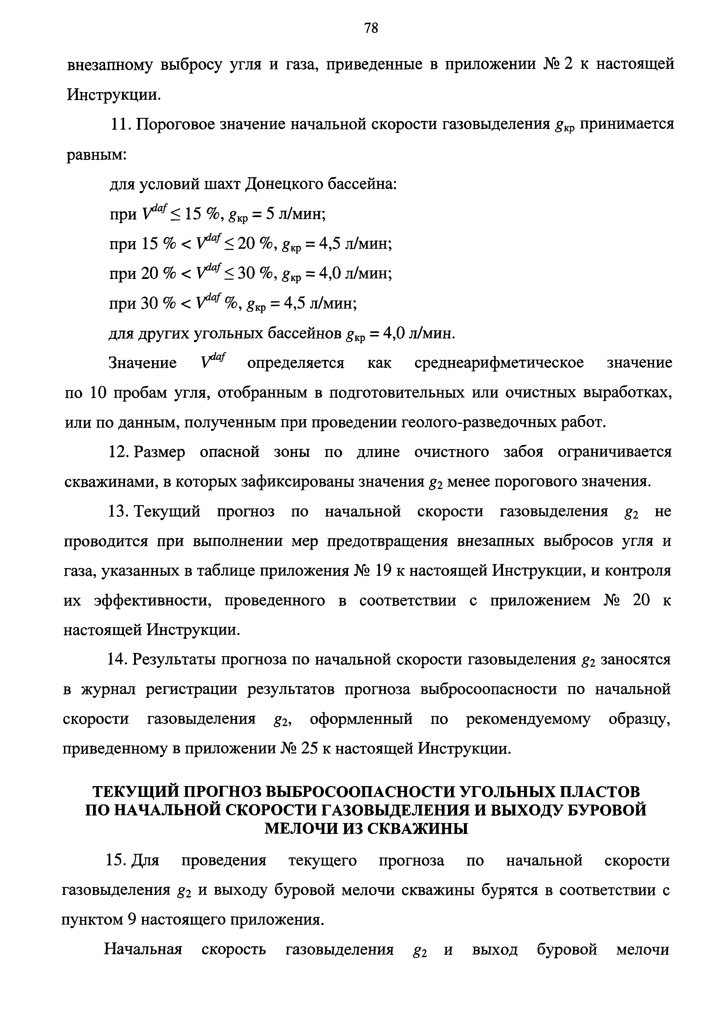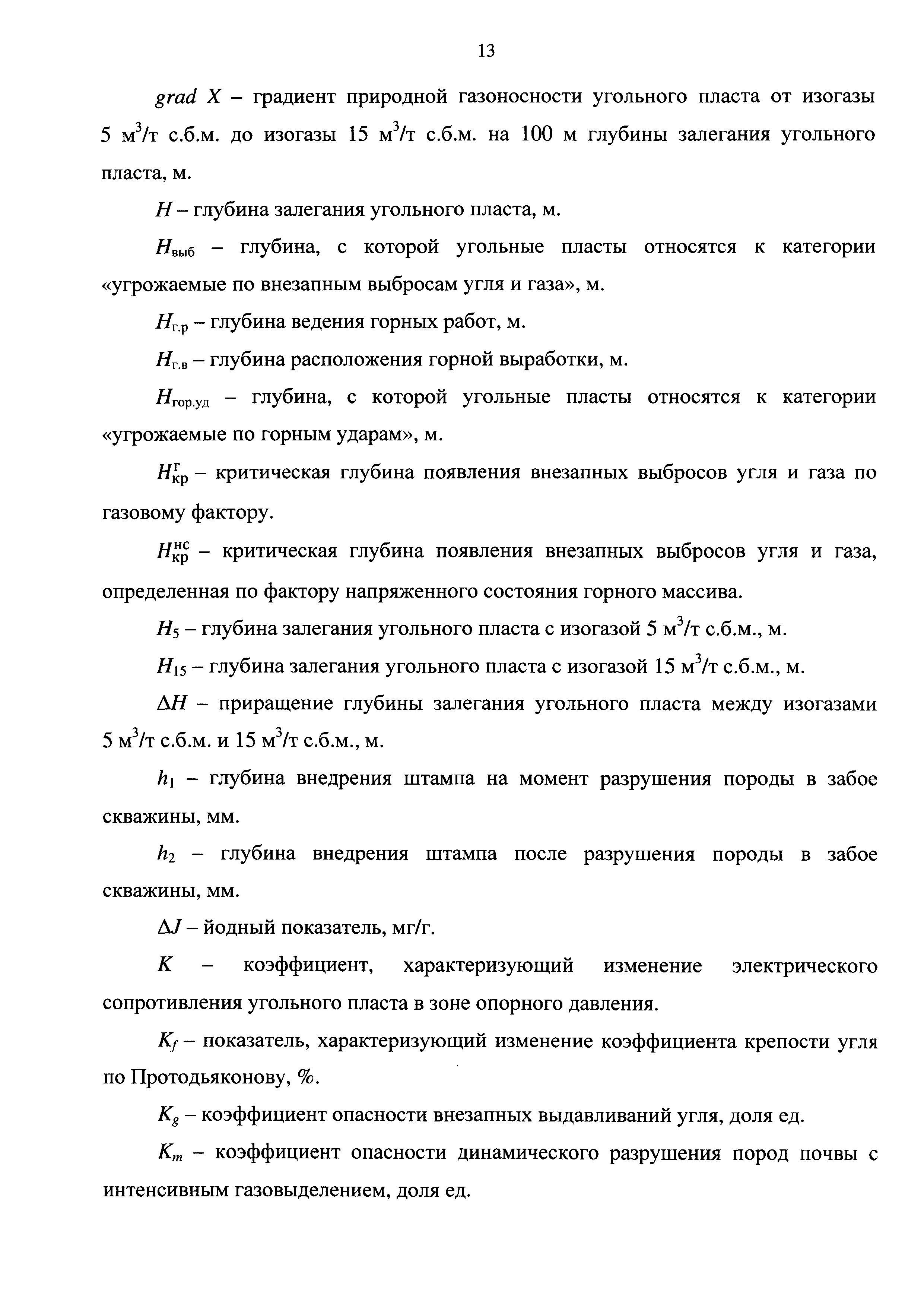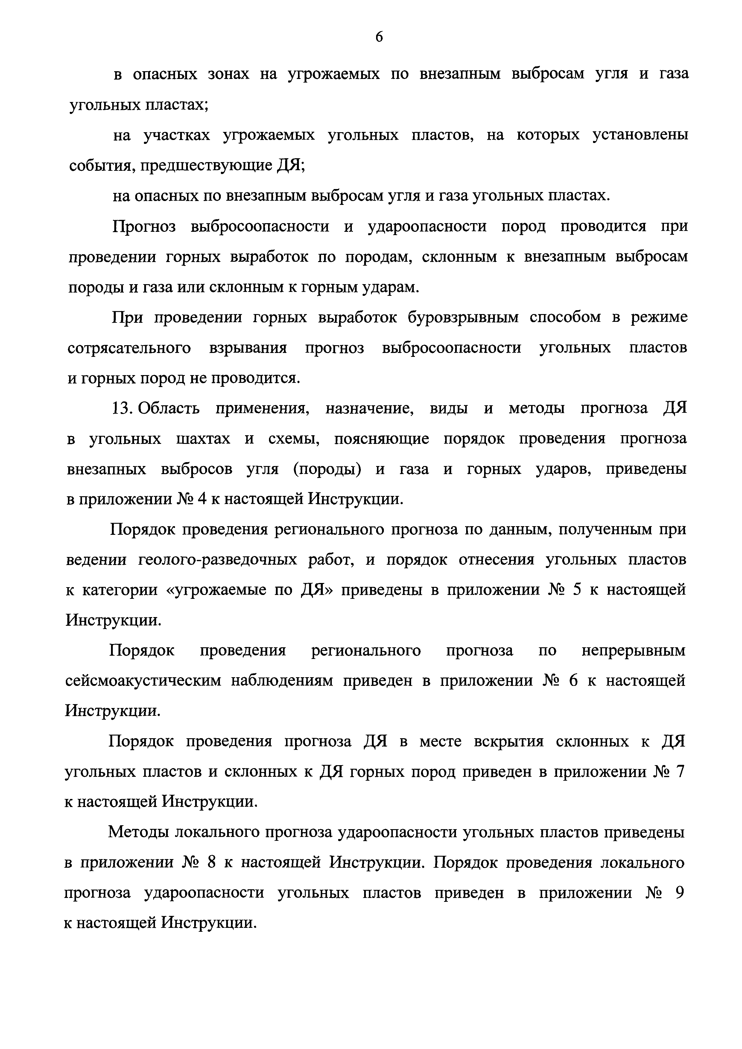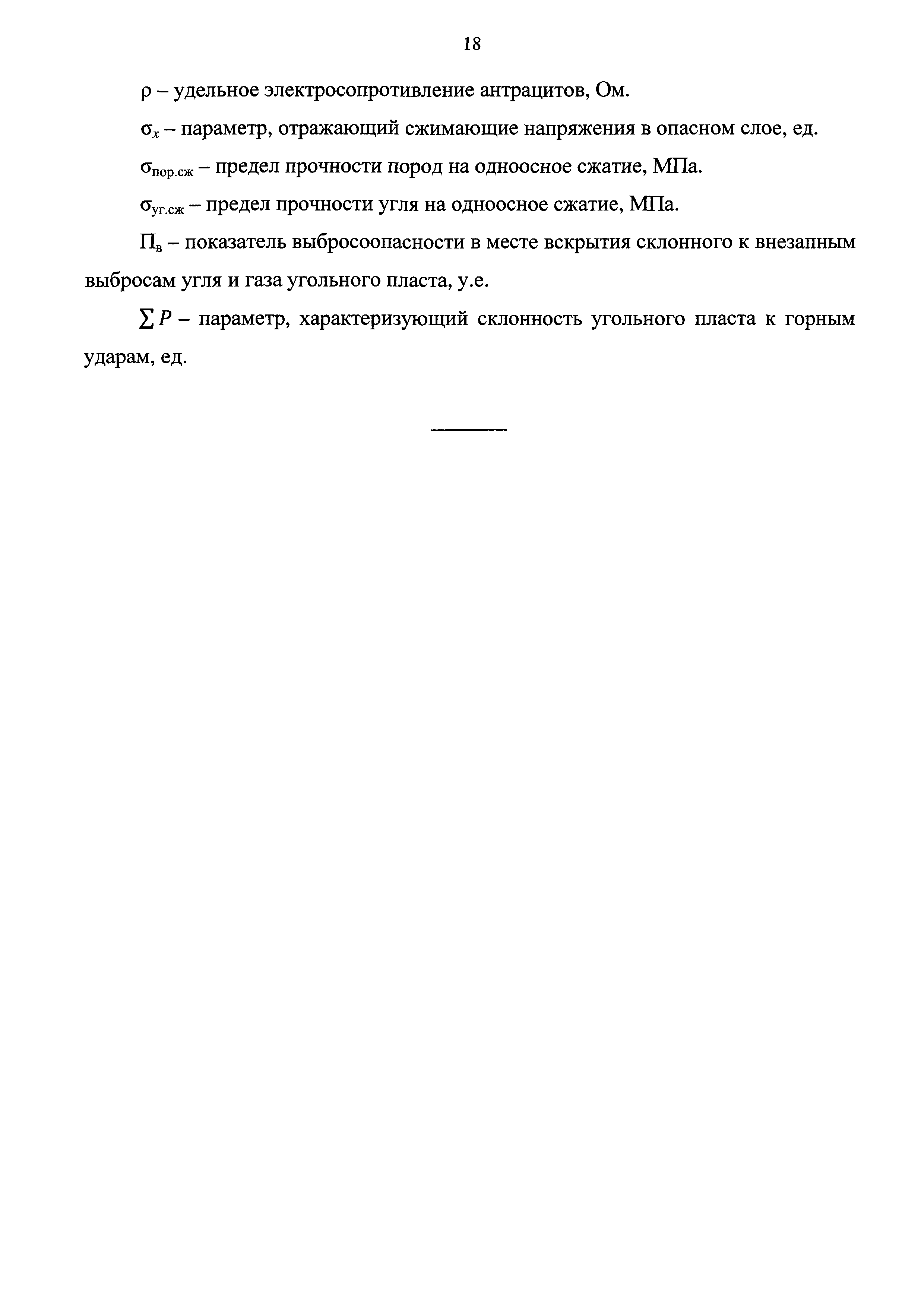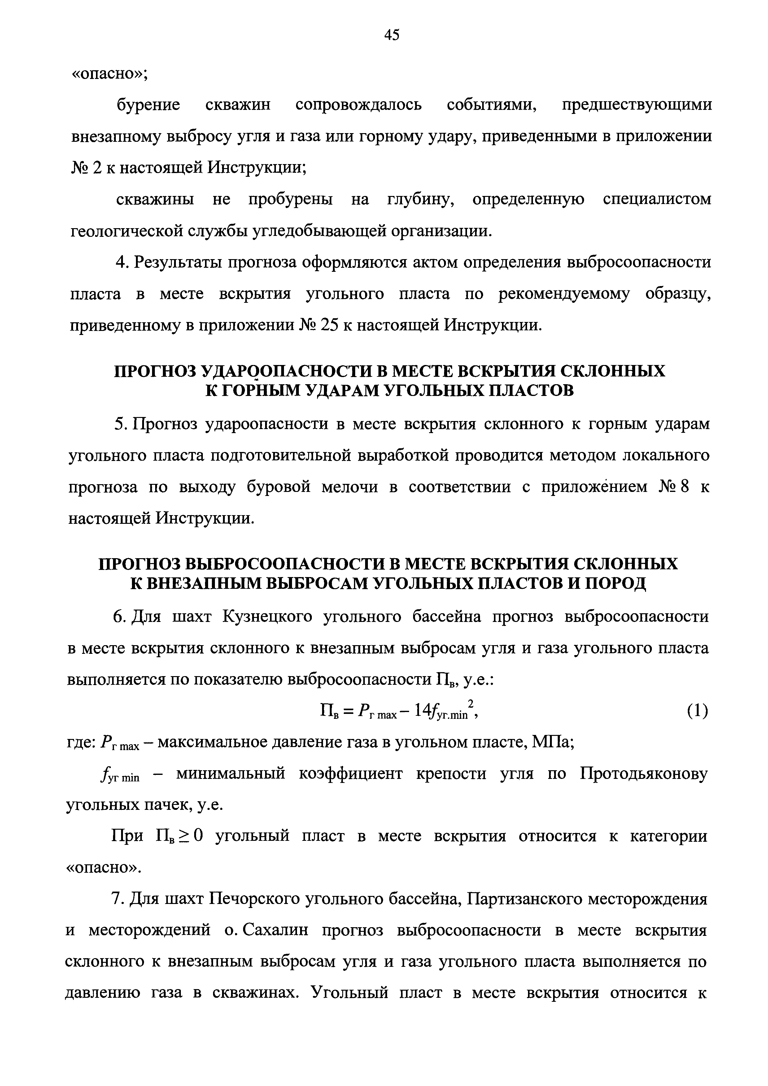 | Оглавление: | Приложение № 1. Условные обозначения Приложение № 2. Признаки динамических явлений и события, предшествующие динамическим явлениям Приложение № 3. Геодинамическое районирование участка недр Приложение № 4. Область применения, назначения, виды и методы прогноза динамических явлений в угольных шахтах Приложение № 5. Порядок проведения регионального прогноза по данным, полученным при ведении геолого-разведочных работ Приложение № 6. Порядок проведения регионального прогноза по непрерывным сейсмоакустическим наблюдениям Приложение № 7. Порядок проведения прогноза динамических явлений в месте вскрытия склонных к динамическим явления угольных пластов и склонных к динамическим явлениям горных пород Приложение № 8. Методы локального прогноза Приложение № 9. Порядок проведения локального прогноза удароопасности угольных пластов Приложение № 10. Методы текущего прогноза удароопасности угольных пластов Приложение № 11. Методы прогноза удароопасности горных пород Приложение № 12. Порядок проведения локального прогноза выбросоопасных угольных пластов Приложение № 13. Методы текущего прогноза выбросоопасности угольных пластов Приложение № 14. Порядок и методы прогноза выбросоопасности горных пород Приложение № 15. Методы и порядок проведения прогноза динамических разрушений пород почвы горных выработок Приложение № 16. Метод прогноза внезапных выдавливаний угля Приложение № 17. Метод прогноза динамических разрушений пород почвы с интенсивным газовыделением Приложение № 18. Порядок мониторинга массива горных пород Приложение № 19. Меры предотвращения динамических явлений Приложение № 20. Порядок и методы контроля эффективности мер по предотвращению динамических явлений Приложение № 21. Порядок определения выхода буровой мелочи Приложение № 22. Определение прочности и коэффициента крепости угля по Протодьяконову Приложение № 23. Порядок определения начальной скорости газовыделения Приложение № 24. Порядок проведения разведочных и контрольных наблюдений на склонных к внезапным выбросам угля и газа угольных пластах Приложение № 25. Акт определения выбросоопасности пласта в месте вскрытия угольного пласта |
