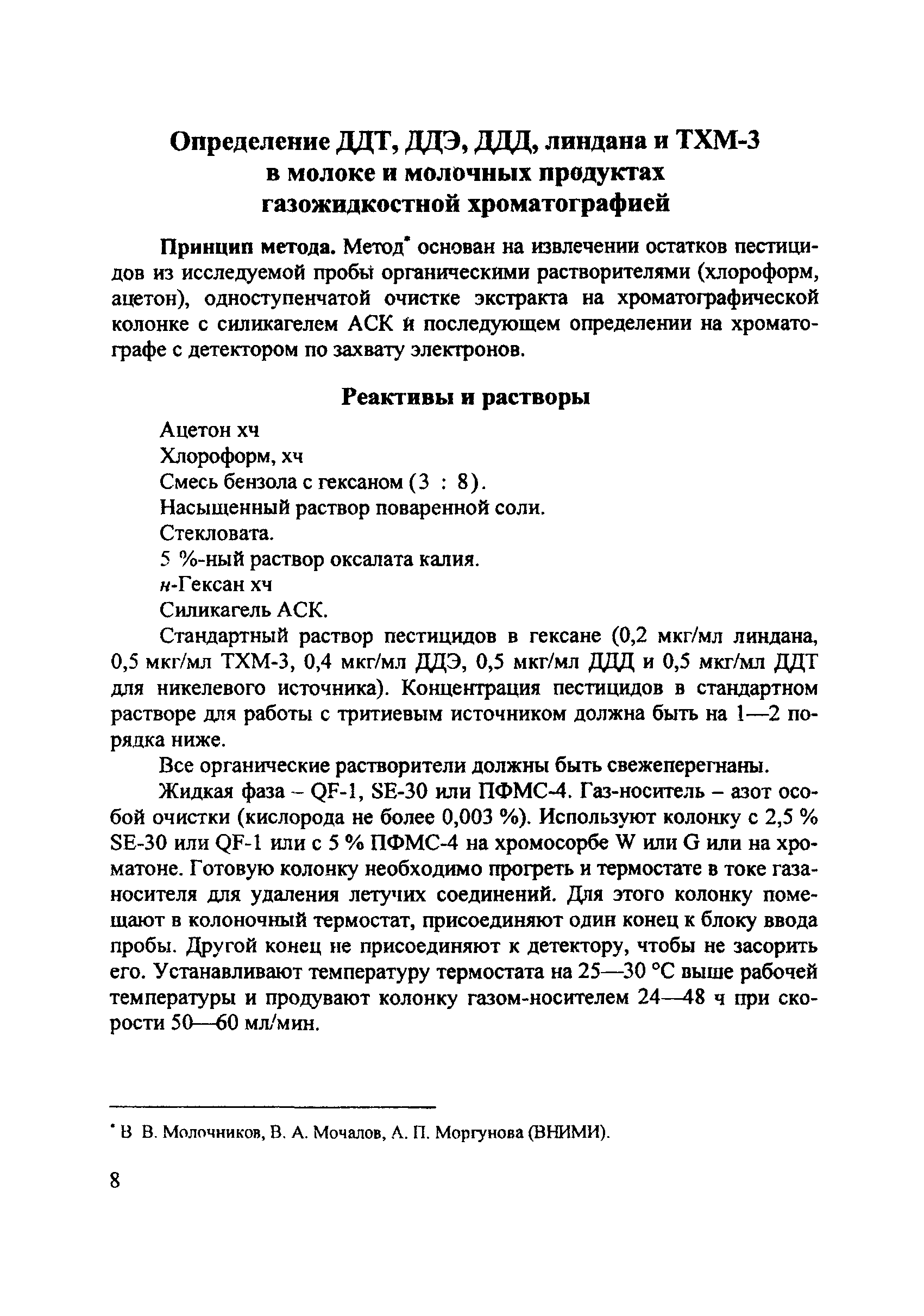 Определение ДДТ, ДДЭ, ДДД, линдана и ТХМ-3 в молоке и молочных продуктах газожидкостной хроматографией| Статус: | действует | | Название рус.: | Определение ДДТ, ДДЭ, ДДД, линдана и ТХМ-3 в молоке и молочных продуктах газожидкостной хроматографией | | Дата добавления в базу: | 01.02.2017 | | Дата актуализации: | 01.01.2021 | | Оглавление: | Реактивы и растворы Приборы и посуда | | Разработан: | ВНИМИ