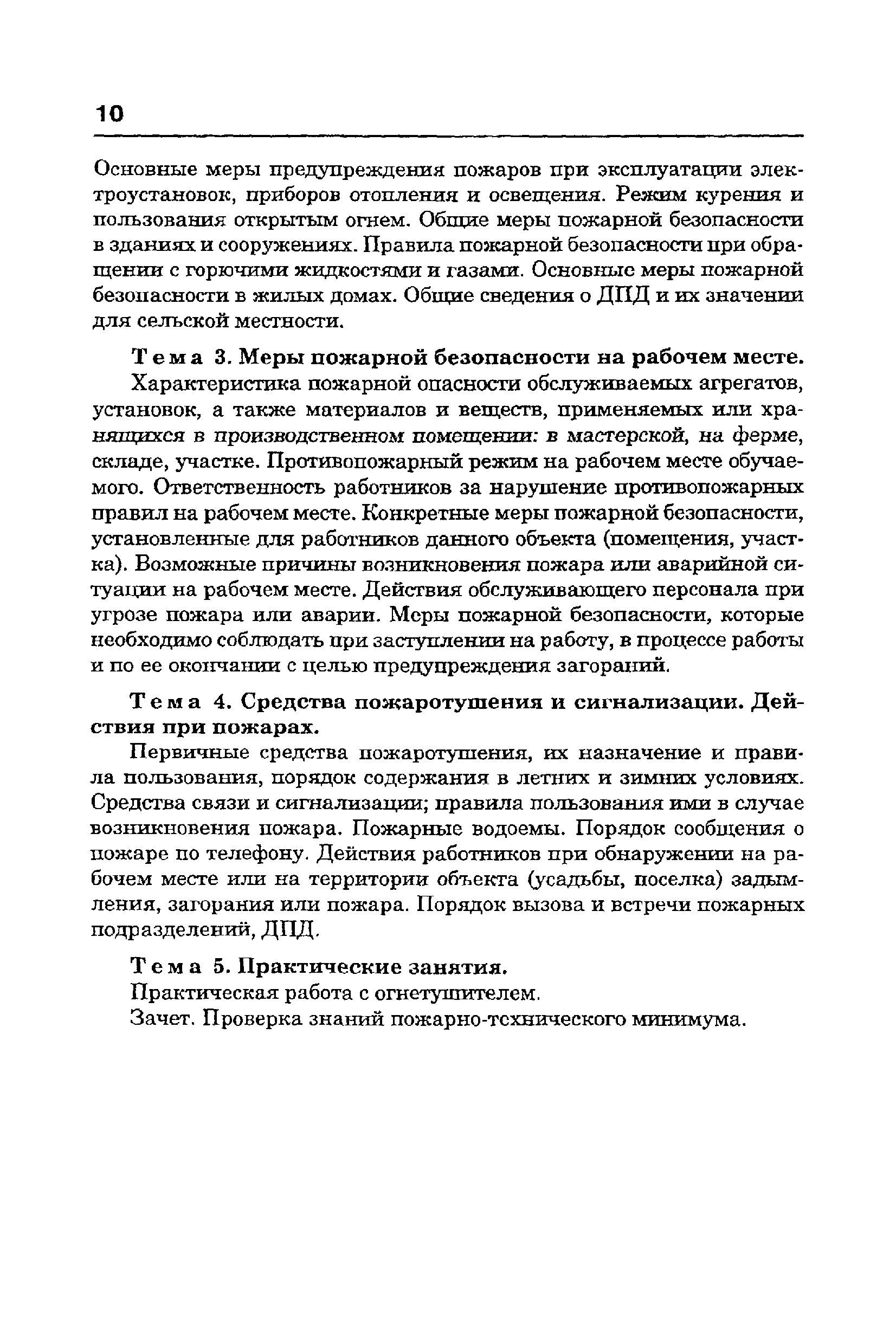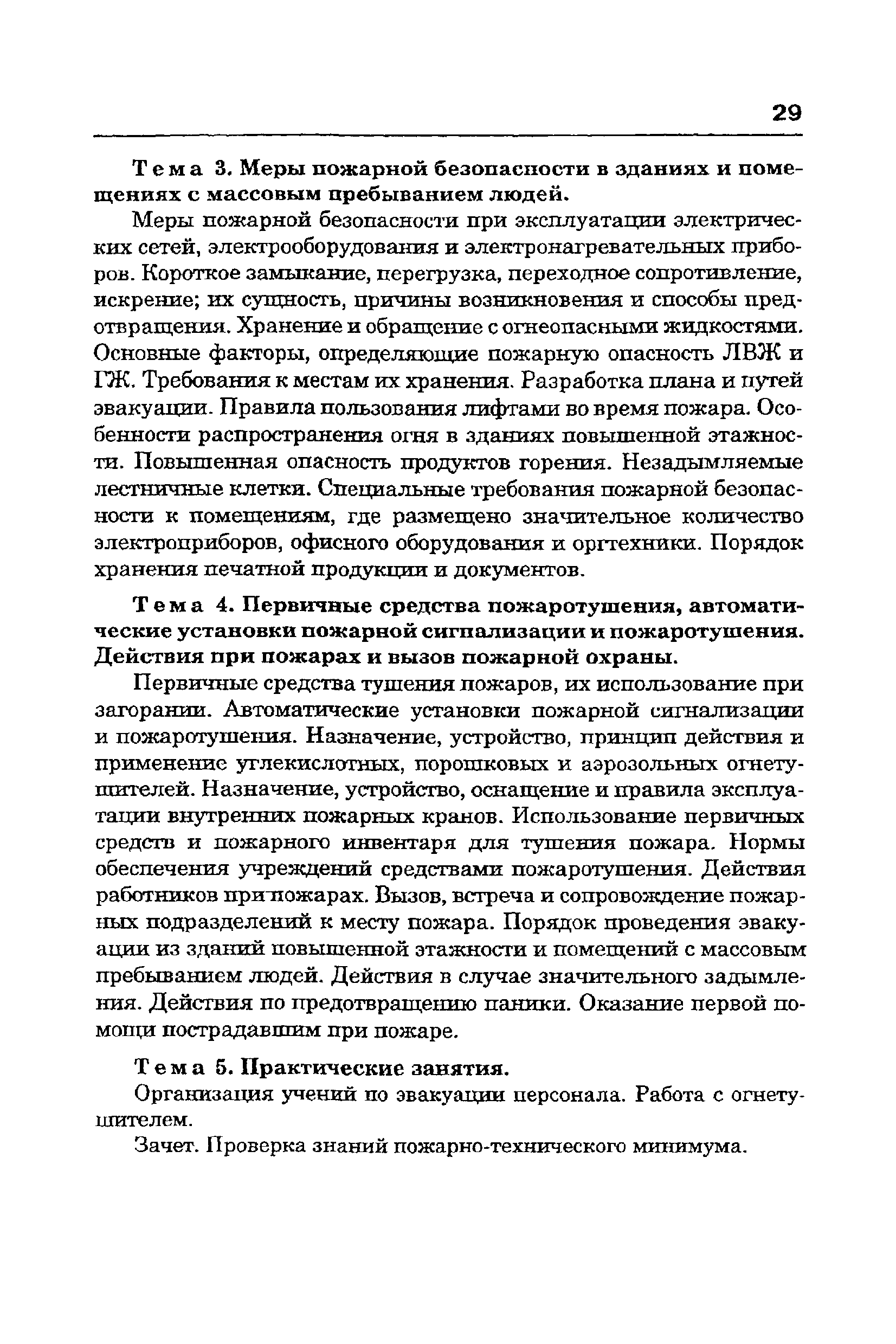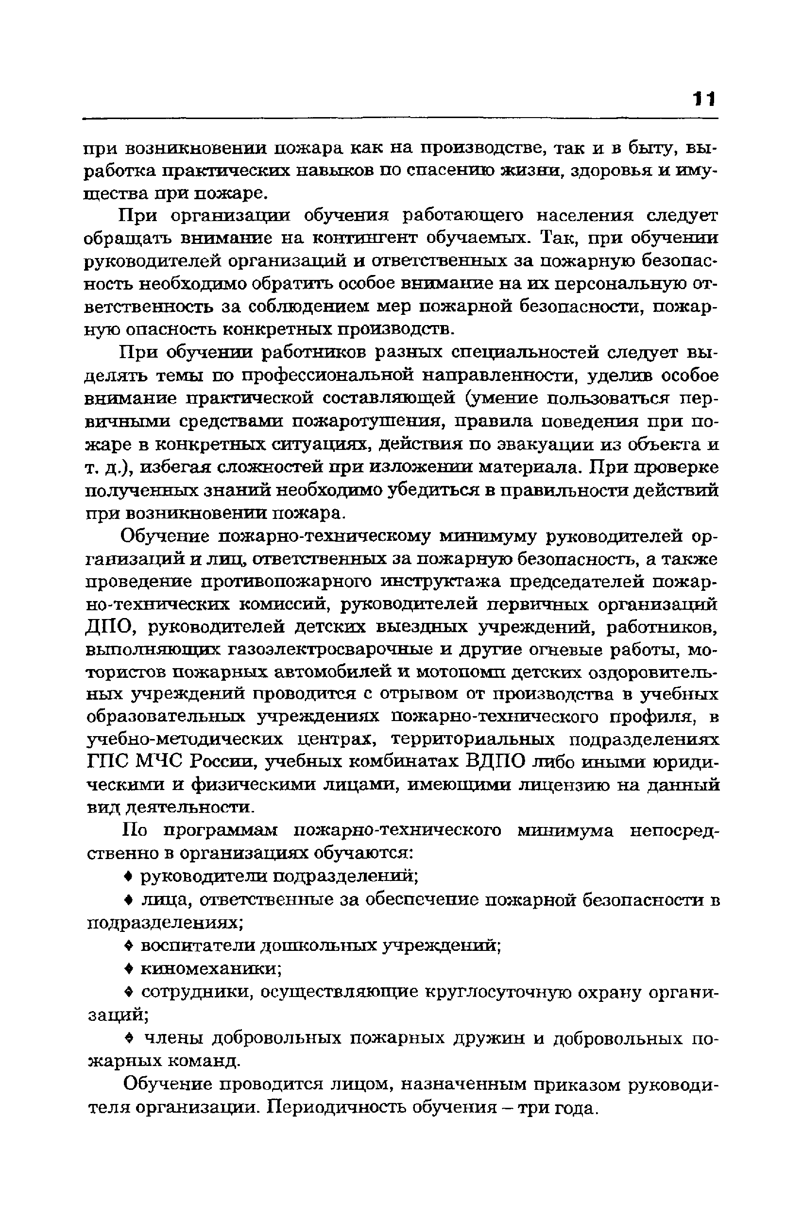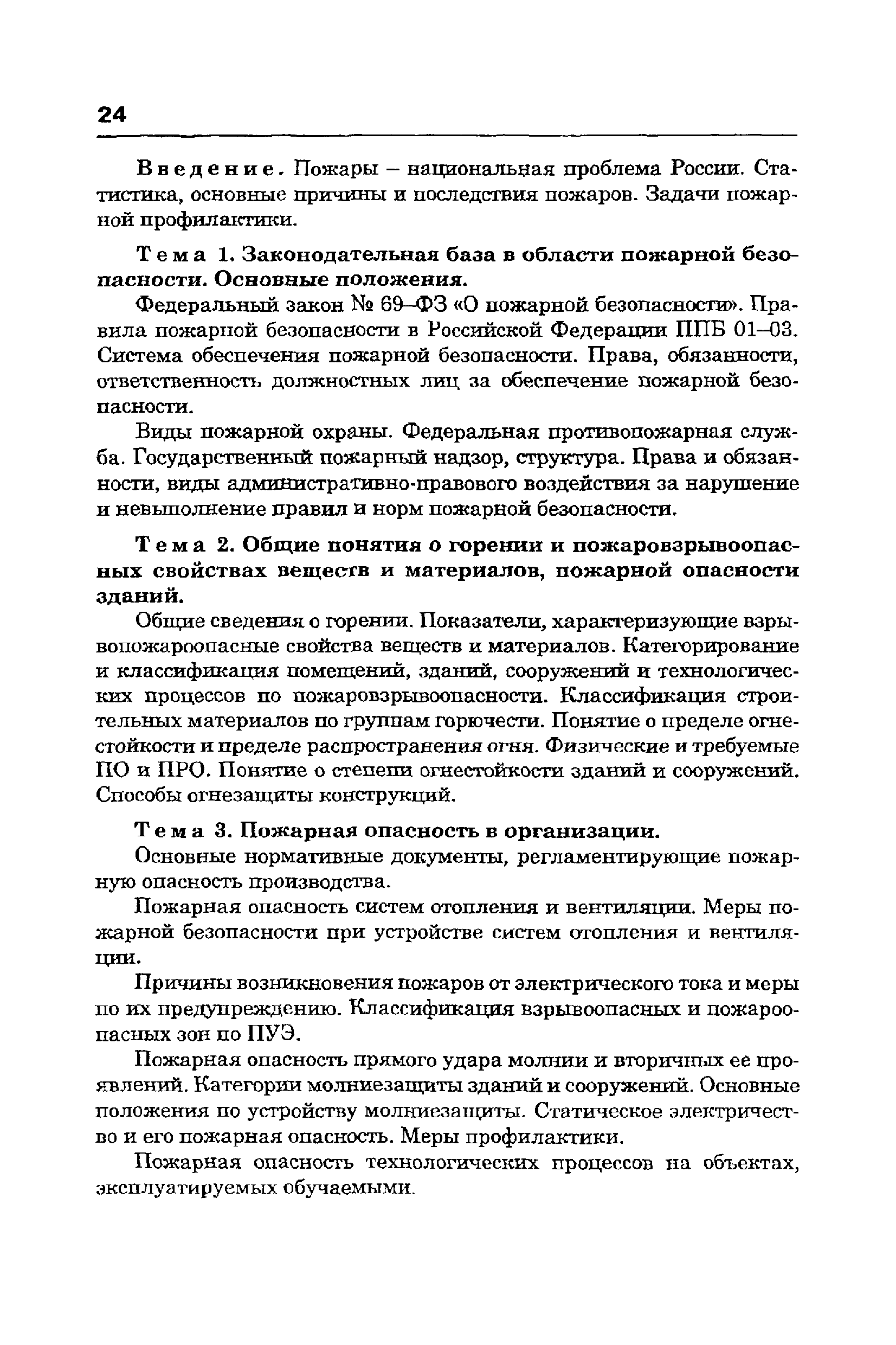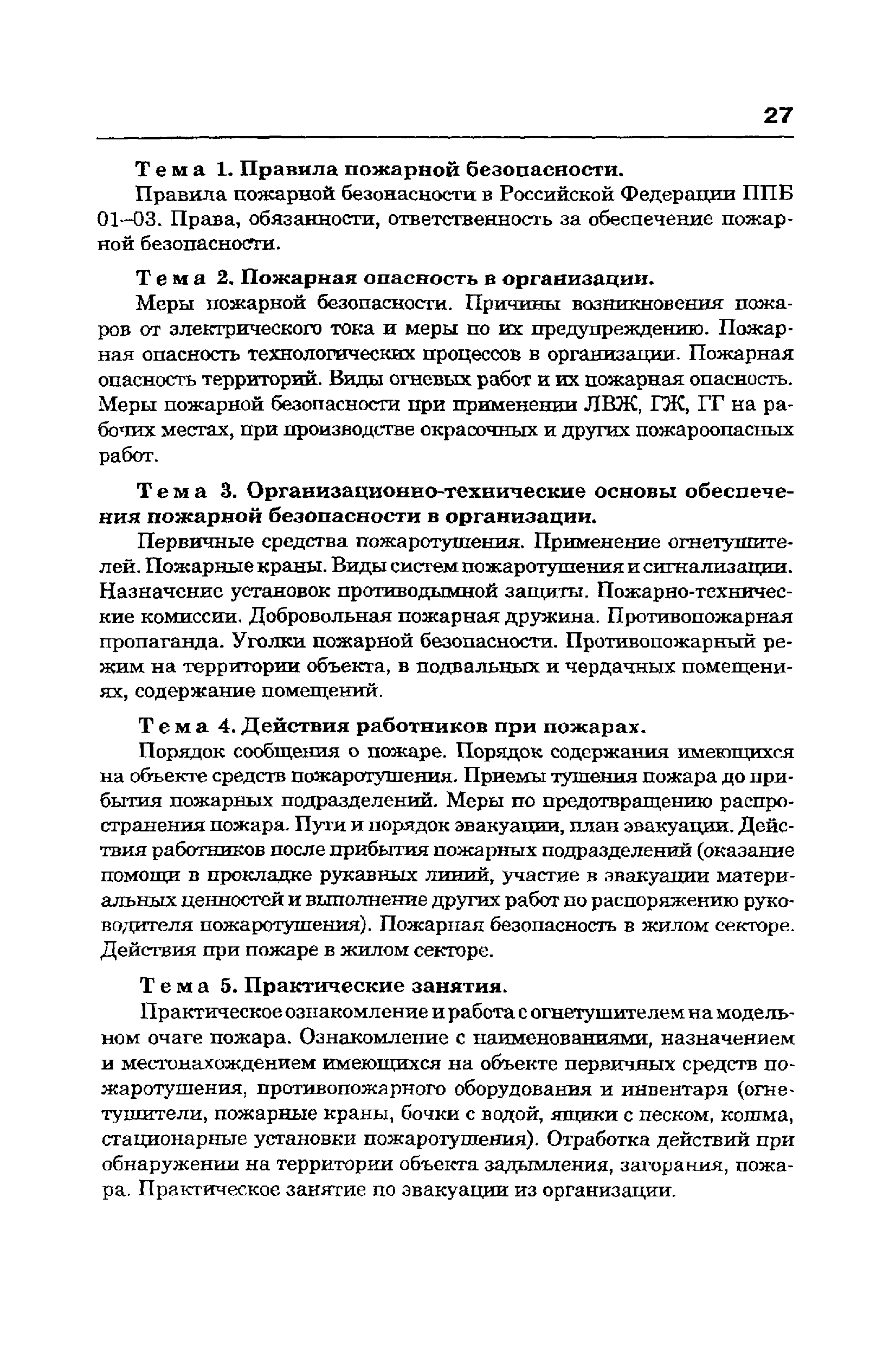 | Оглавление: | Введение 1 Термины и определения. Условные сокращения 2 Цели и задачи обучения руководителей и работников организаций в области пожарной безопасности 3 Виды обучения 3.1. Противопожарный инструктаж 3.2. Пожарно-технический минимум 4 Учебные (специальные) программы обучения в области пожарной безопасности 5 Правила изложения учебных программ и нормативно-техническая литература 6 Методические указания по организации деятельности государственного пожарного надзора в области организации обучения населения мерам пожарной безопасности и противопожарной пропаганды Приложение 1. Журнал учета проведения инструктажей по пожарной безопасности Приложение 2. Примерная программа противопожарного инструктажа Приложение 3. Пожарно-технический минимум |